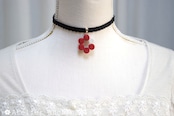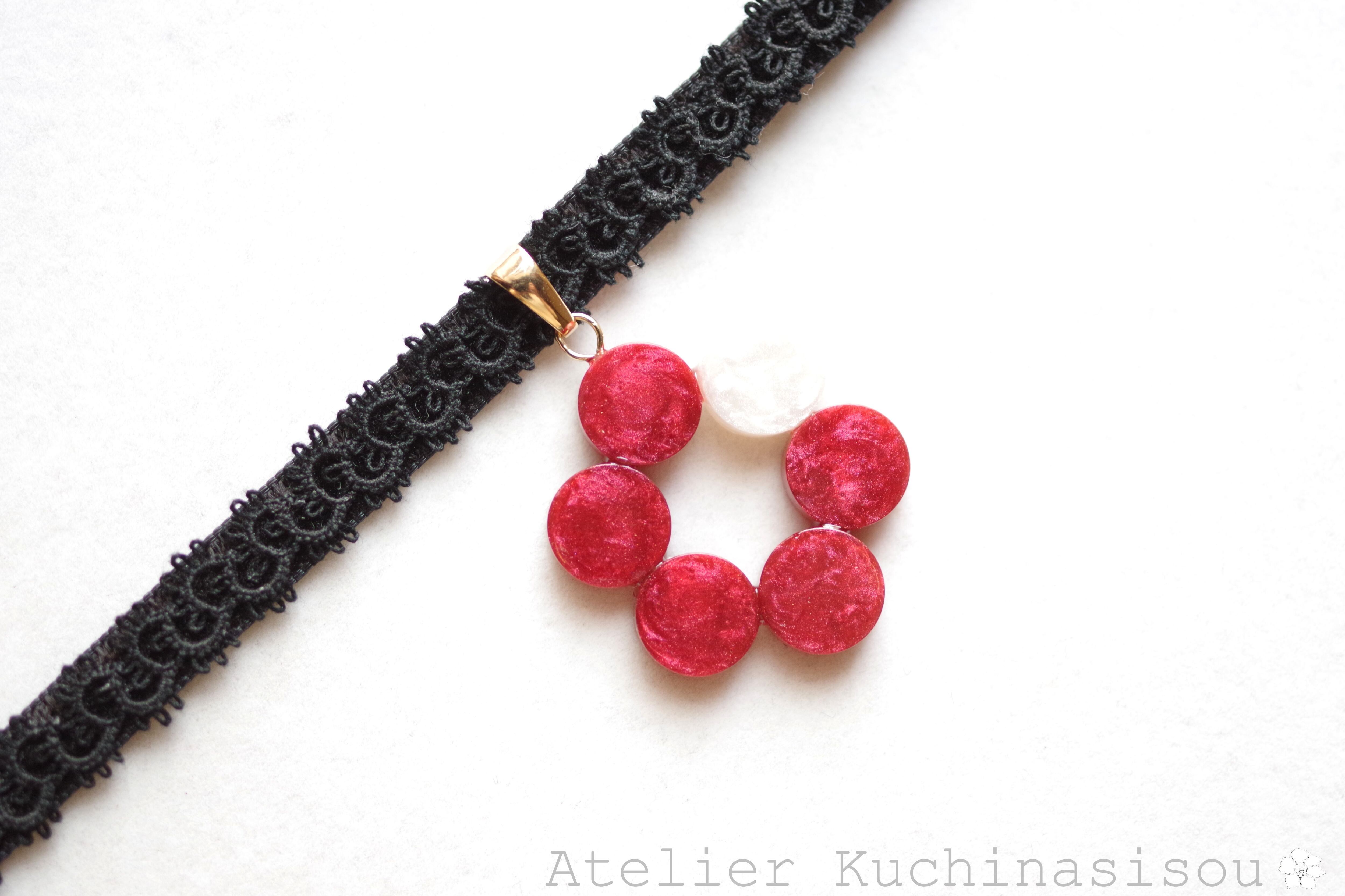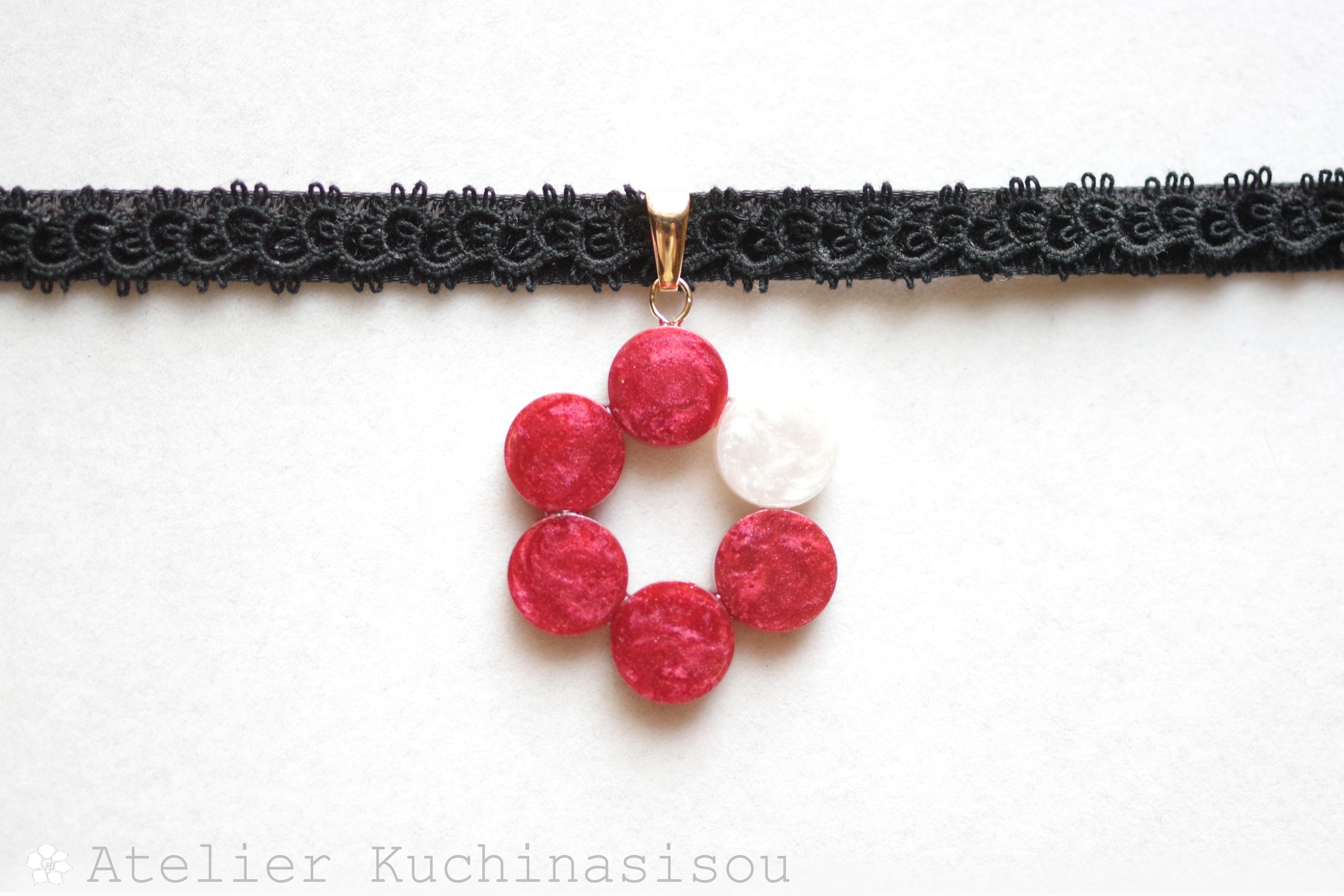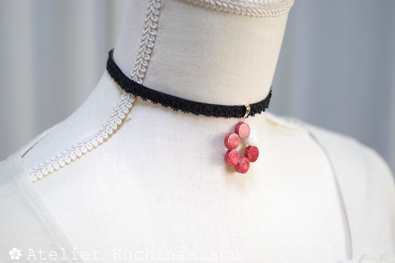 椿のような深紅のなか一色だけ違う差し色の白が清廉な印象のレジンを、ベルベットリボンにタティングレースで装飾を施したチョーカーに仕上げました。