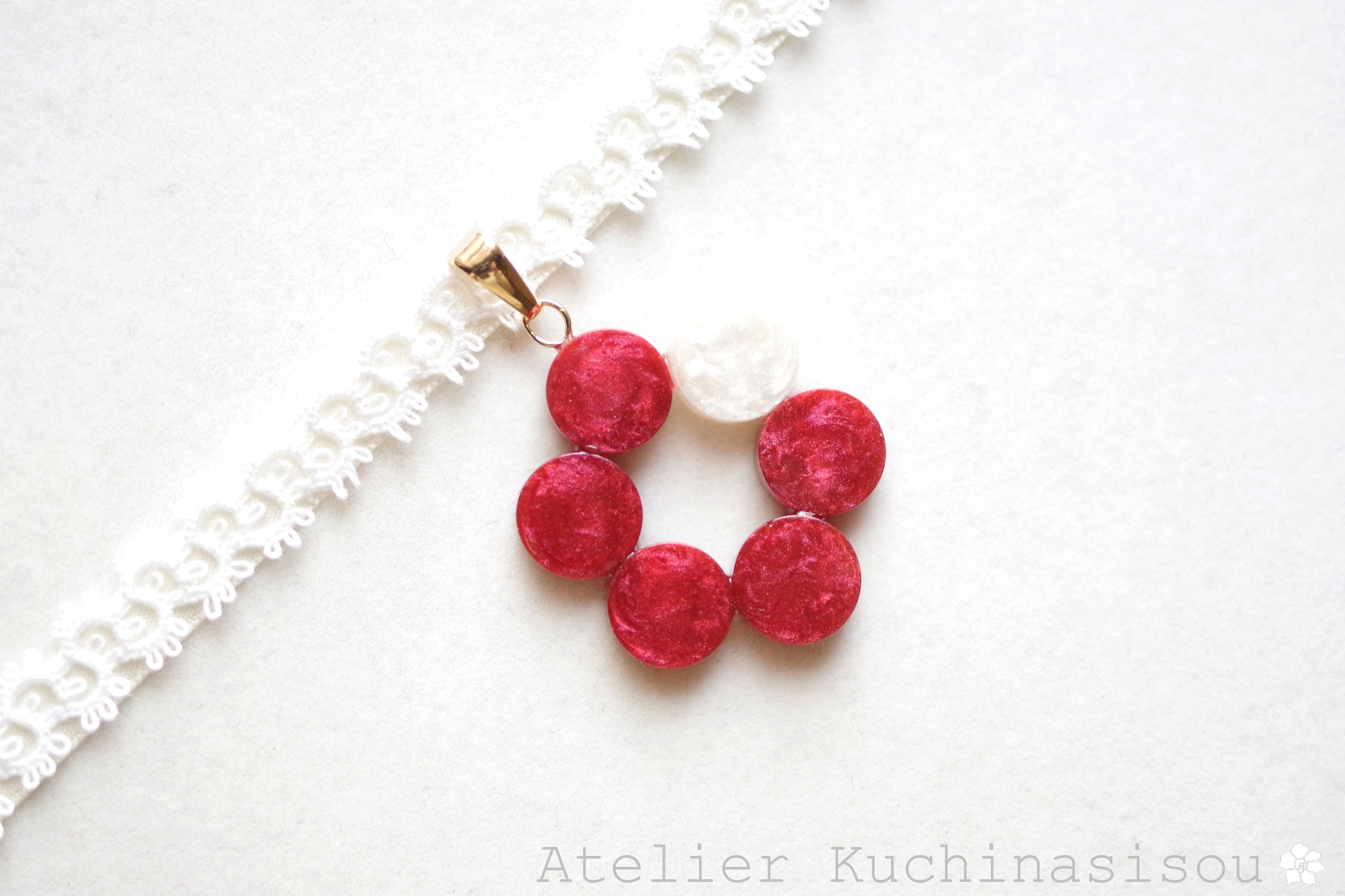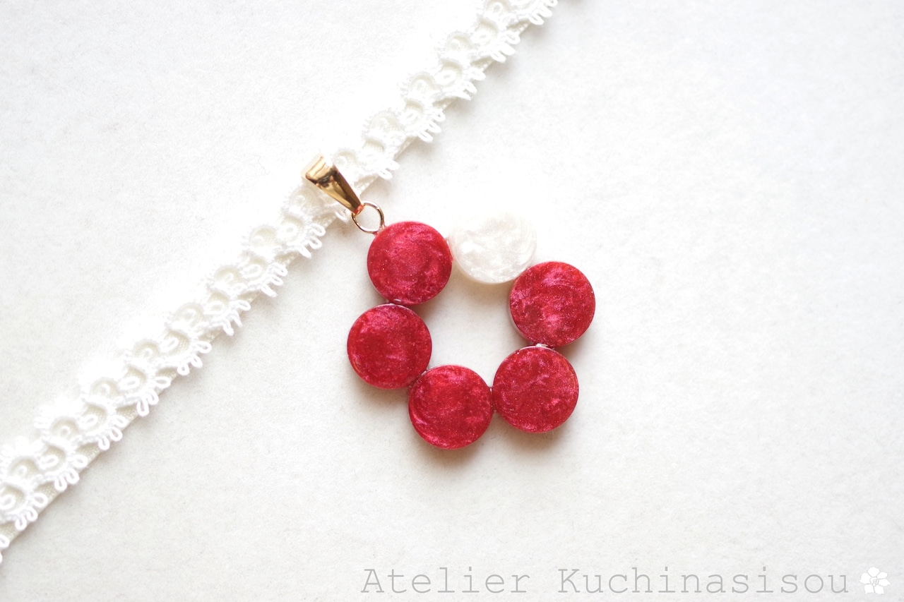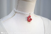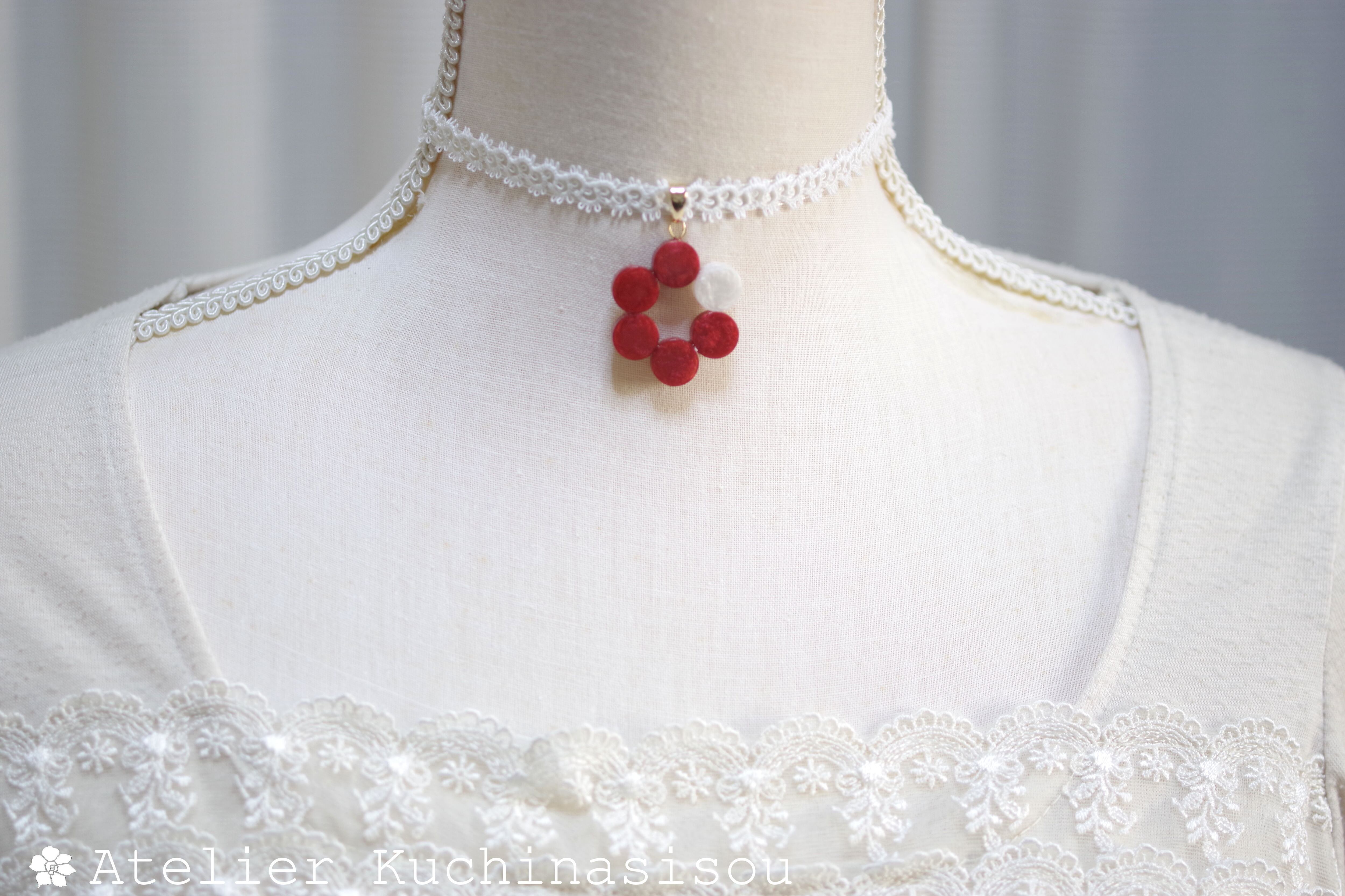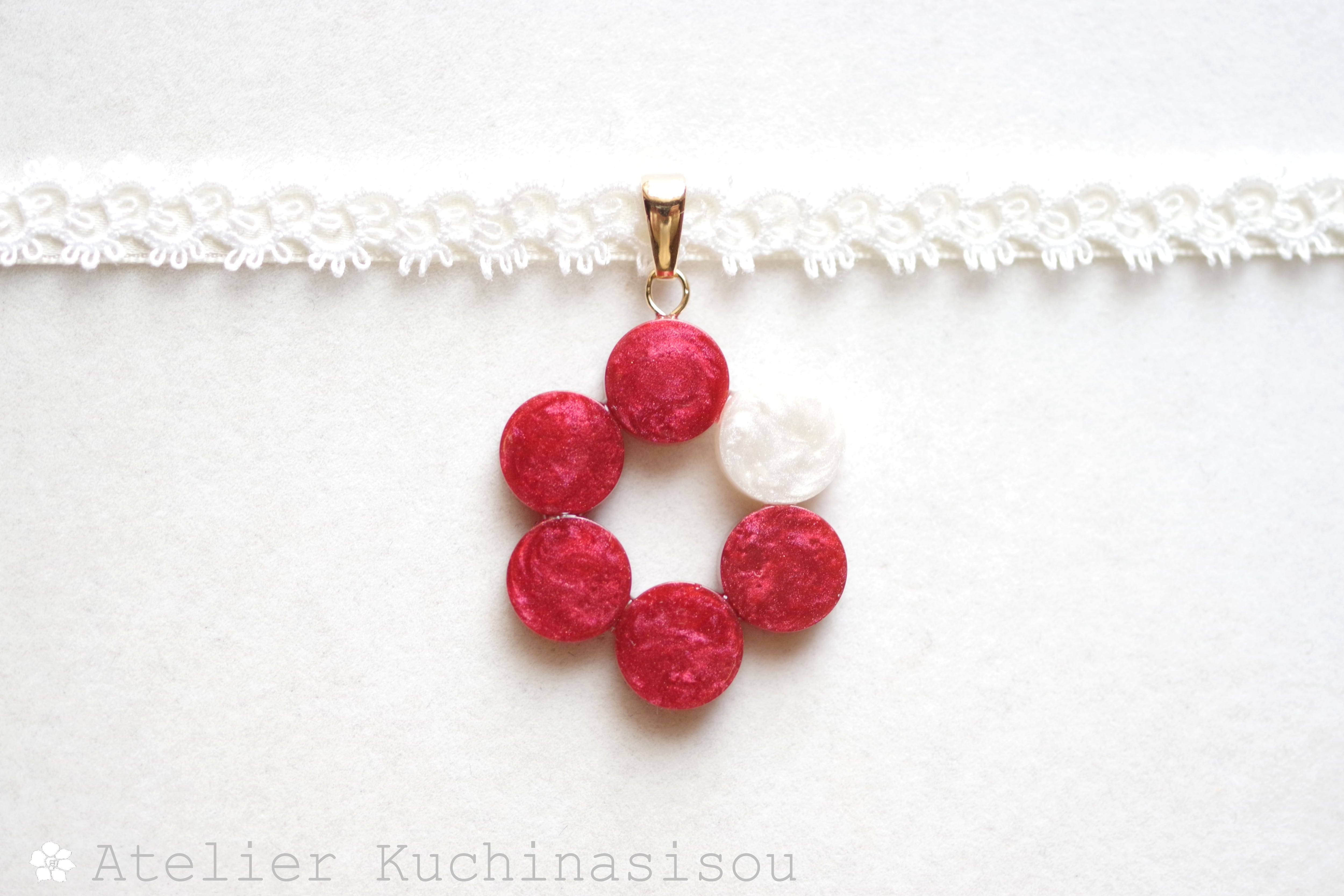 椿のような深紅のなか一色だけ違う差し色の白が清廉な印象のレジンを、サテンリボンにタティングレースで装飾を施したチョーカーに仕上げました。