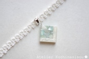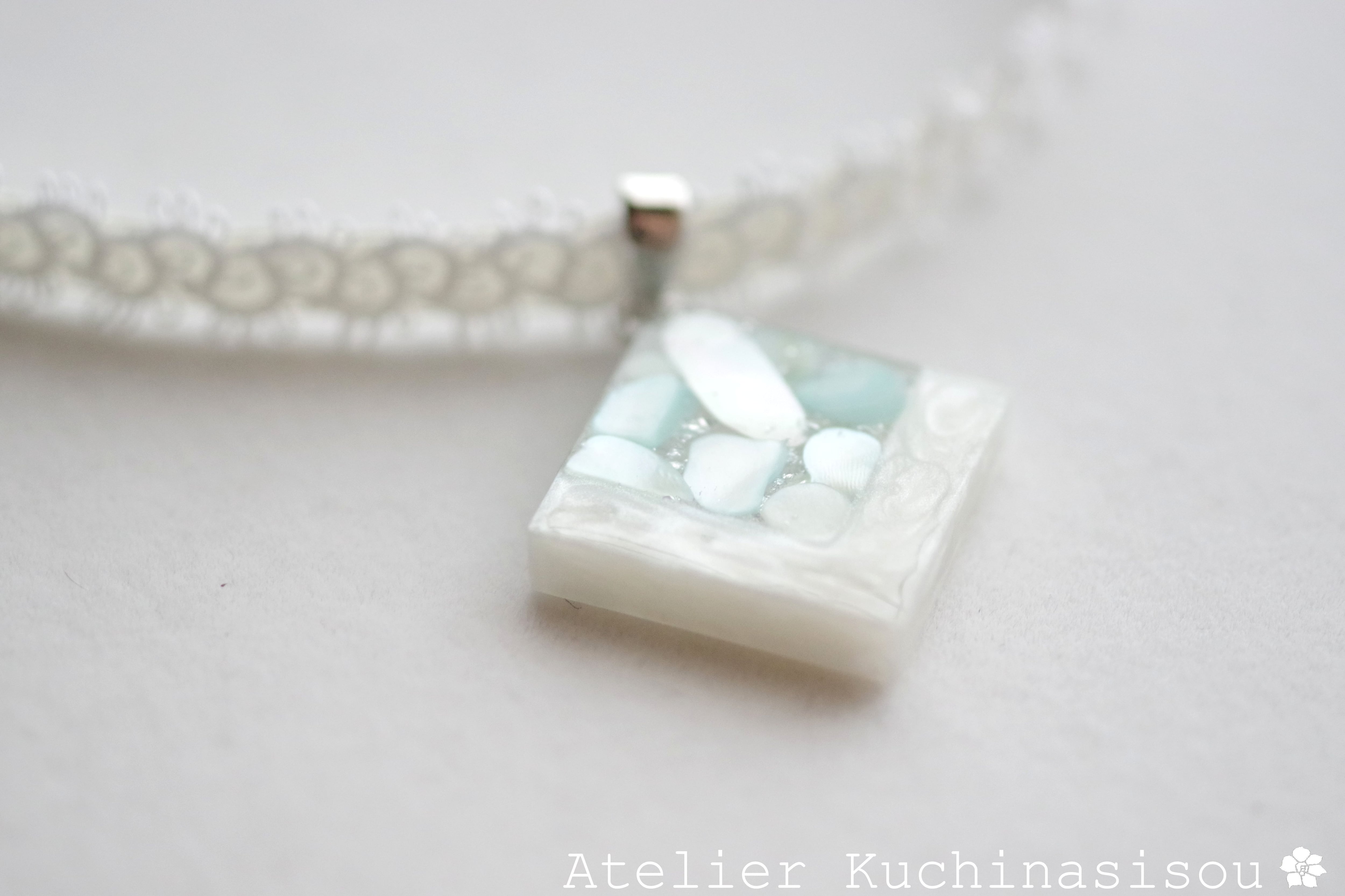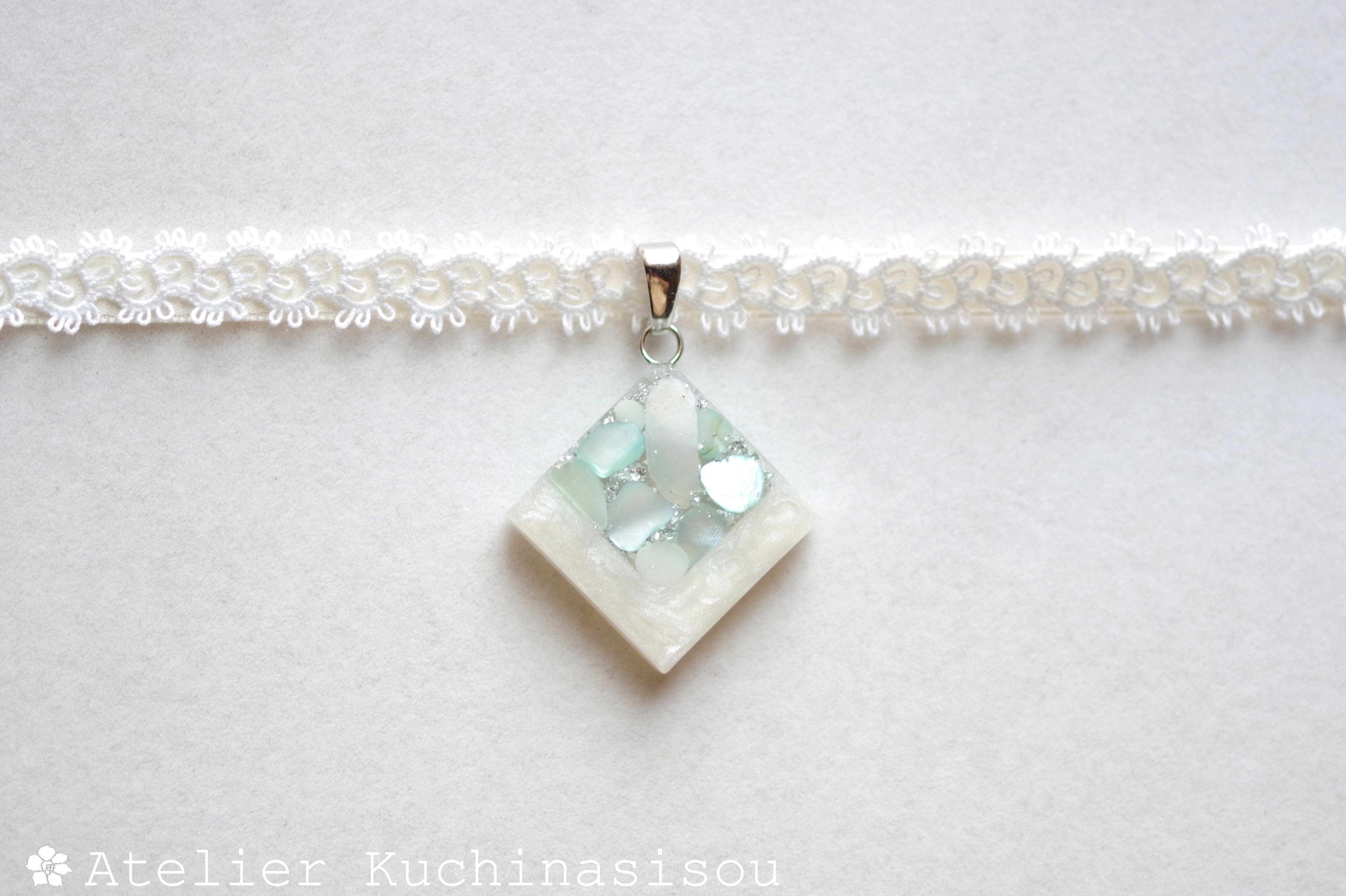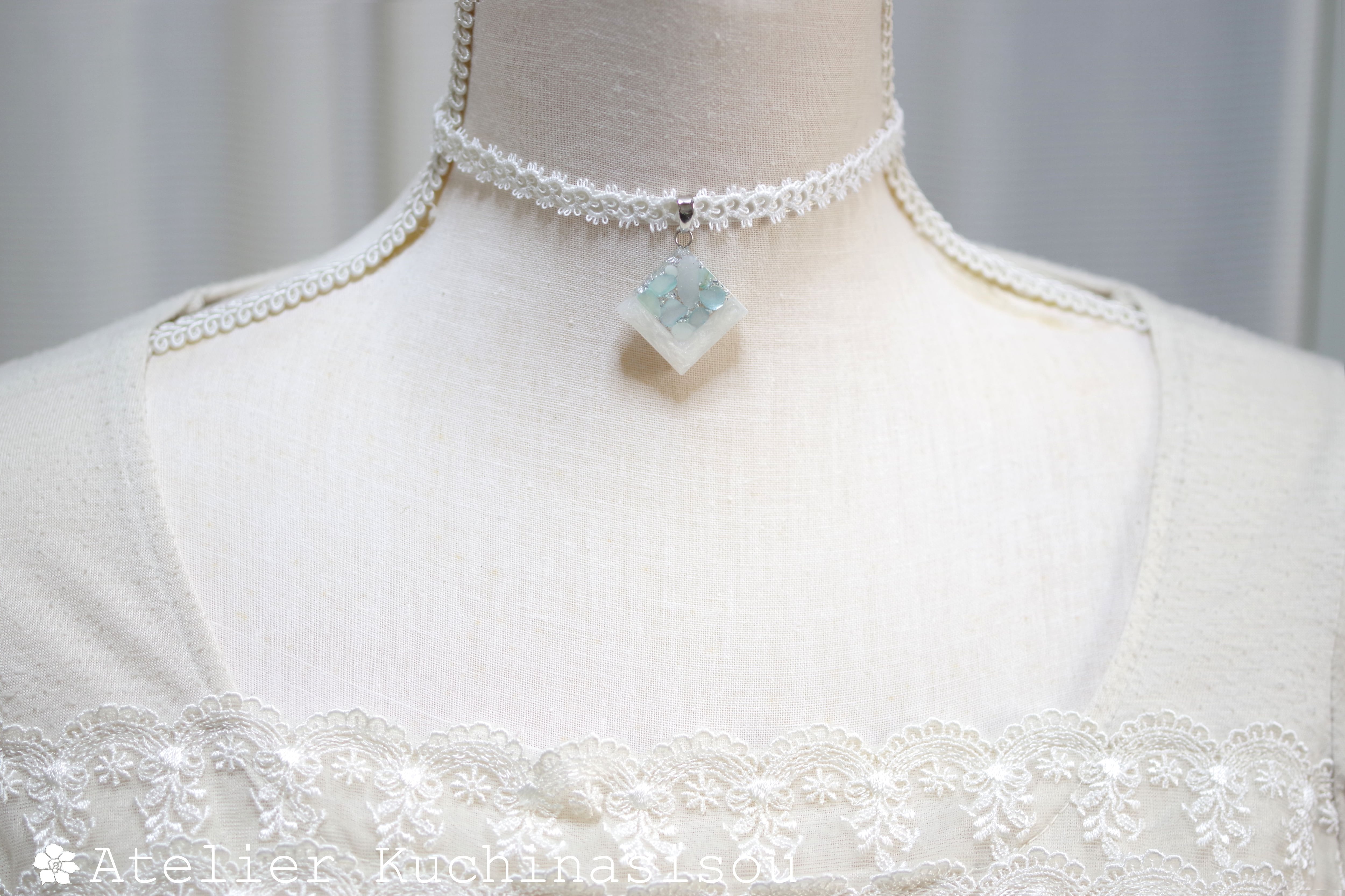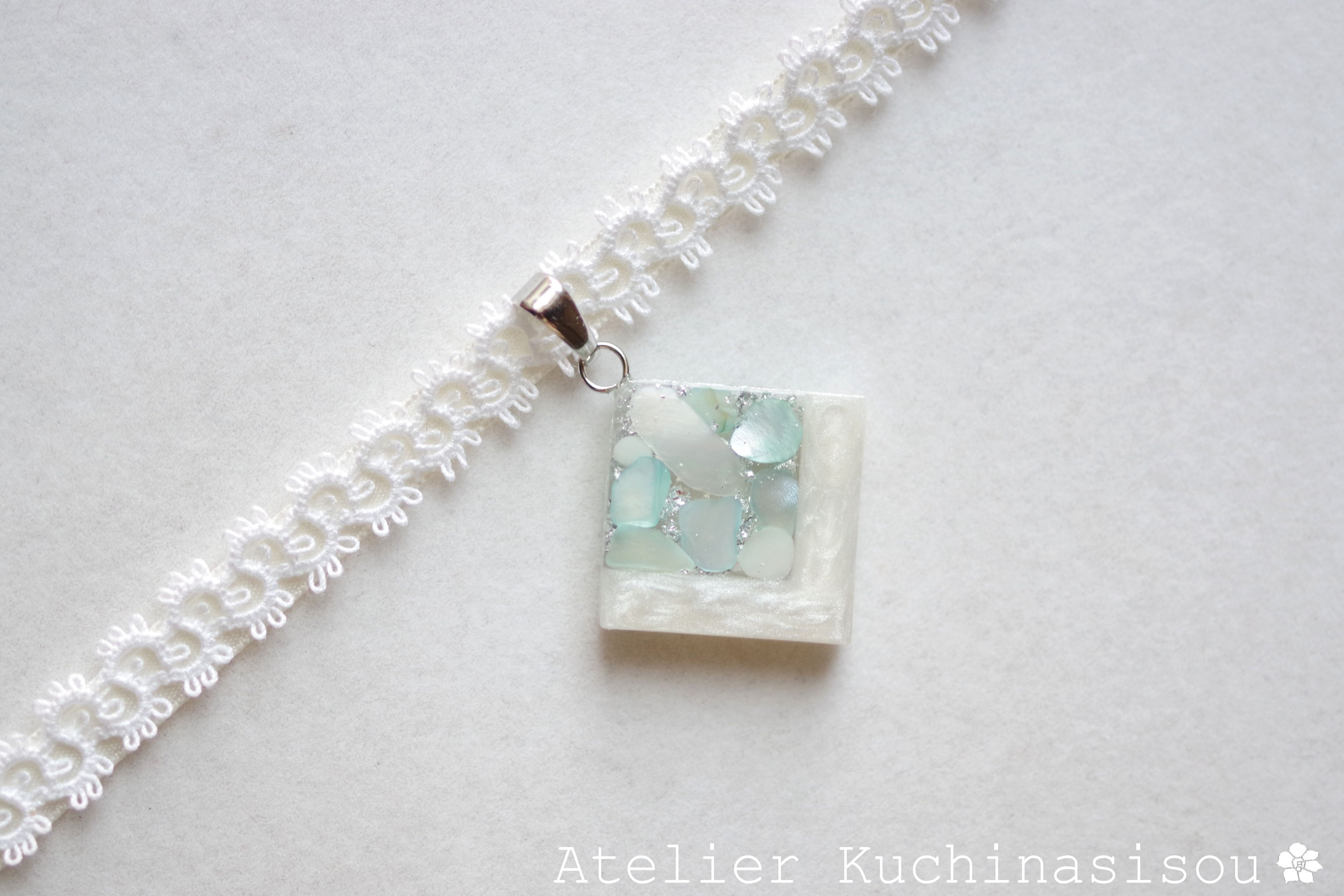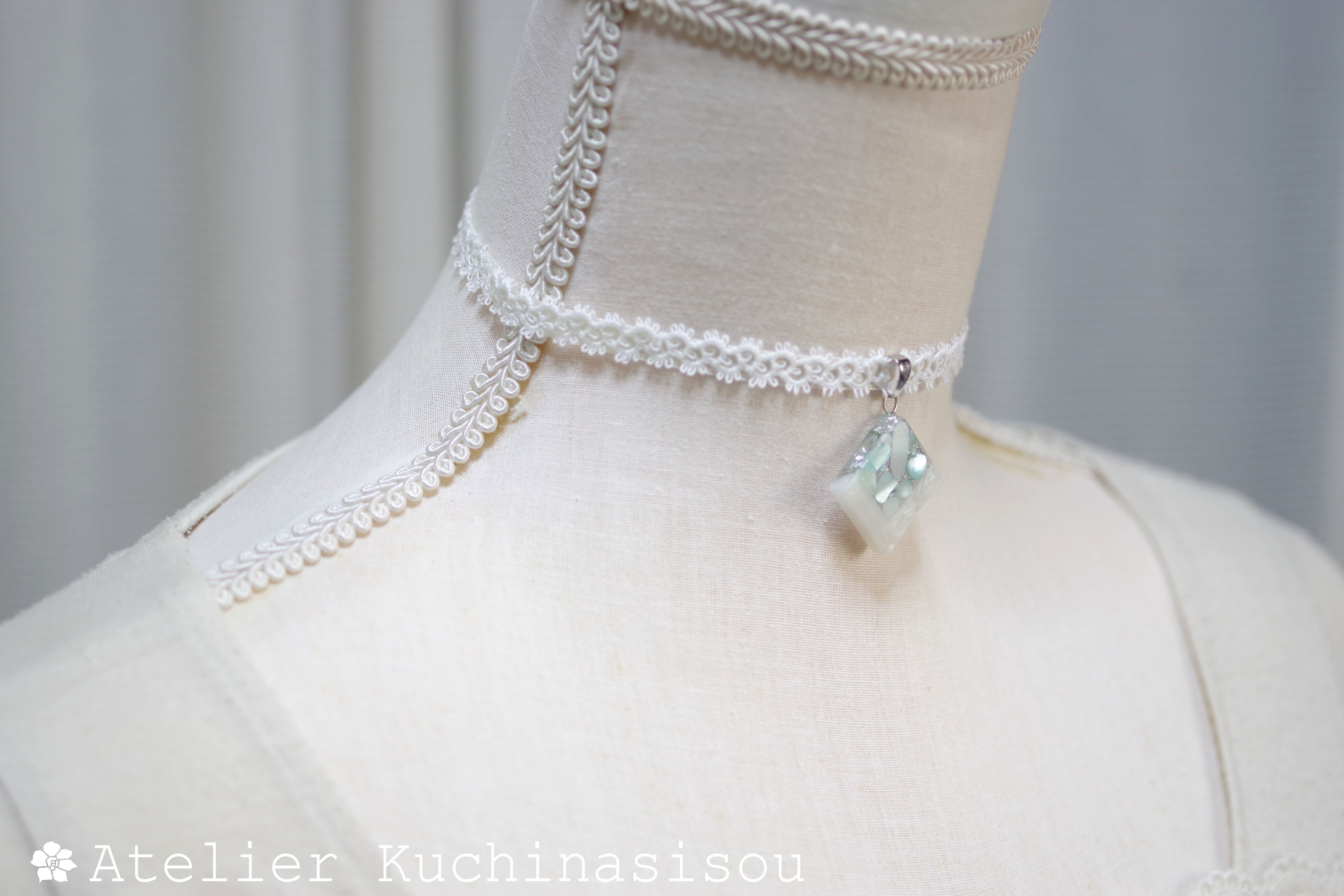 ホワイトシェルと静謐さを感じさせるアクアマリンに着色されたシェルを沈め、光沢のあるホワイトで囲ったレジンを、サテンリボンにタティングレースで装飾を施したチョーカーに仕上げました。