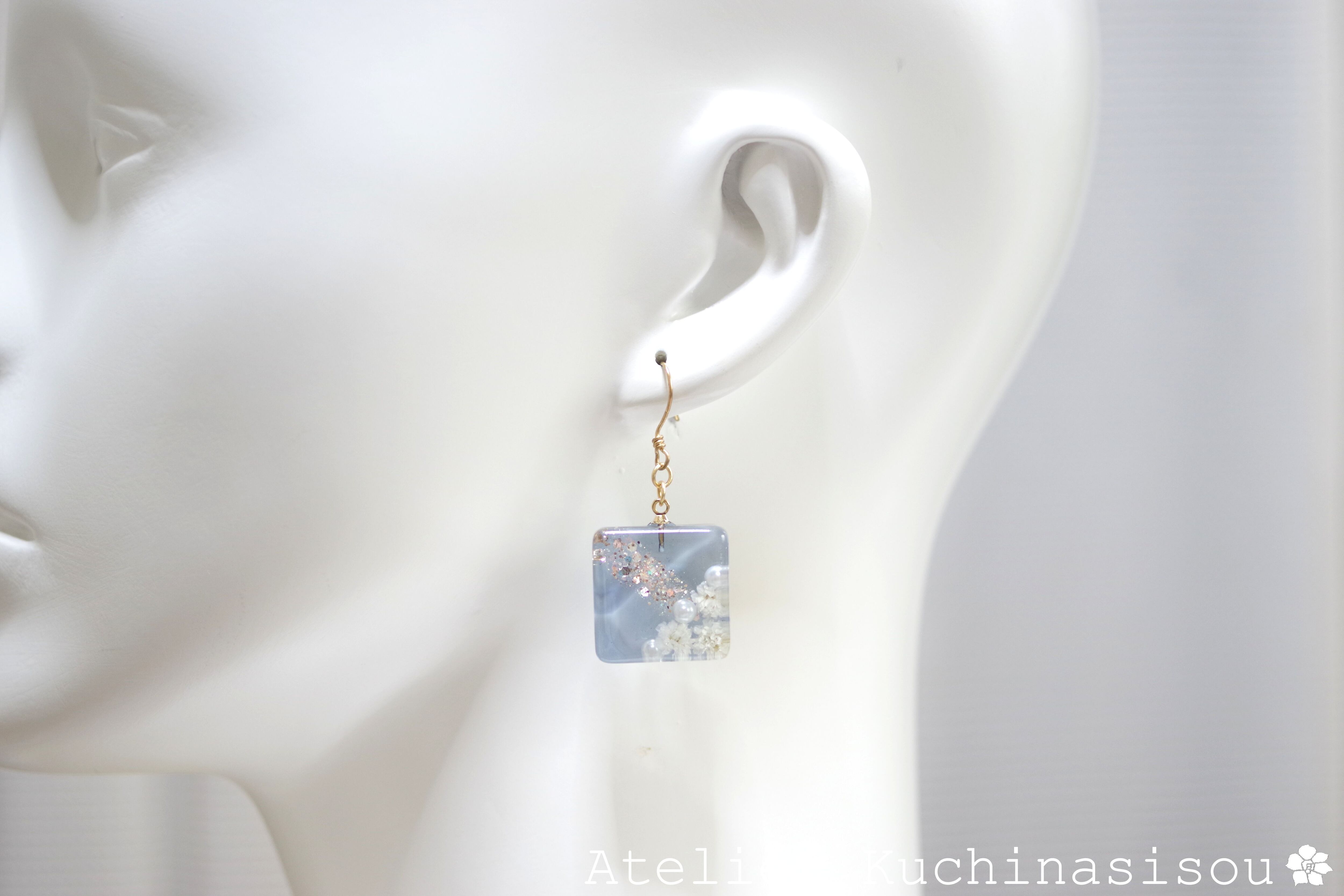 落ち着いたブルーの背景にお花やパールを配置し、ラメと白いラインを置いたデザインが上品なピアス。