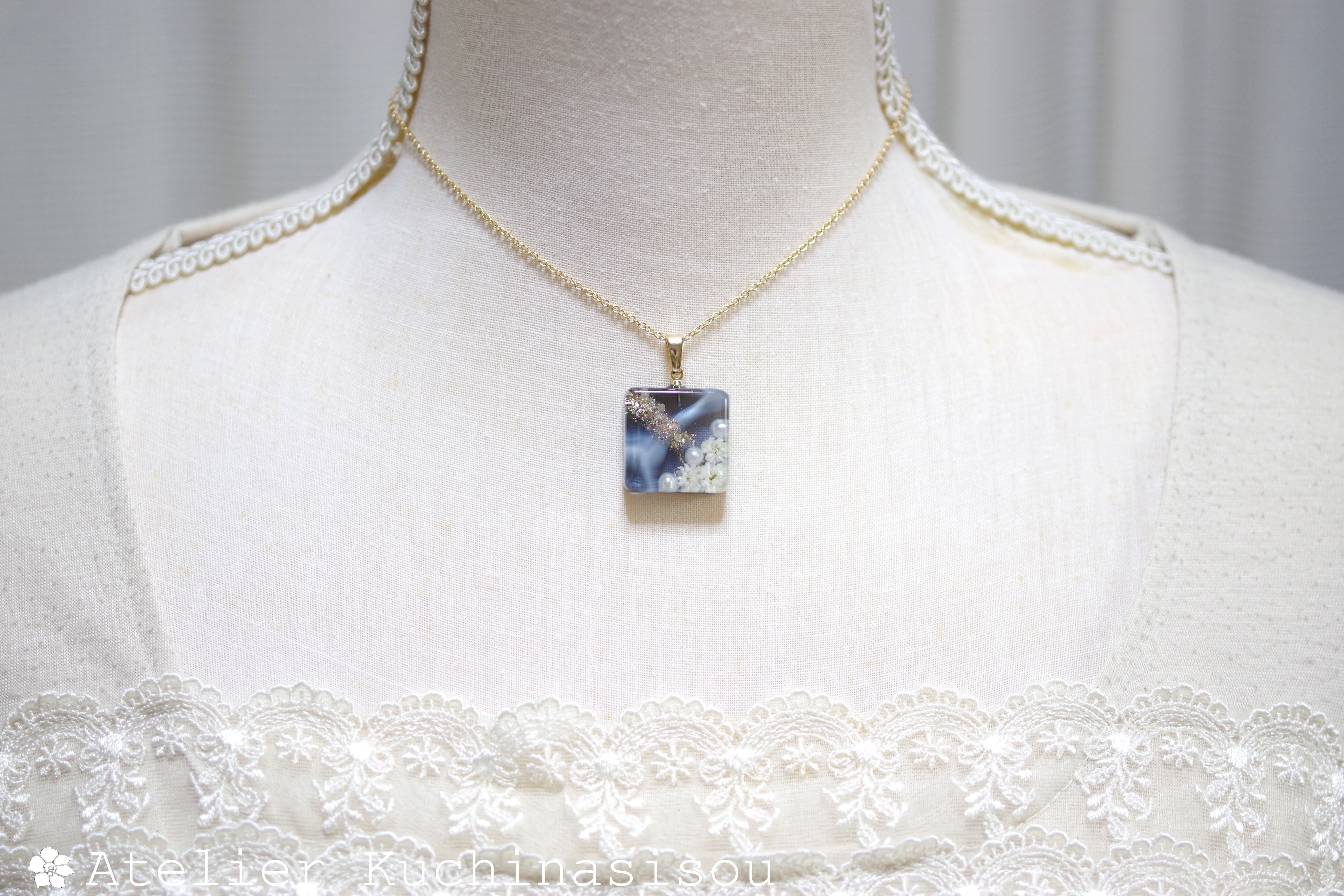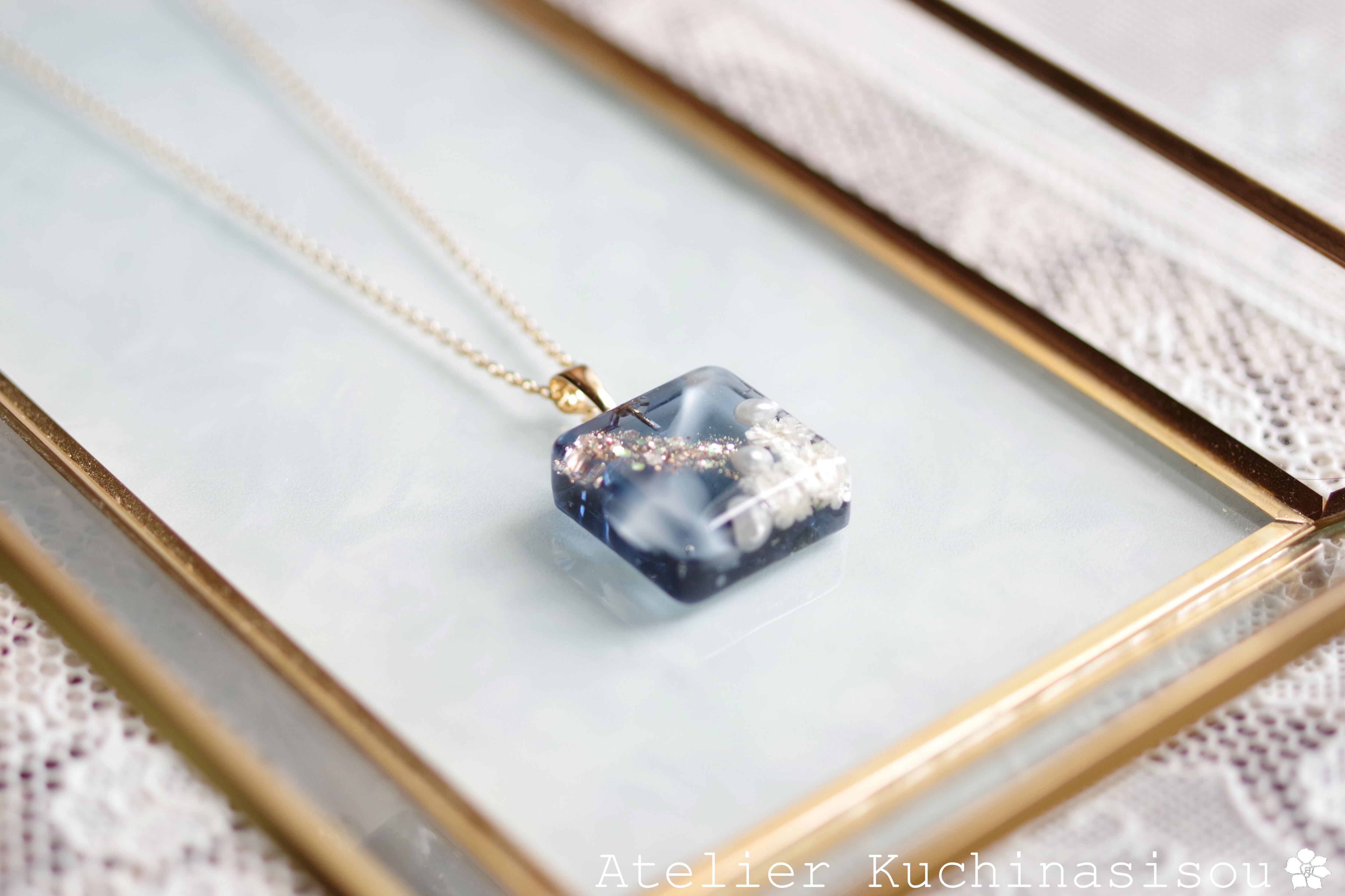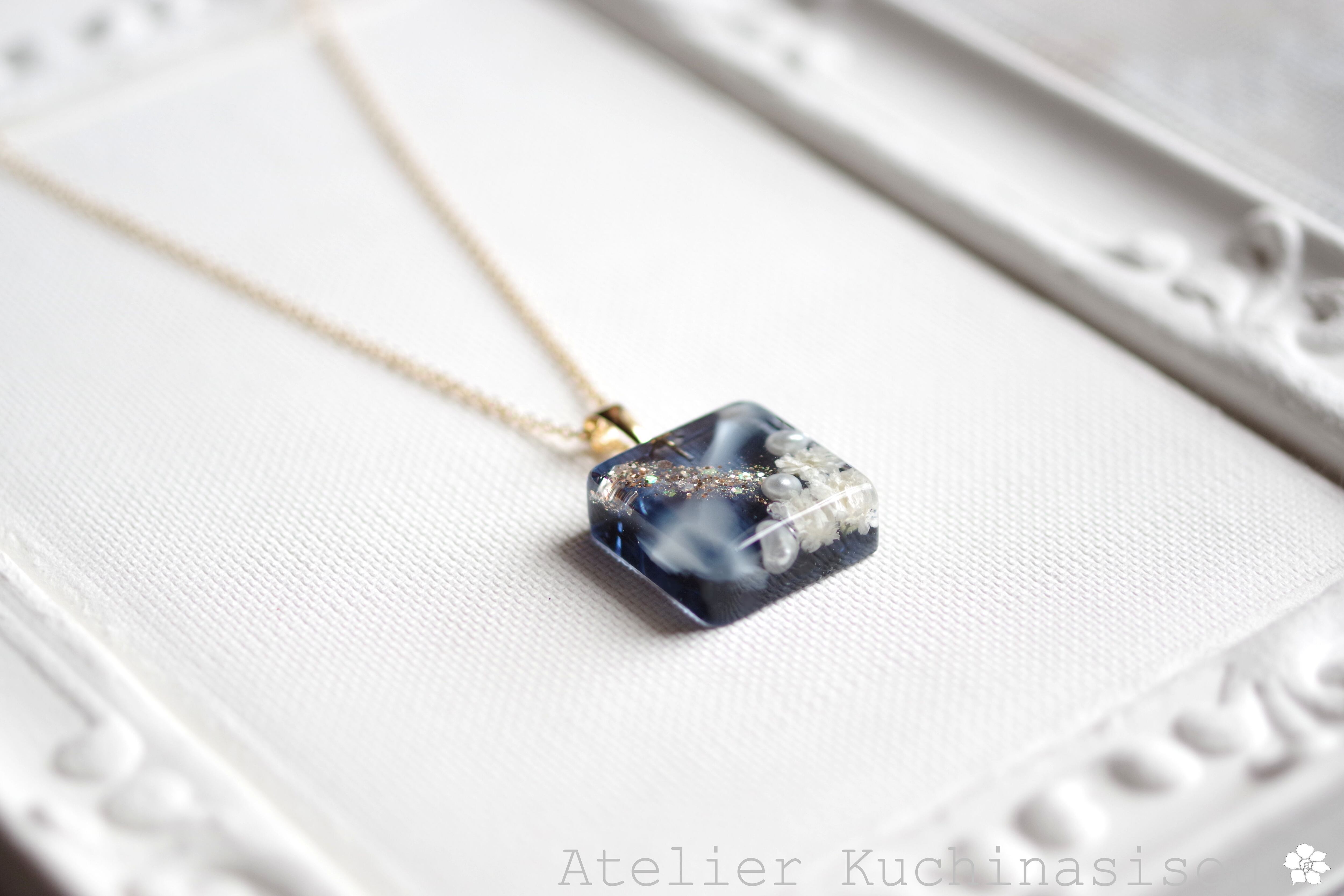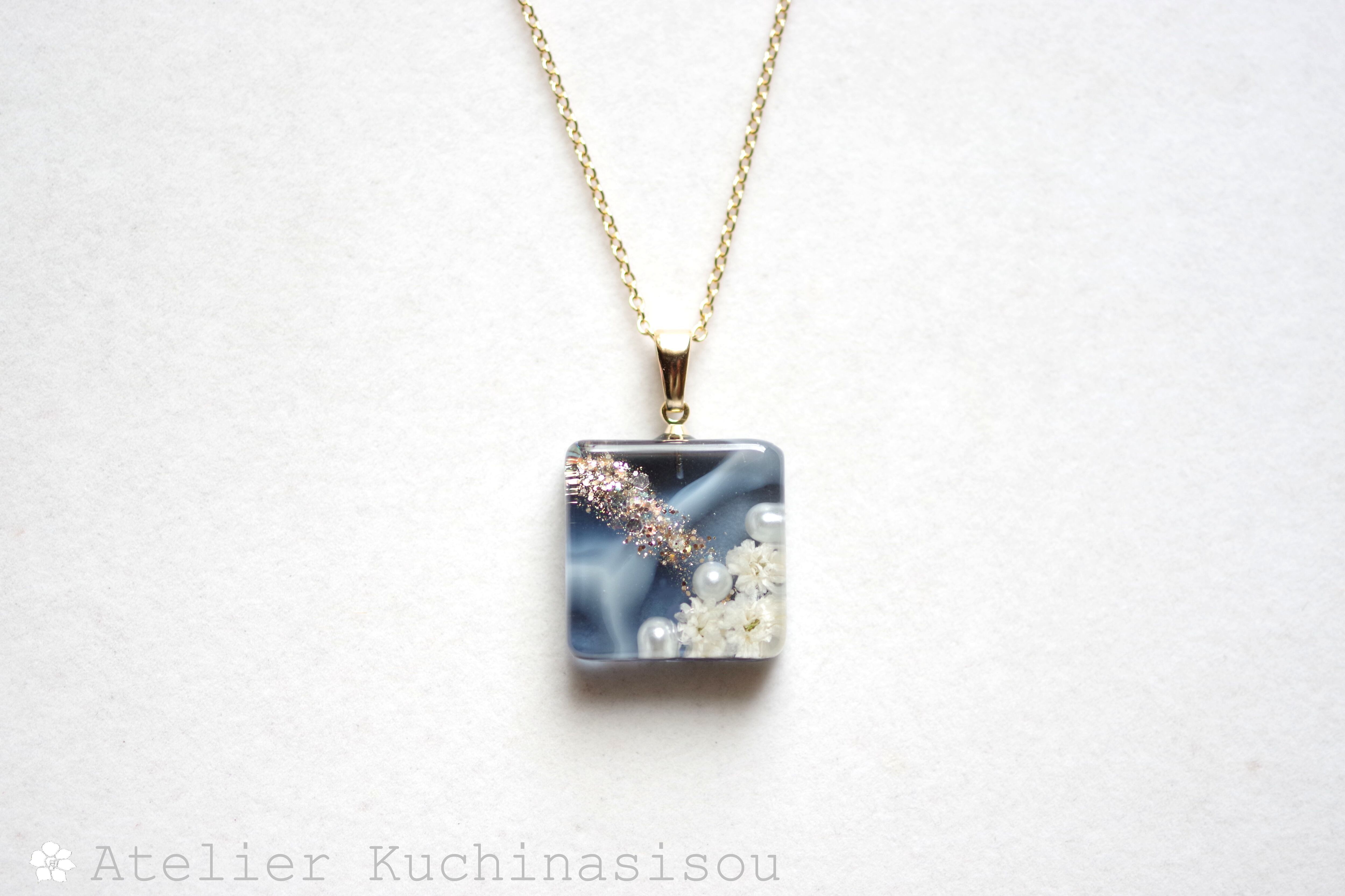 落ち着いたブルーの背景にお花やパールを配置し、ラメと白いラインを置いたデザインが上品なペンダント。