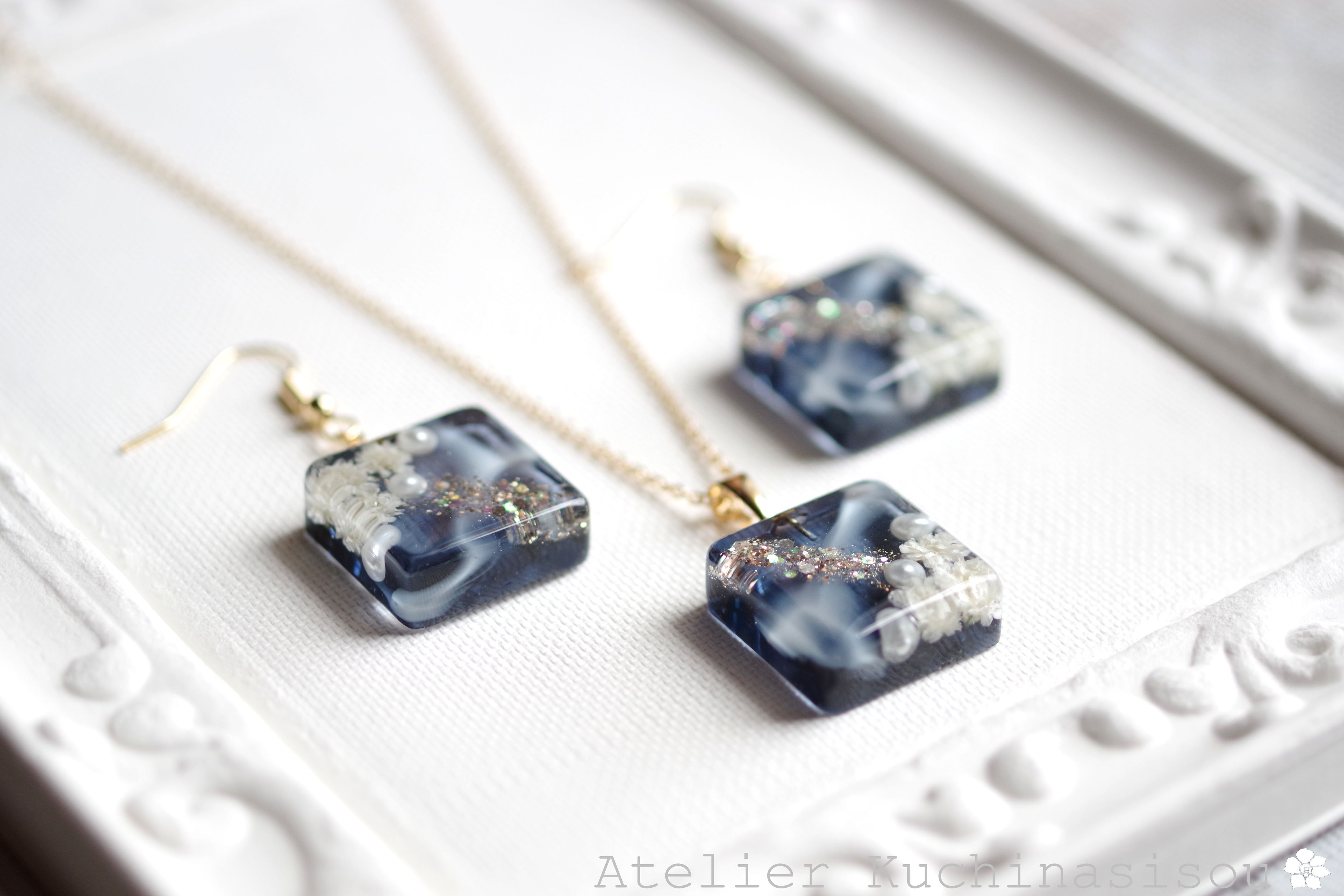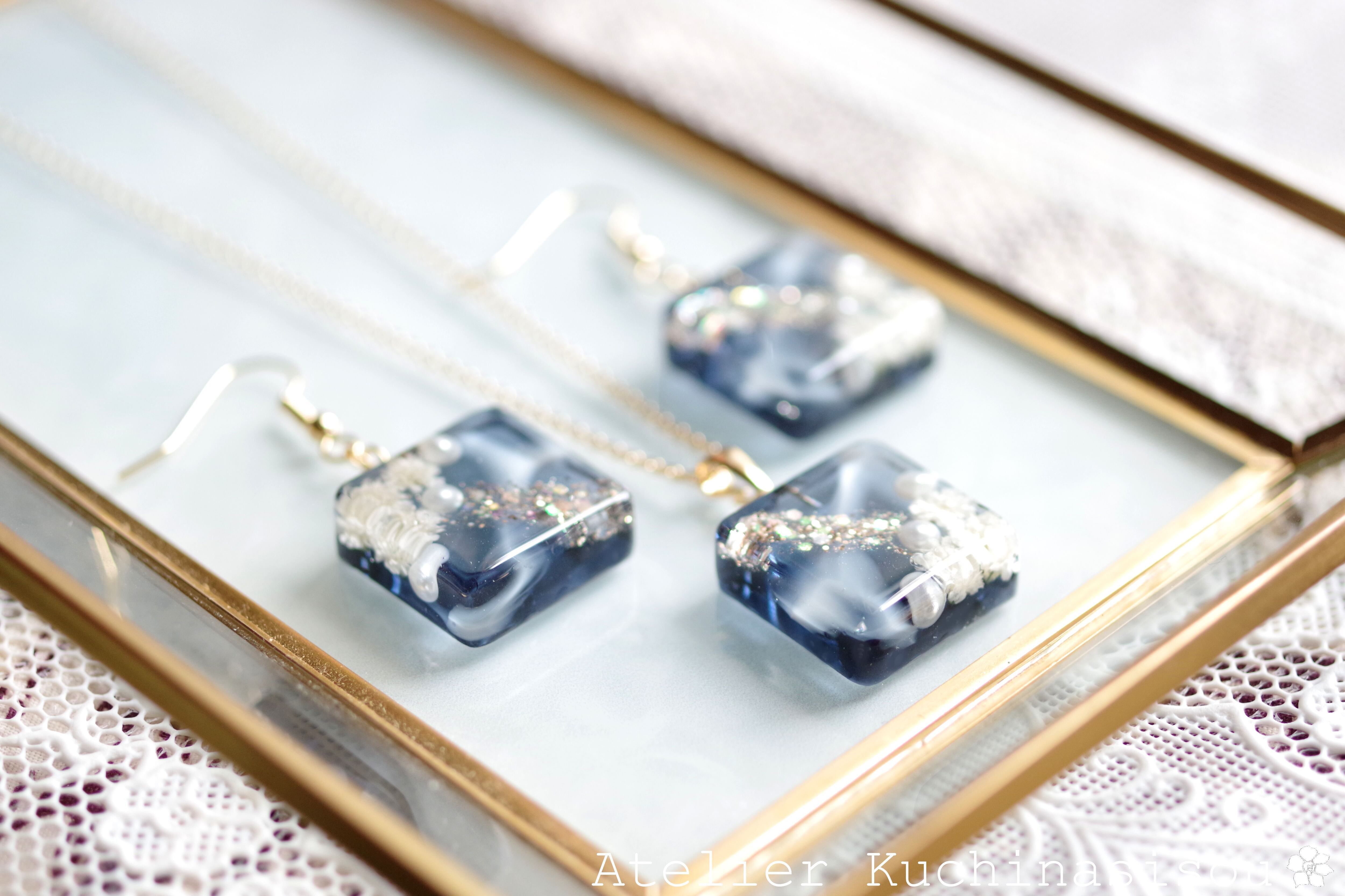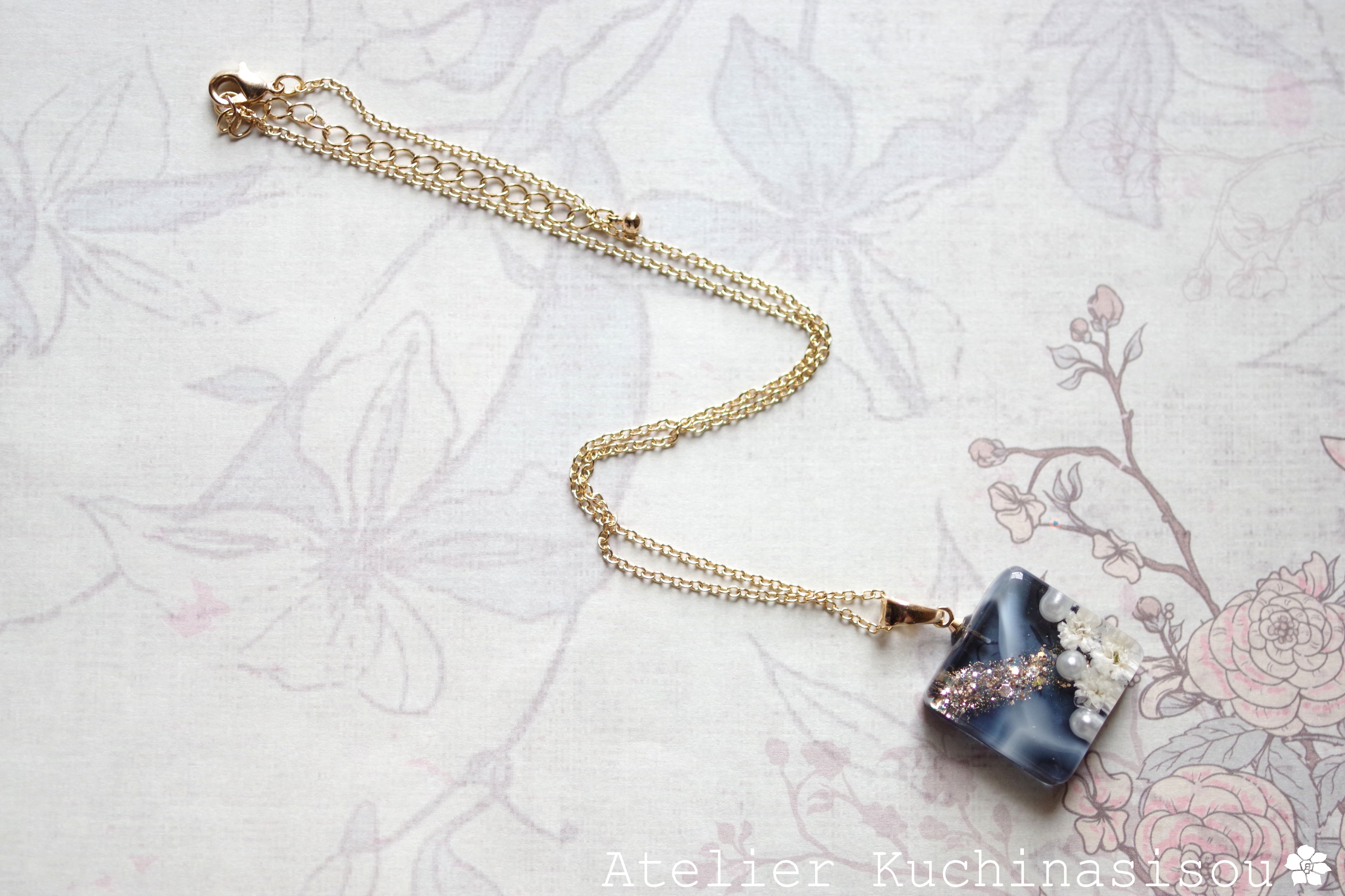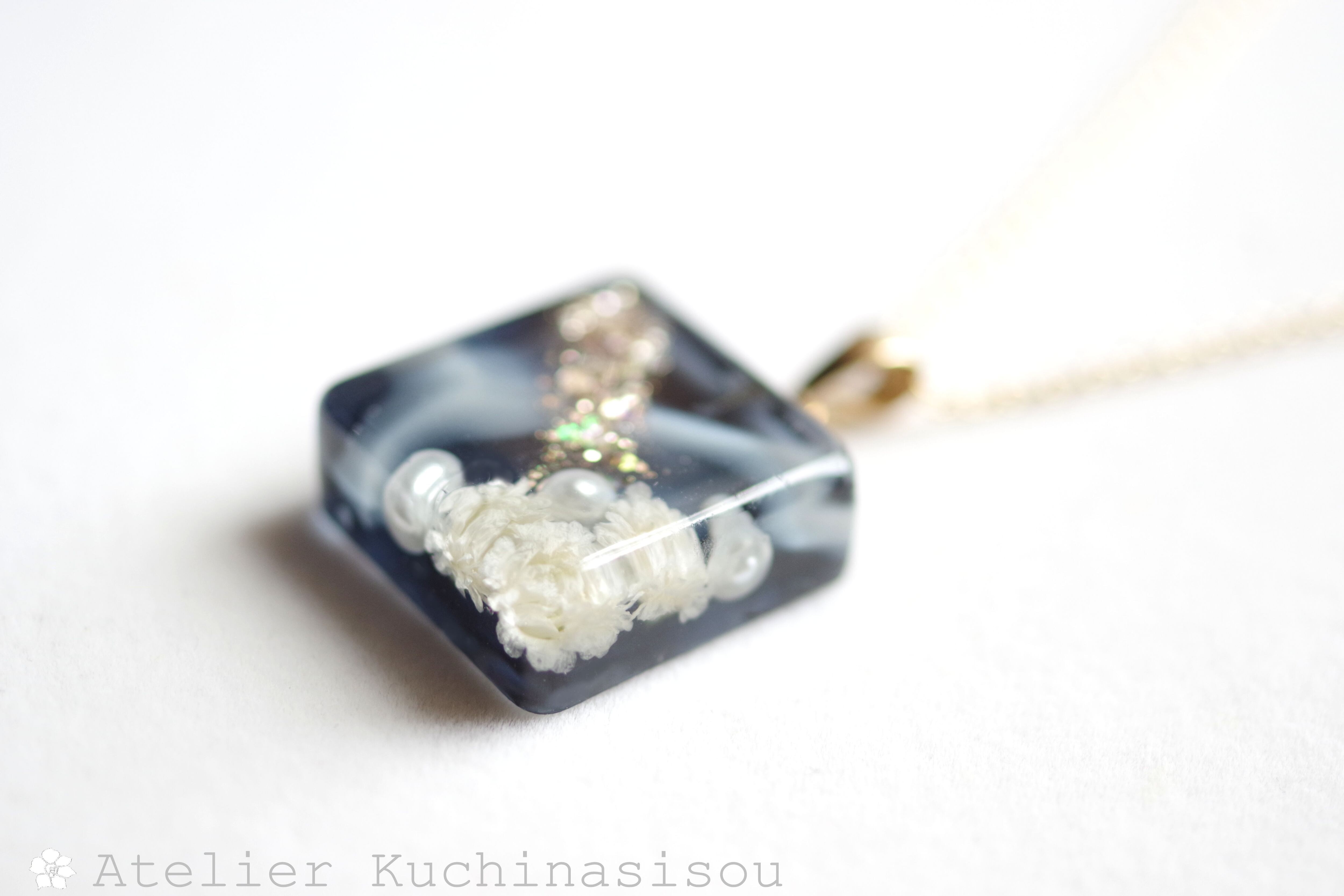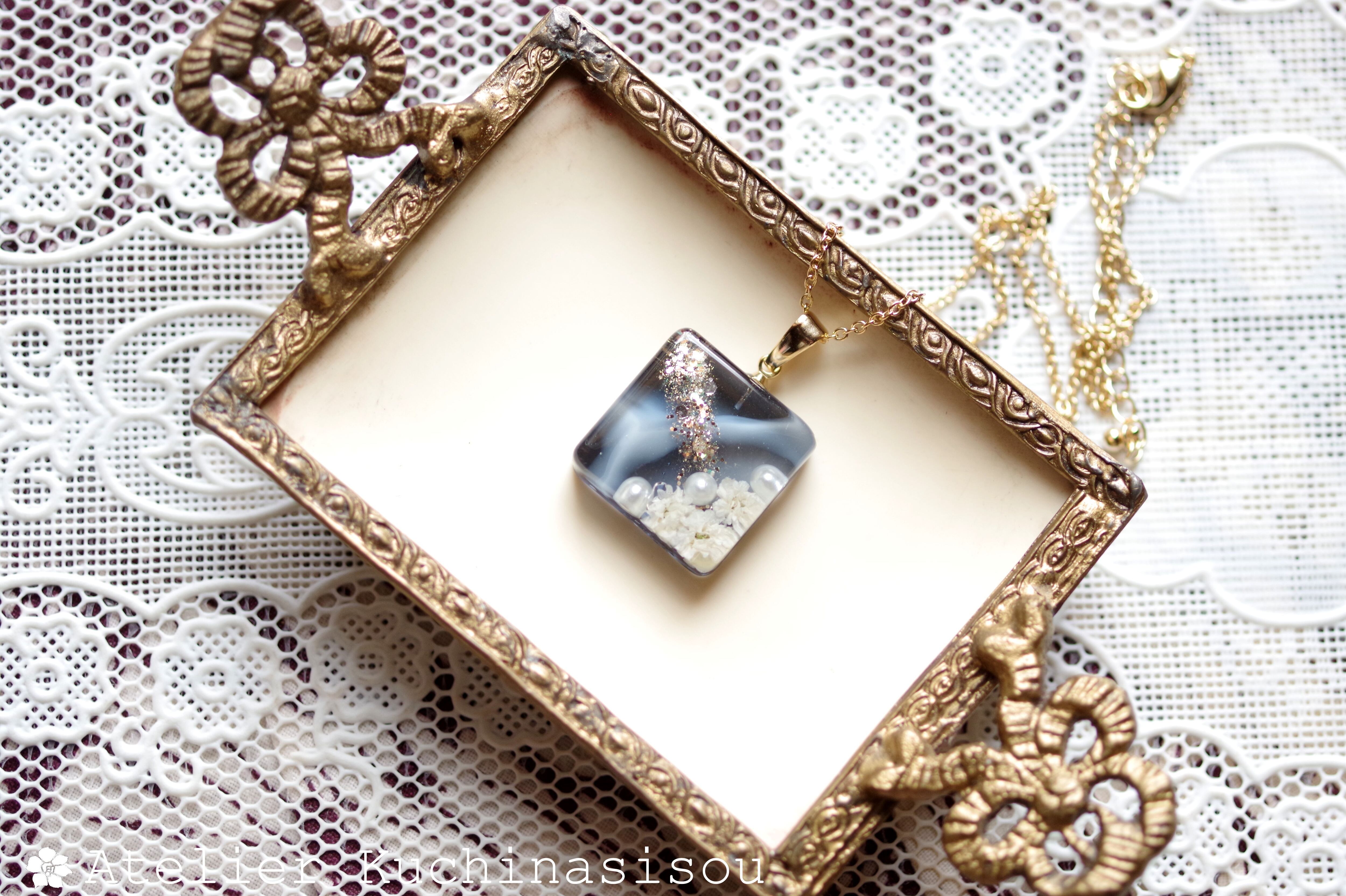 落ち着いたブルーの背景にお花やパールを配置し、ラメと白いラインを置いたデザインが上品なペンダント。