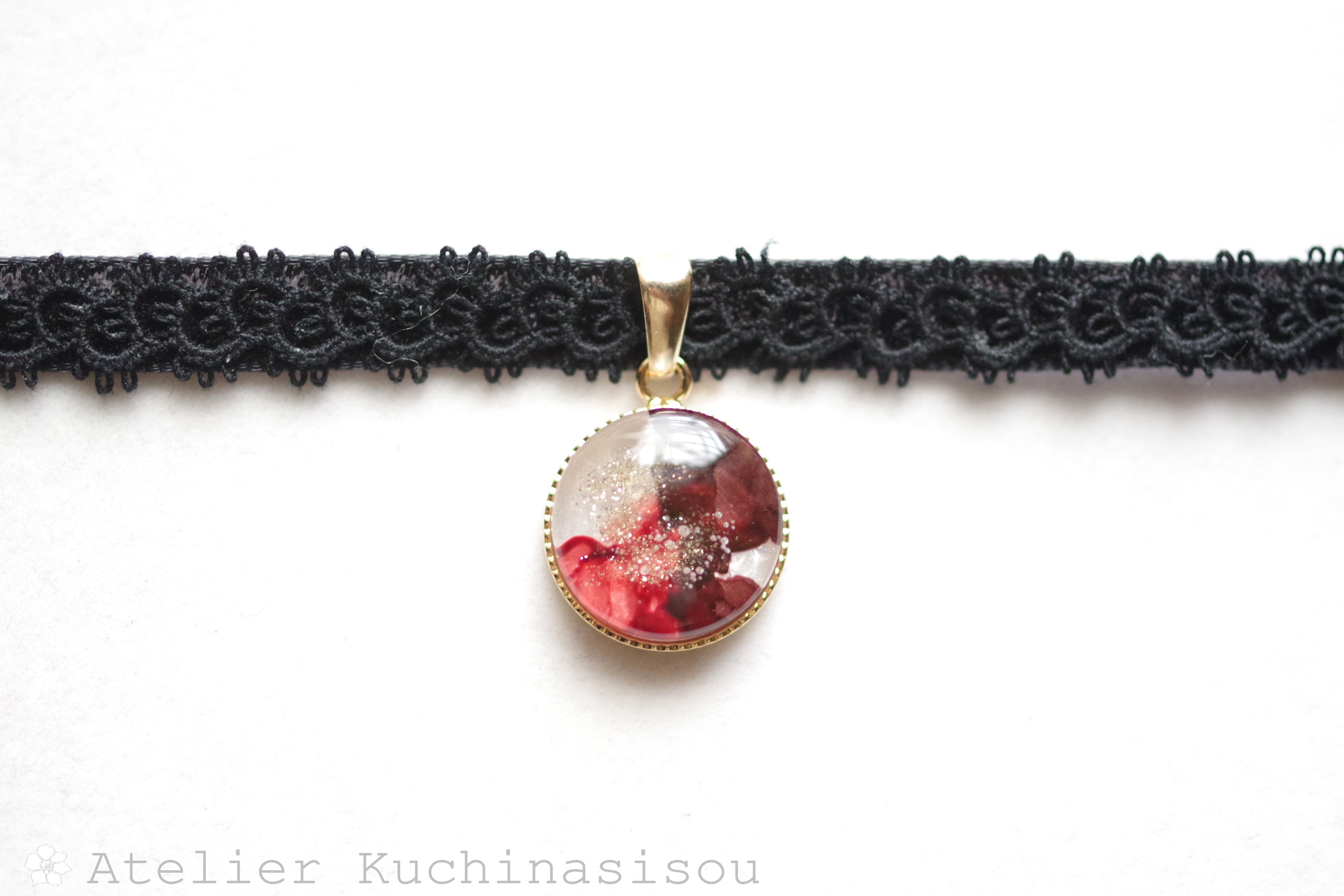 ブラウンとレッドが滲み溶けあい織りなす模様が美しいレジンを、ベルベットリボンにタティングレースで装飾を施したチョーカーに仕上げました。