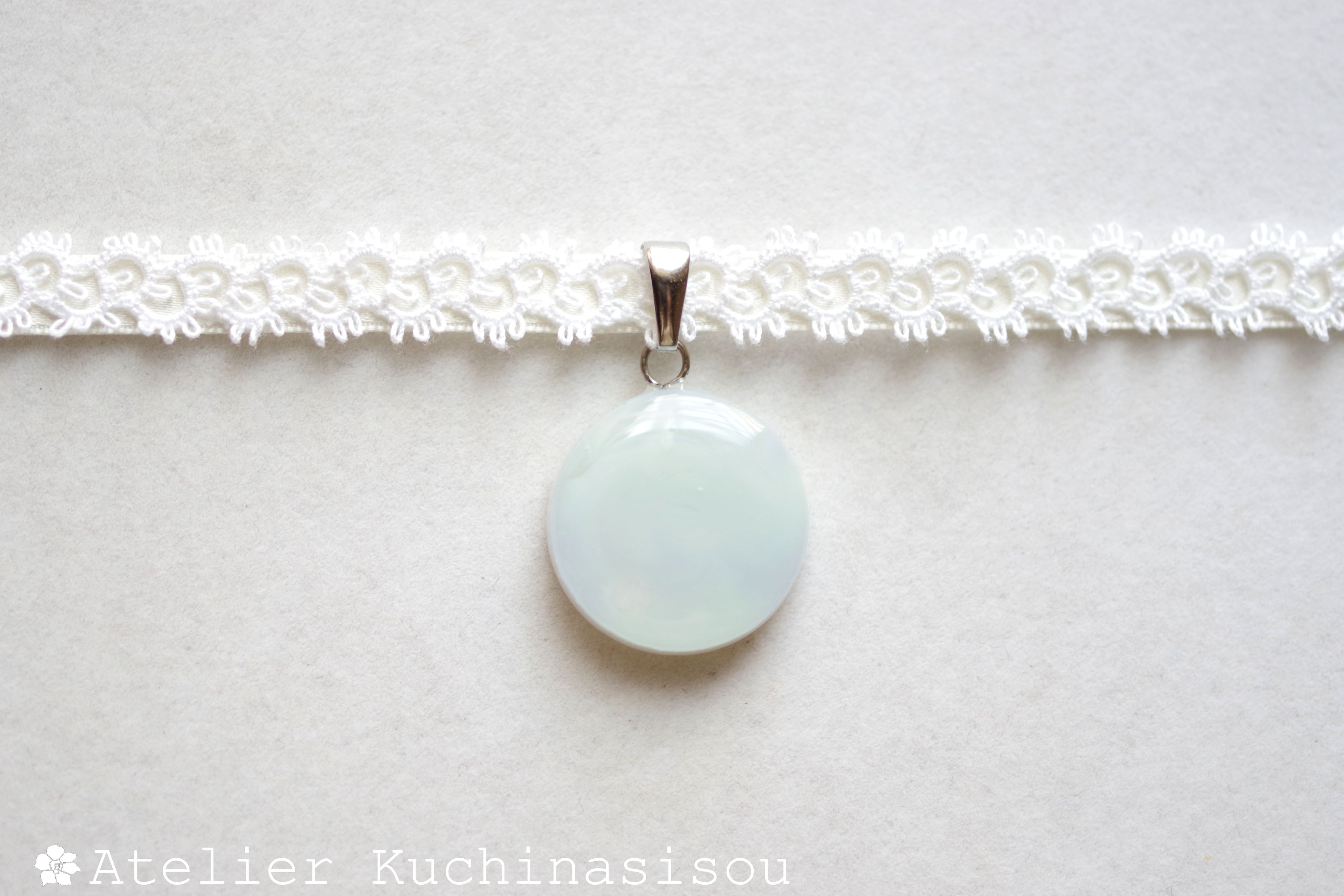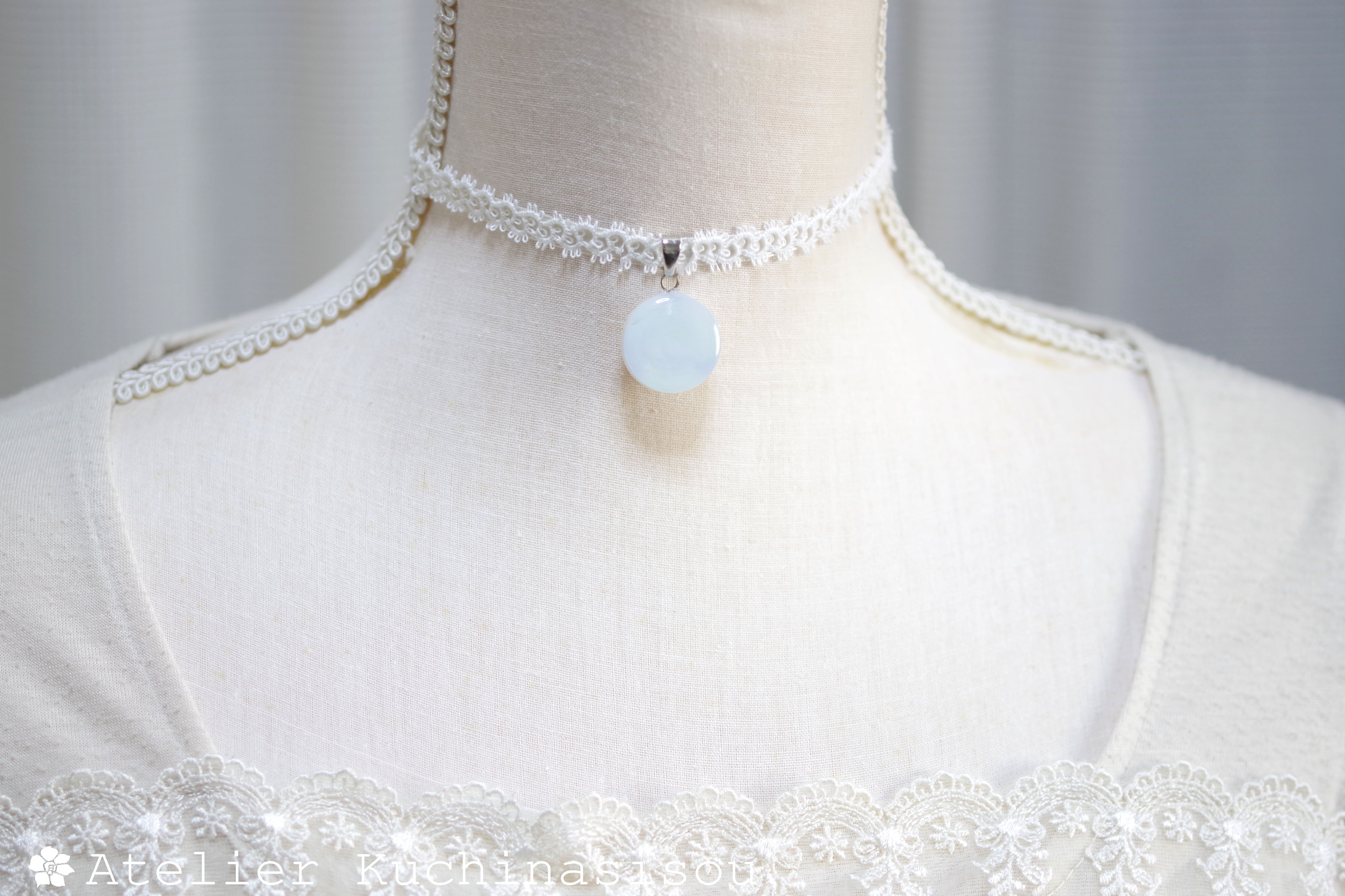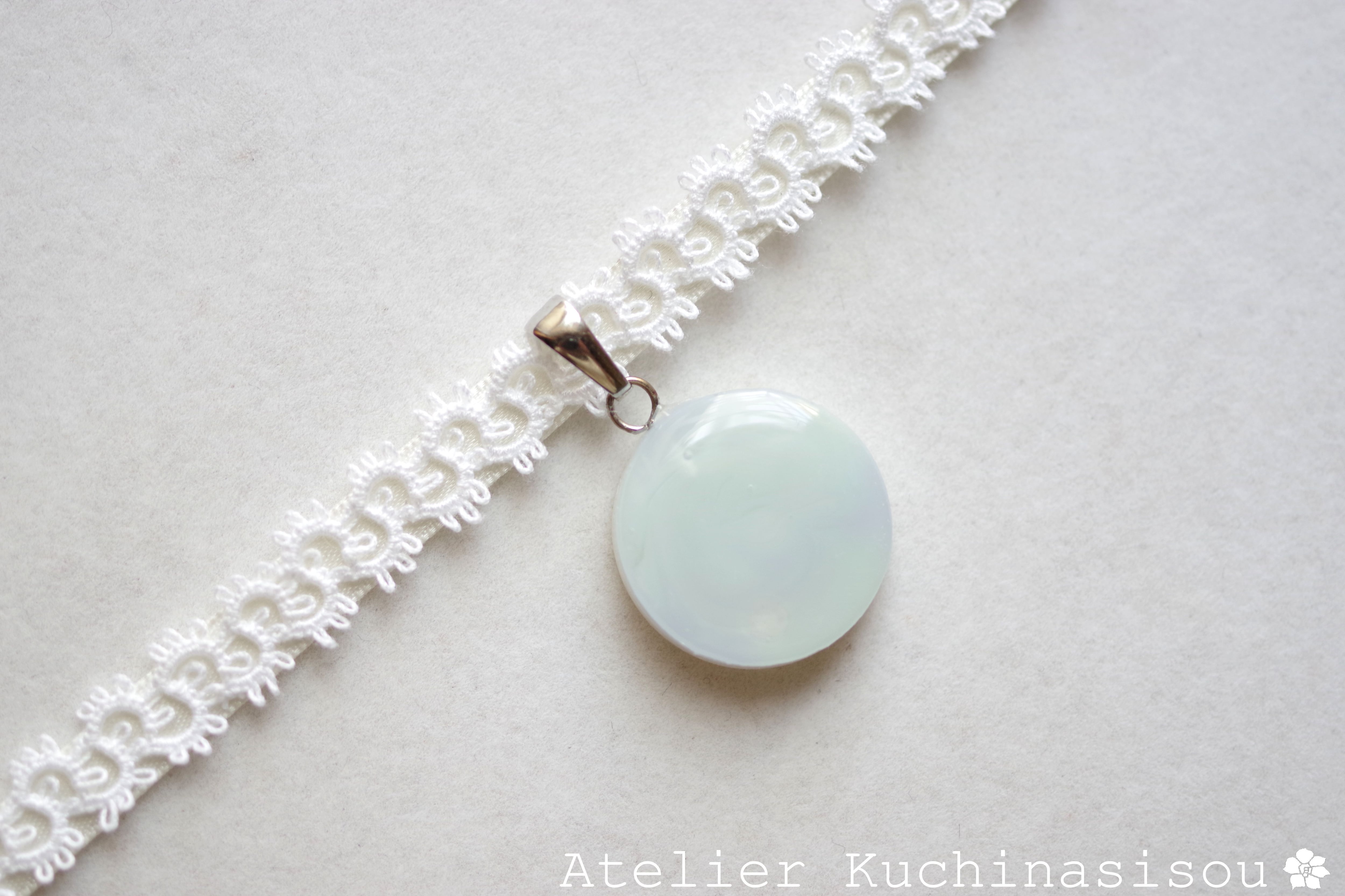 白と見まがうほどに淡い水色が優しい印象を与えるレジンを、サテンリボンにタティングレースで装飾を施したチョーカーに仕上げました。