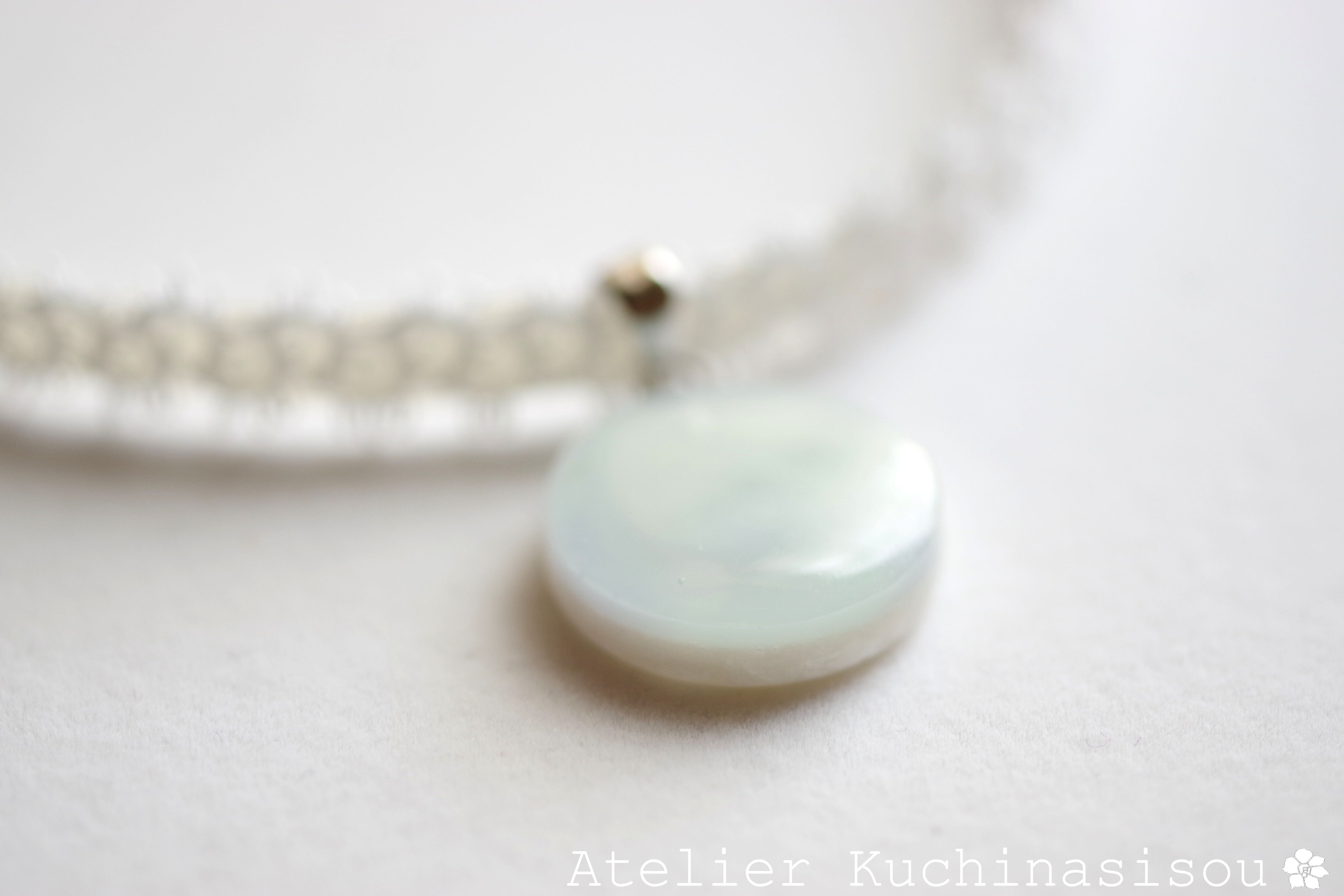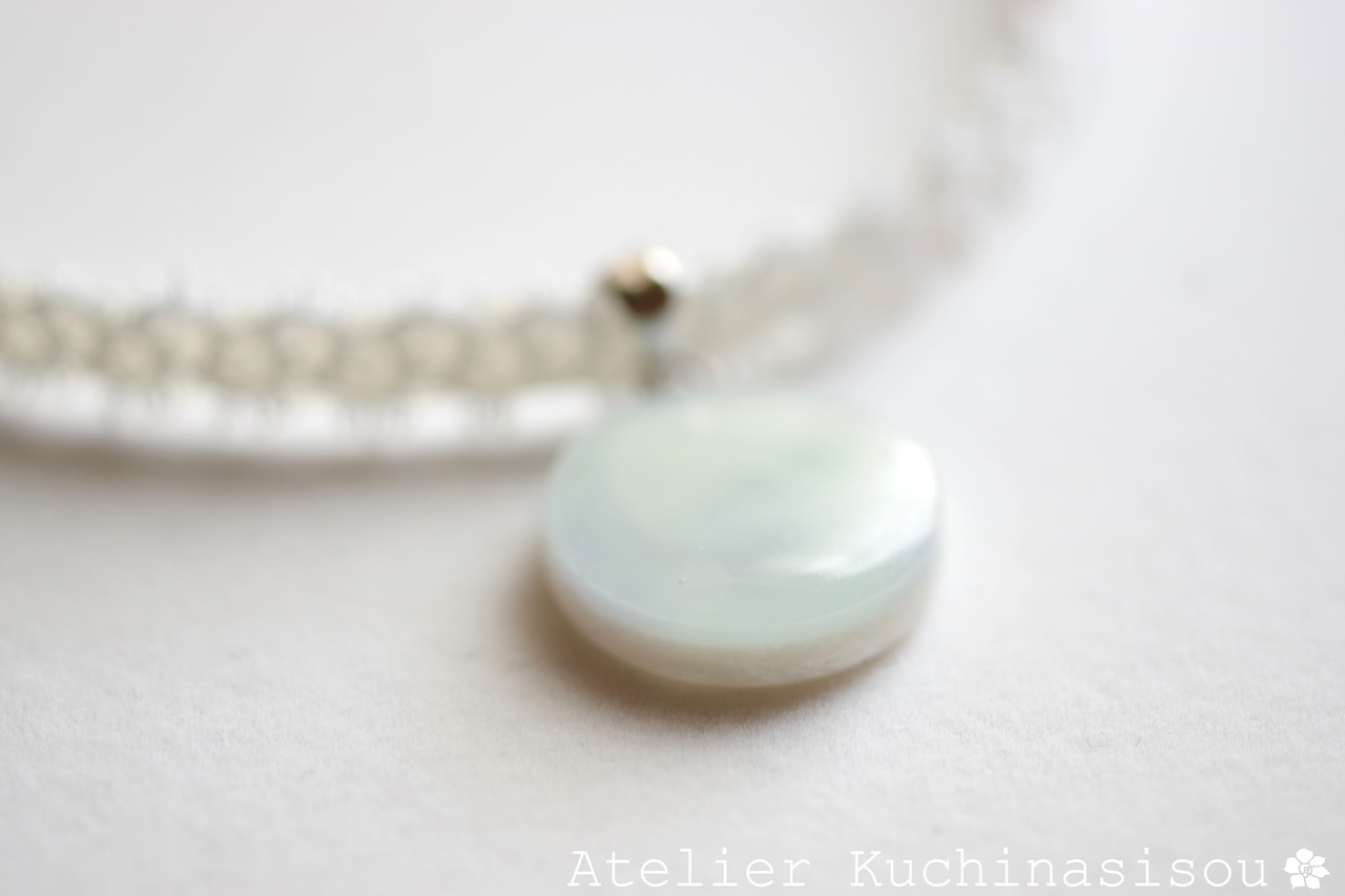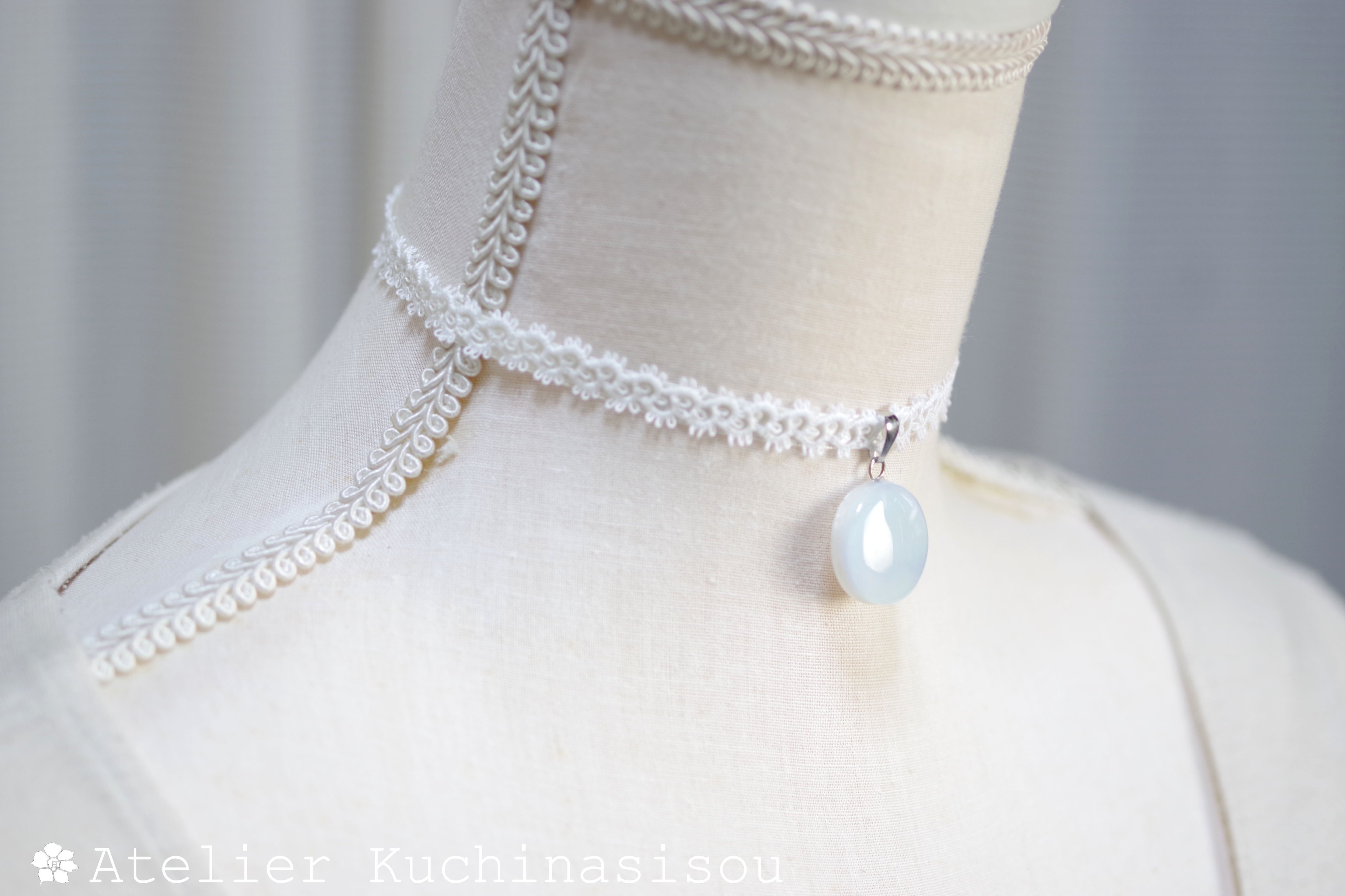白と見まがうほどに淡い水色が優しい印象を与えるレジンを、サテンリボンにタティングレースで装飾を施したチョーカーに仕上げました。