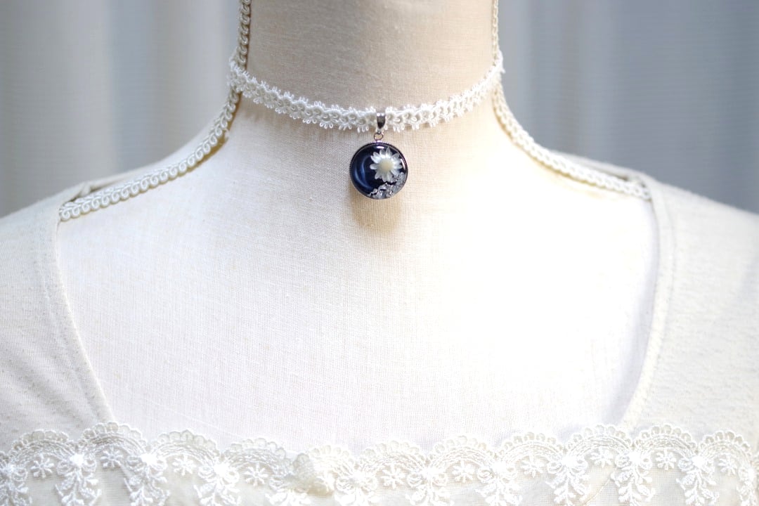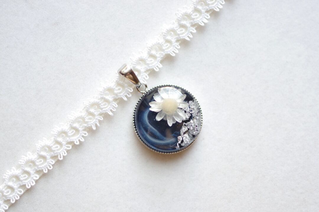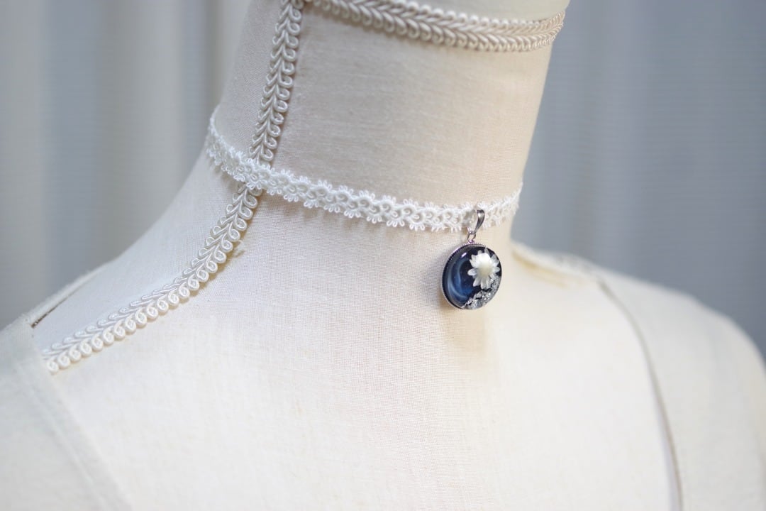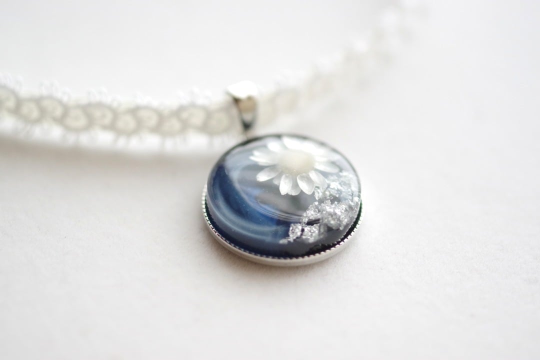 深いコバルトブルーに白いお花と銀箔をあしらった知的で愛らしいレジンを、サテンリボンにタティングレースで装飾を施したチョーカーに仕上げました。
