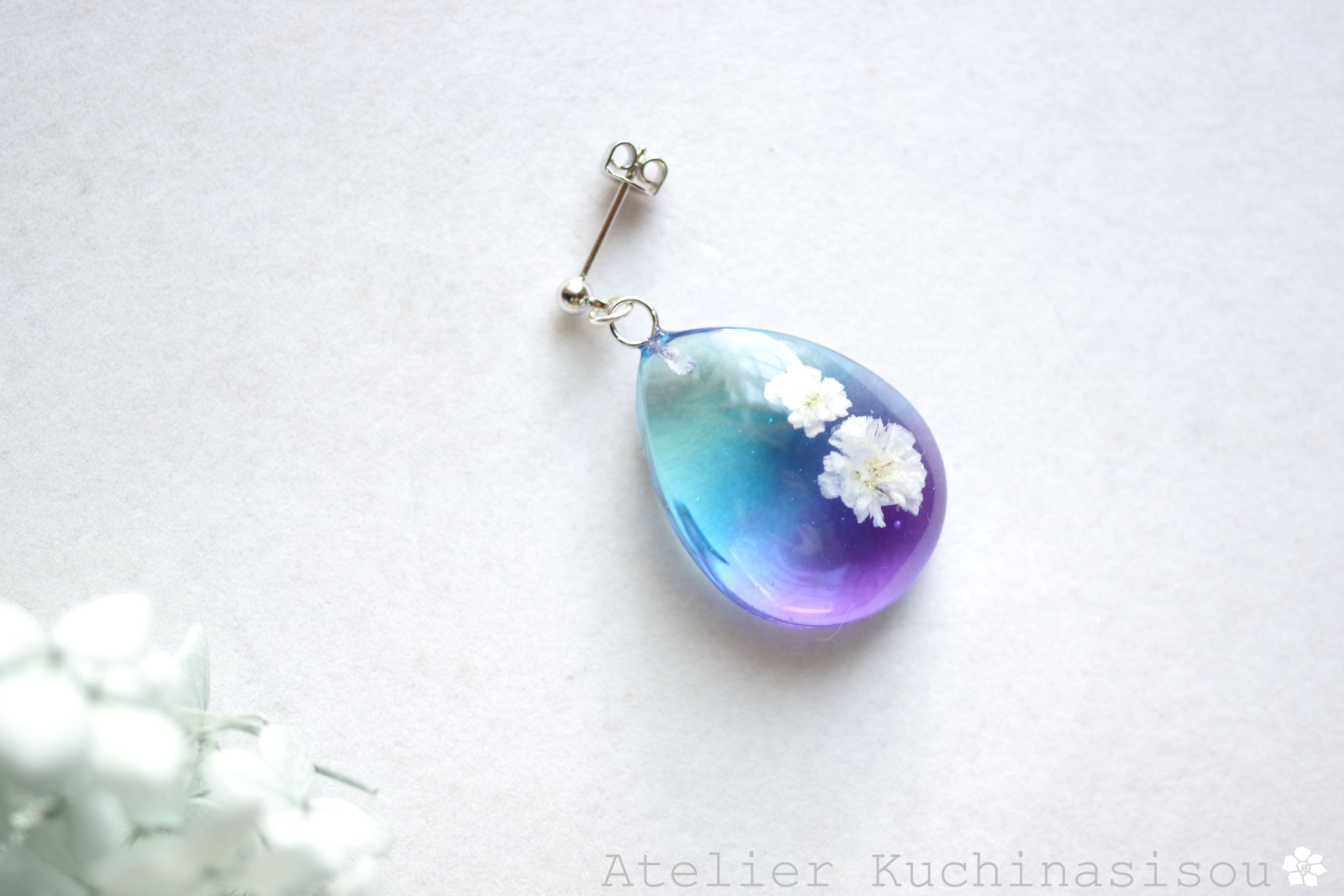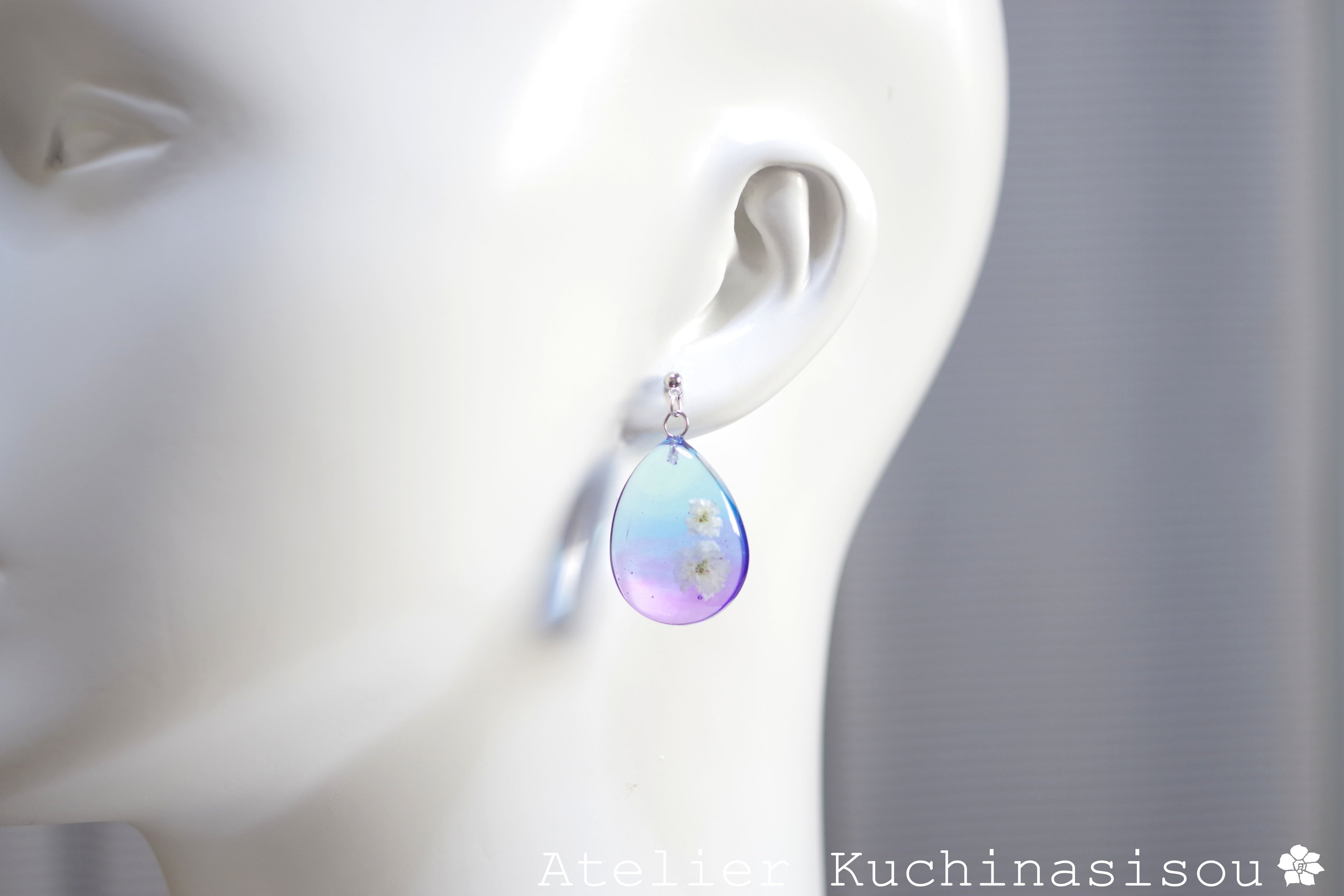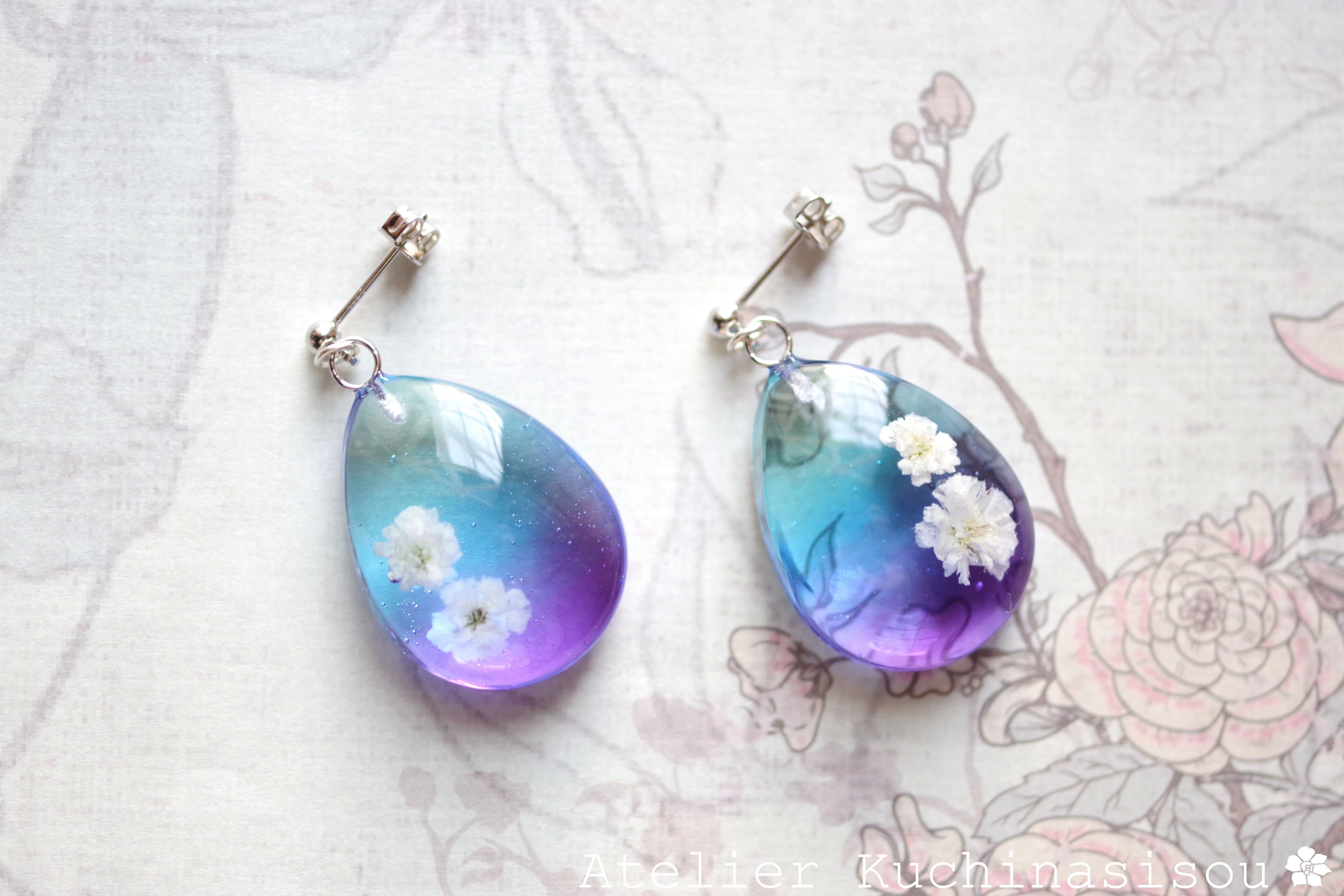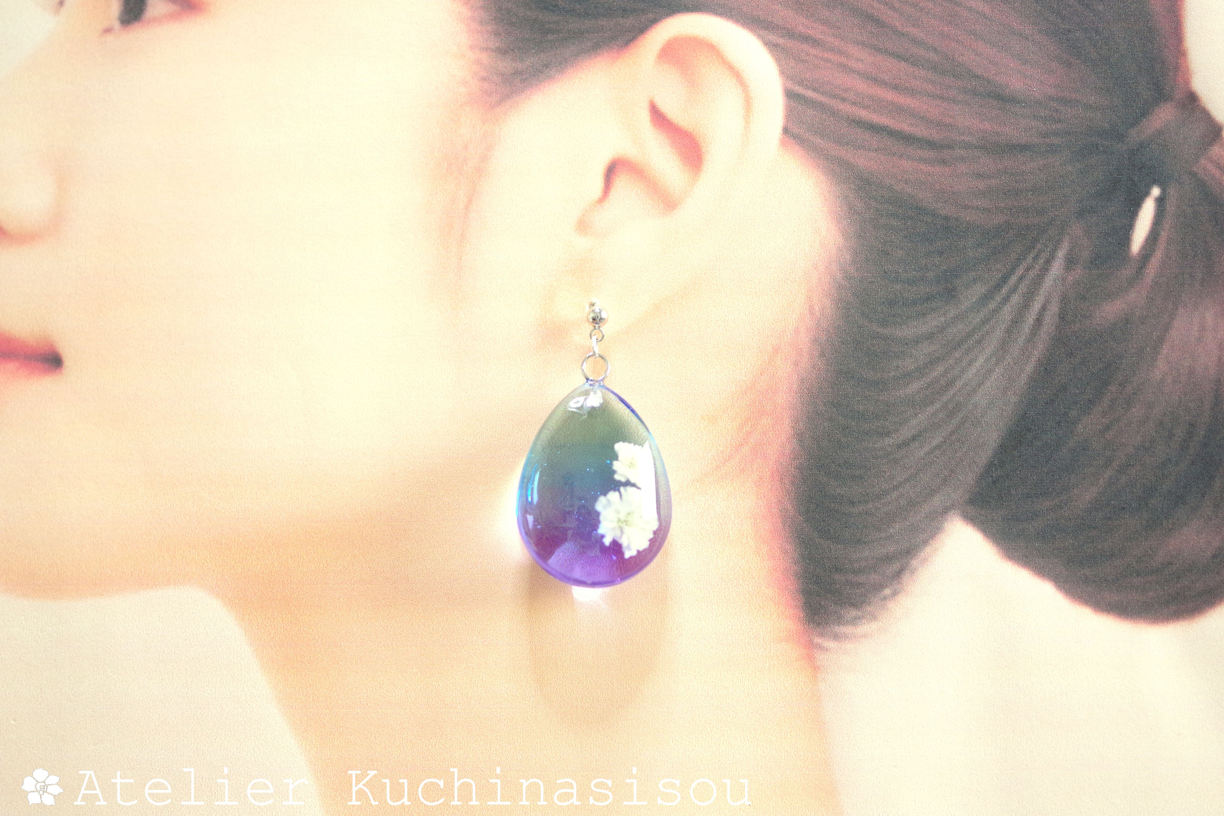 ドロップ型のレジンにお花を二輪咲かせた可憐なピアスです。
