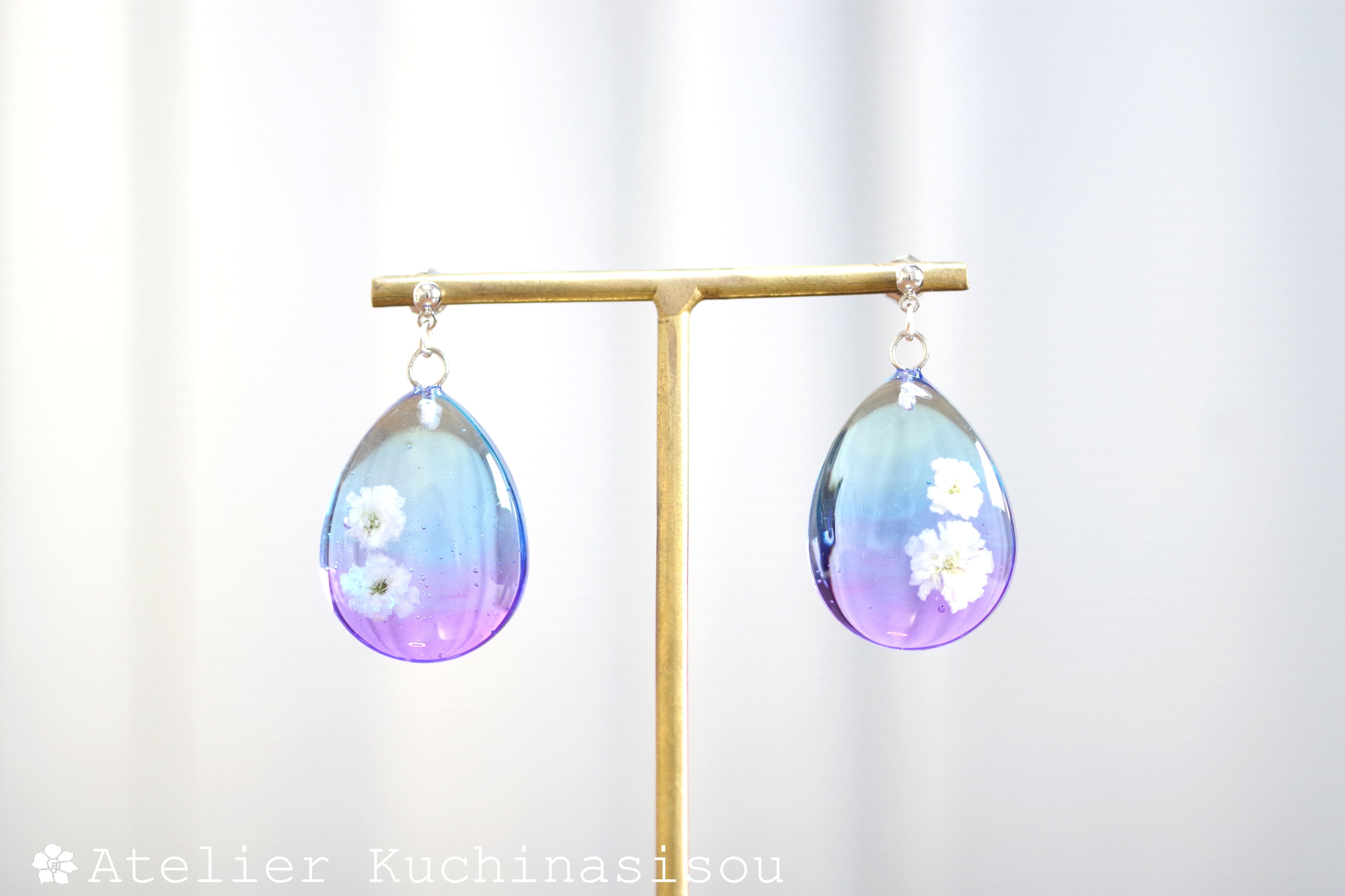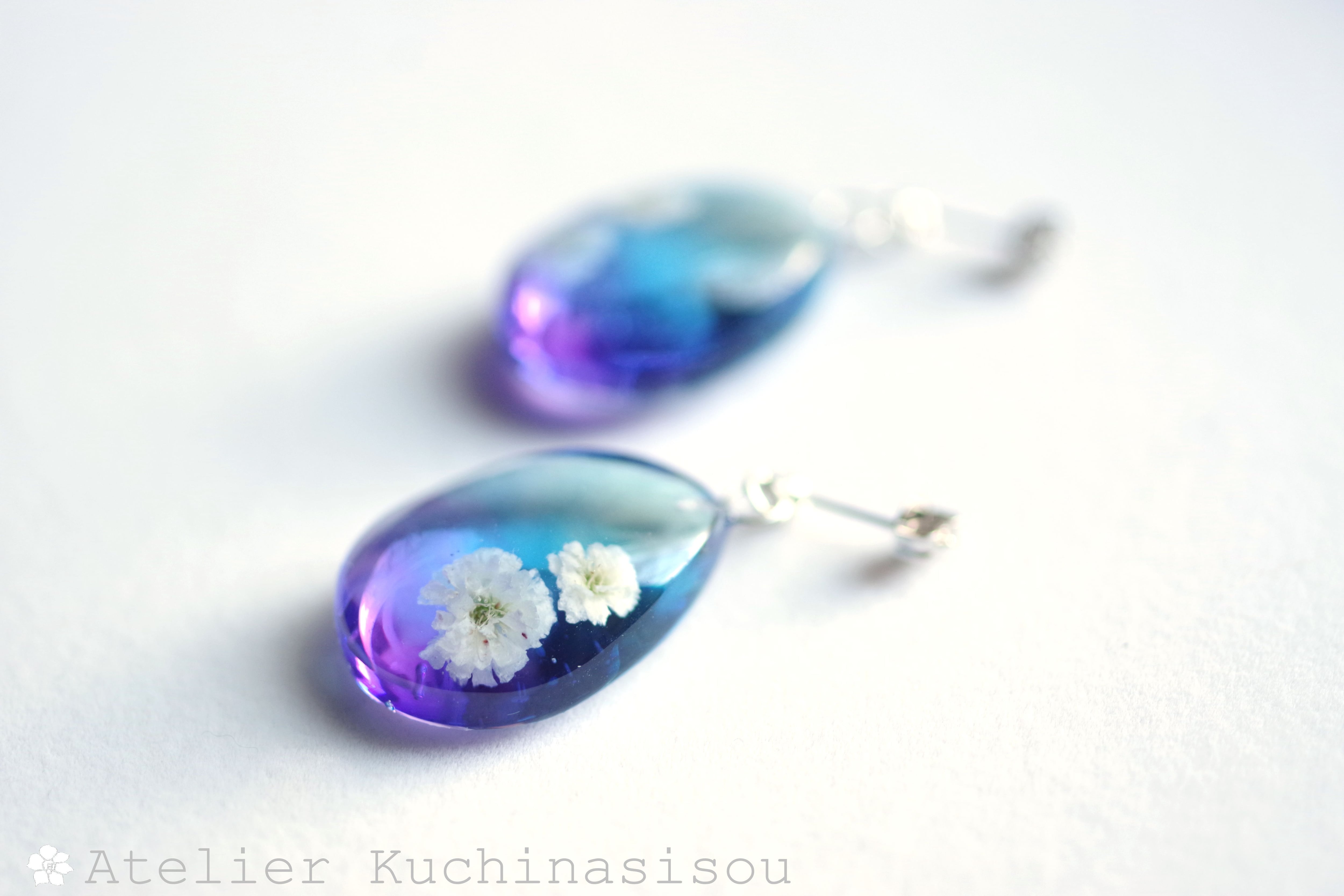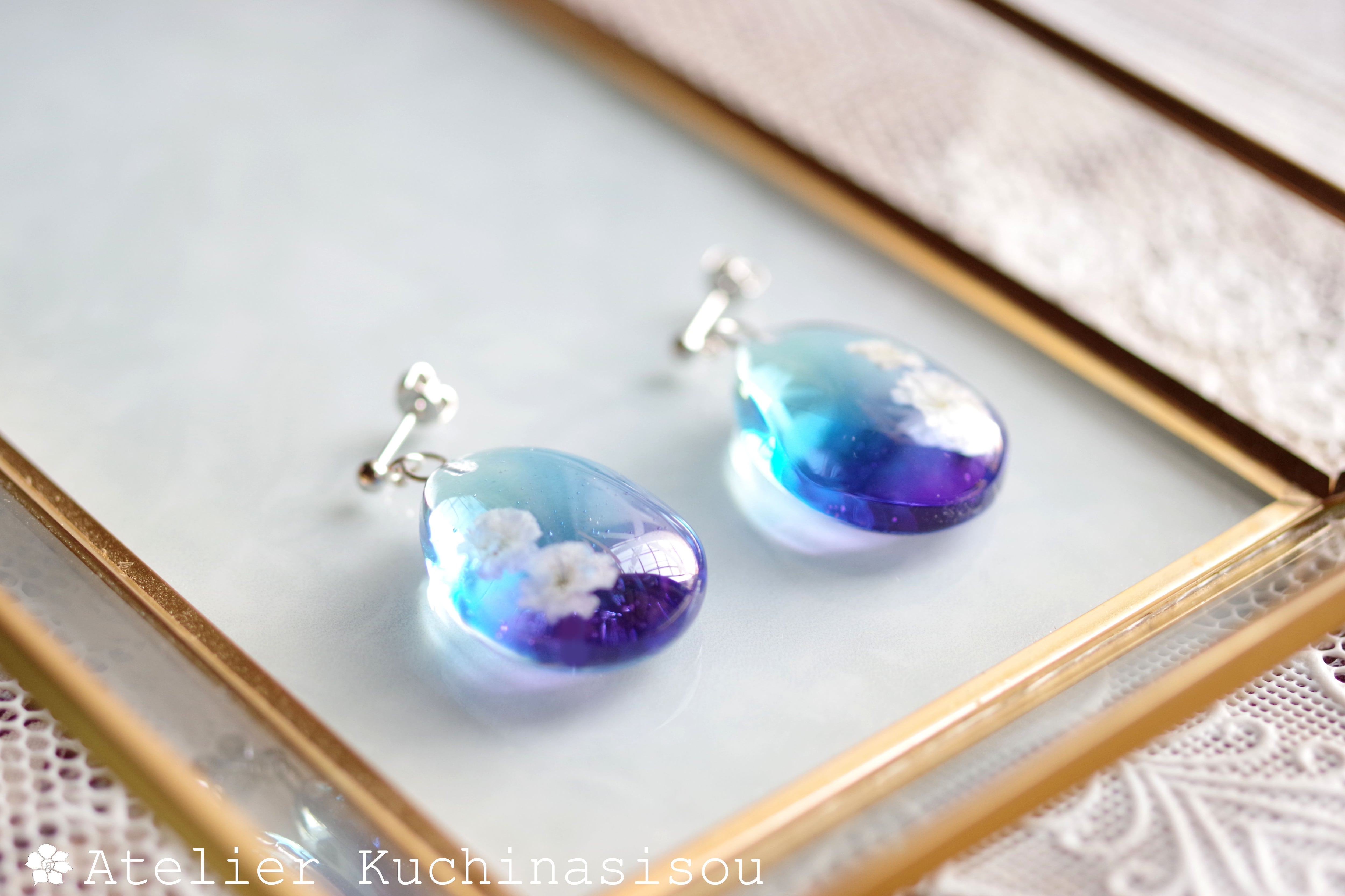 ドロップ型のレジンにお花を二輪咲かせた可憐なピアスです。