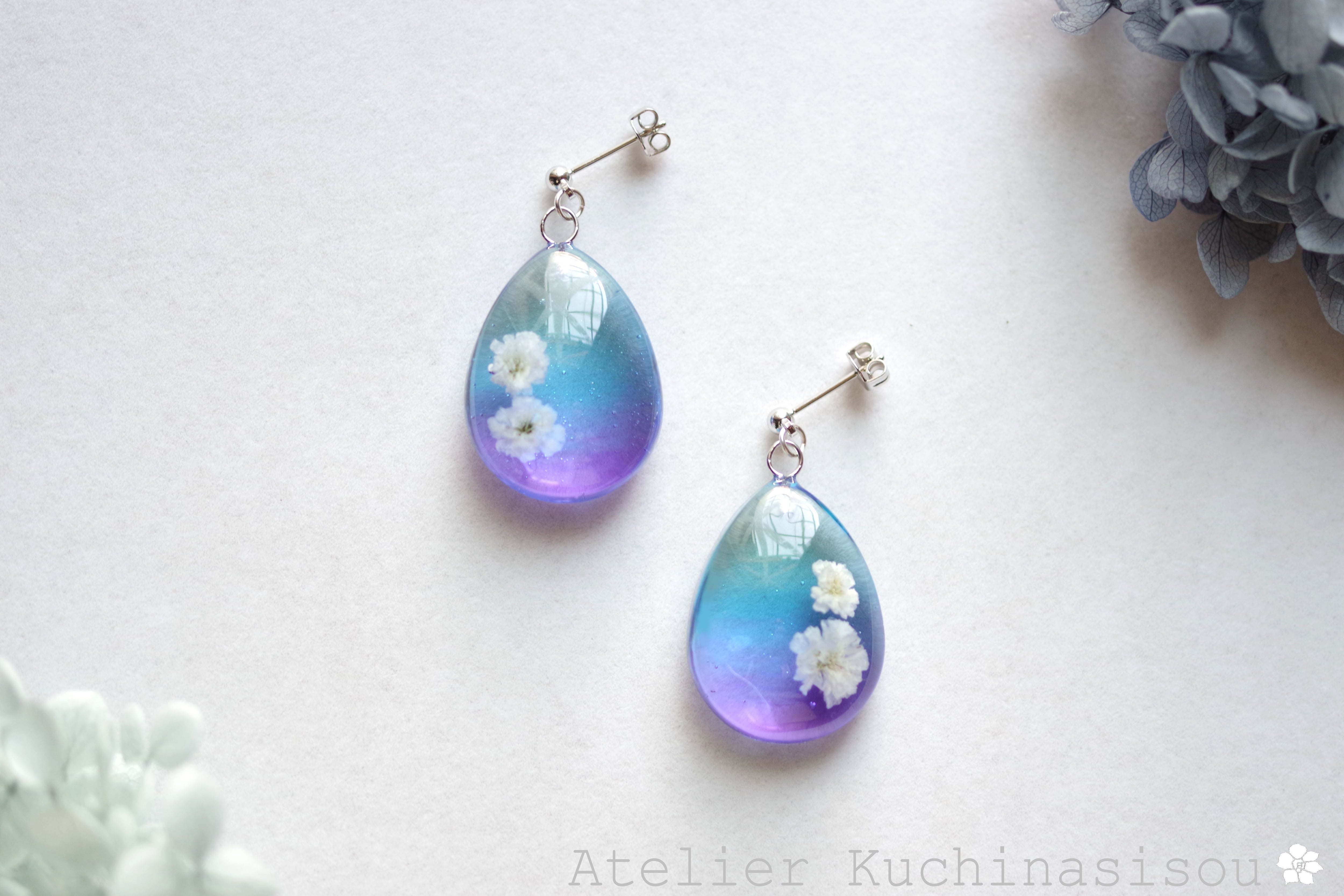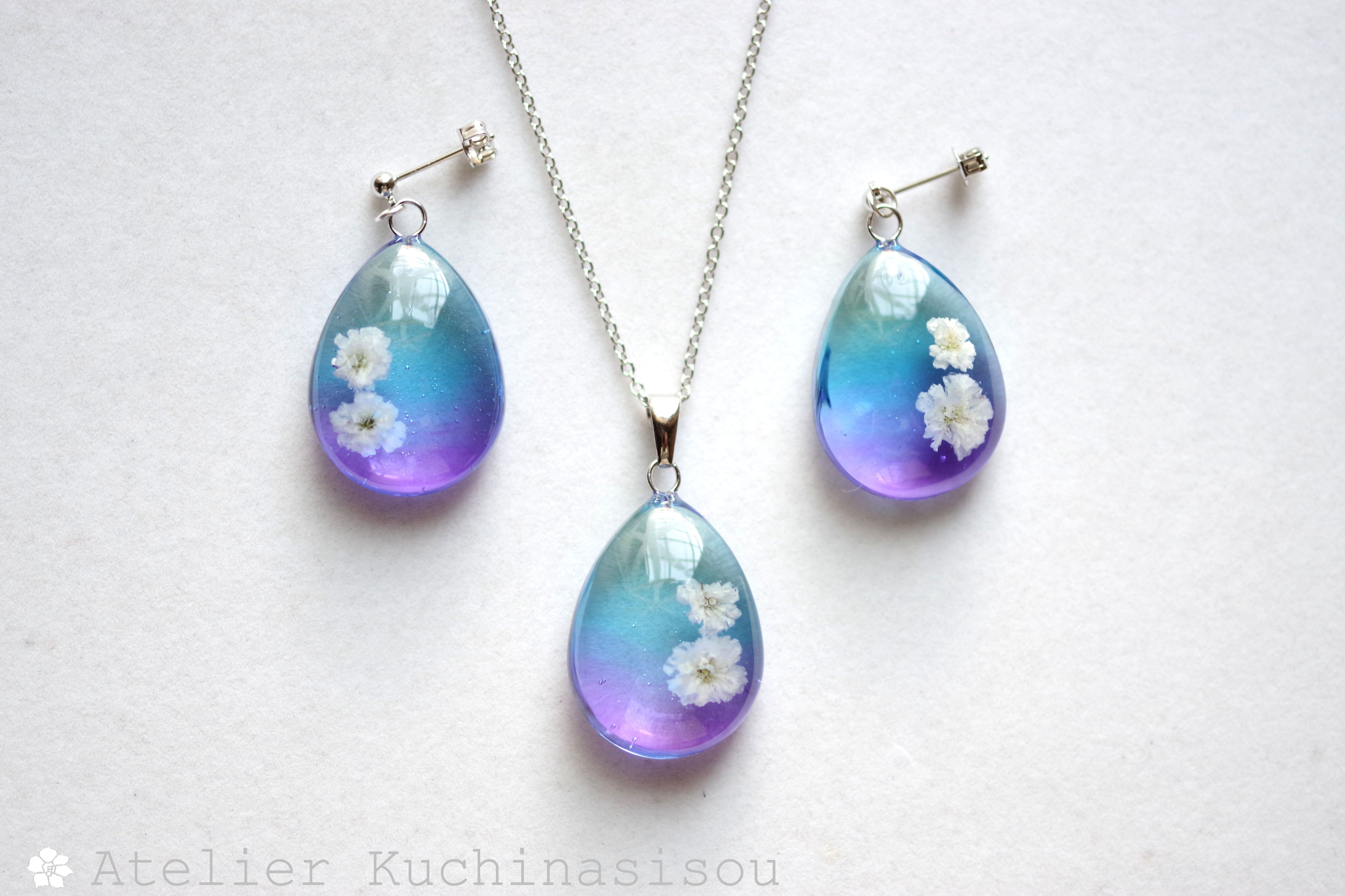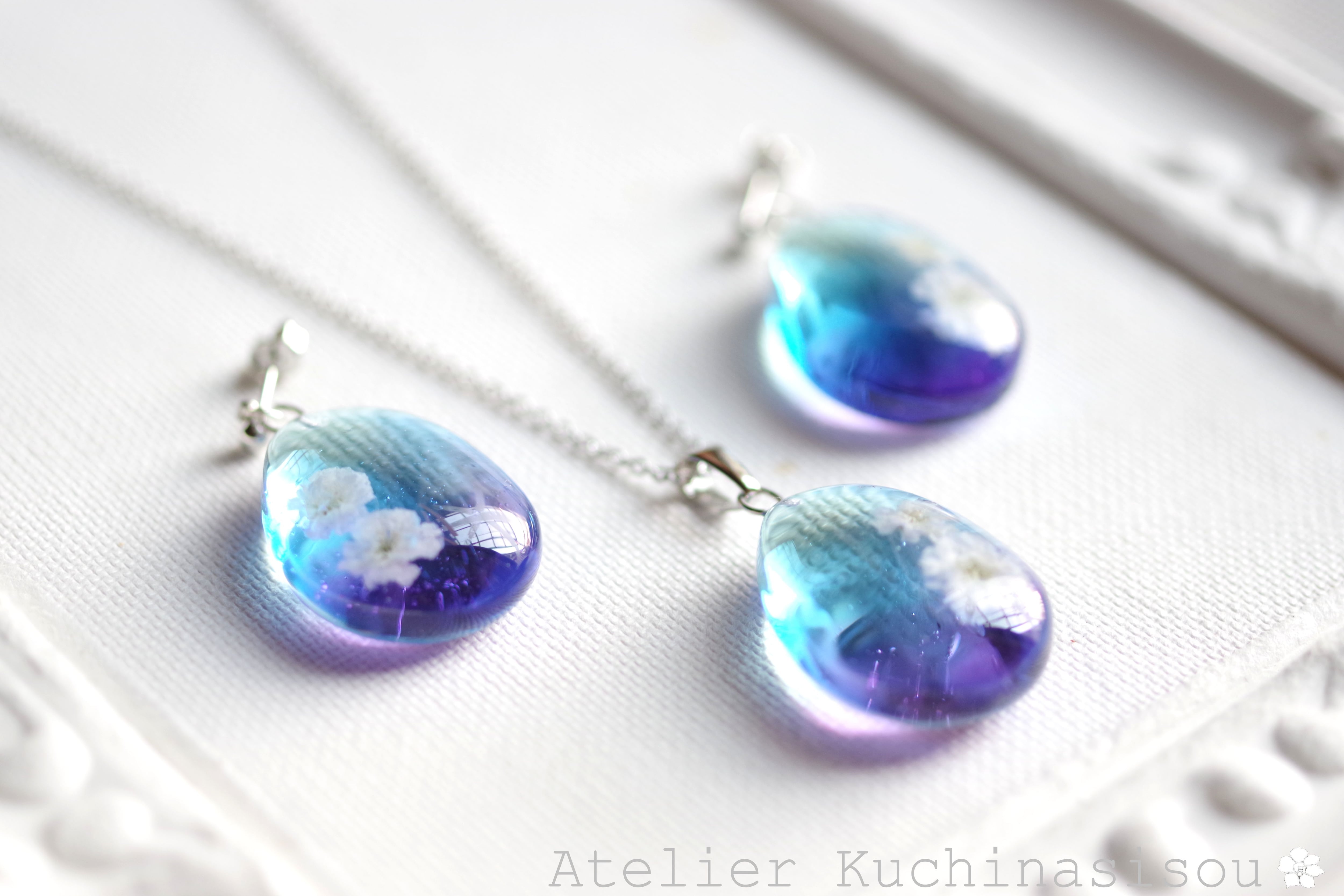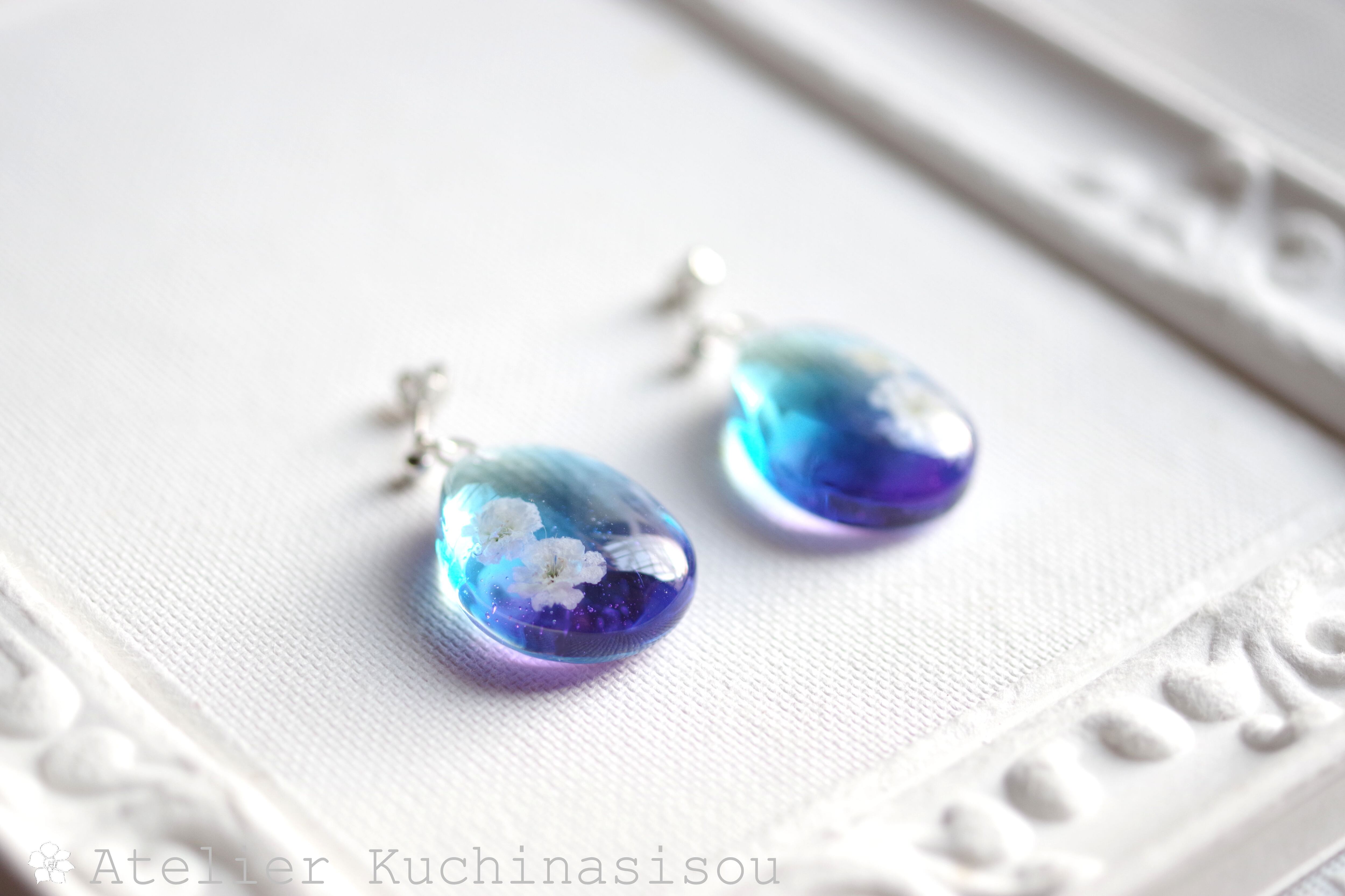 ドロップ型のレジンにお花を二輪咲かせた可憐なピアスです。