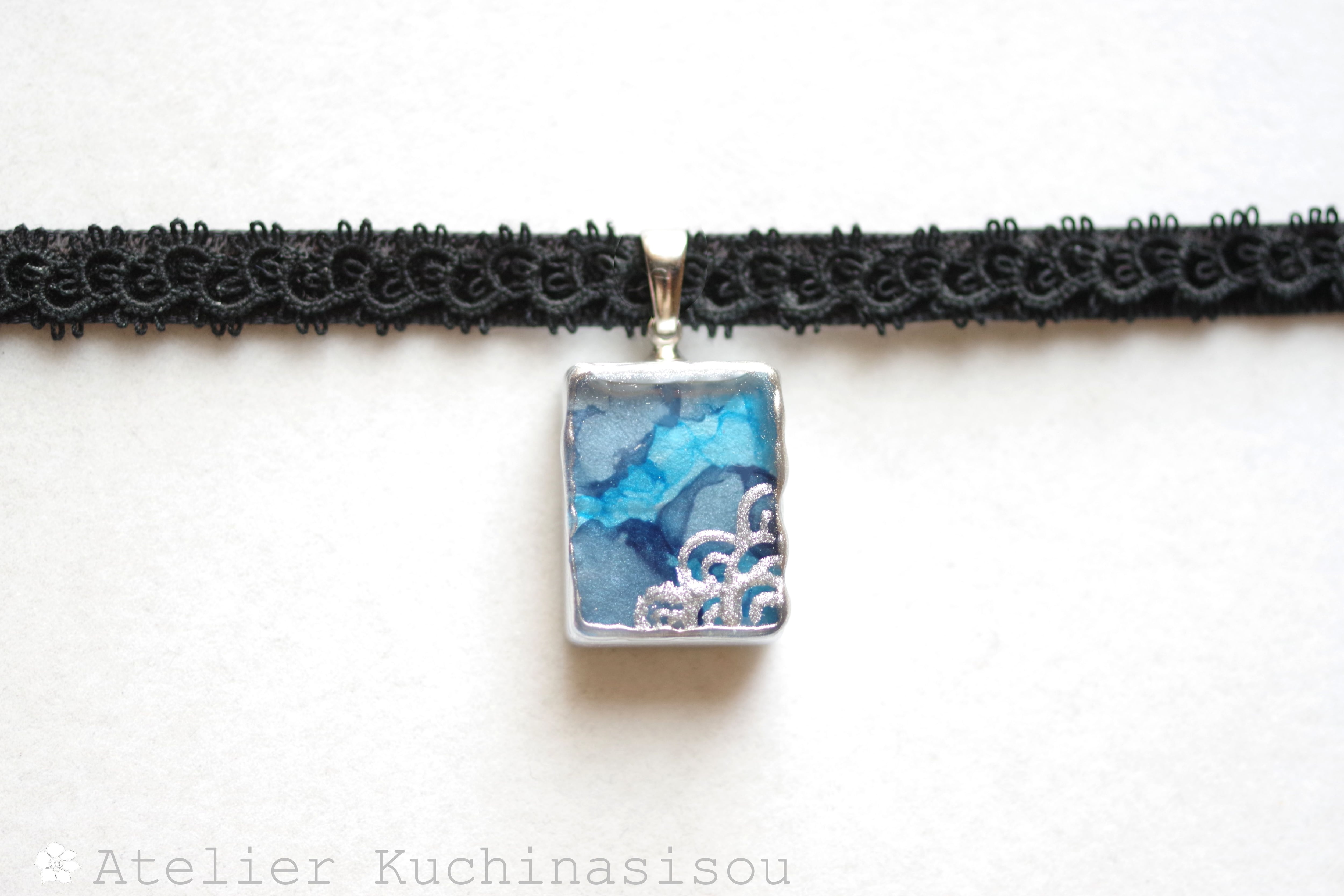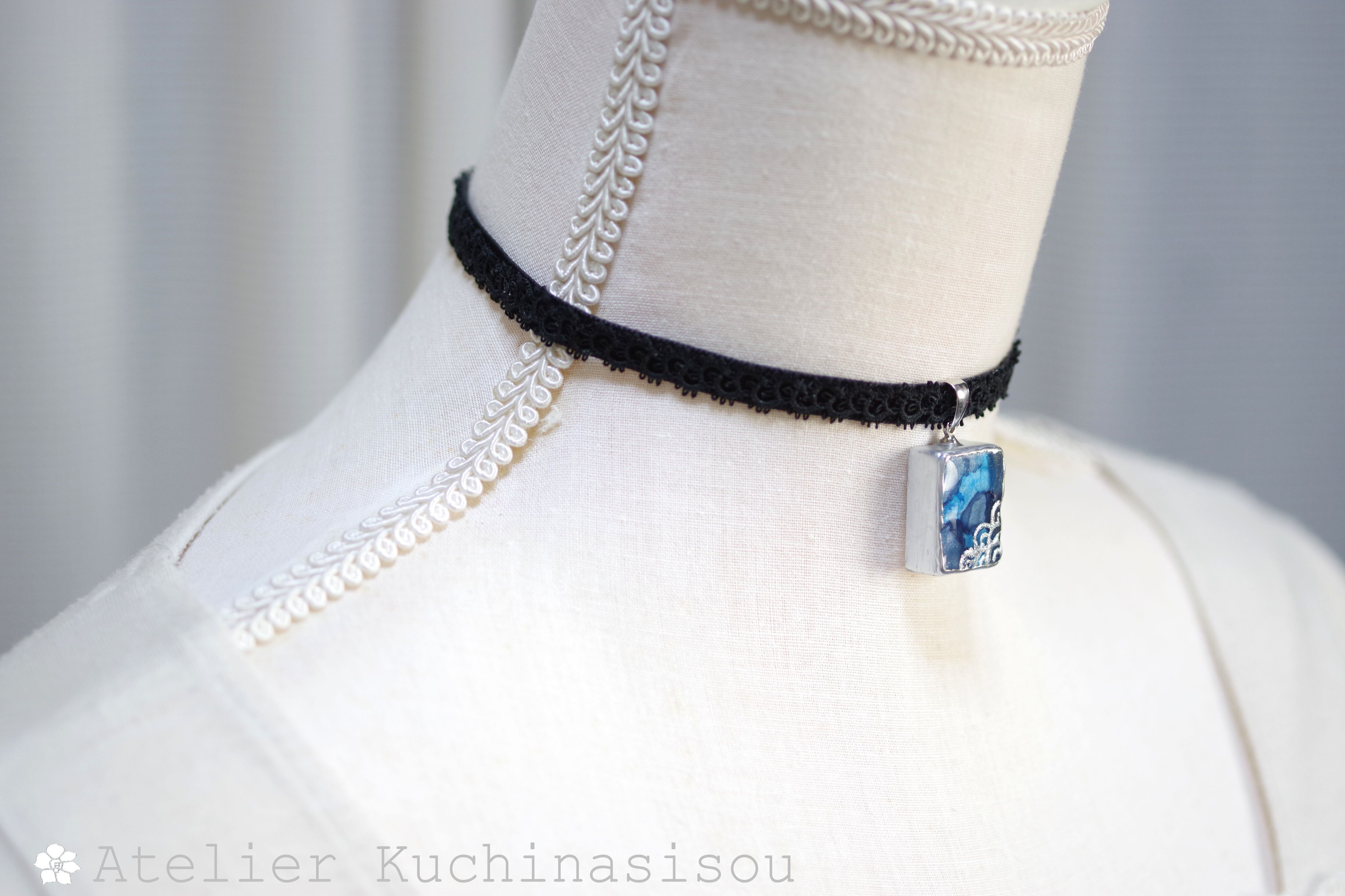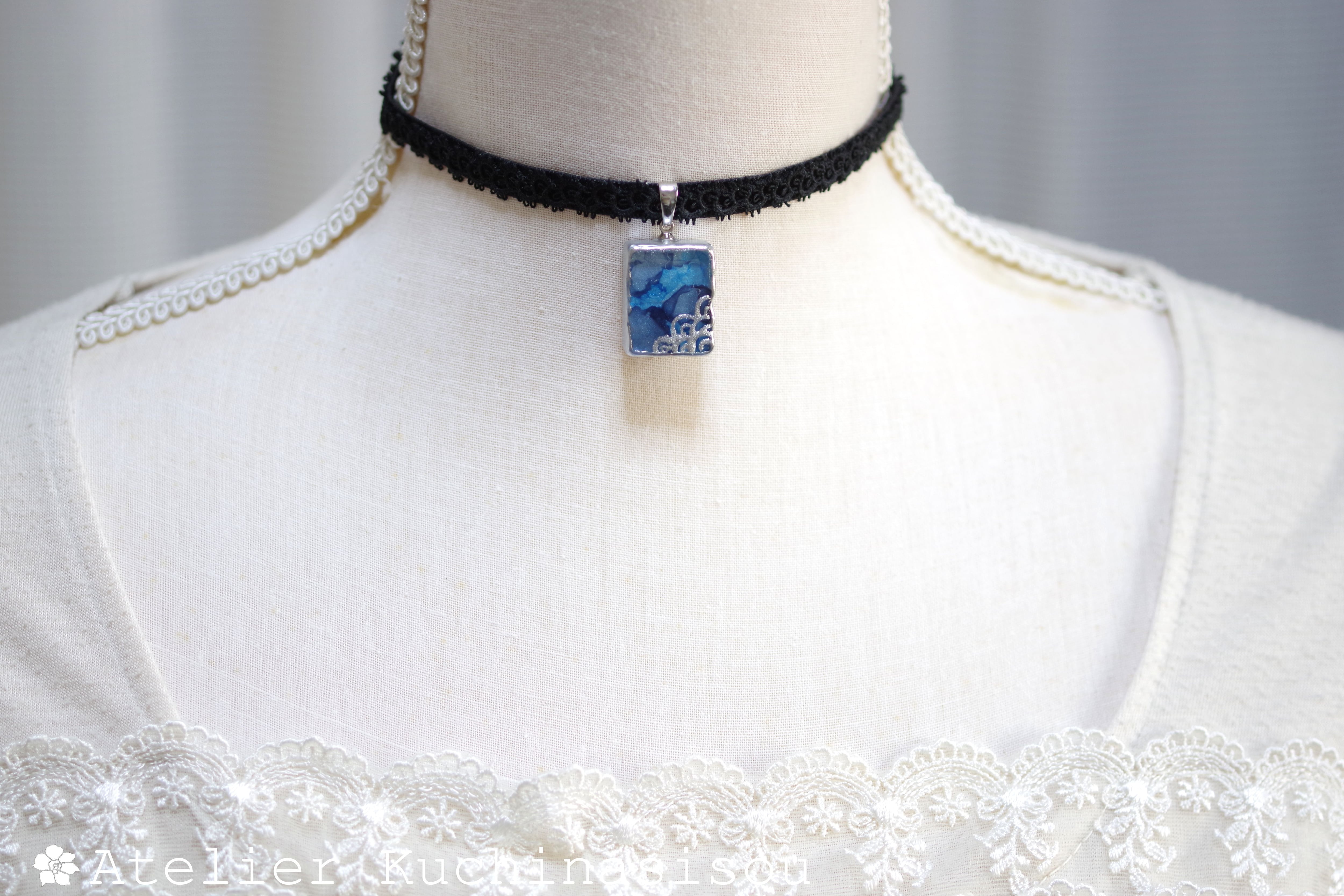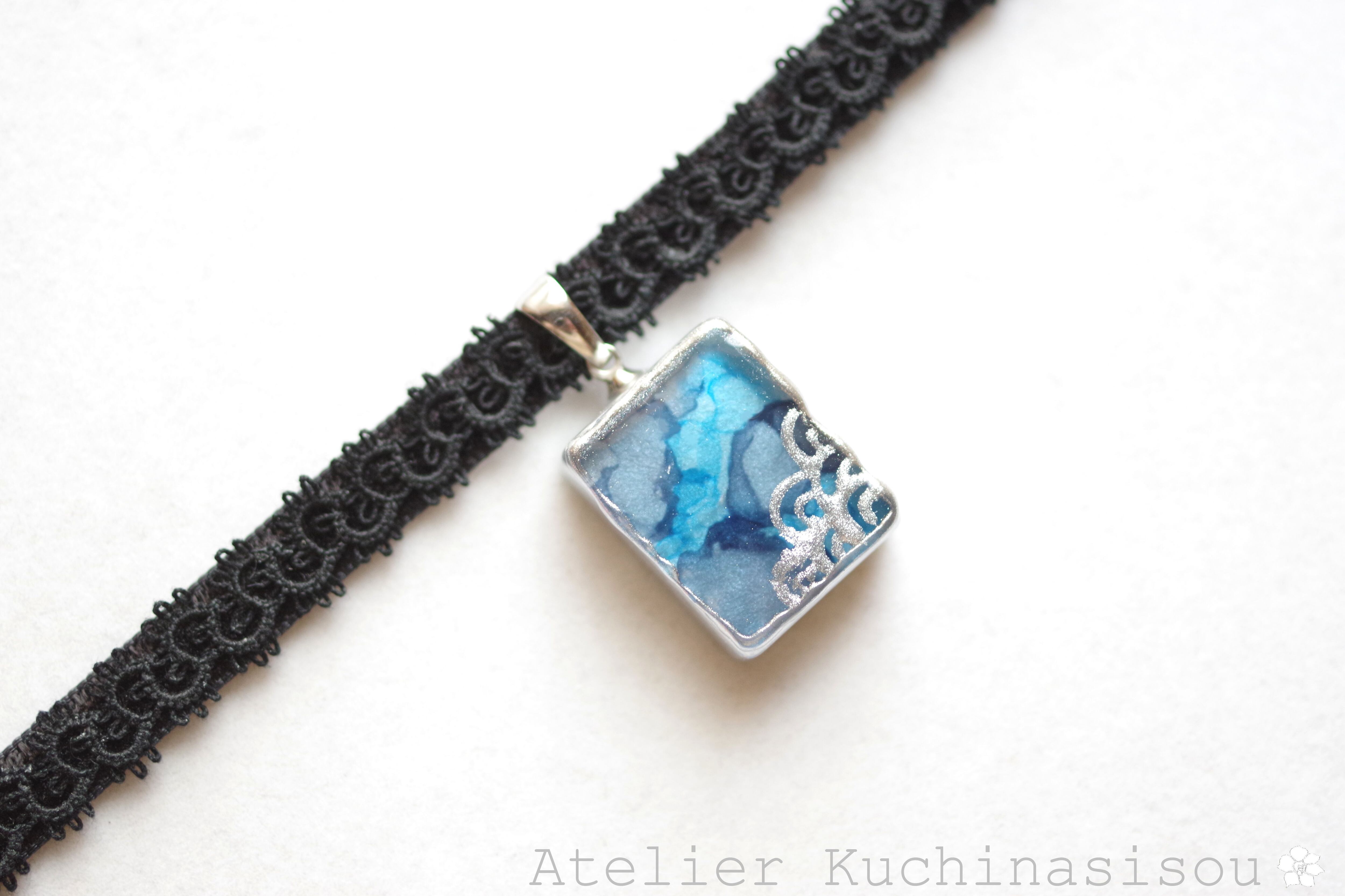 二種類のブルーが滲みあうレジンを銀色で縁取り、青海波模様を描き、ベルベットリボンにタティングレースで装飾を施したチョーカーに仕上げました。