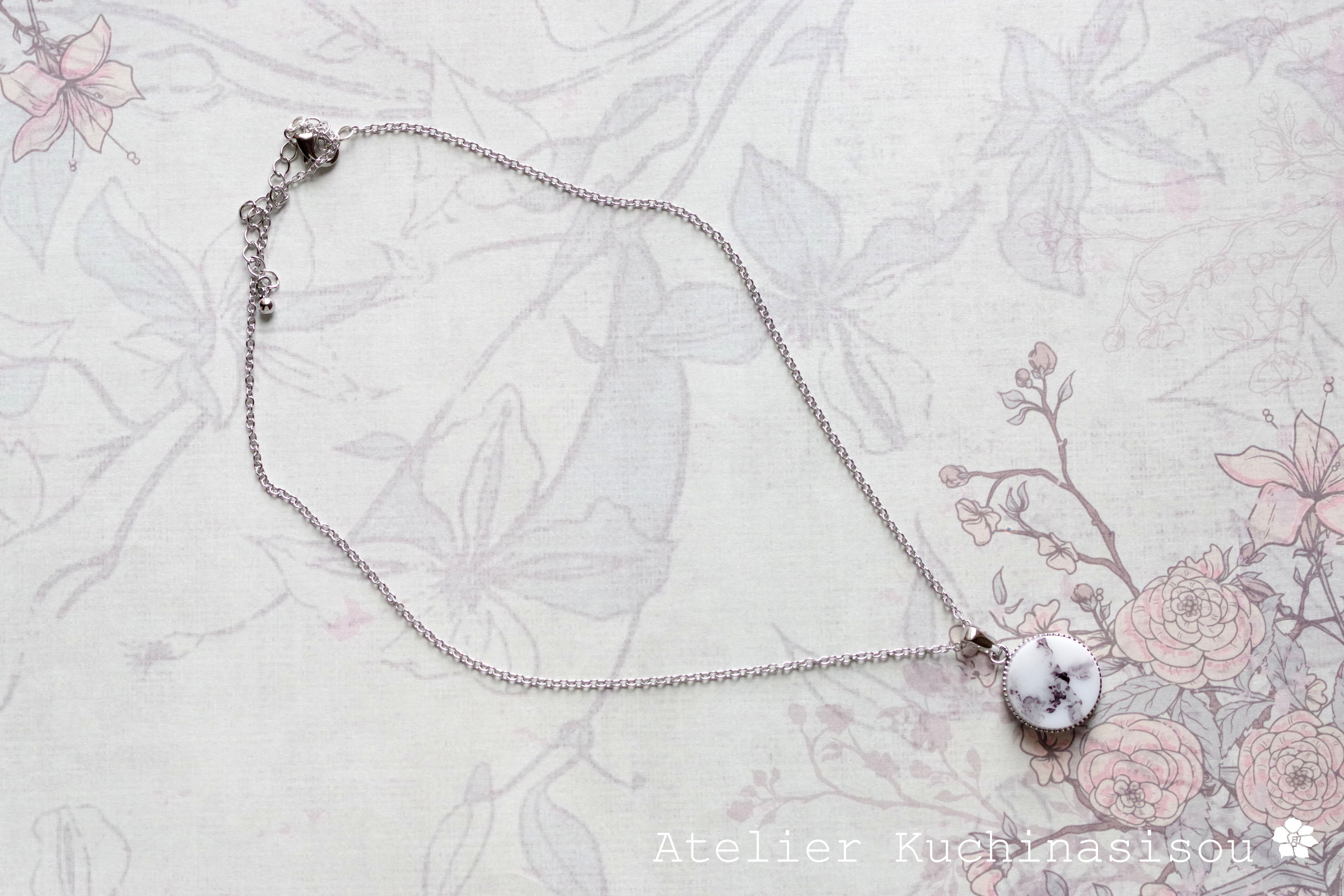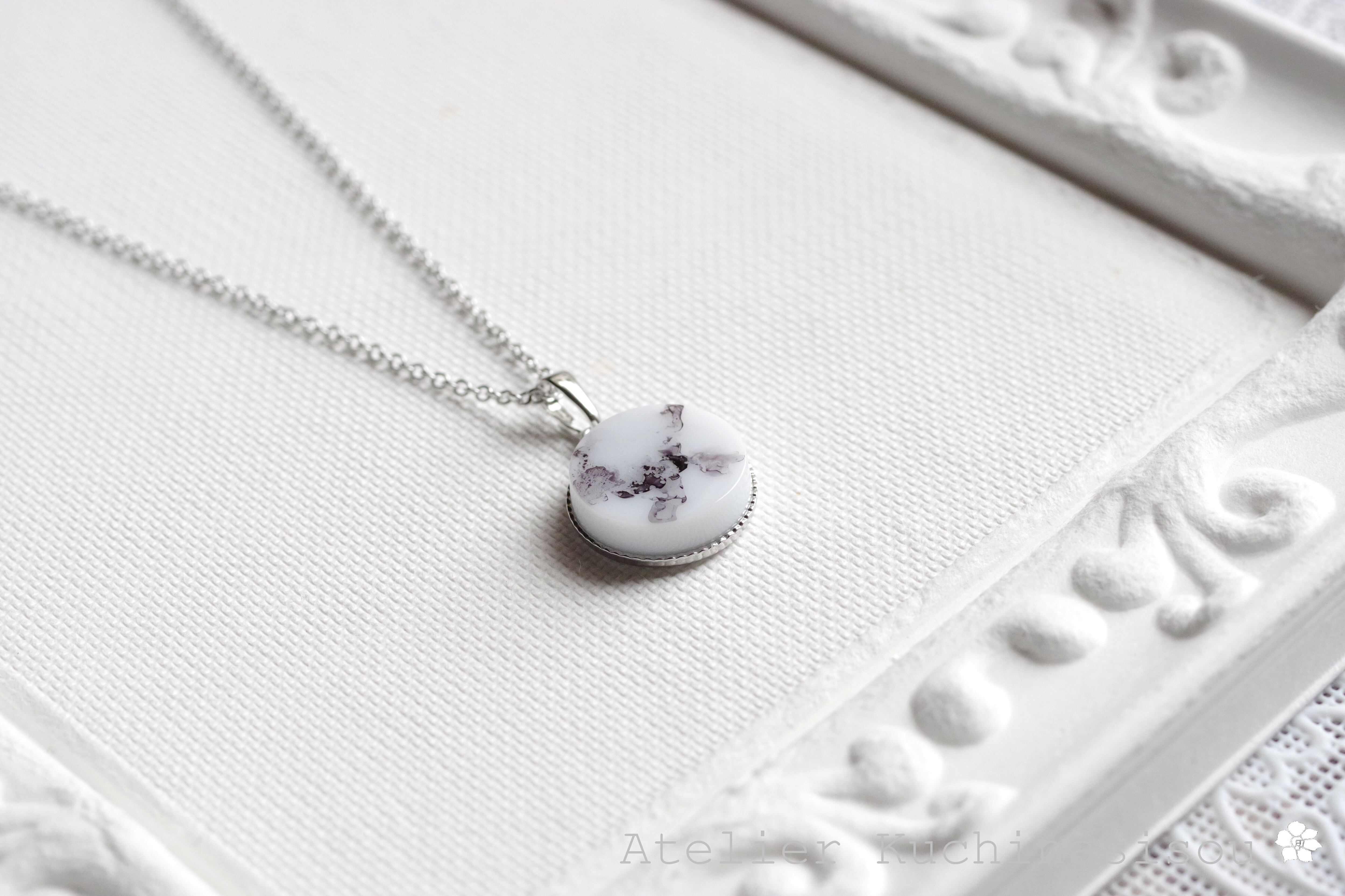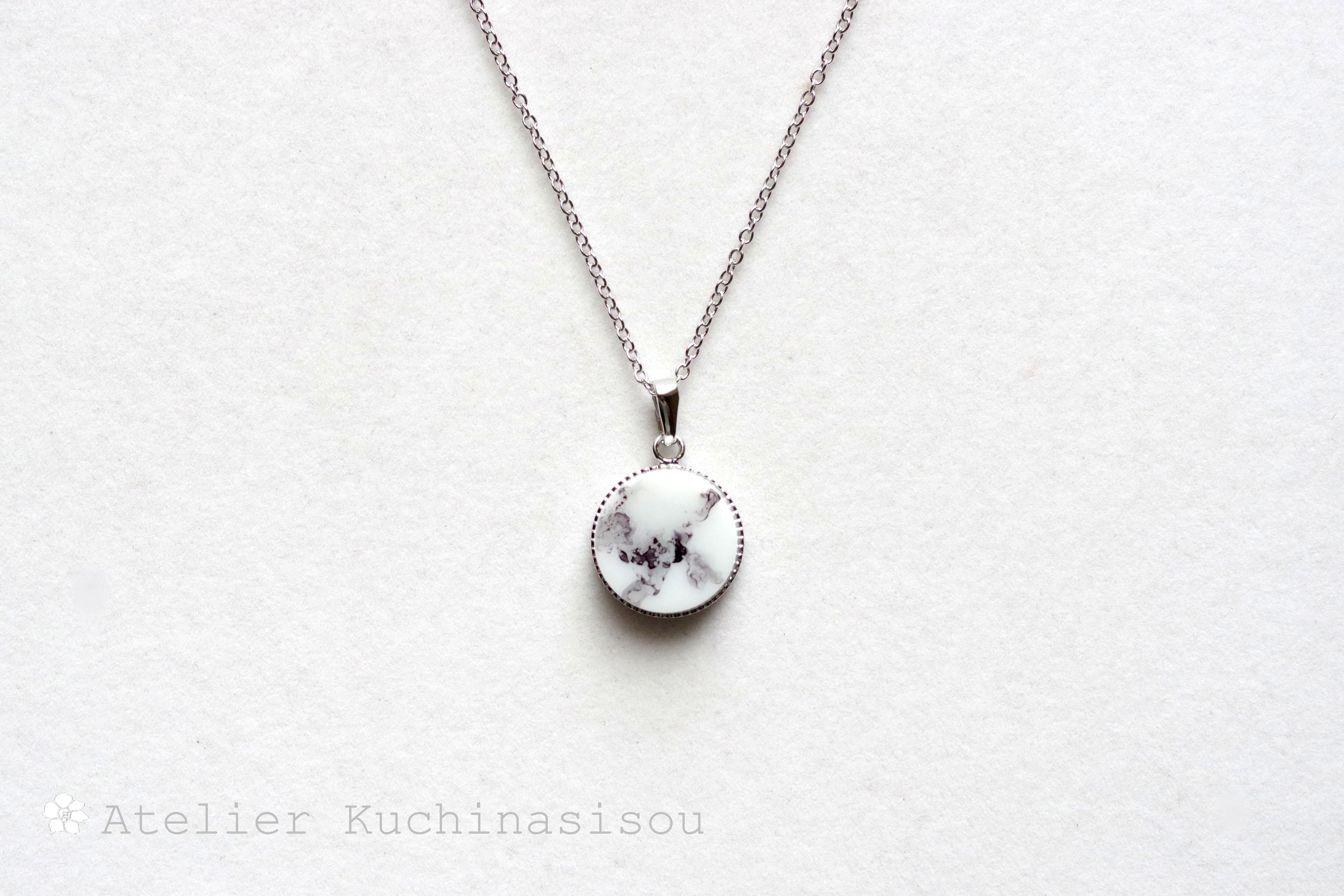 白いレジンに水墨画を思わせる微かな黒い模様を描いたシンプルなペンダント。