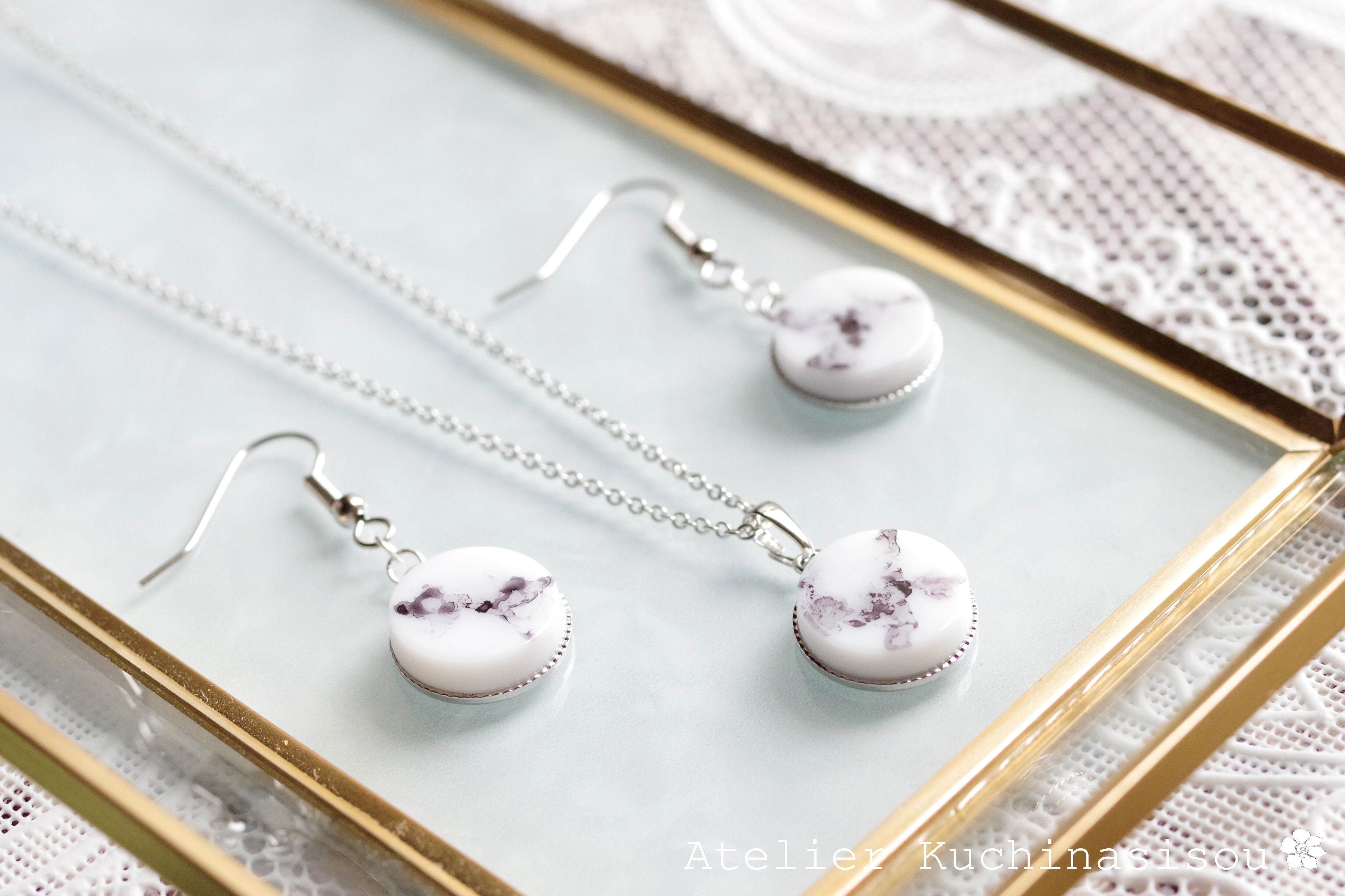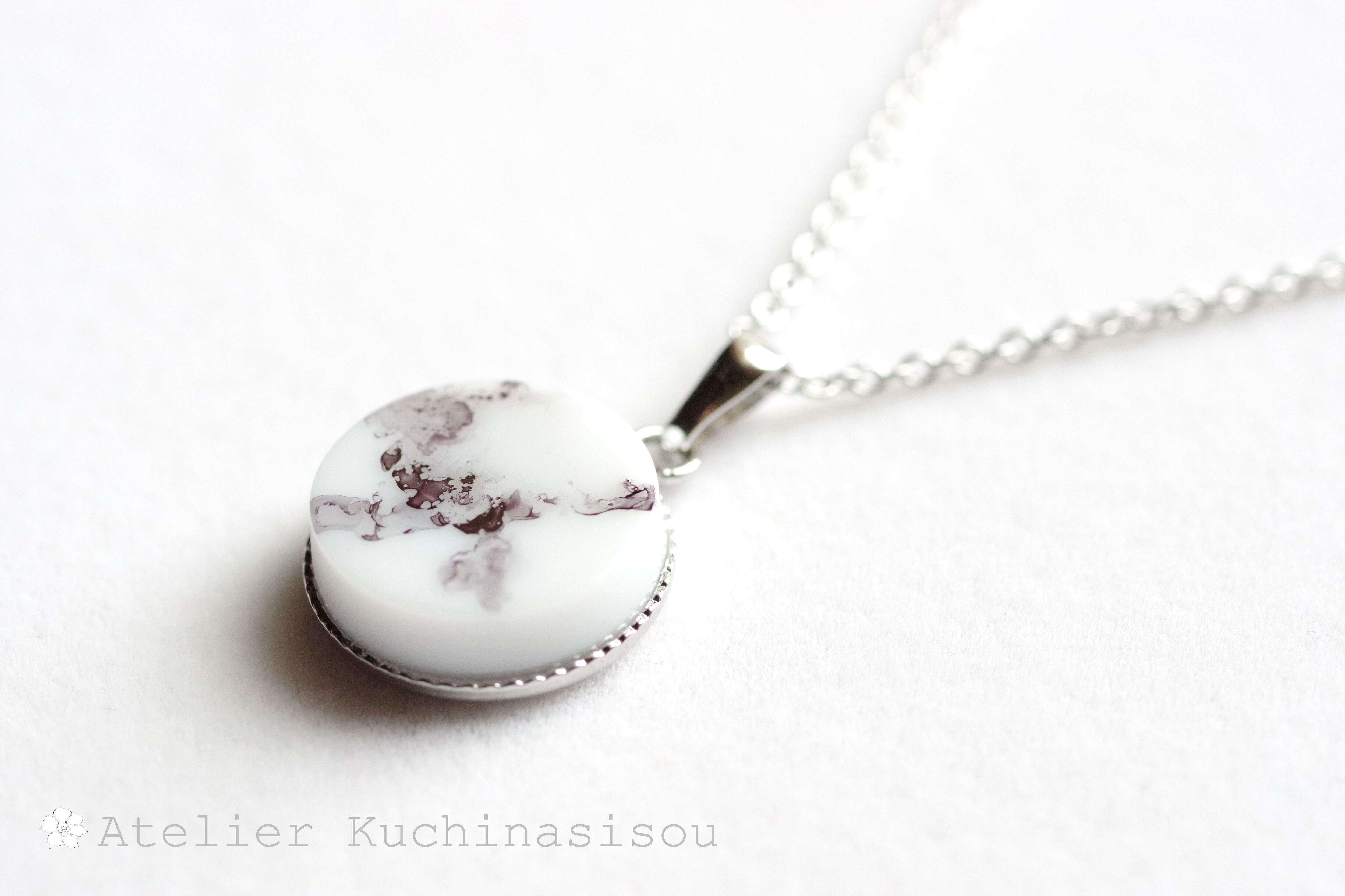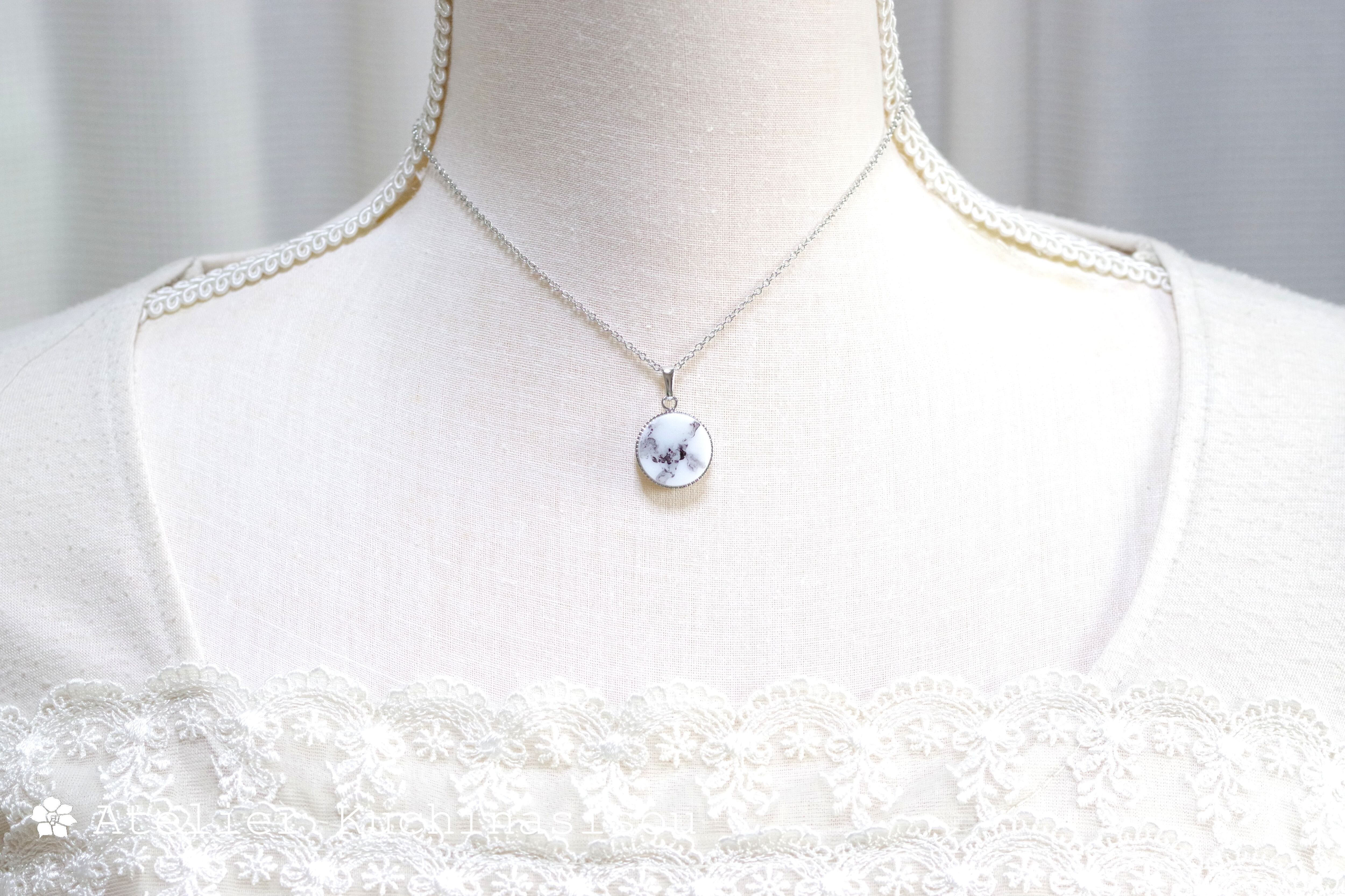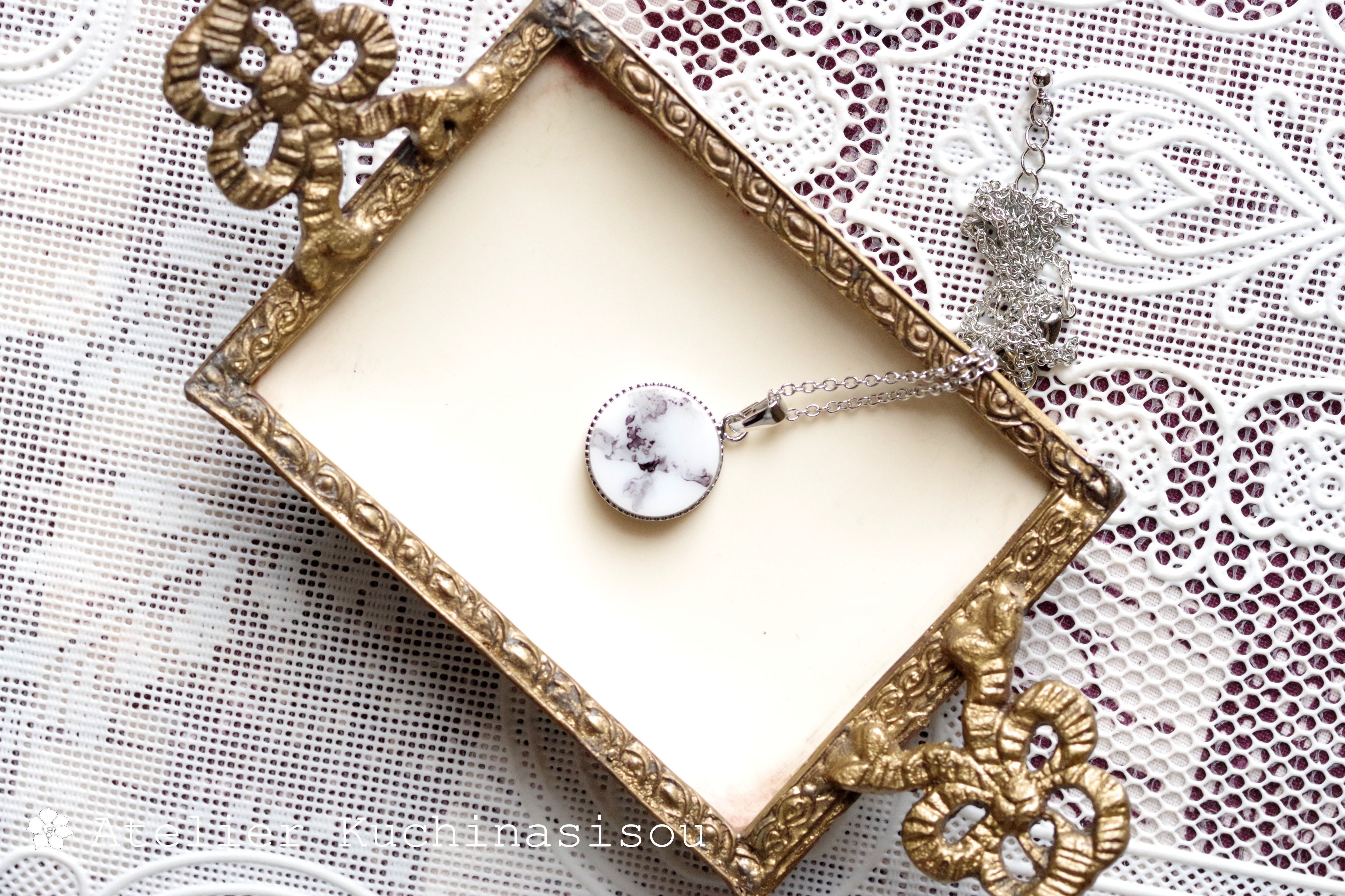 白いレジンに水墨画を思わせる微かな黒い模様を描いたシンプルなペンダント。