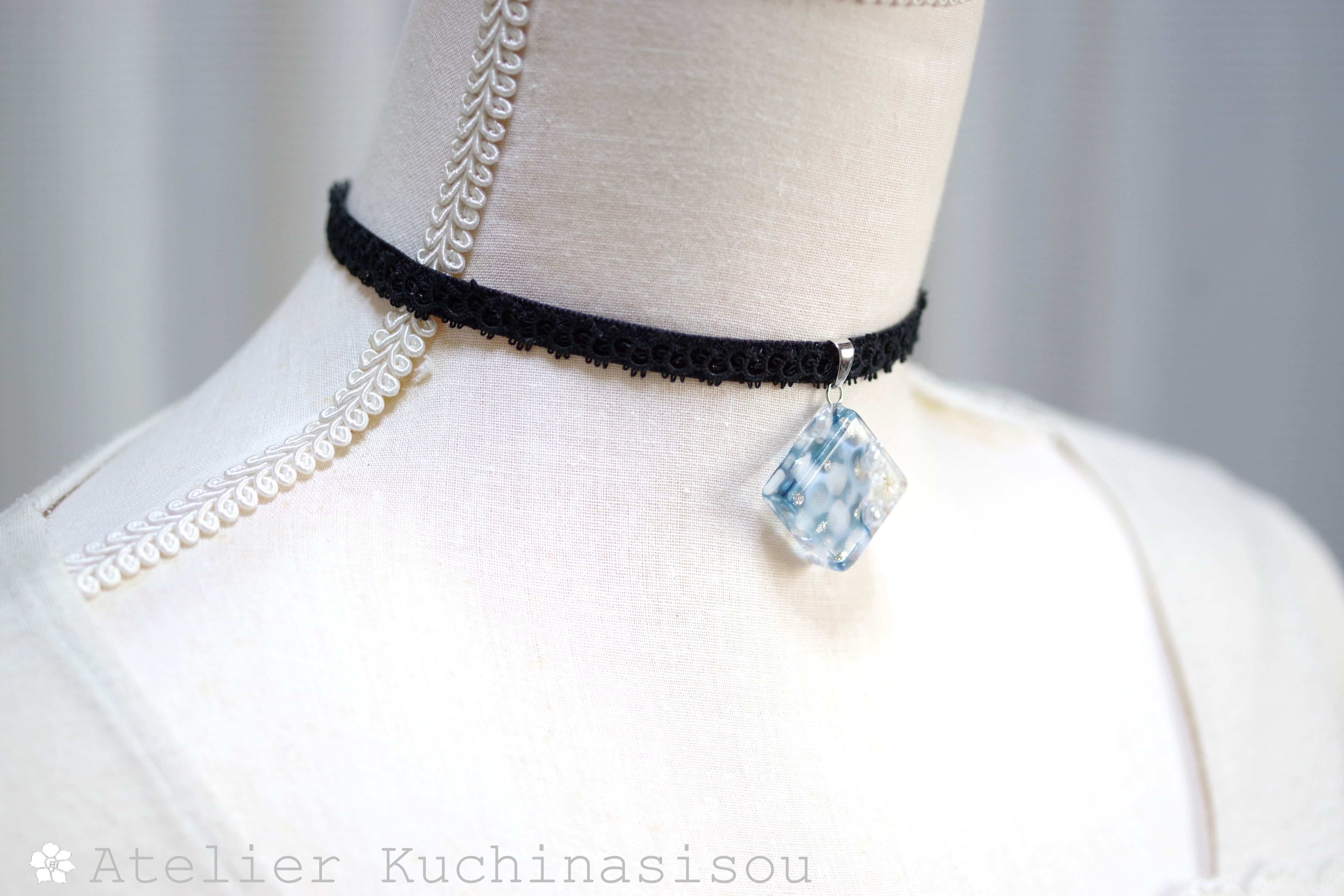 ホワイトとコバルトブルーが描く波紋がまるで水面のような、その透明感の美しさに魅入ってしまうレジンを、ベルベットリボンにタティングレースで装飾を施したチョーカーに仕上げました。