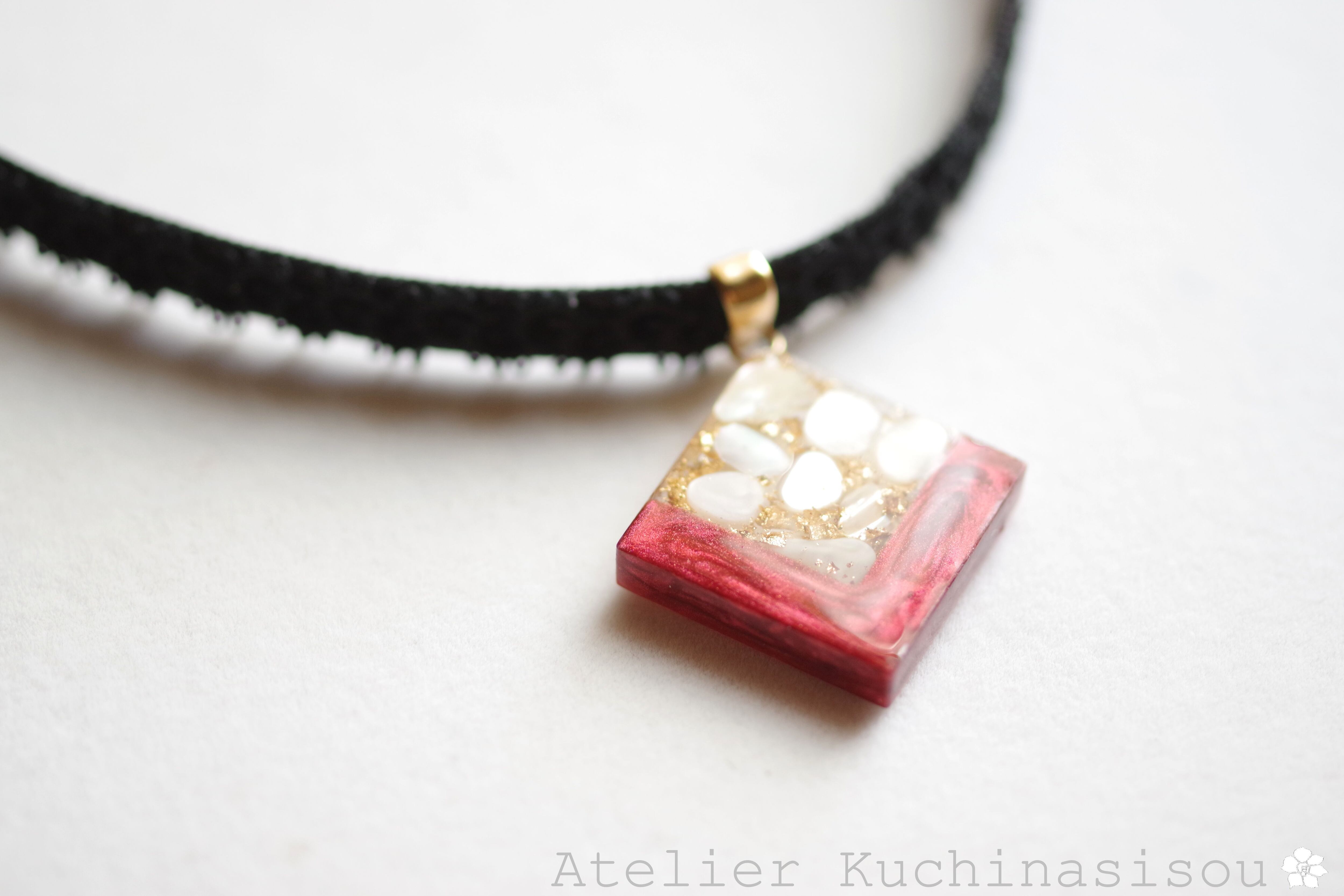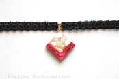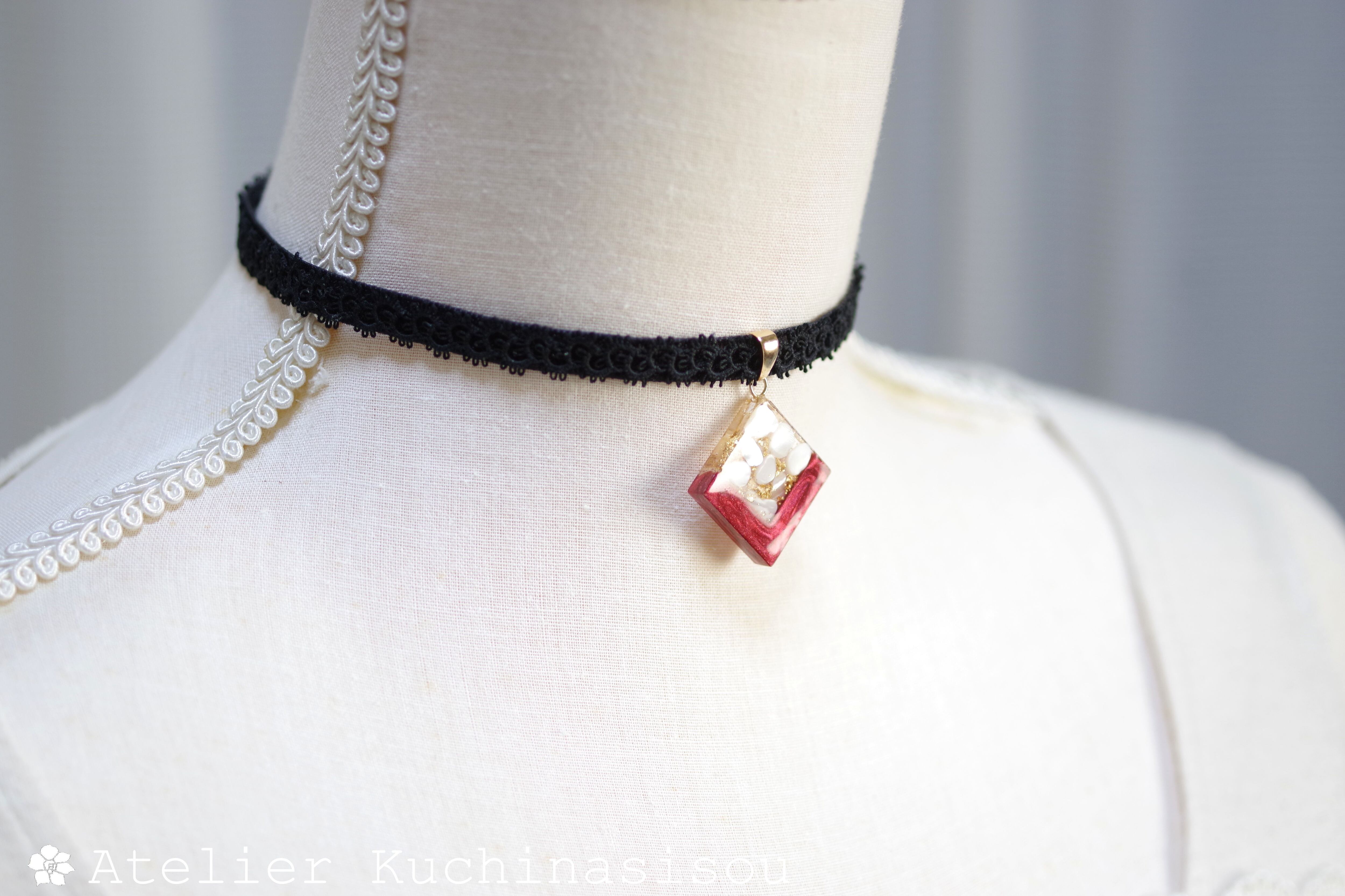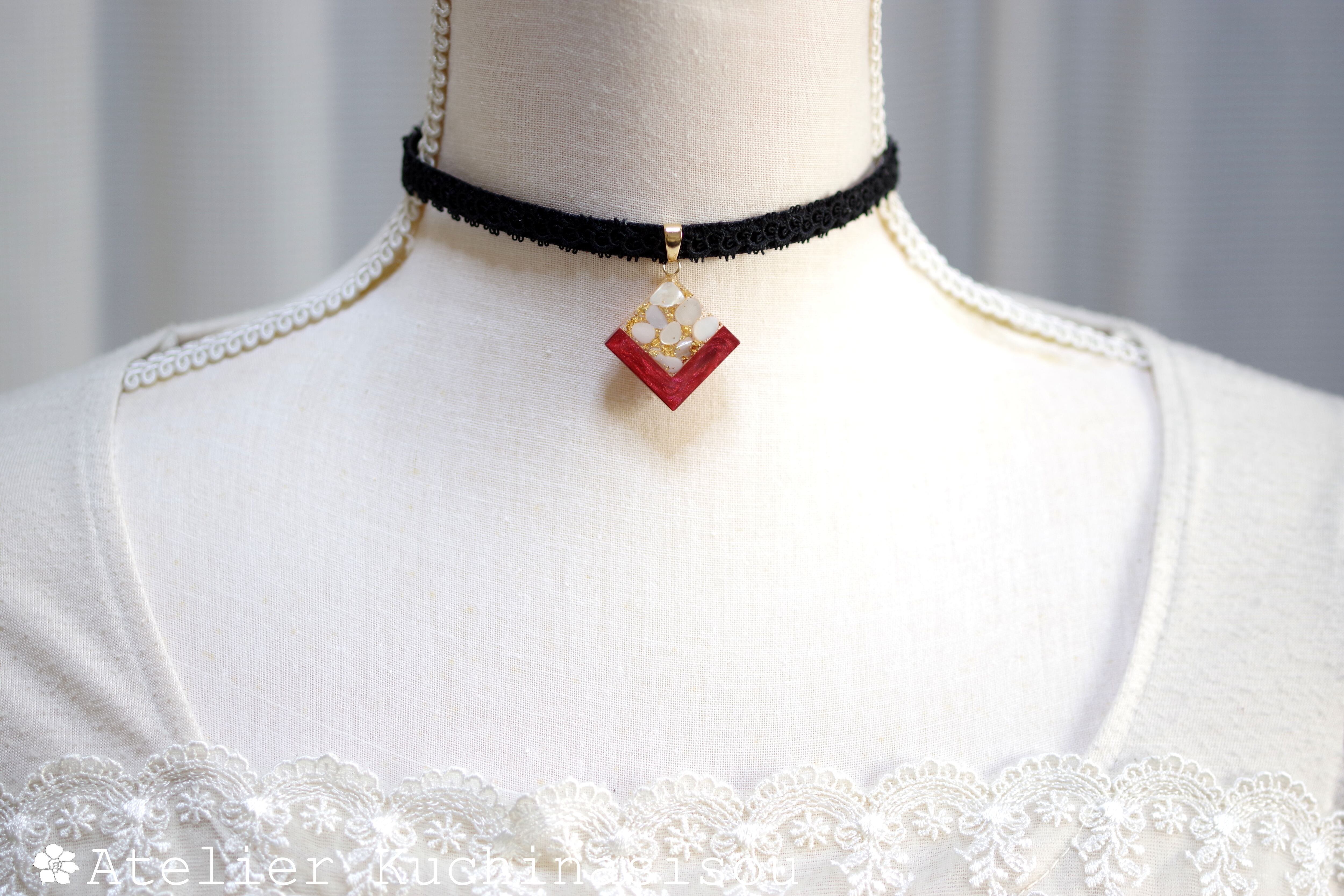 ホワイトシェルのさざれを沈め、光沢のあるルビーレッドで囲ったレジンを、ベルベットリボンにタティングレースで装飾を施したチョーカーに仕上げました。