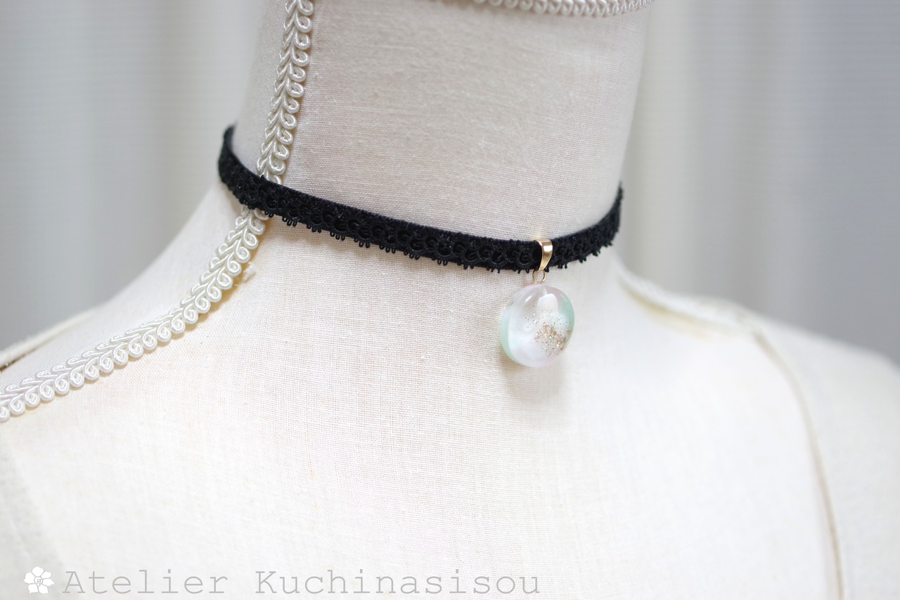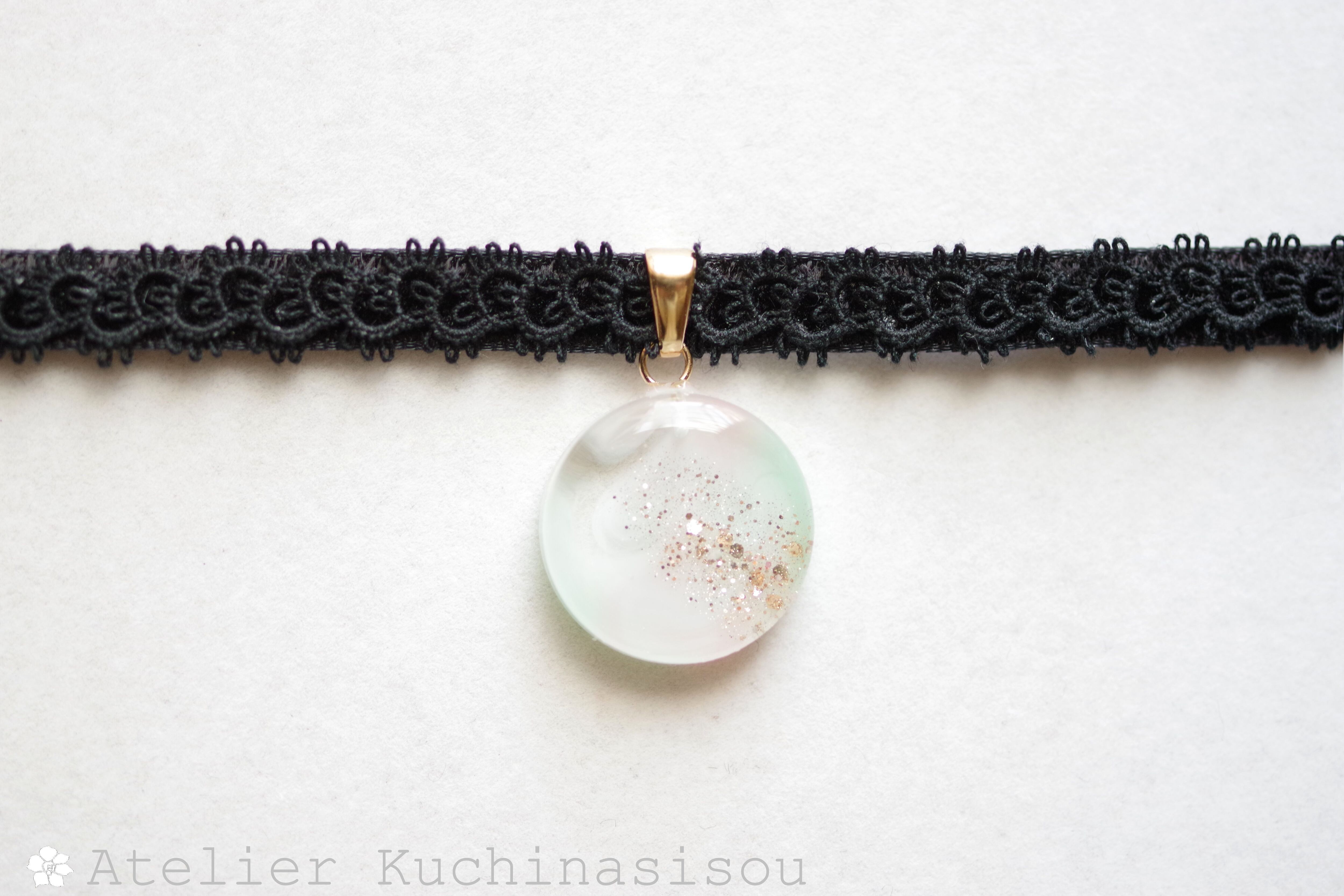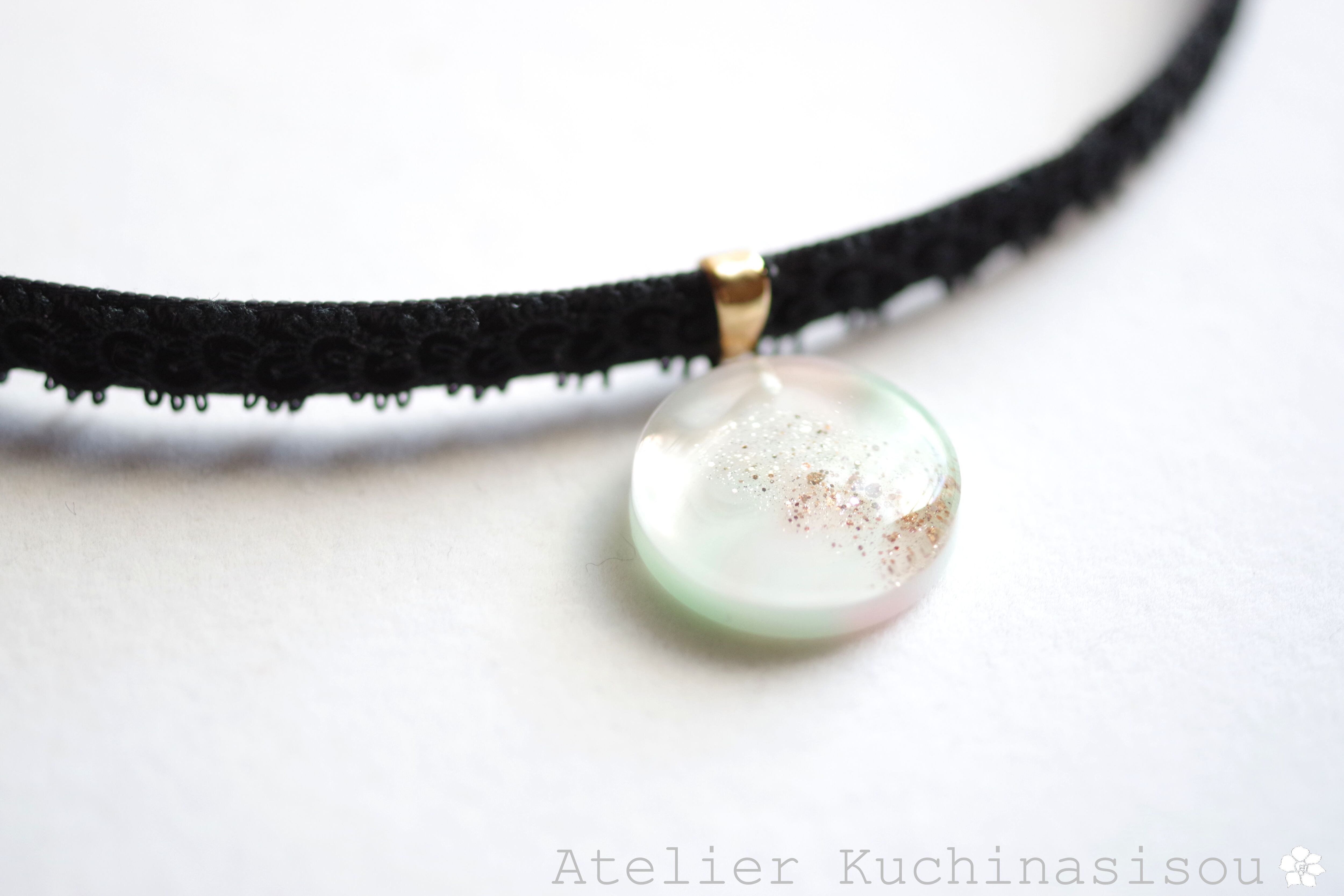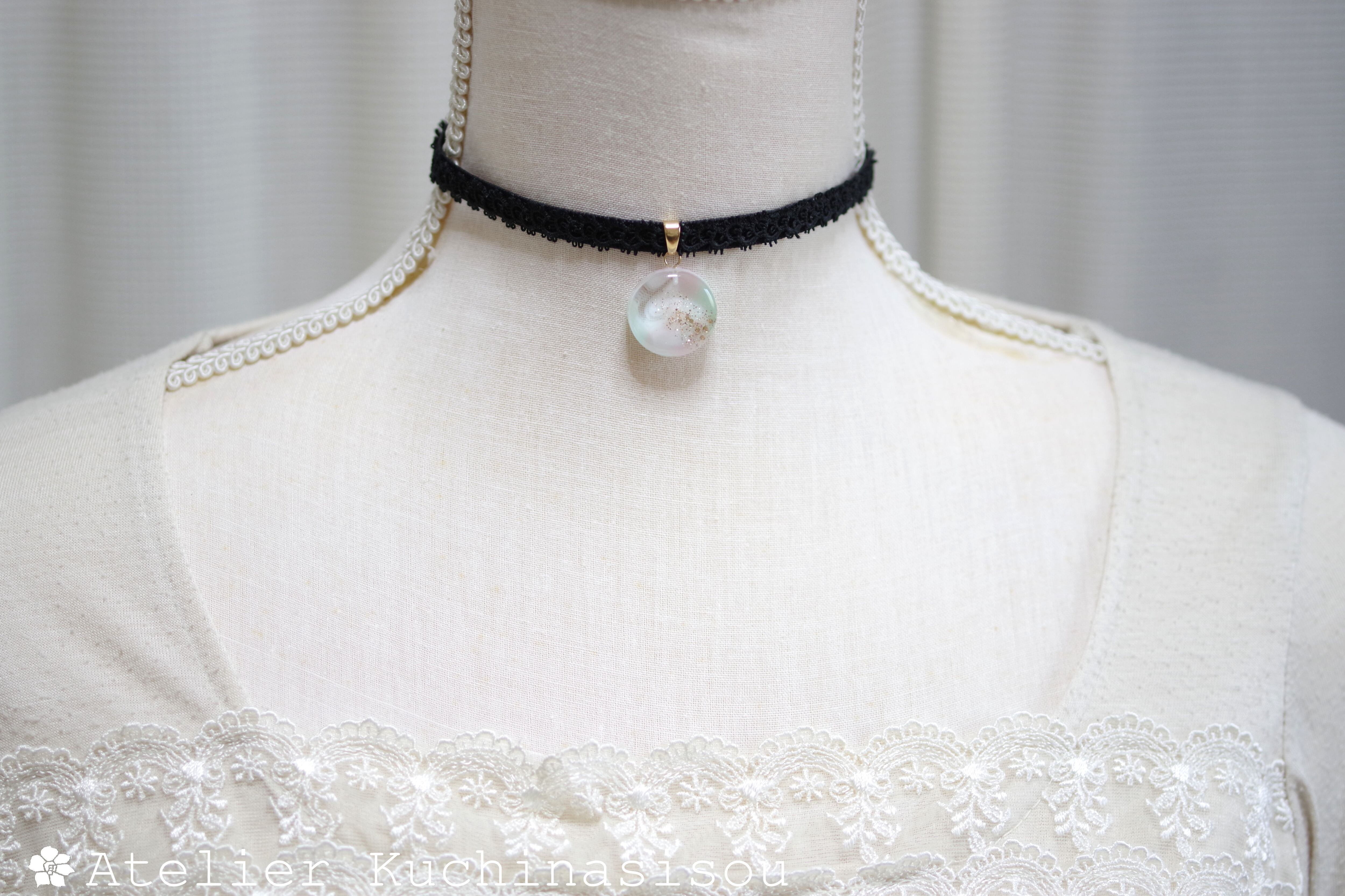 淡いピンクとグリーンが混ざり合い、まどろむような優しく幻想的な色合いを作り出しているレジンを、ベルベットリボンにタティングレースで装飾を施したチョーカーに仕上げました。