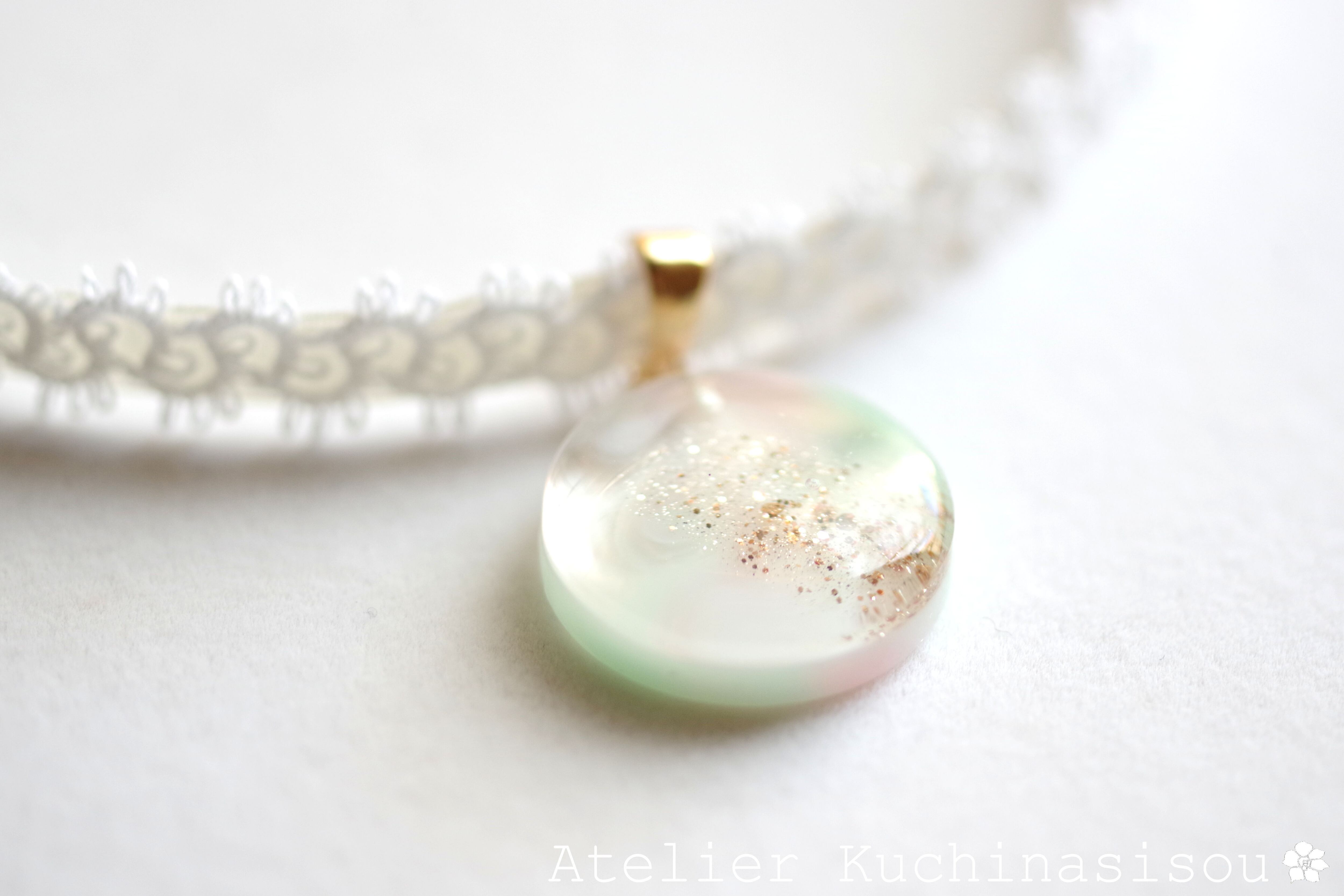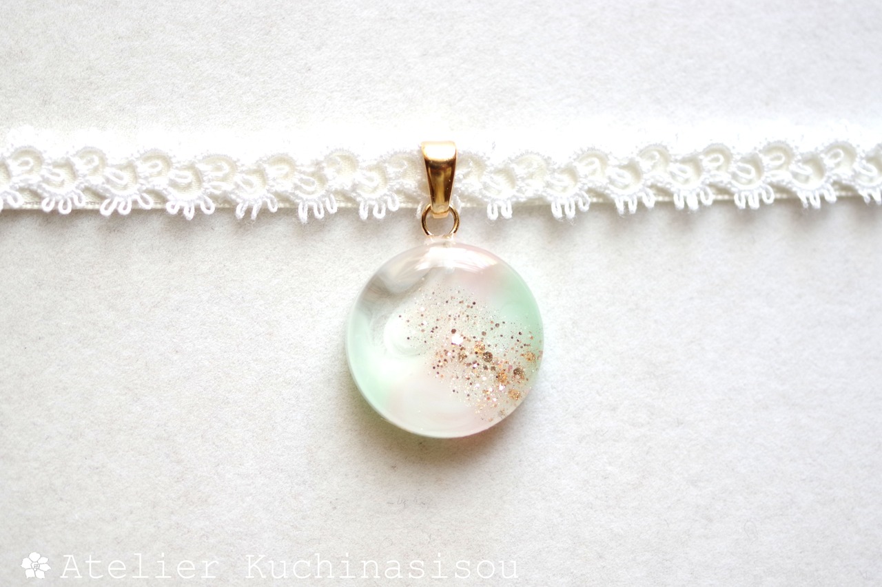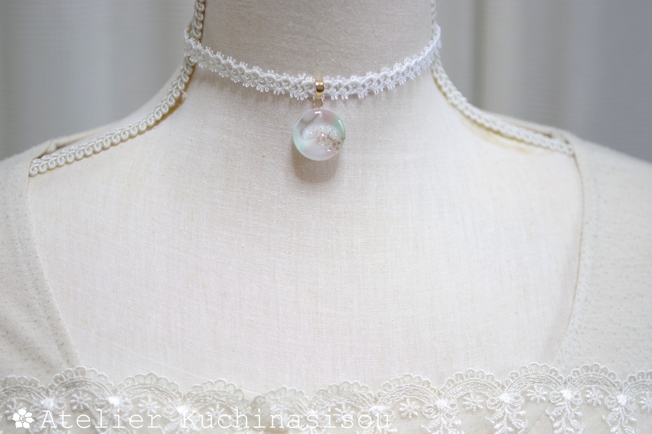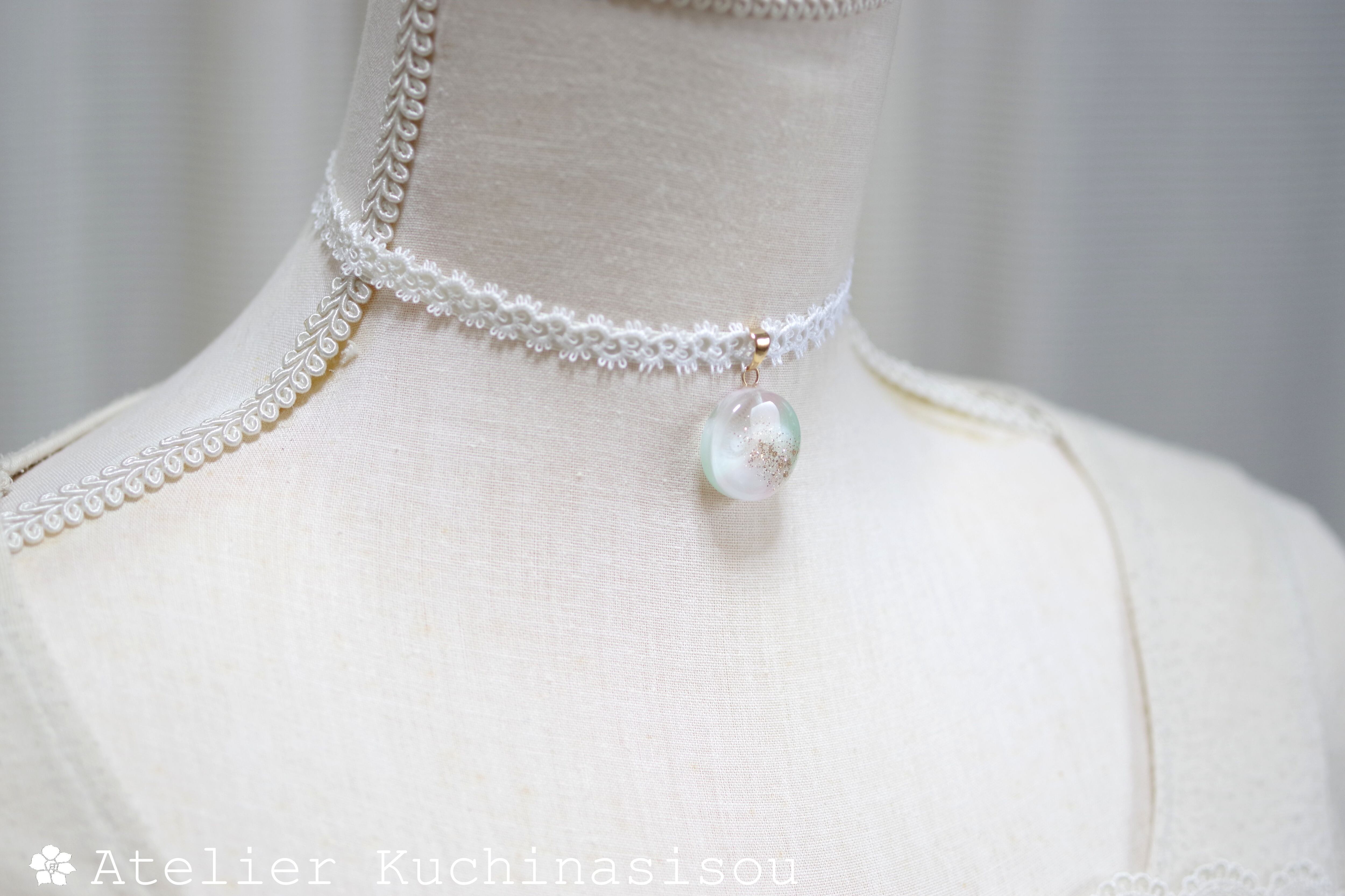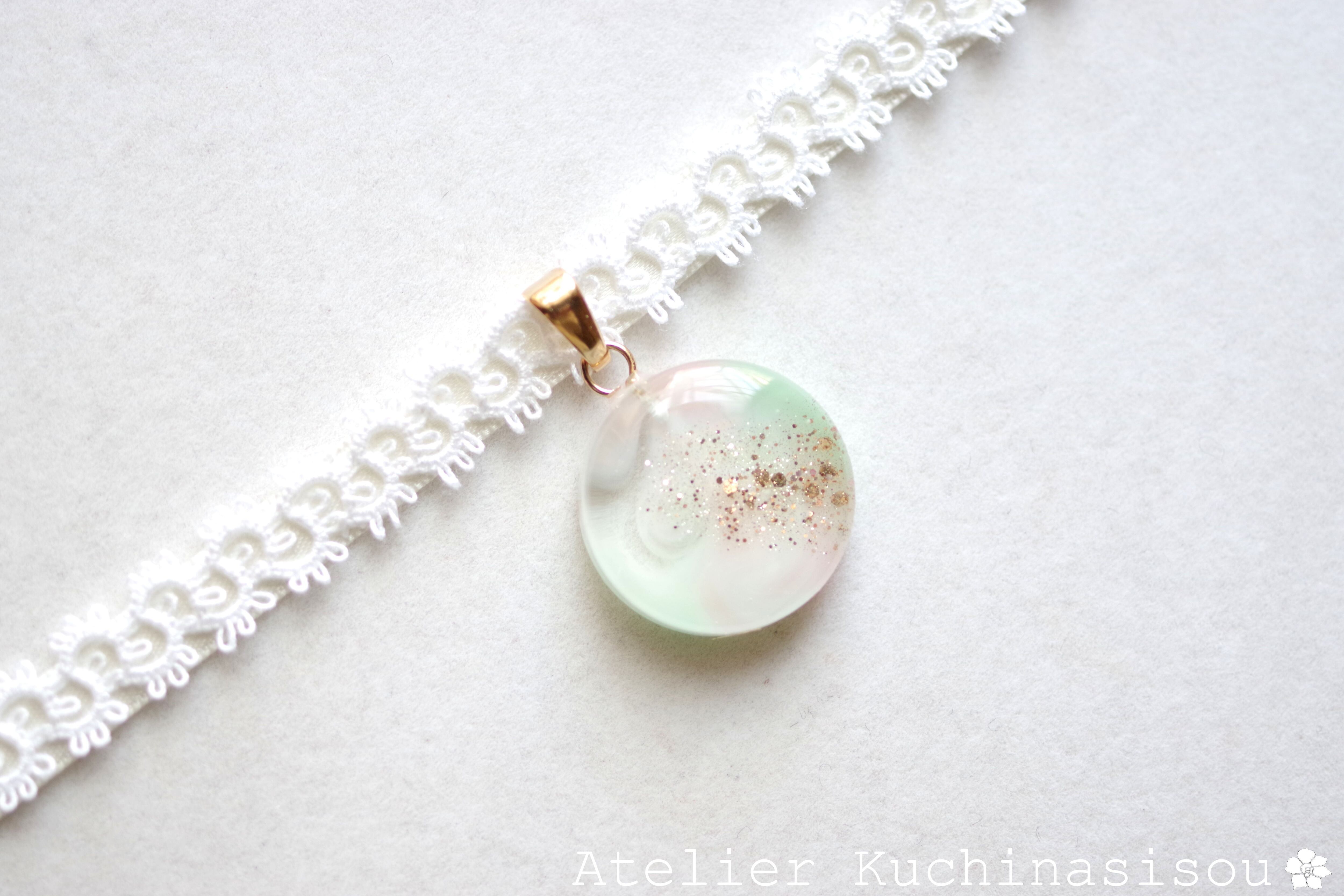 淡いピンクとグリーンが混ざり合い、まどろむような優しく幻想的な色合いを作り出しているレジンを、サテンリボンにタティングレースで装飾を施したチョーカーに仕上げました。