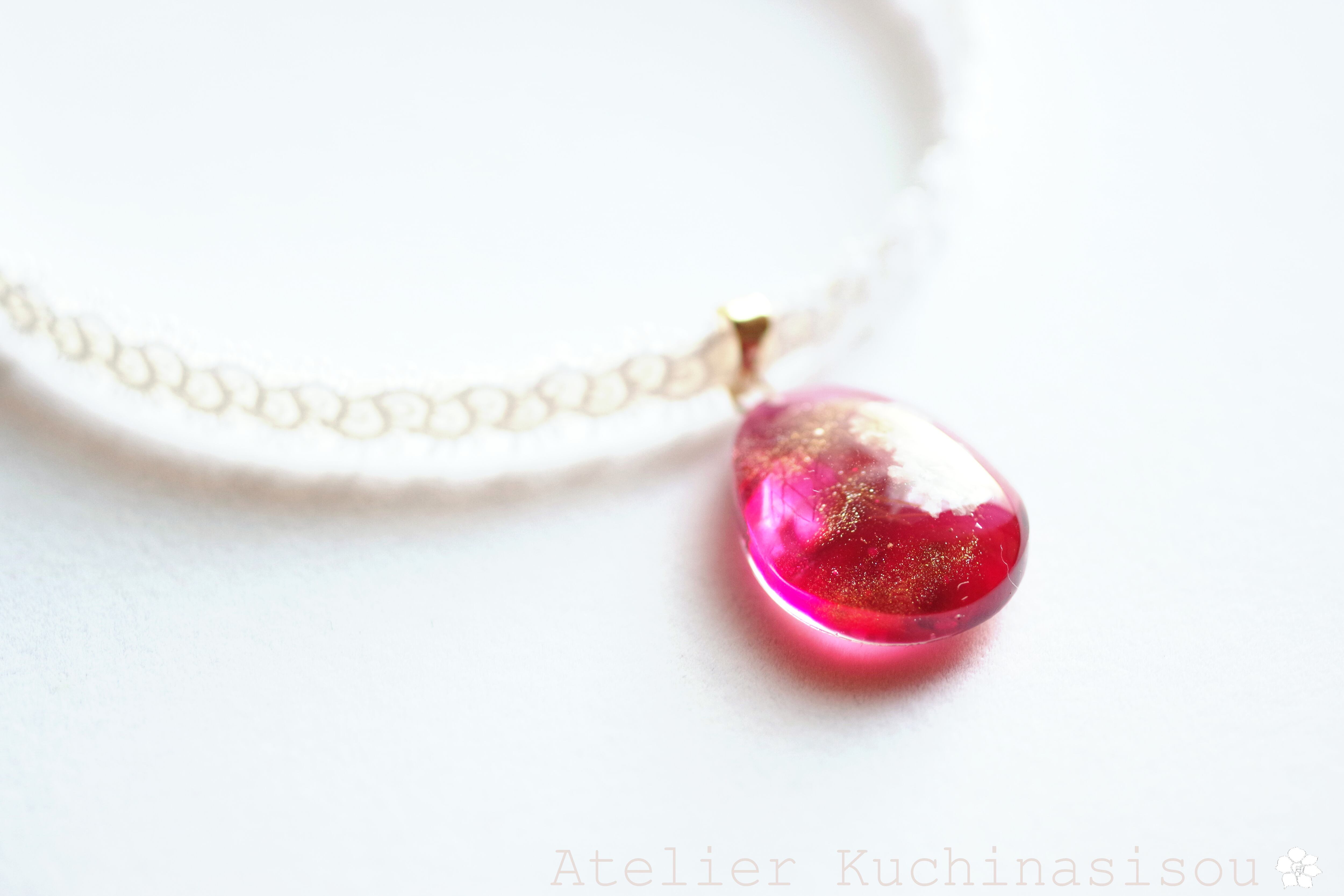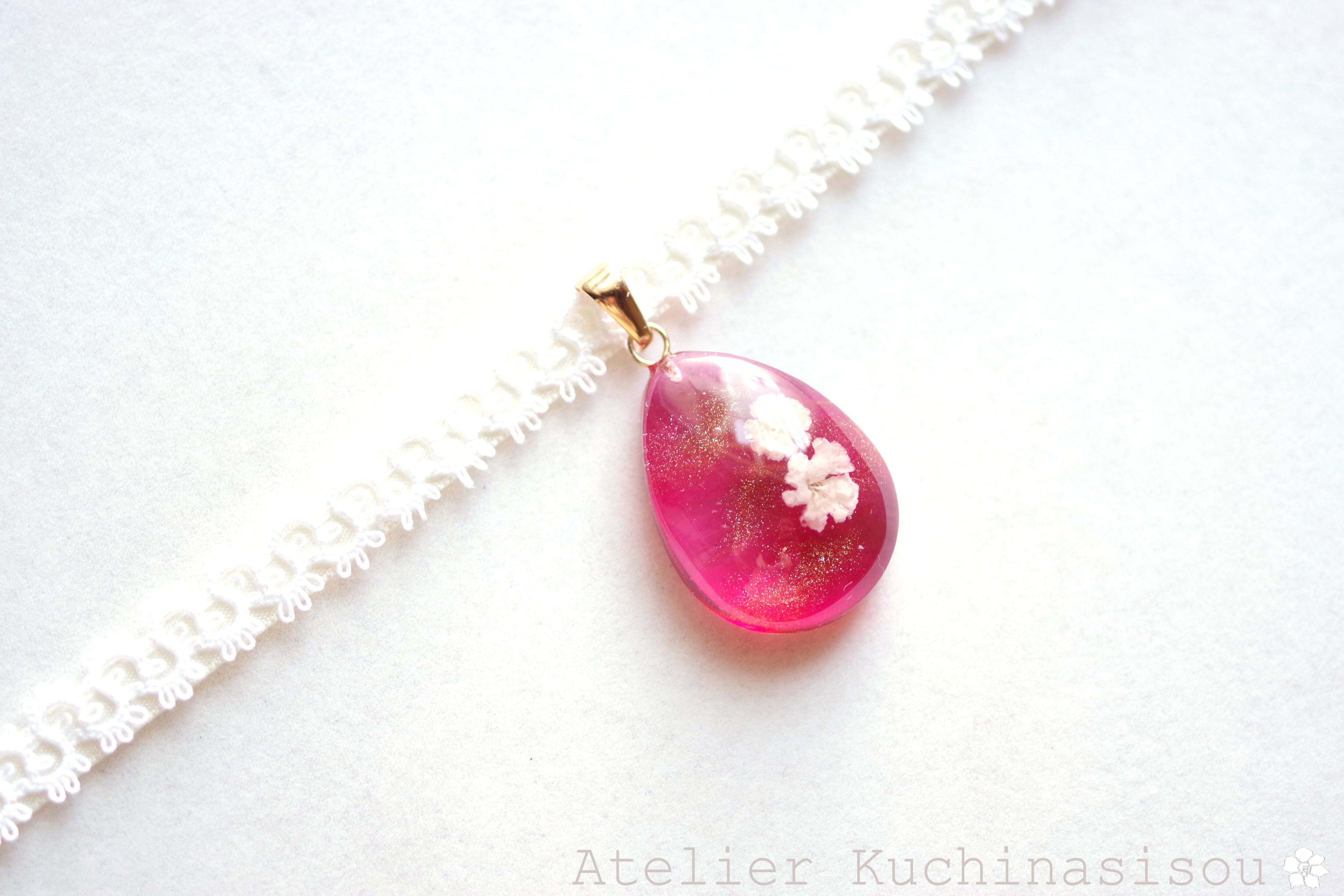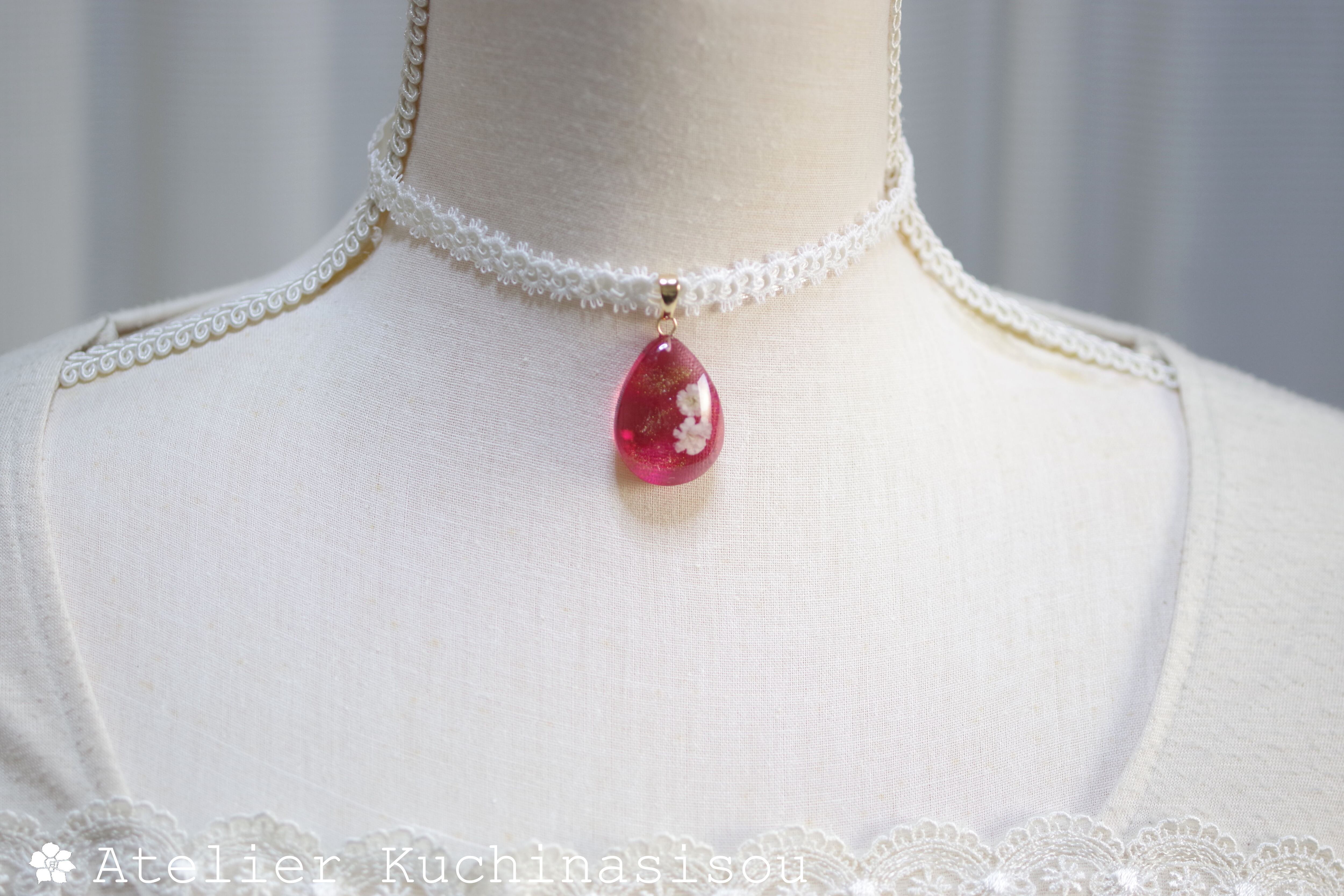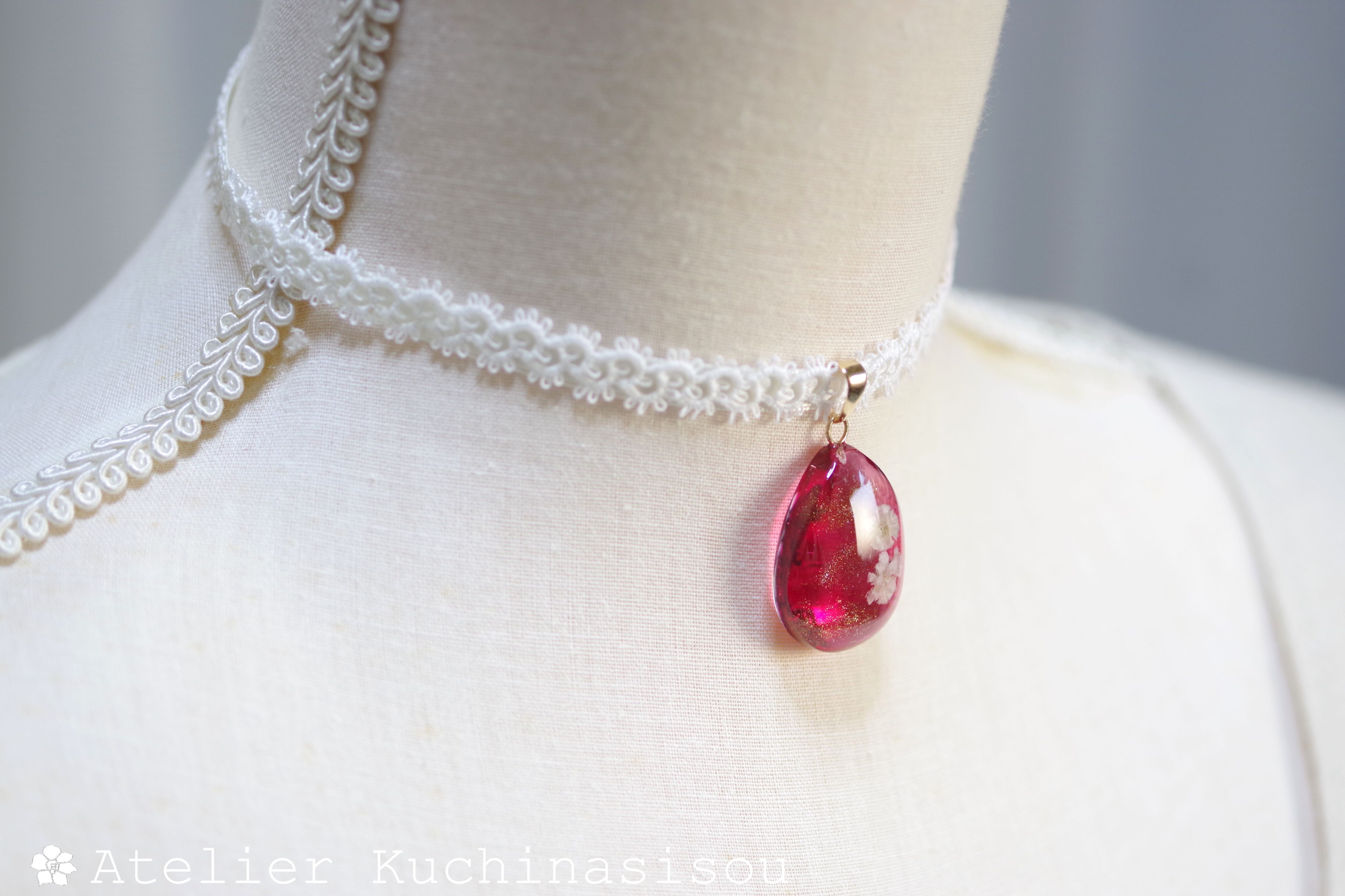 ドロップ型にお花を二輪咲かせた可憐なレジンを、サテンリボンにタティングレースで装飾を施したチョーカーに仕上げました。