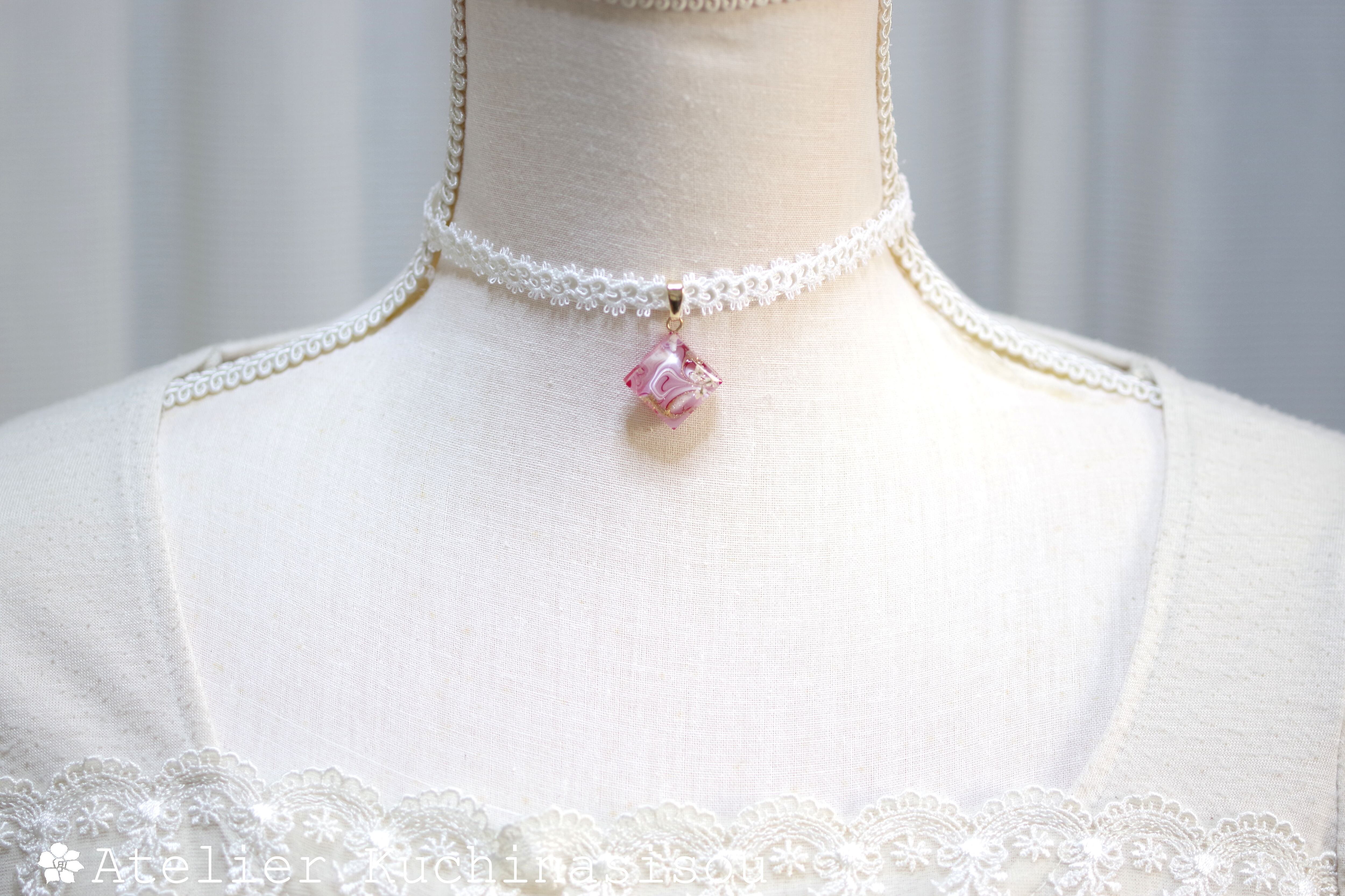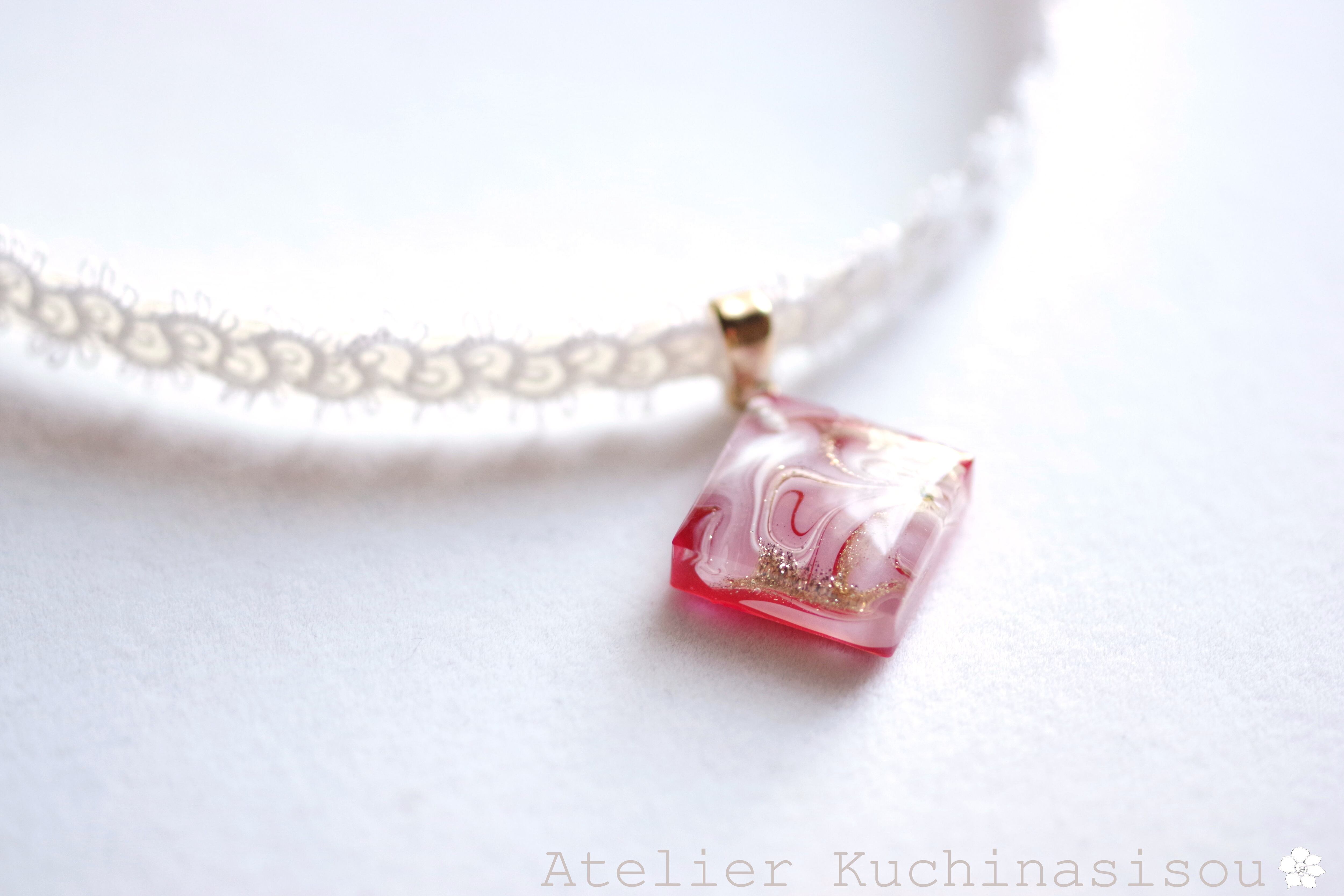 【受注製作】レジンアート スクエアモチーフとタティングレースとサテンリボンのチョーカー〈真朱の音色〉