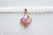 白とゴールドのマーブル模様の隙間から覗くこっくりした赤が印象的なレジンを、サテンリボンにタティングレースで装飾を施したチョーカーに仕上げました。
