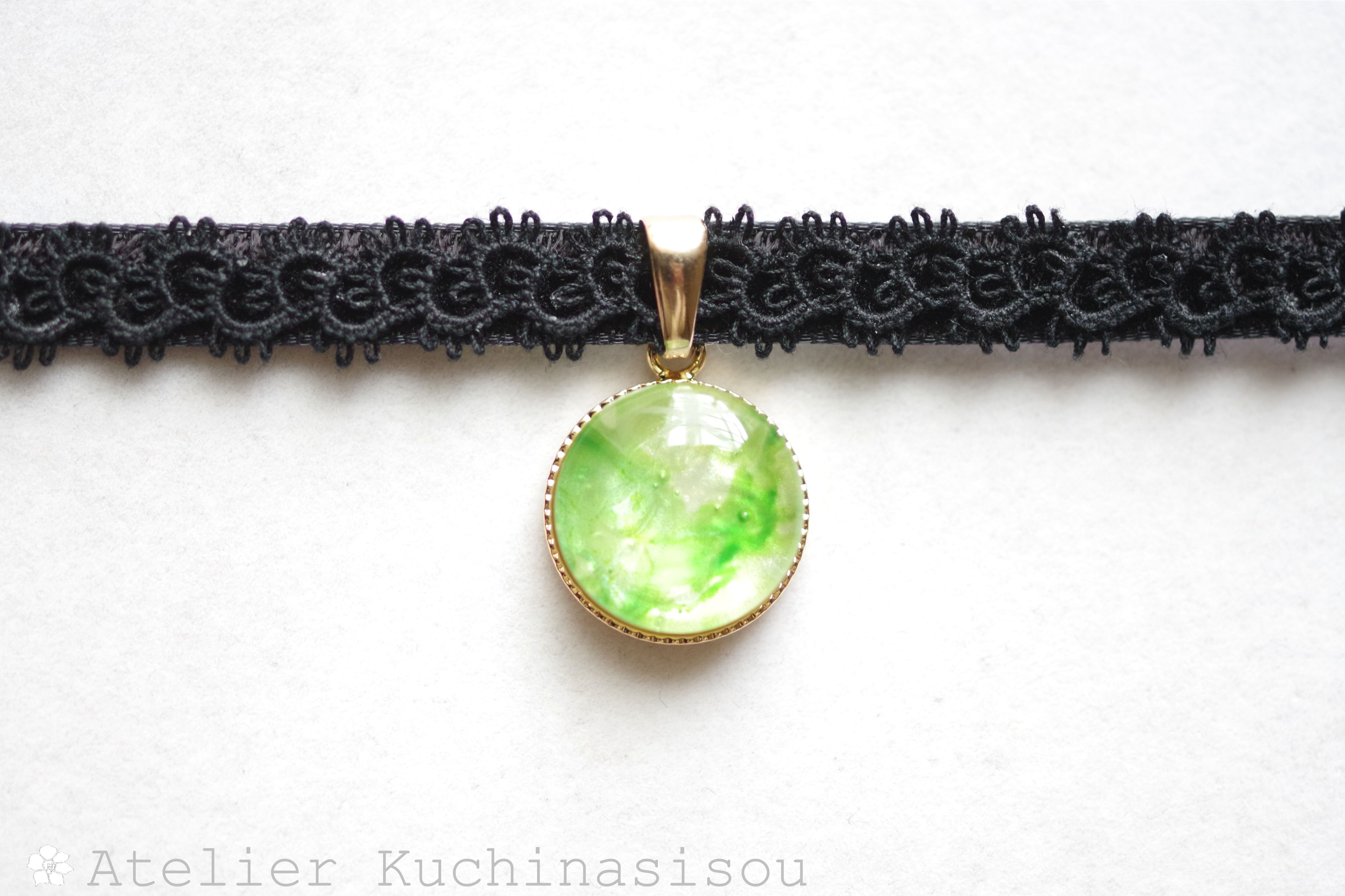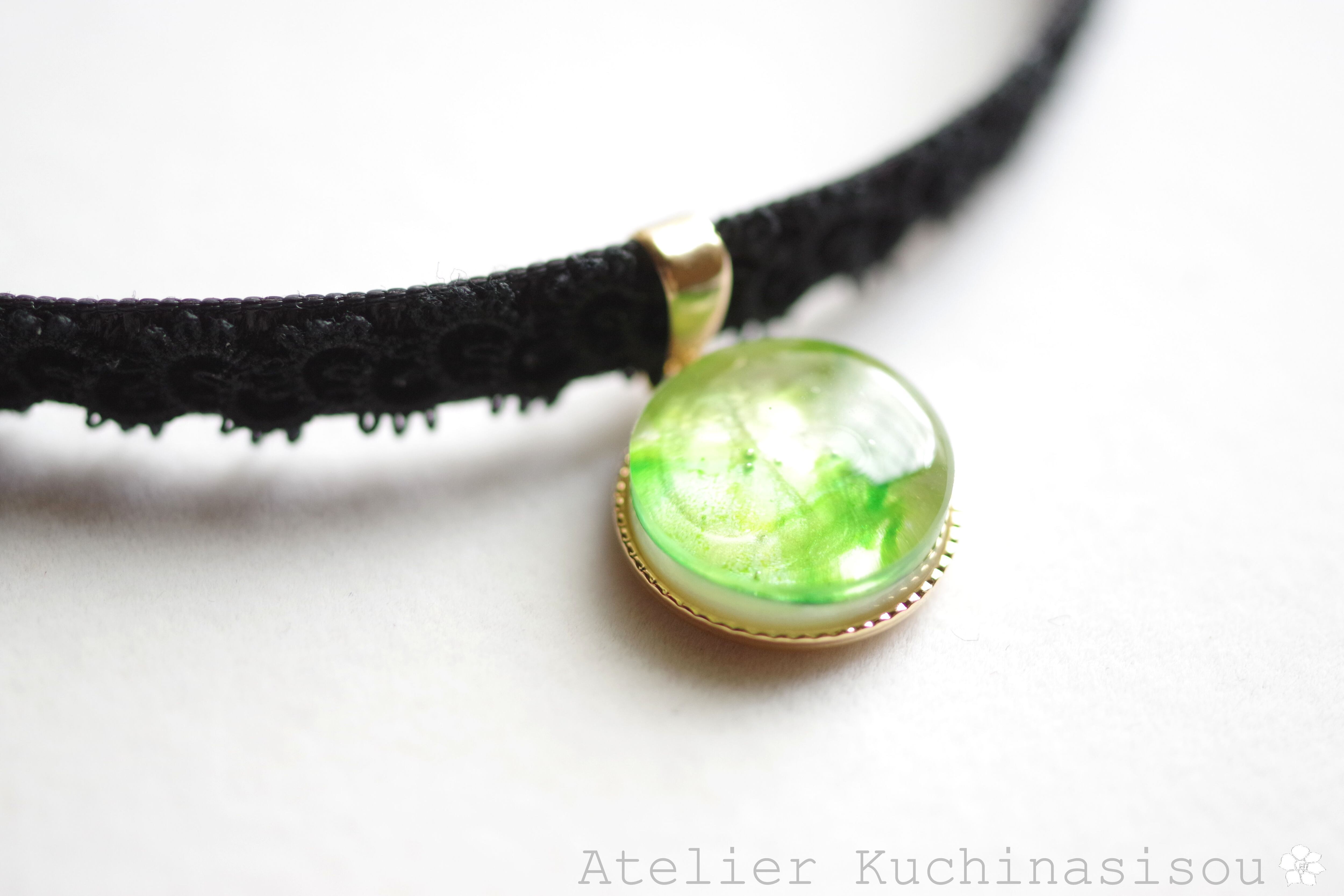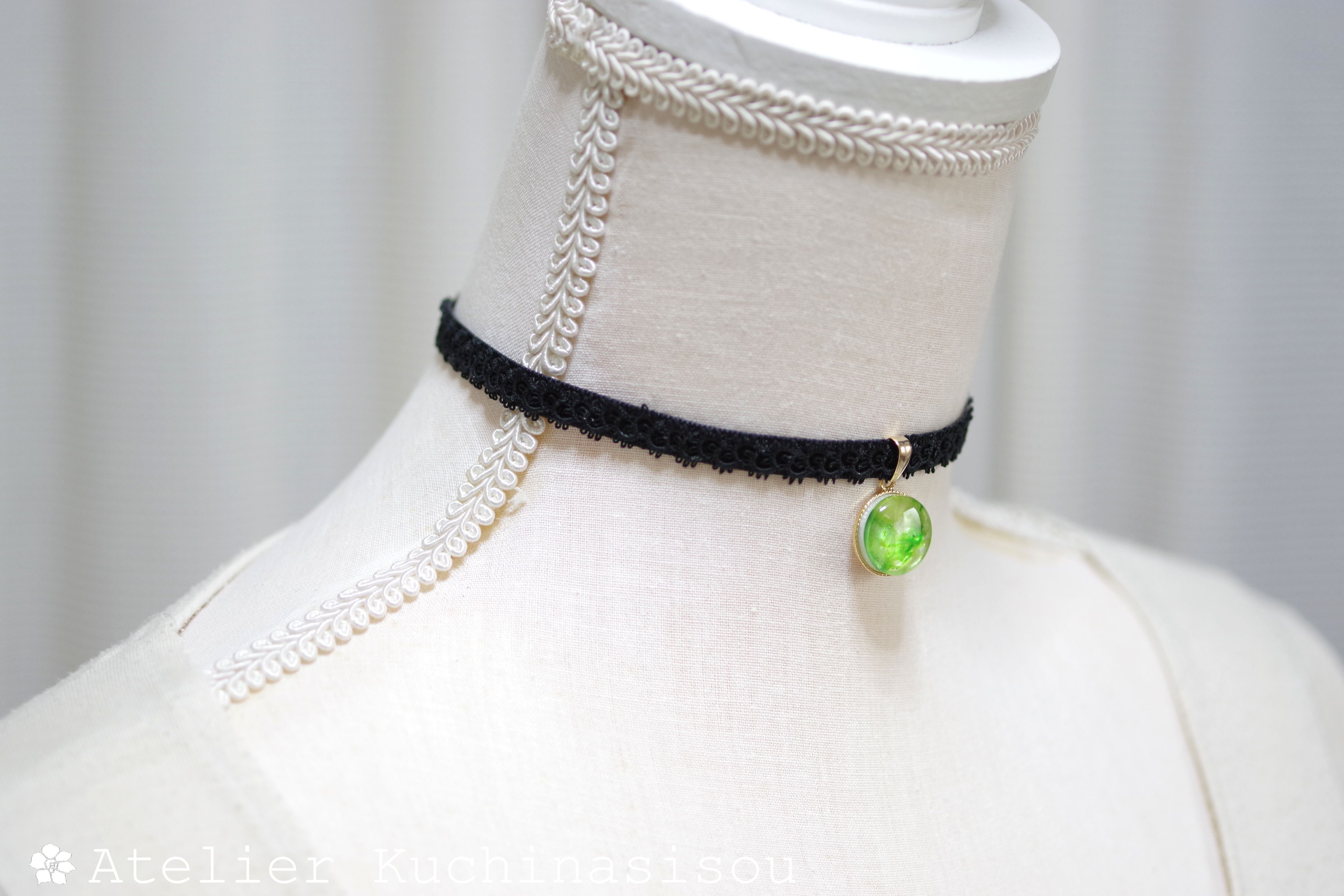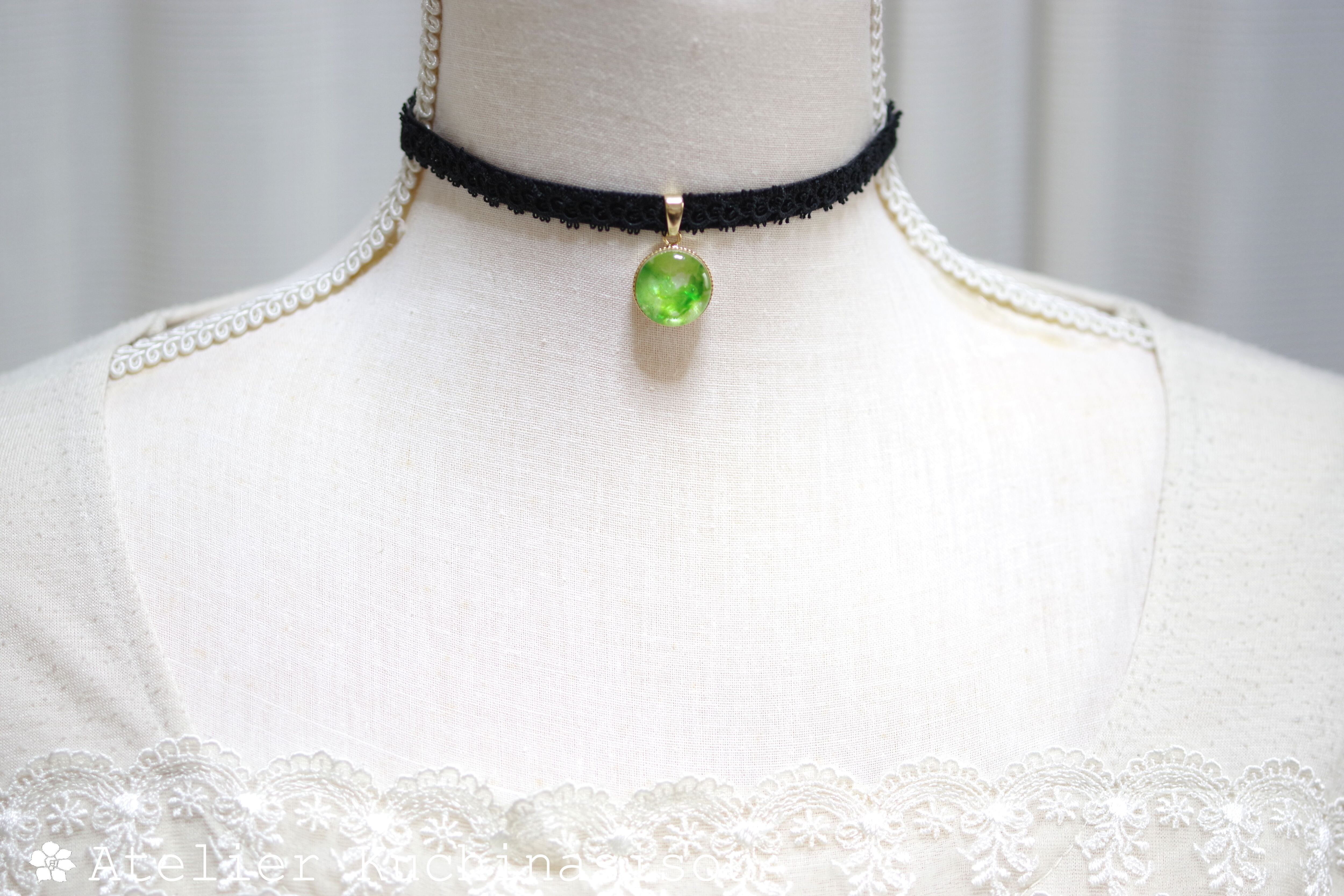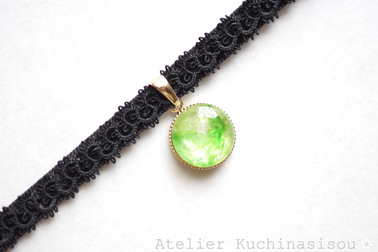 淡い黄緑色が幻想的なカラーリングのレジンを、ベルベットリボンにタティングレースで装飾を施したチョーカーに仕上げました。