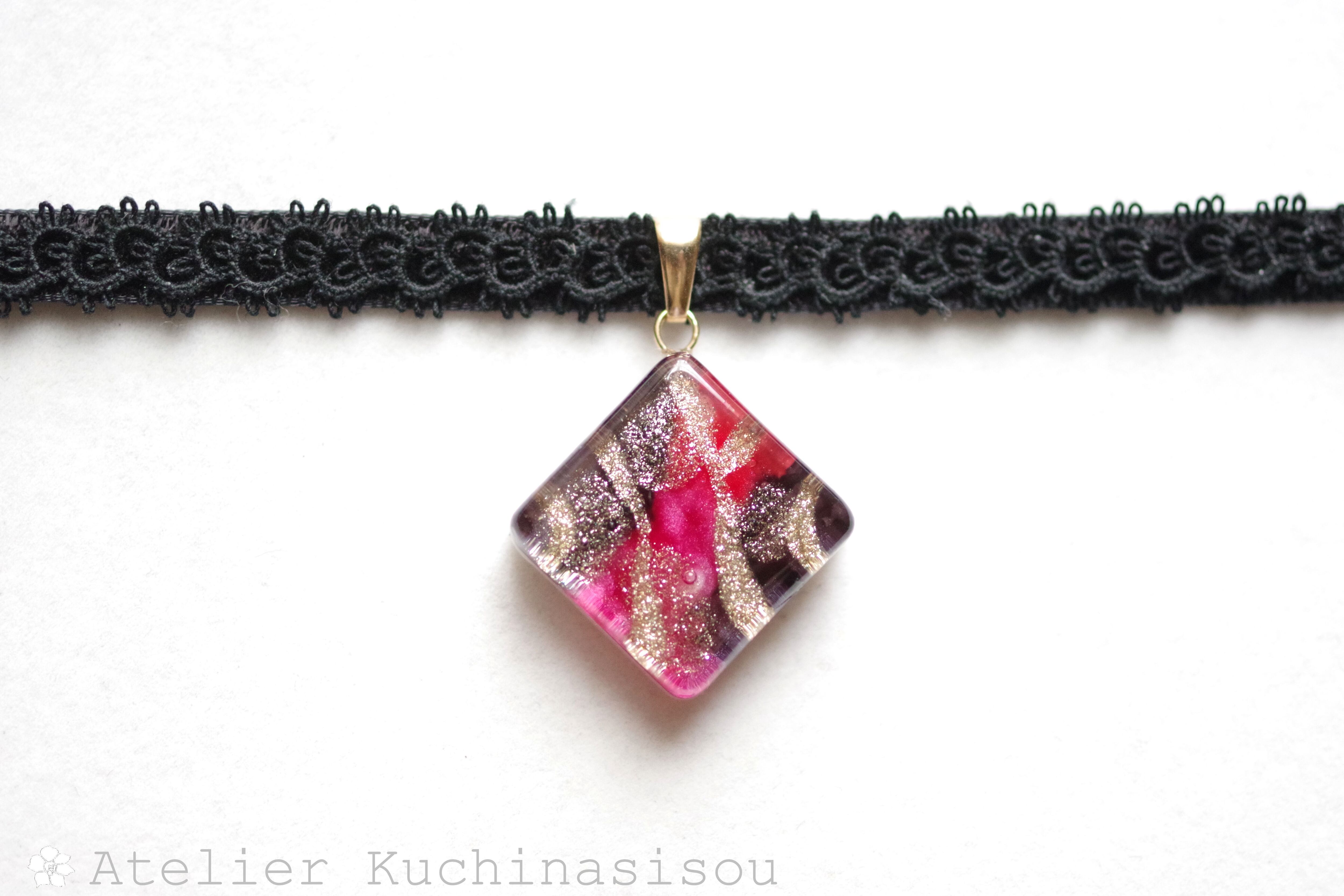 黒とピンクと赤、そしてゴールドのラインがなんとも華やかで、ビビットなのに上品なカラーリングのレジンを、ベルベットリボンにタティングレースで装飾を施したチョーカーに仕上げました。