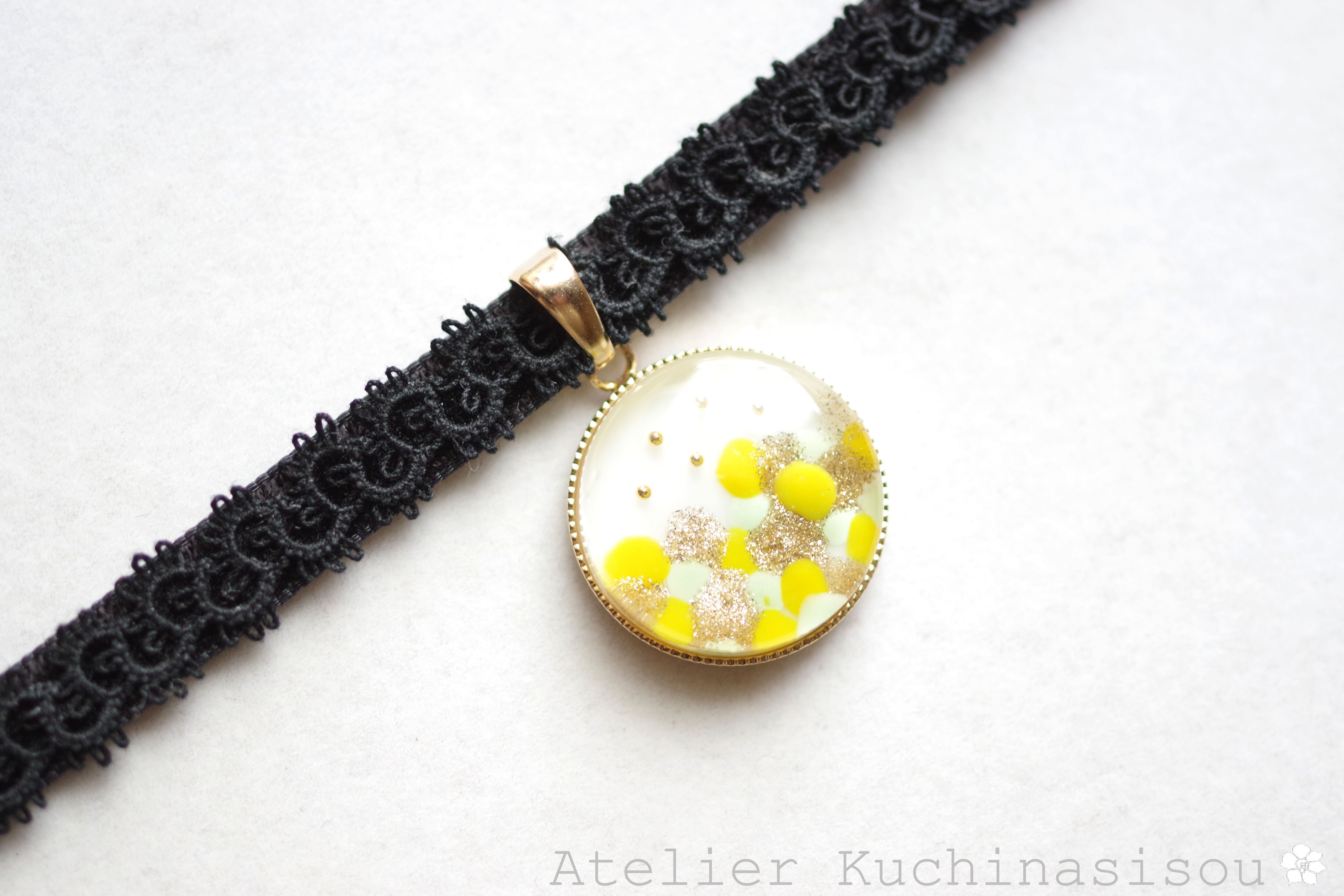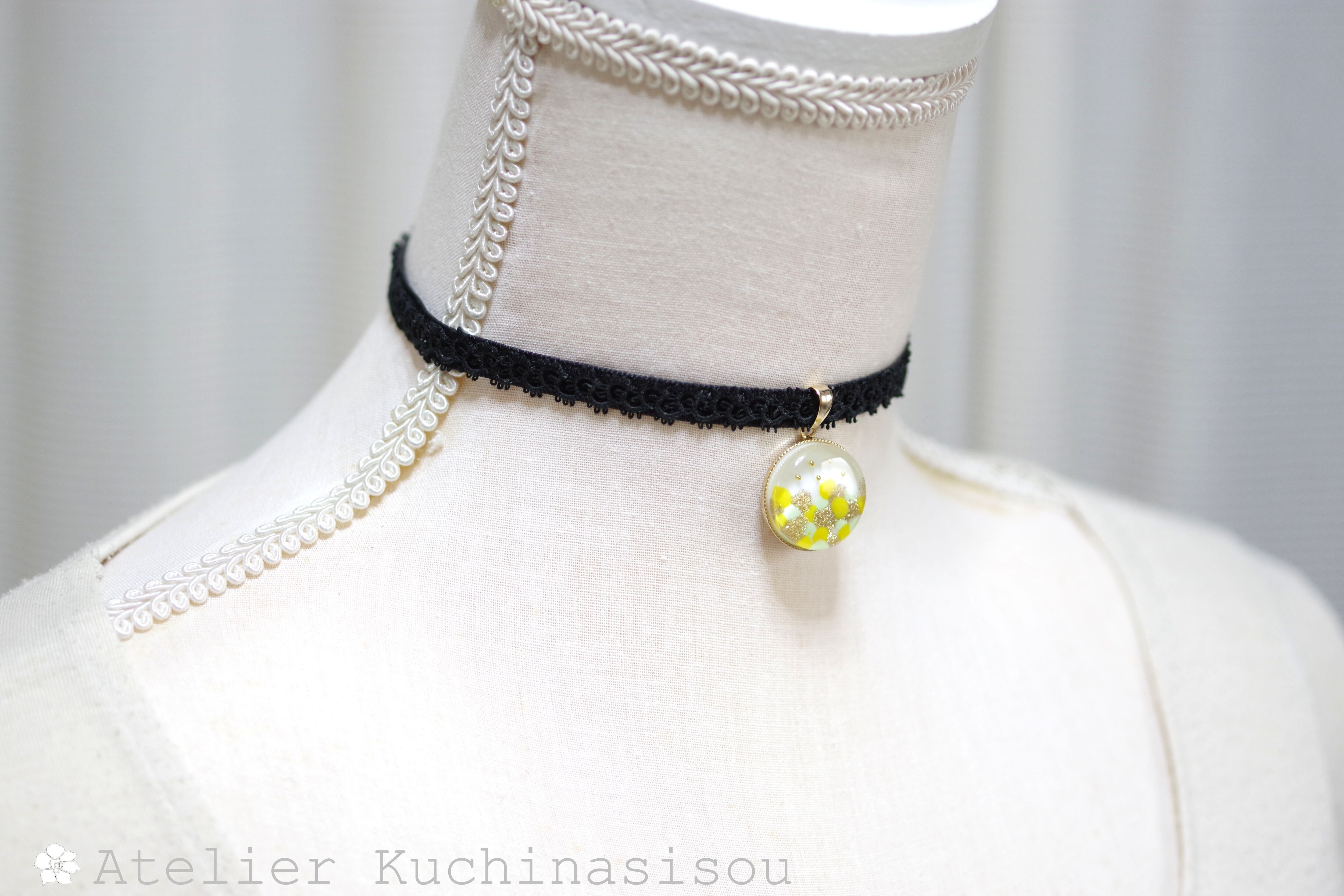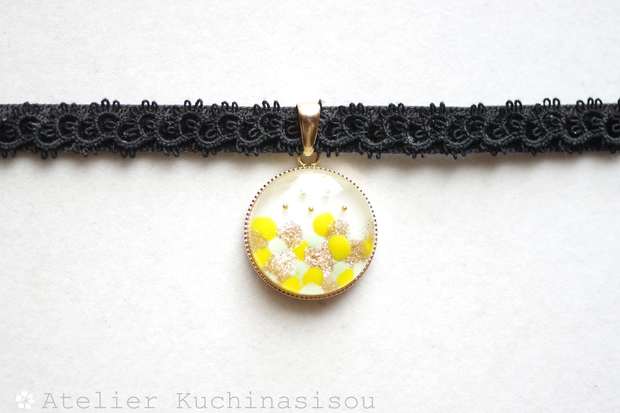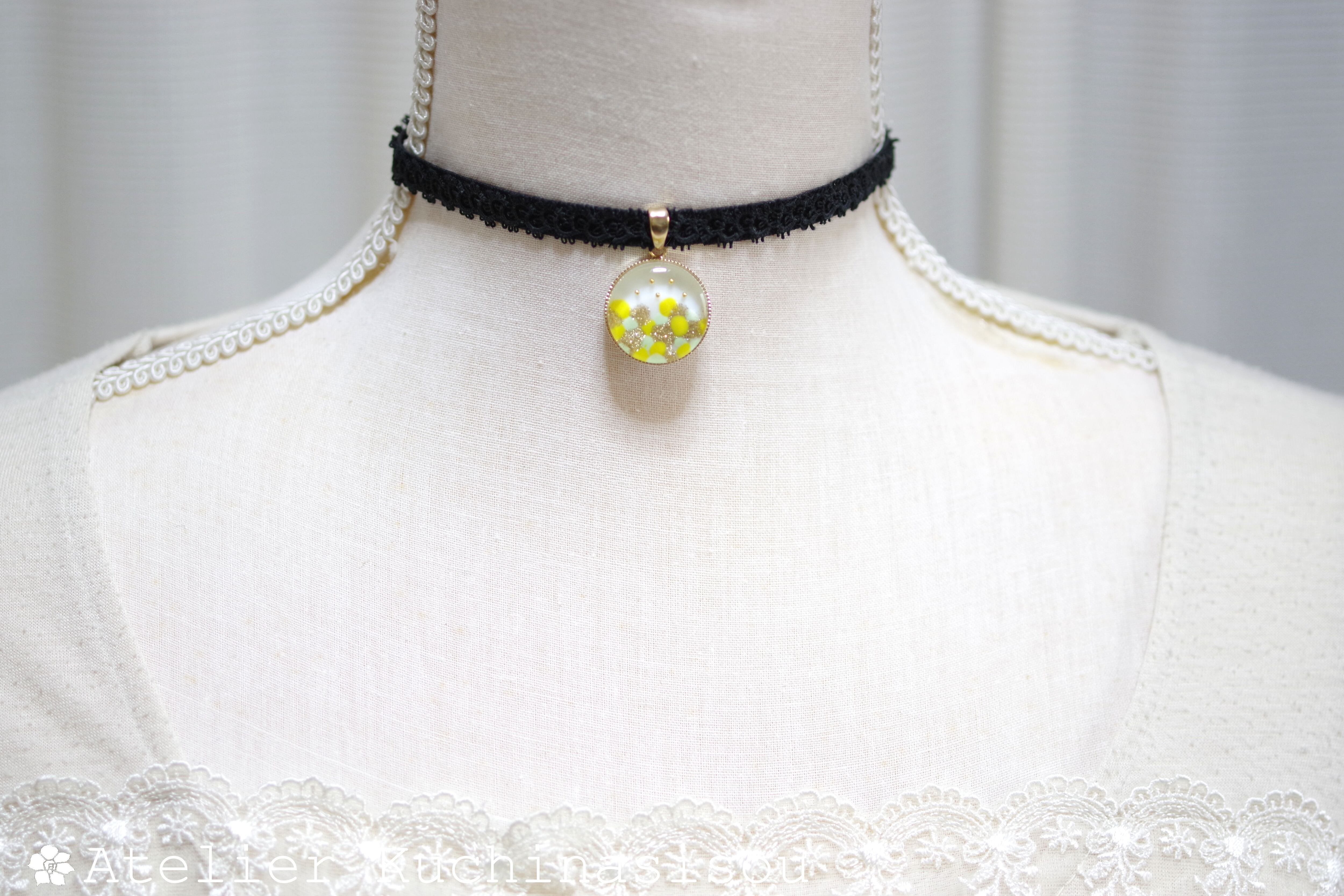 【受注製作】レジンアート ラウンドモチーフとタティングレースとベルベットリボンのチョーカー〈ミモザ降る〉