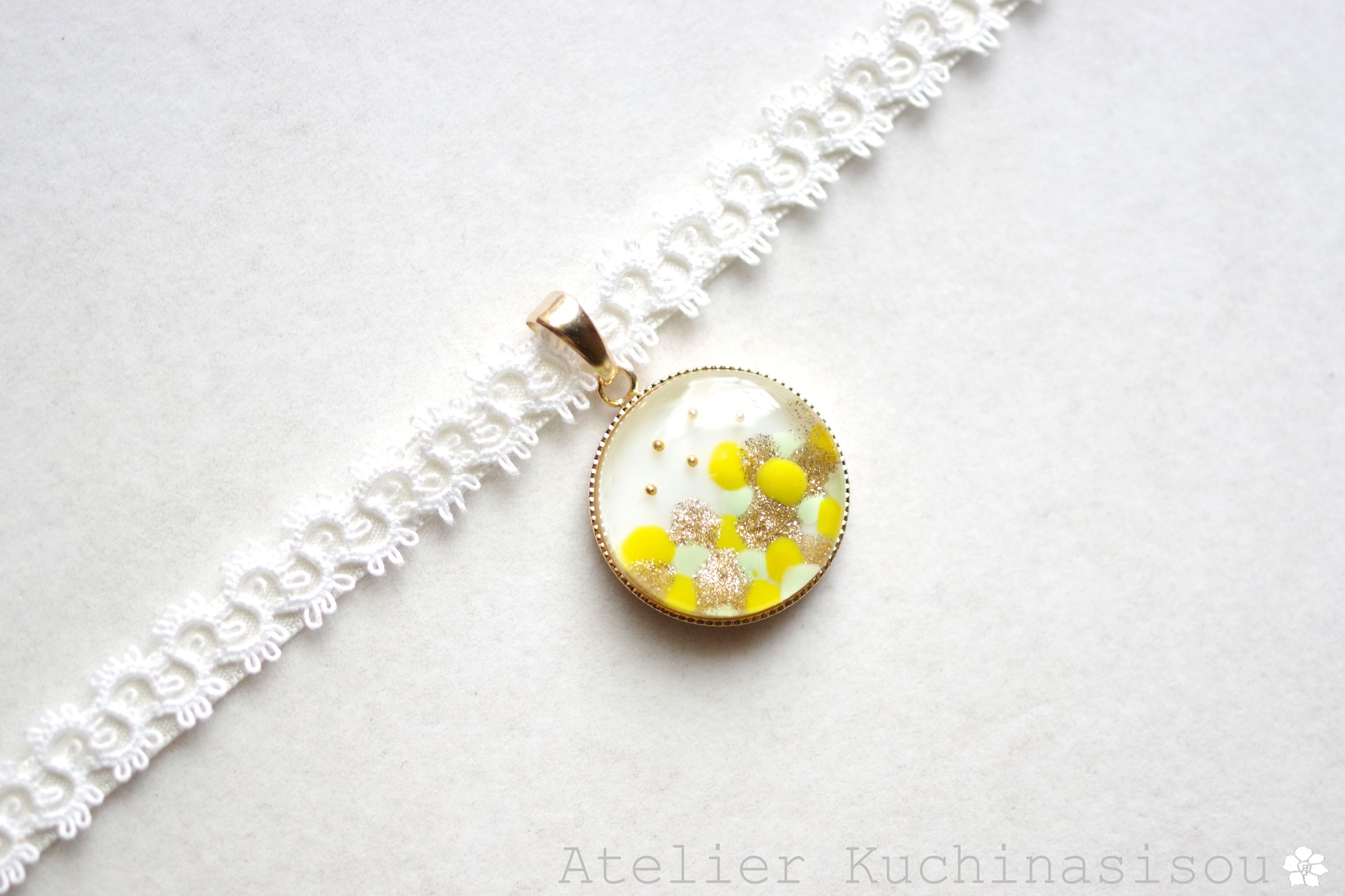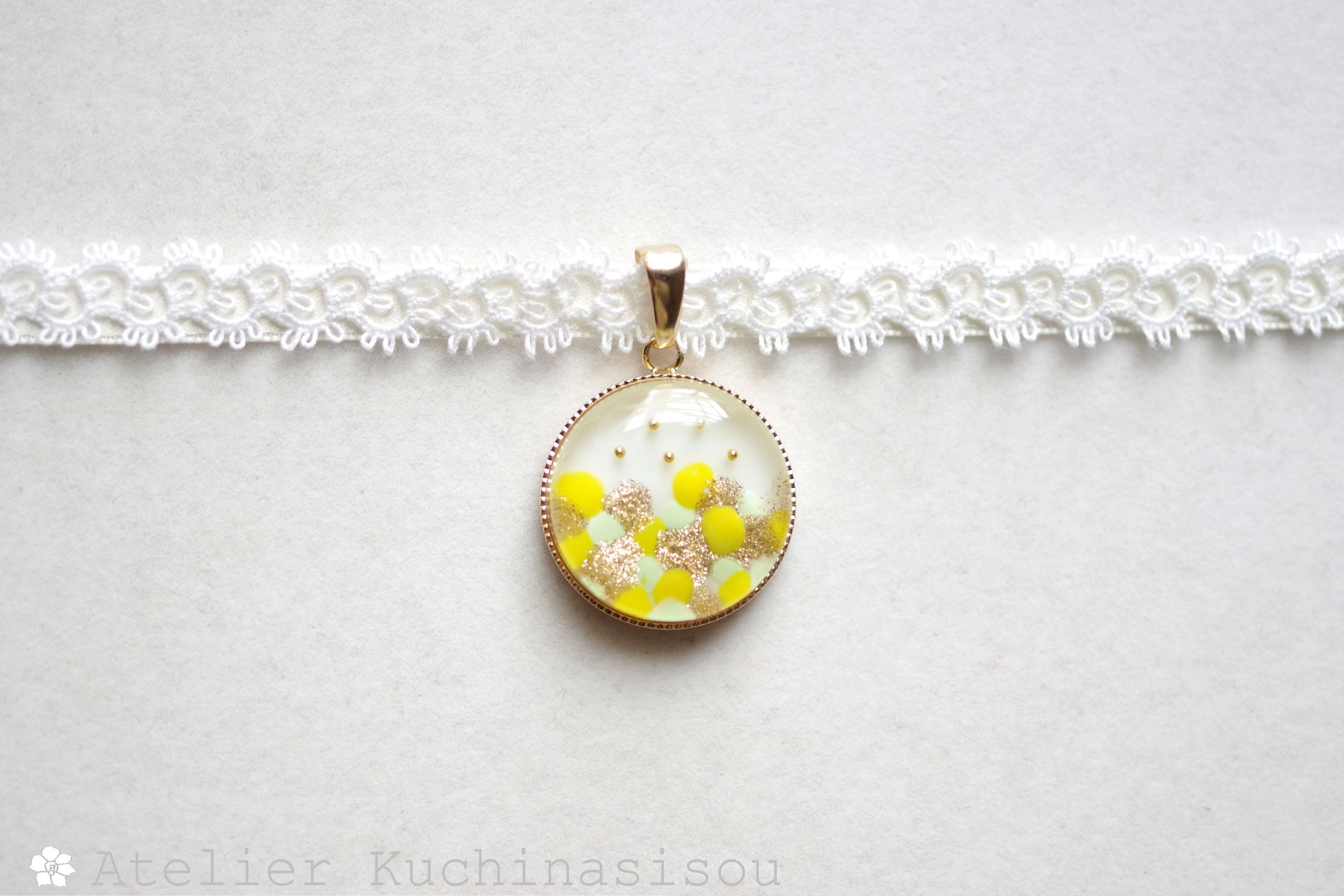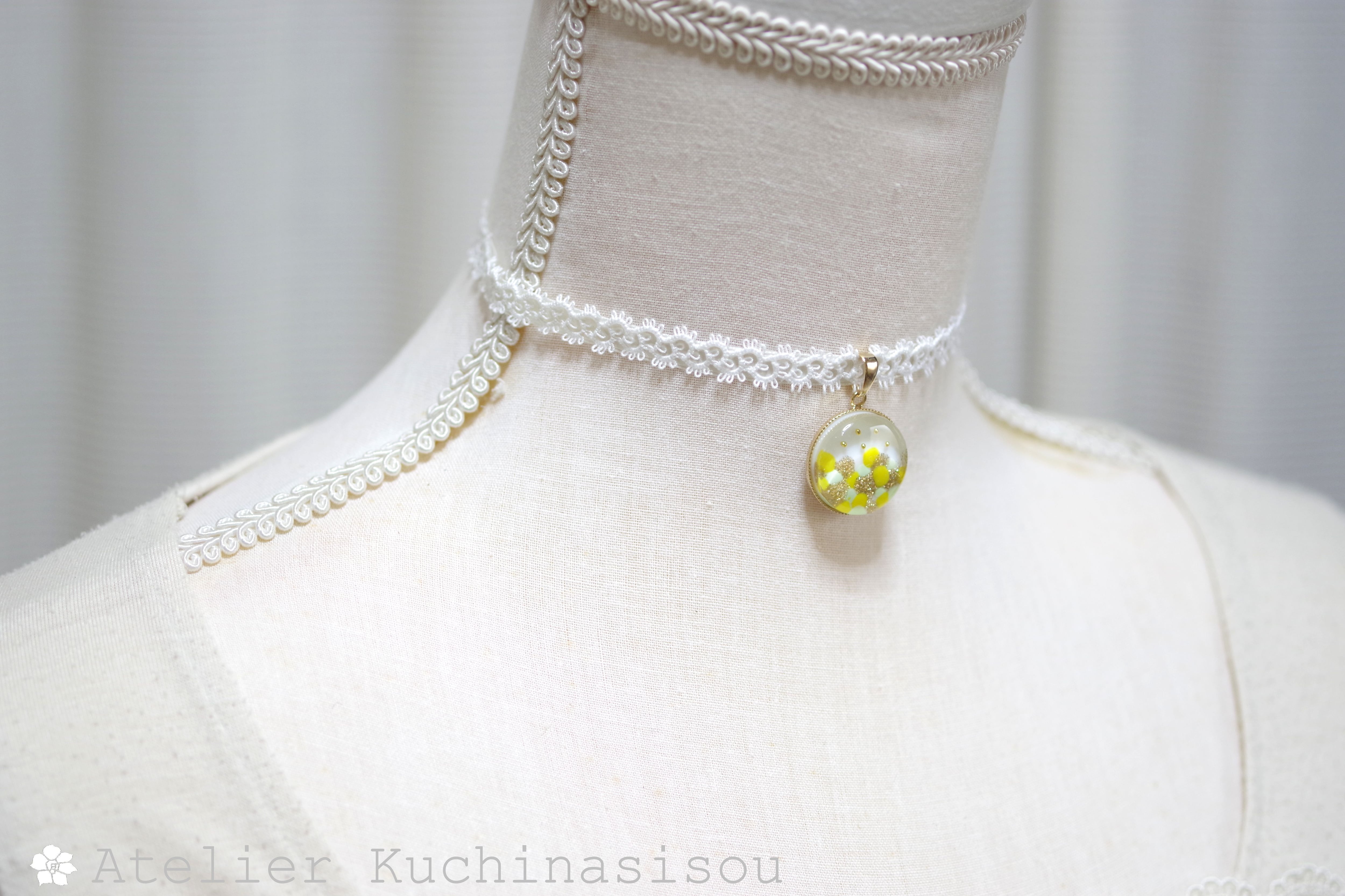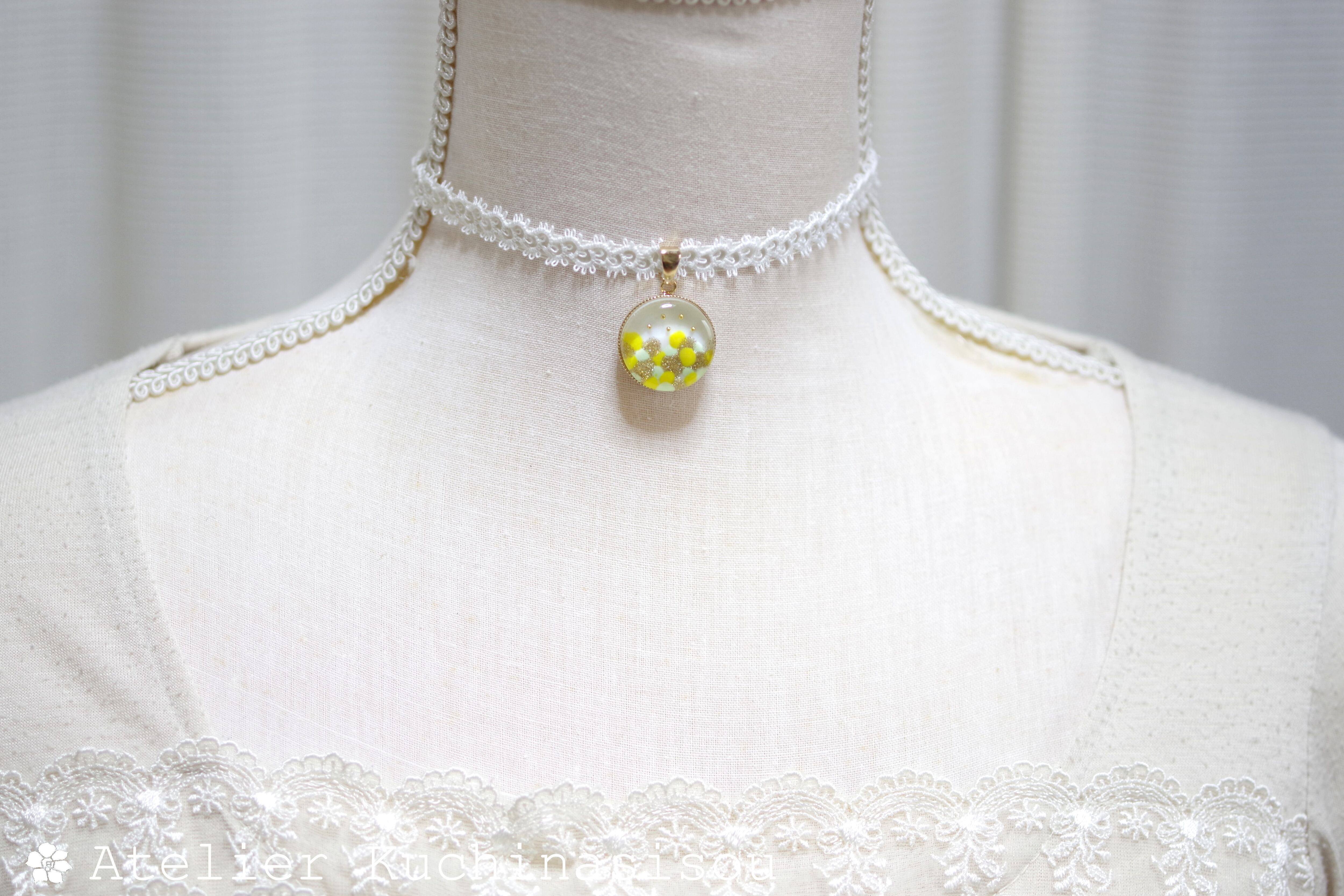 【受注製作】レジンアート ラウンドモチーフとタティングレースとサテンリボンのチョーカー〈ミモザ降る〉