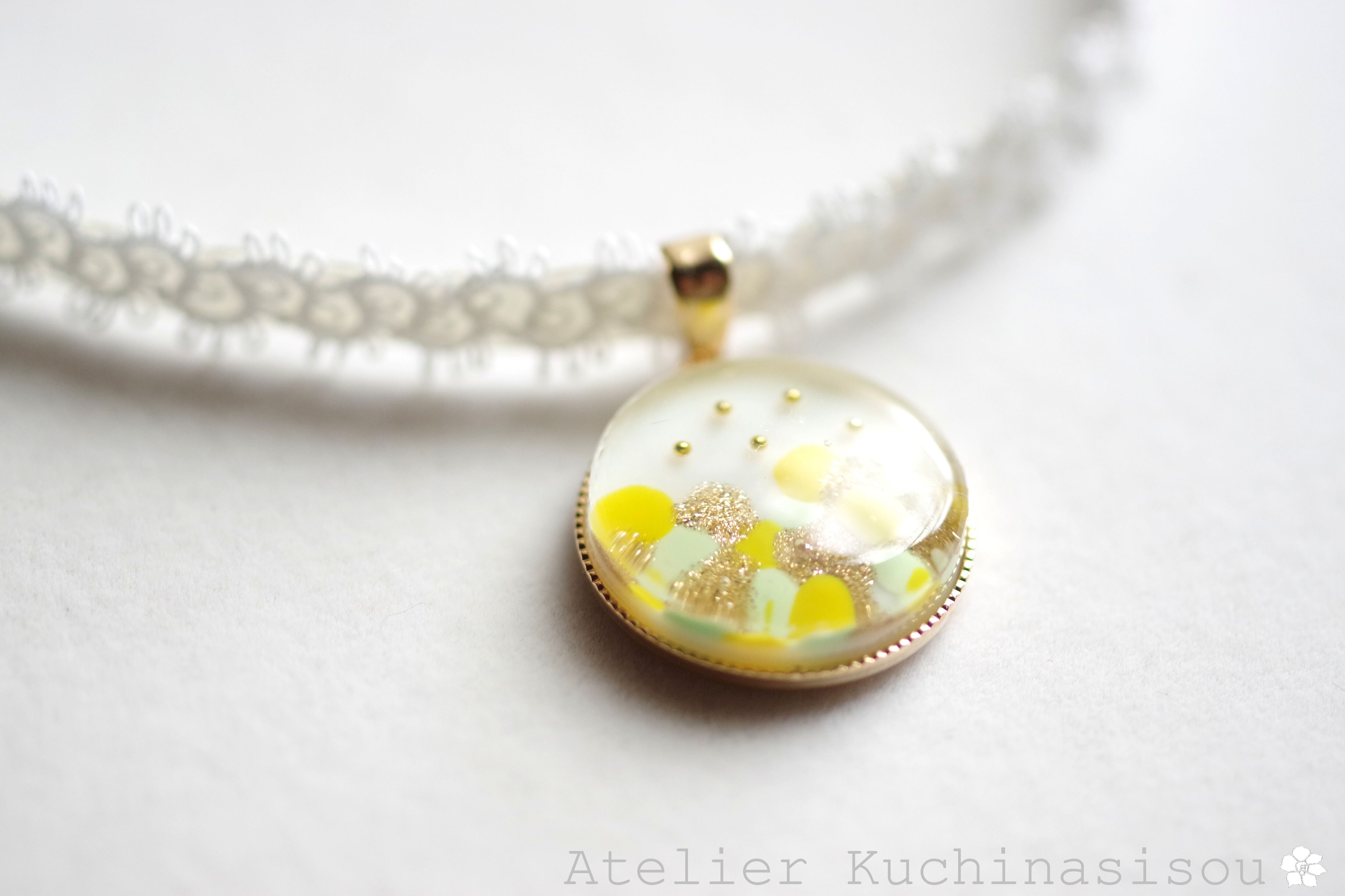 ミモザのようなイエローと葉っぱを思わせるグリーン、華やかなゴールドをちりばめた、愛らしく明るいレジンを、サテンリボンにタティングレースで装飾を施したチョーカーに仕上げました。