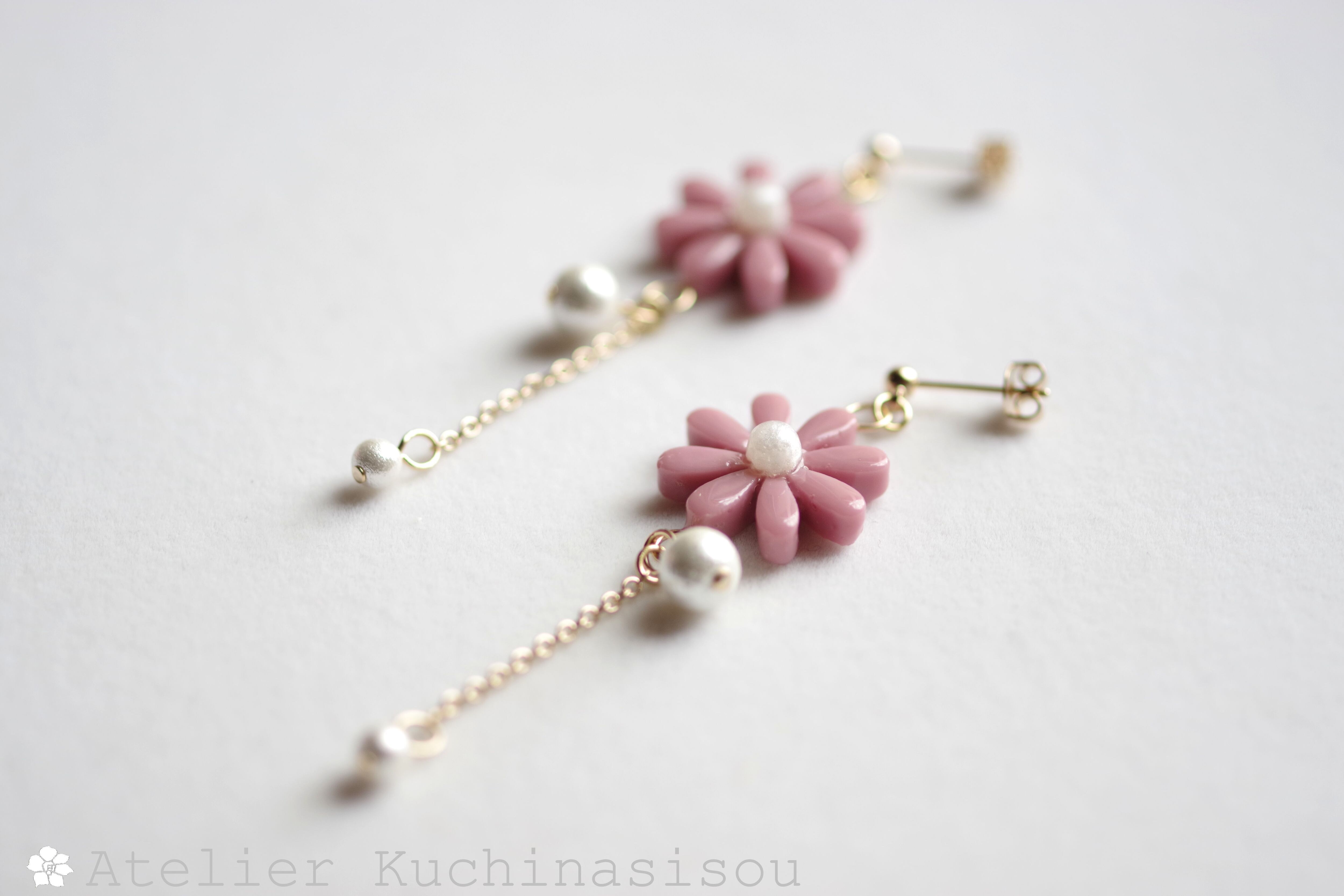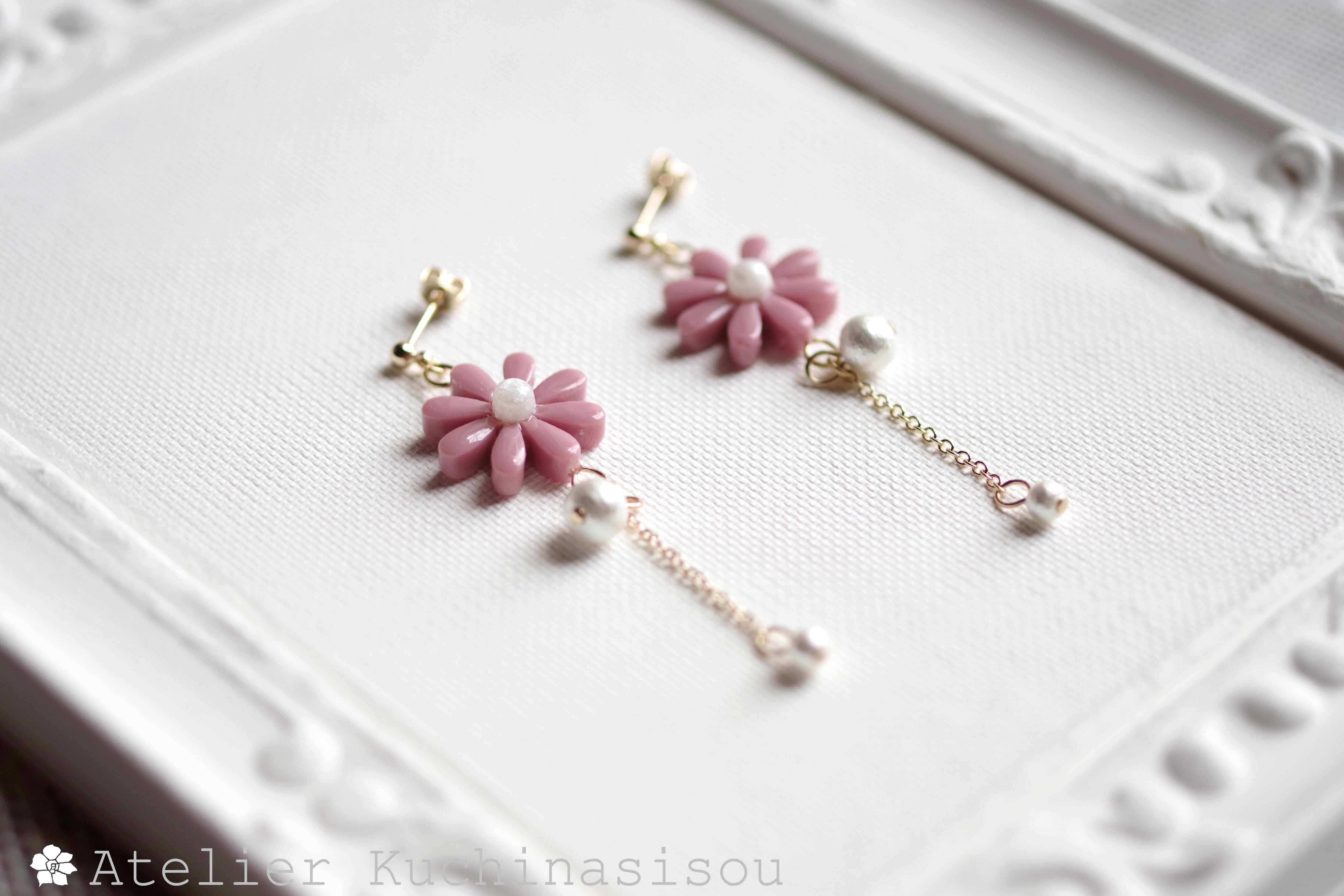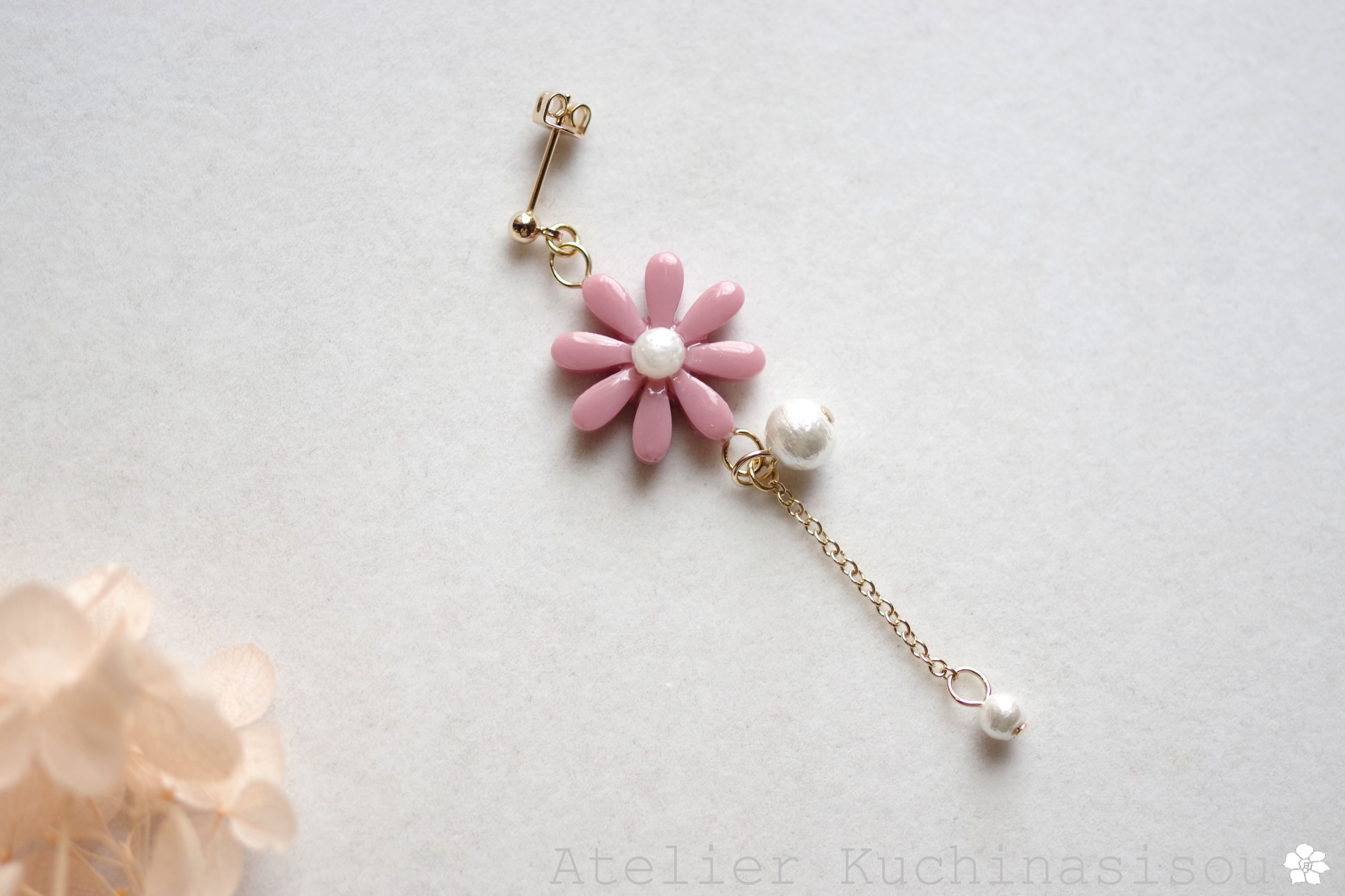 こっくりしたピンクのお花に、大小二粒のコットンパールをあしらった可憐なピアスです。