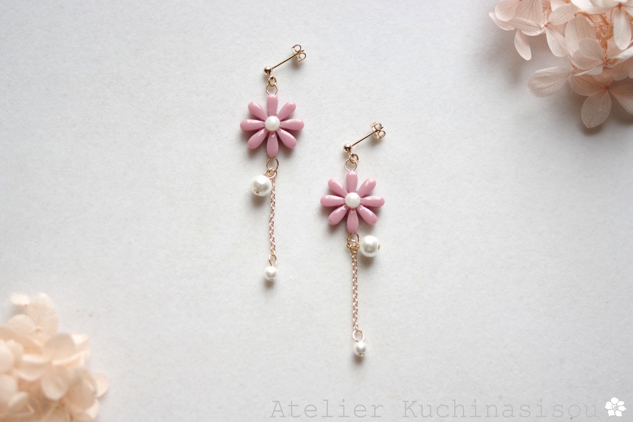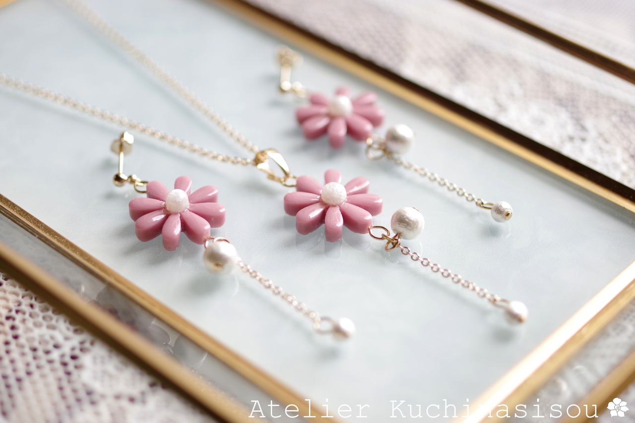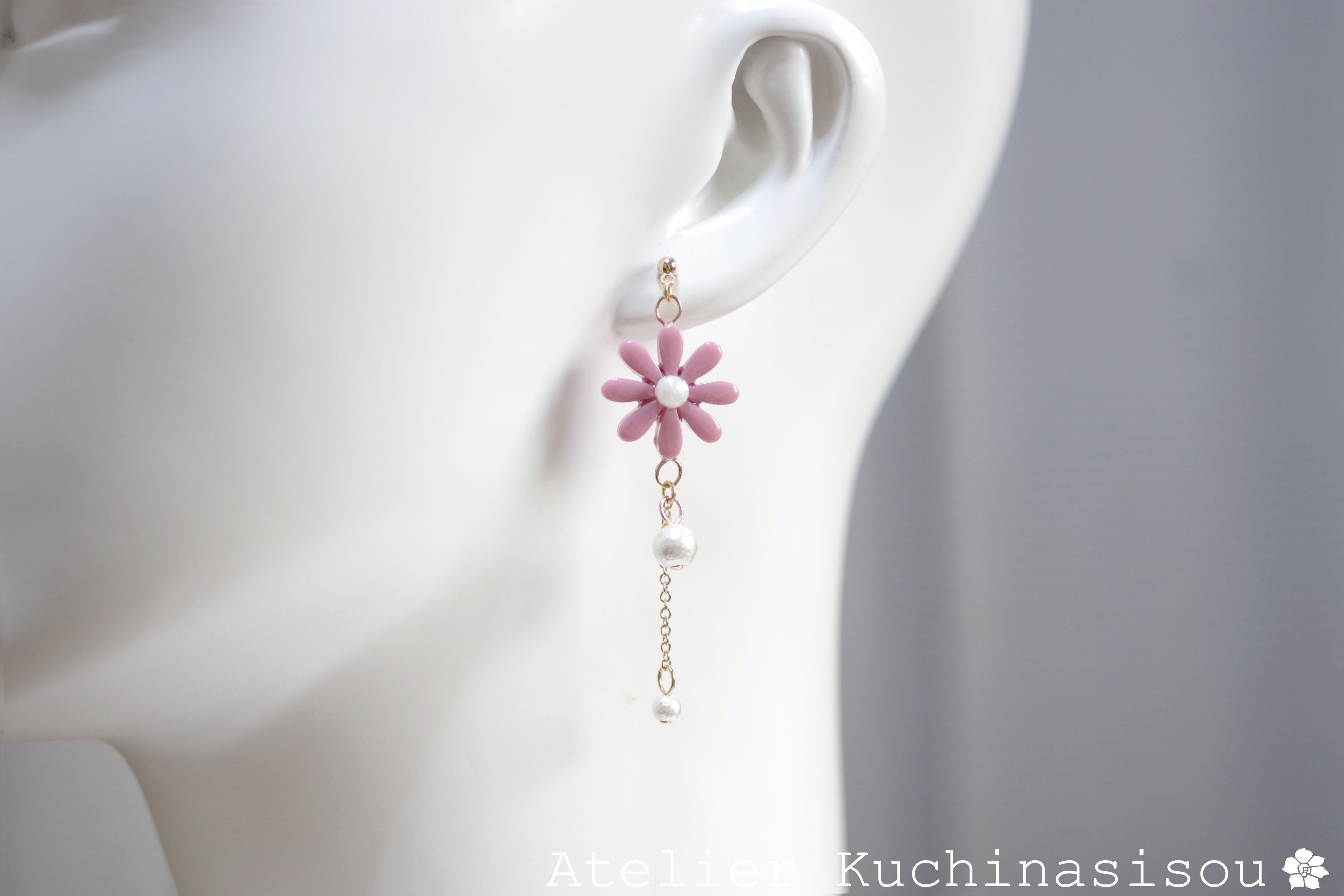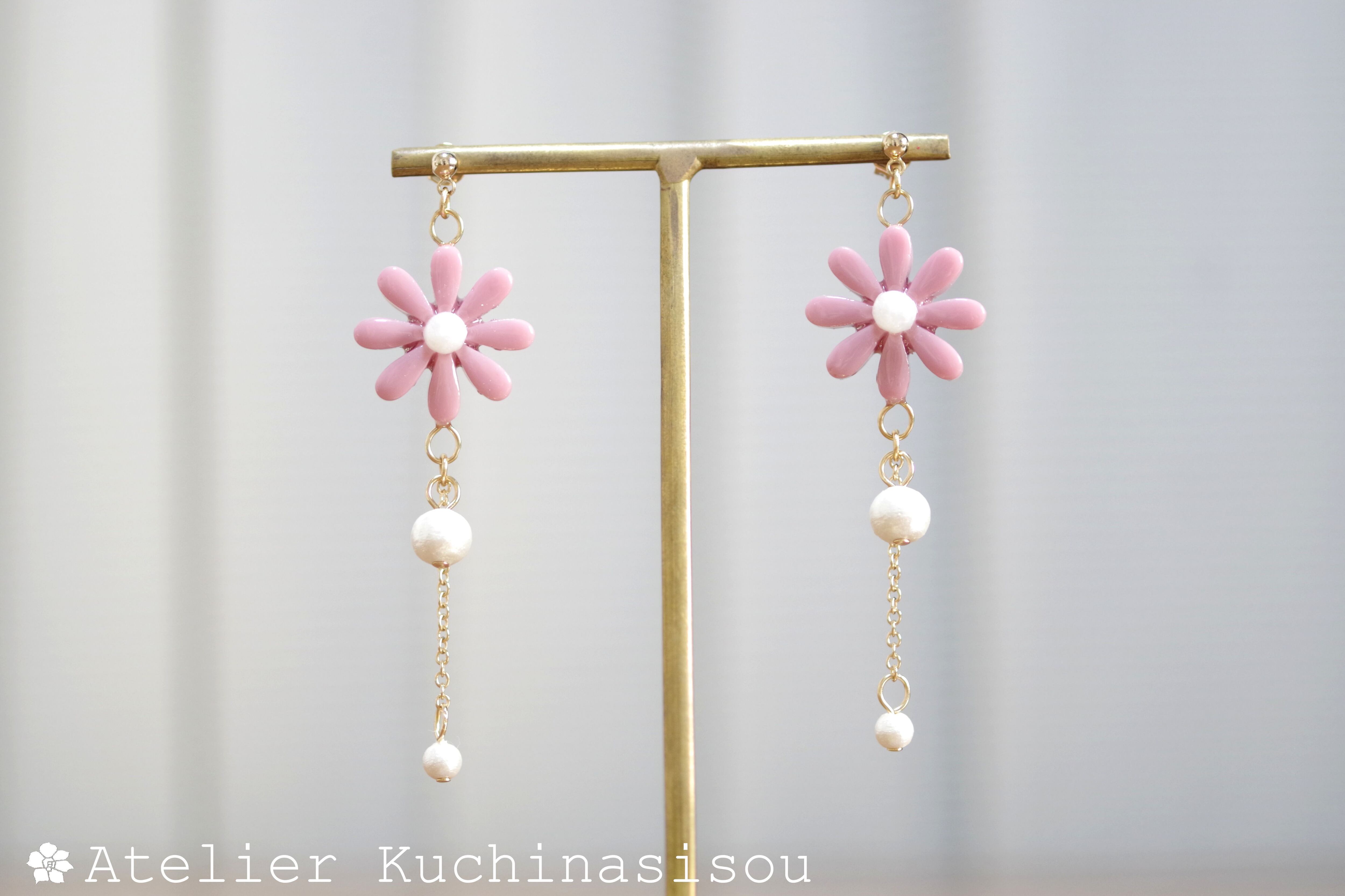 こっくりしたピンクのお花に、大小二粒のコットンパールをあしらった可憐なピアスです。