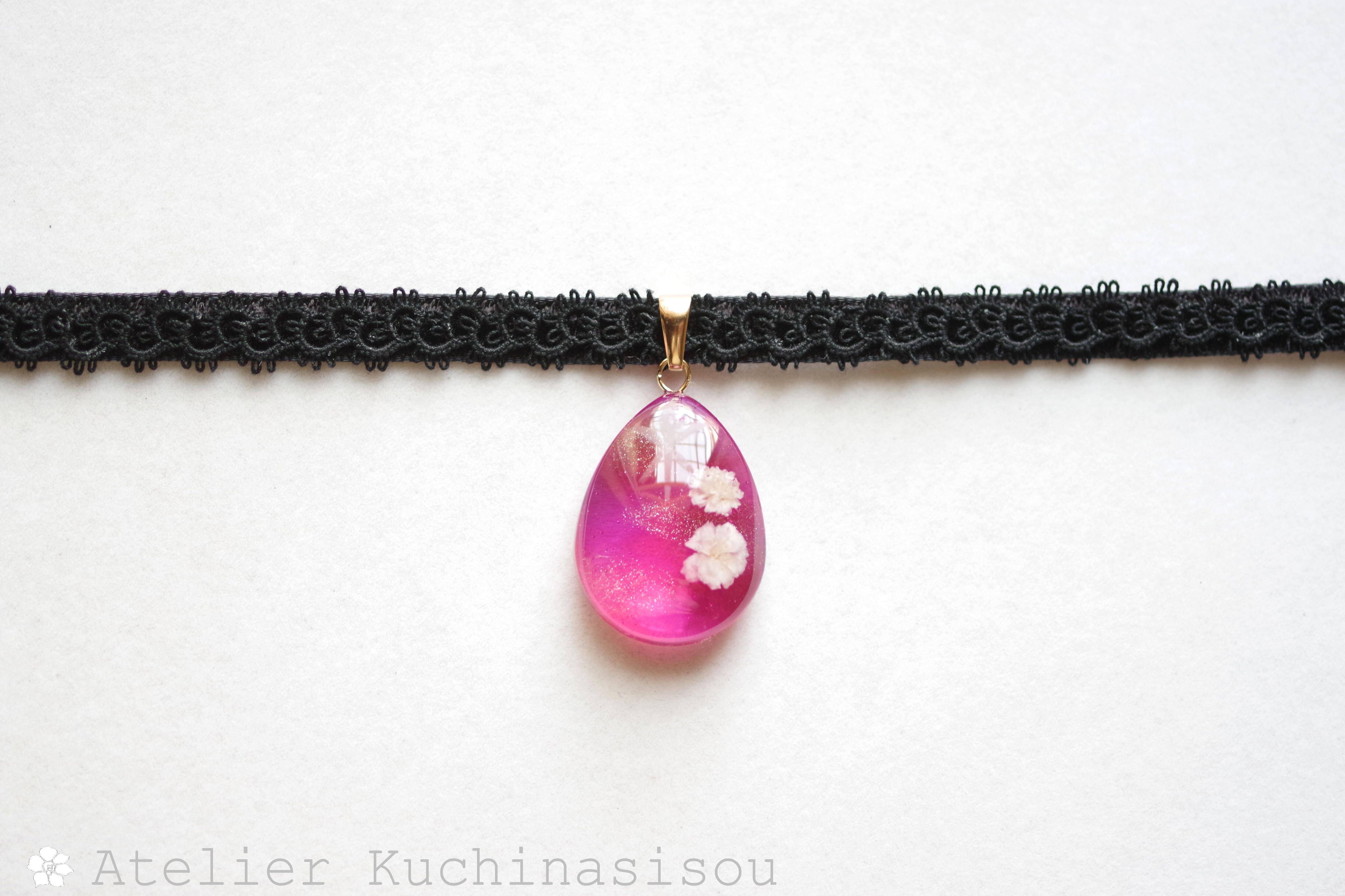 ドロップ型にお花を二輪咲かせた可憐なレジンを、ベルベットリボンにタティングレースで装飾を施したチョーカーに仕上げました。