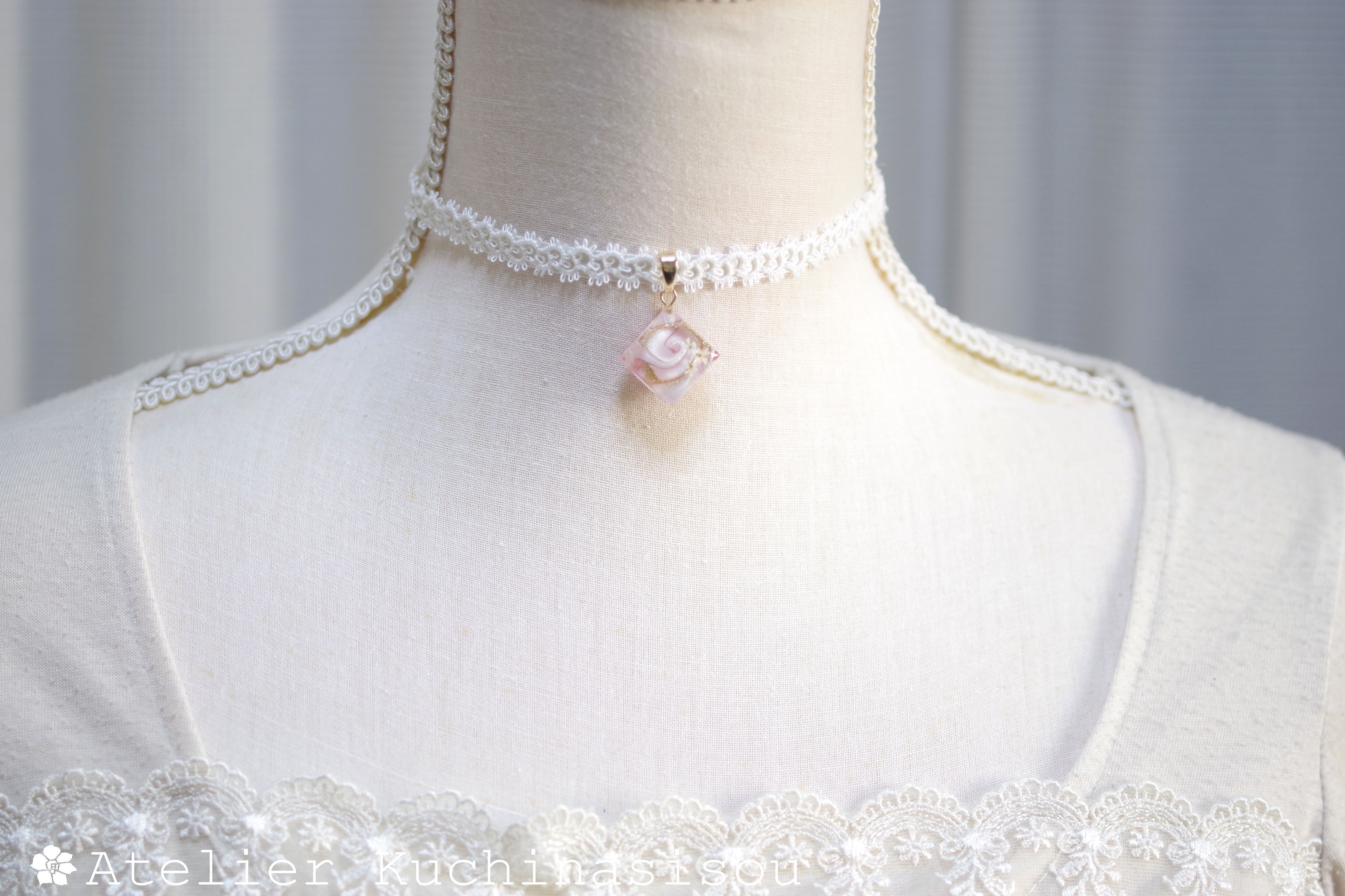【受注製作】レジンアート スクエアモチーフとタティングレースとサテンリボンのチョーカー〈兎の眼〉