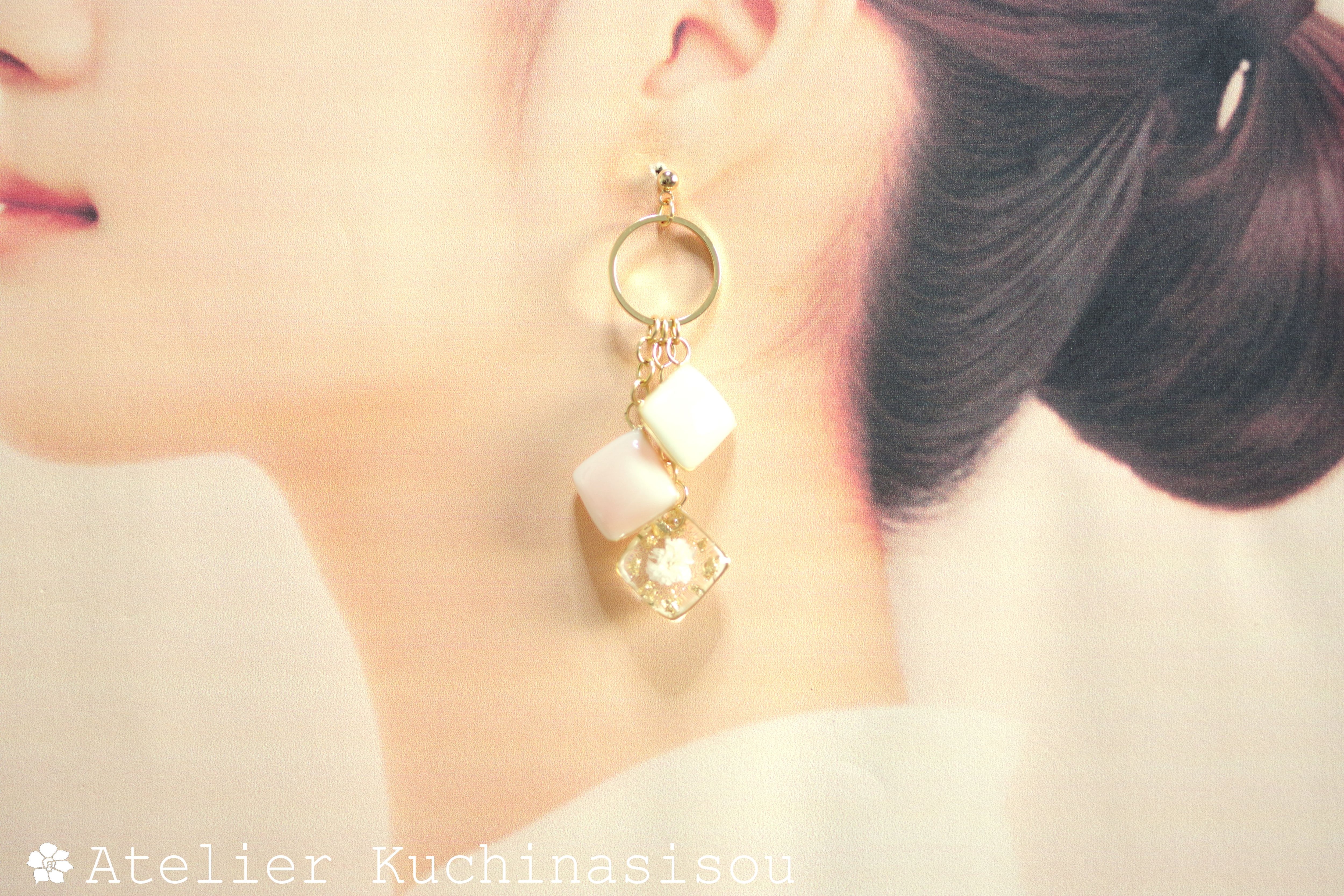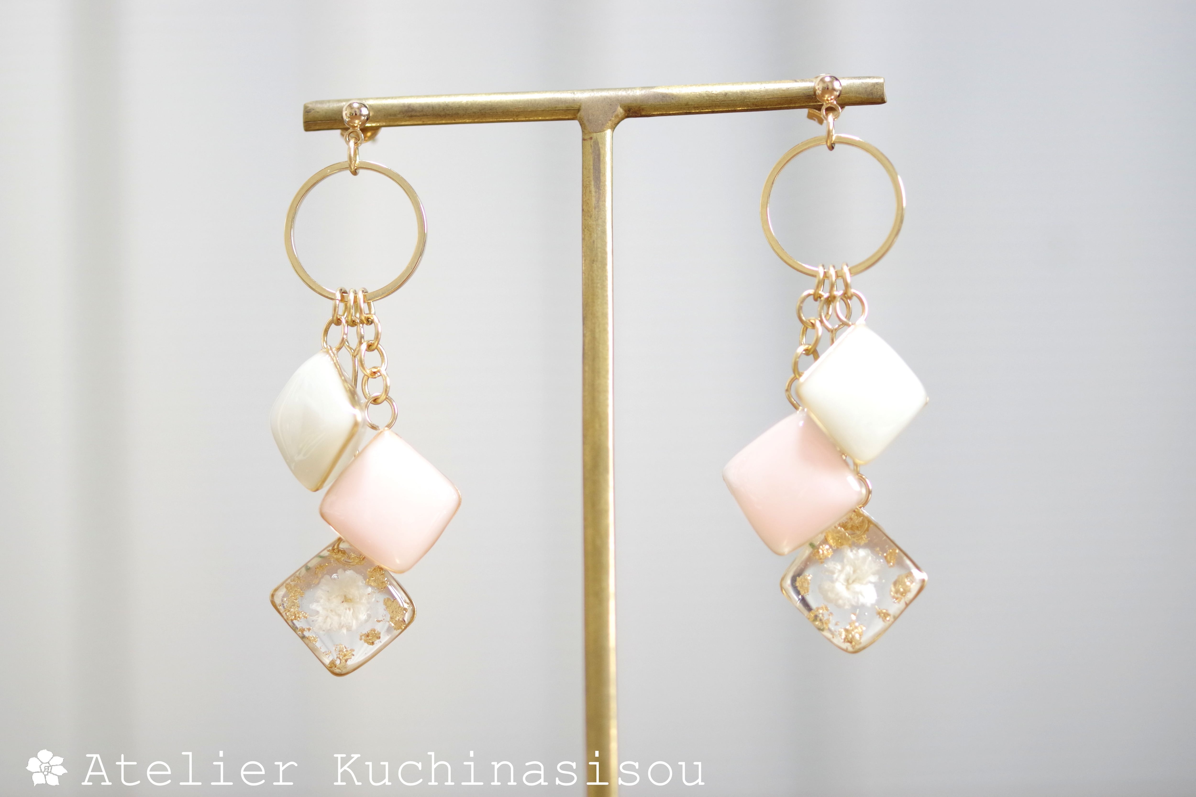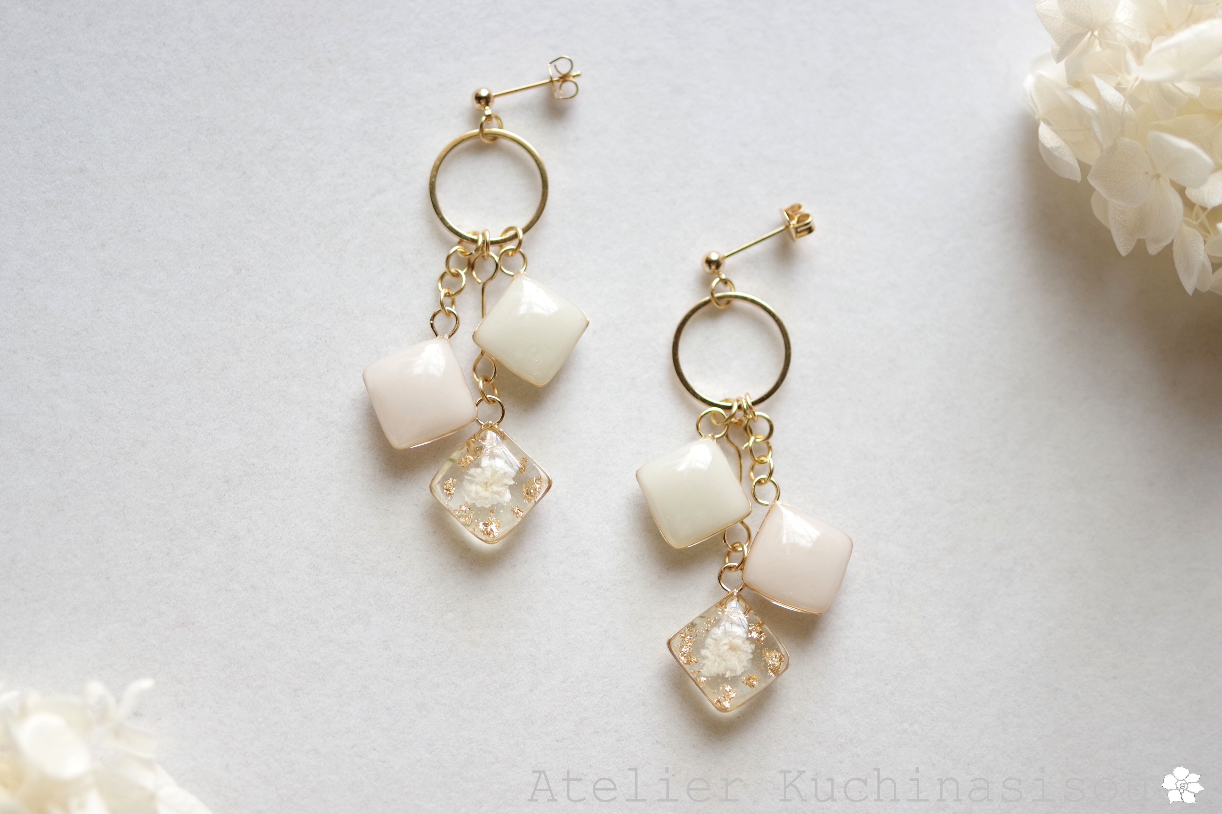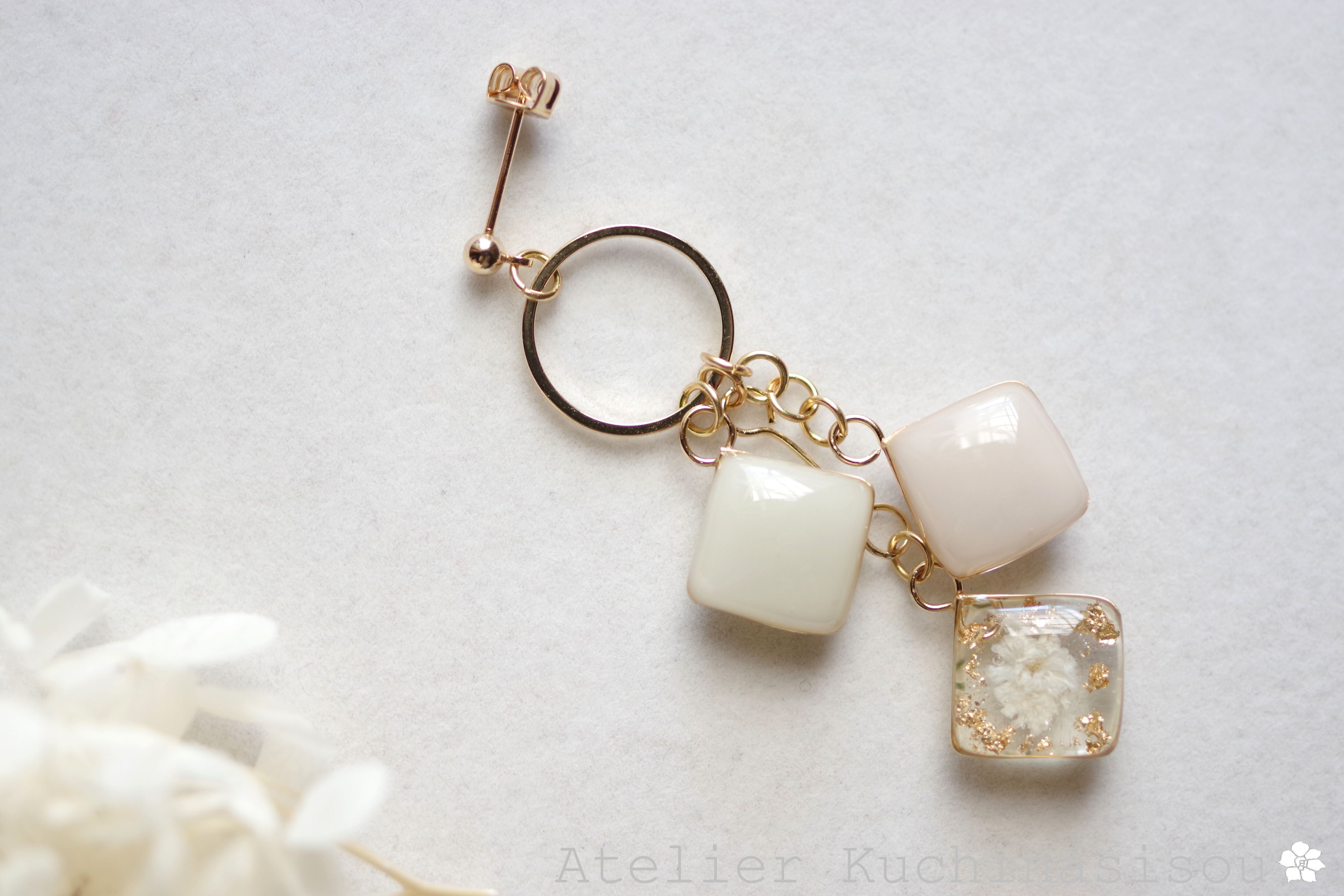 レジンアート スクエアモチーフとリングパーツのピアス〈淡い夢〉