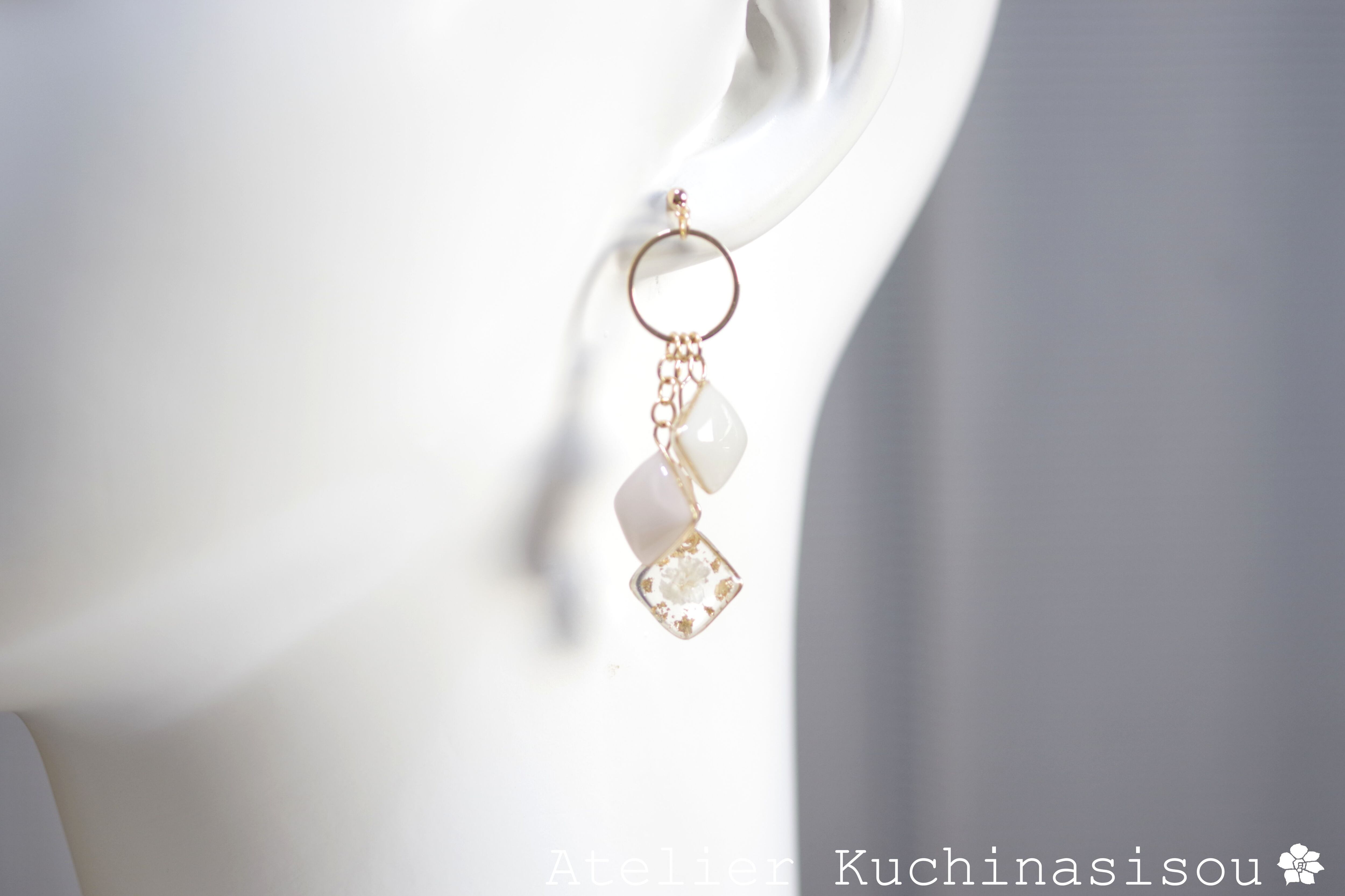 一つはベージュ、一つはピンク、そして三つ目にはお花と金箔を封じ込めたスクエアパーツを作り、リングパーツに吊るしました。
