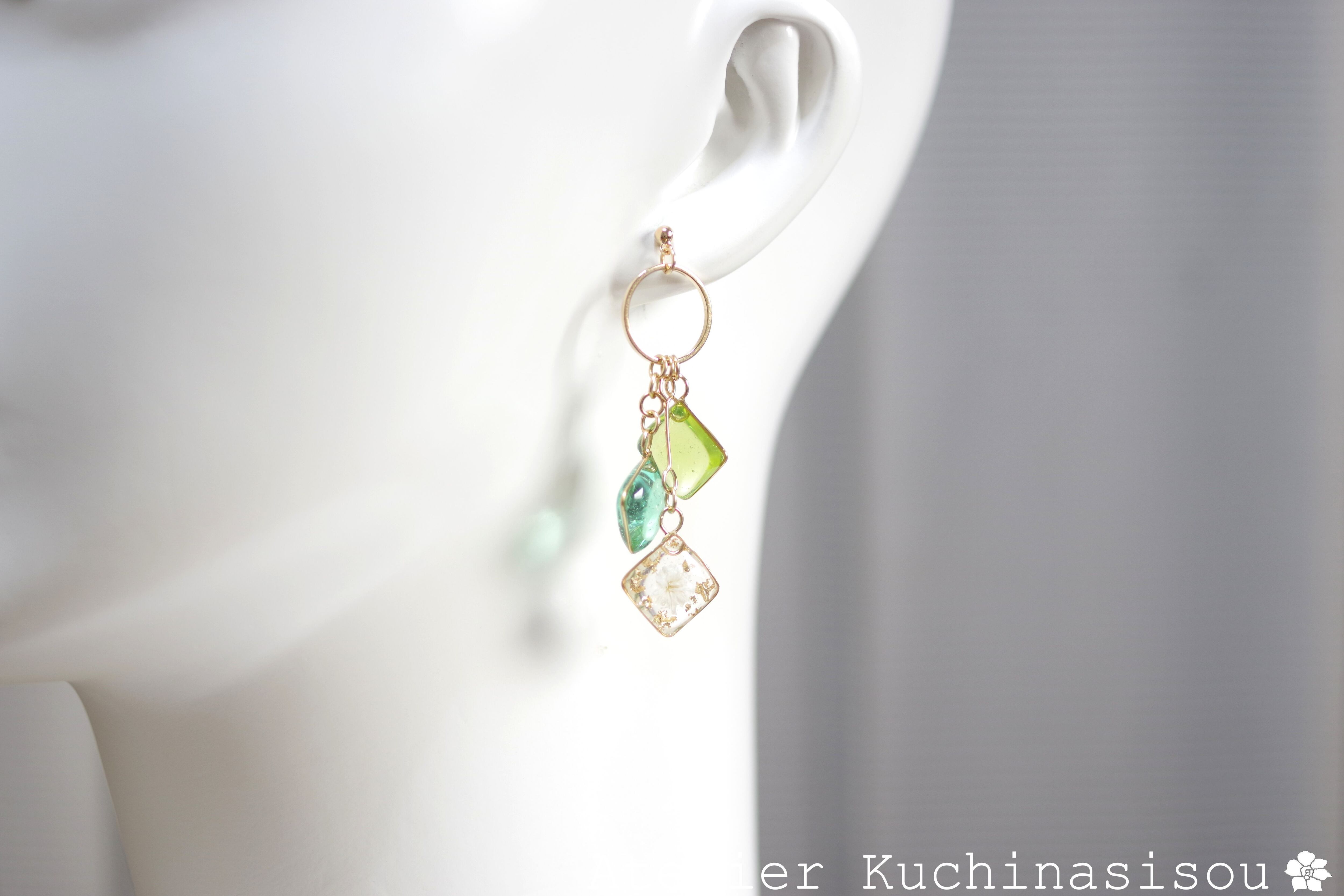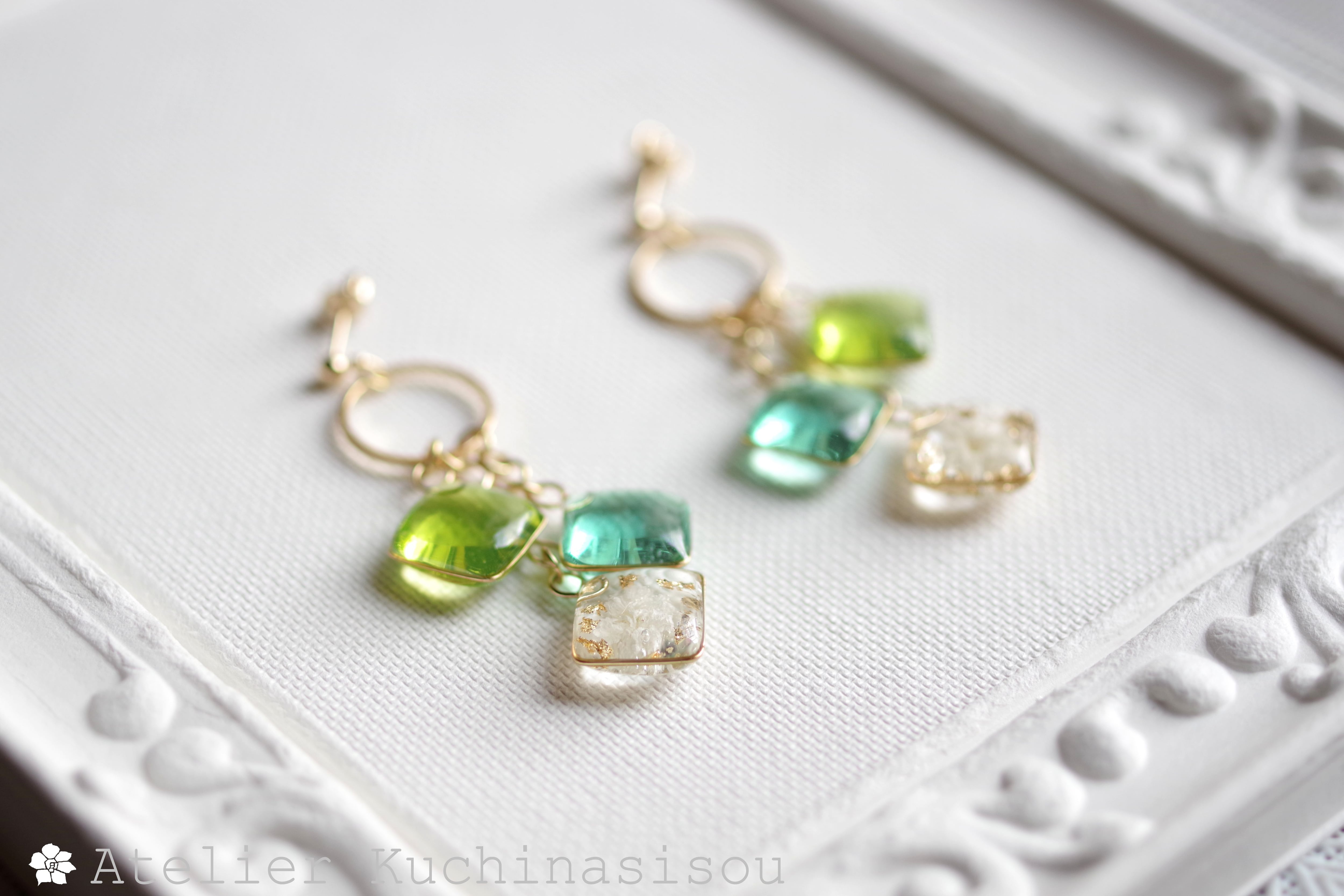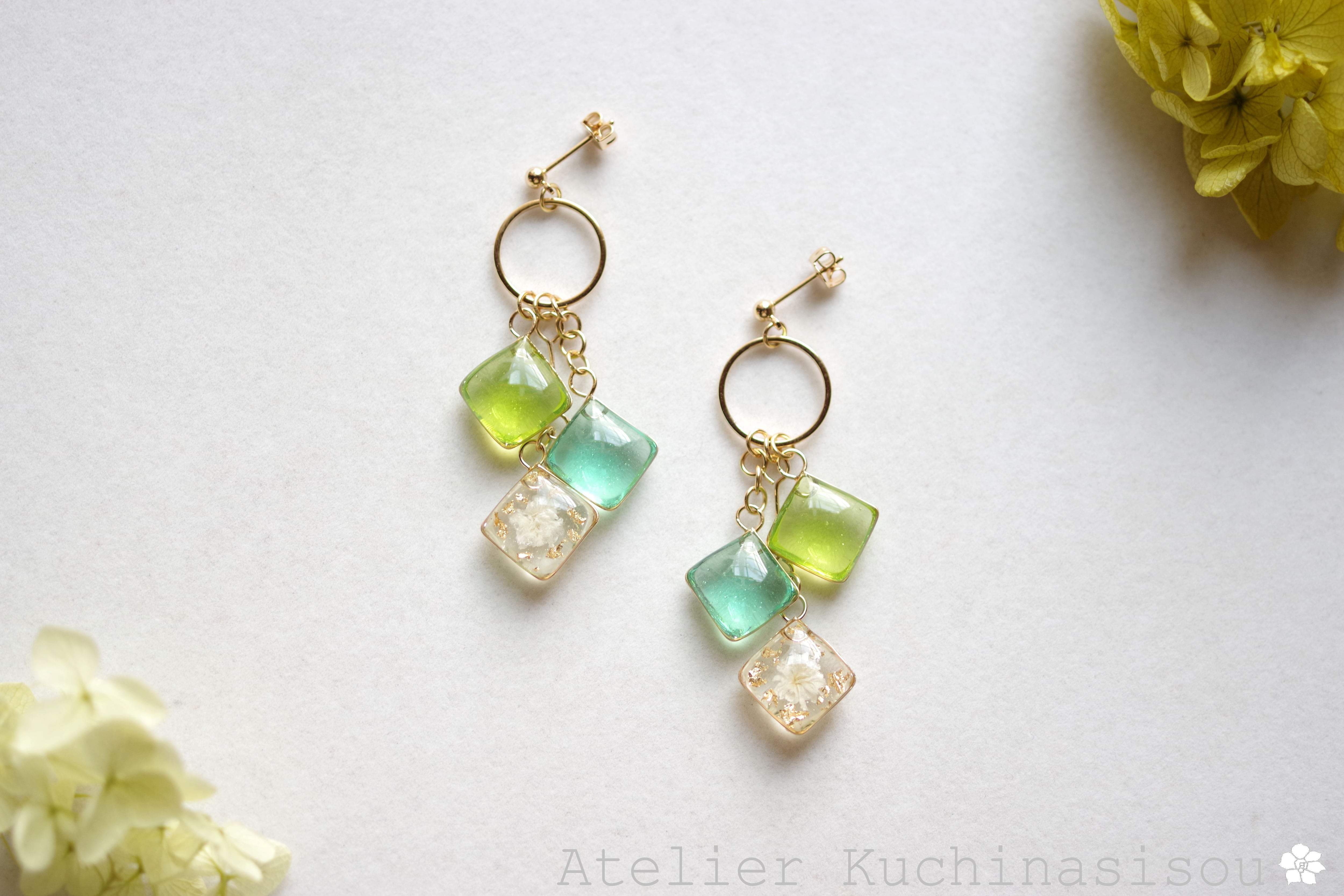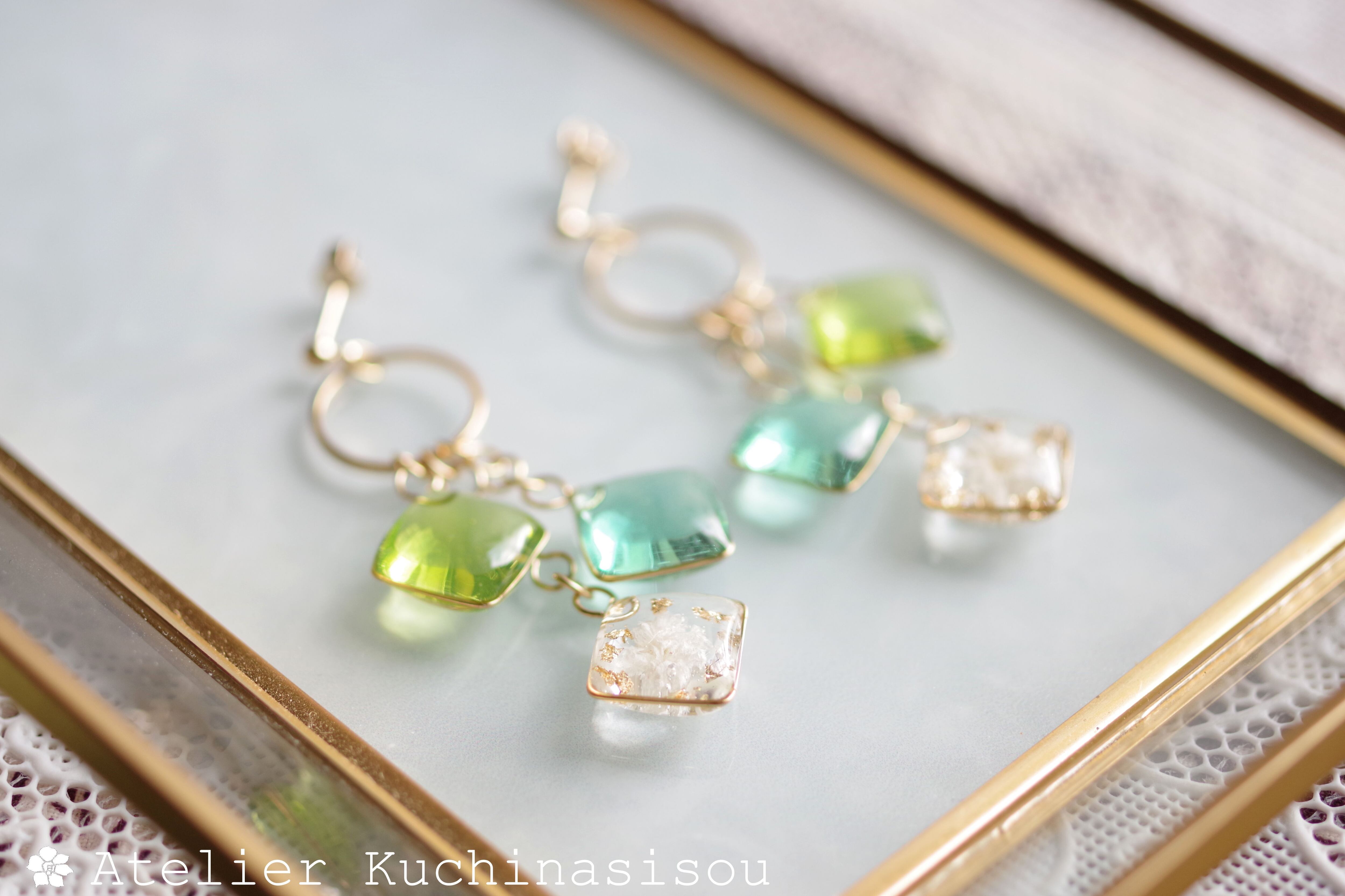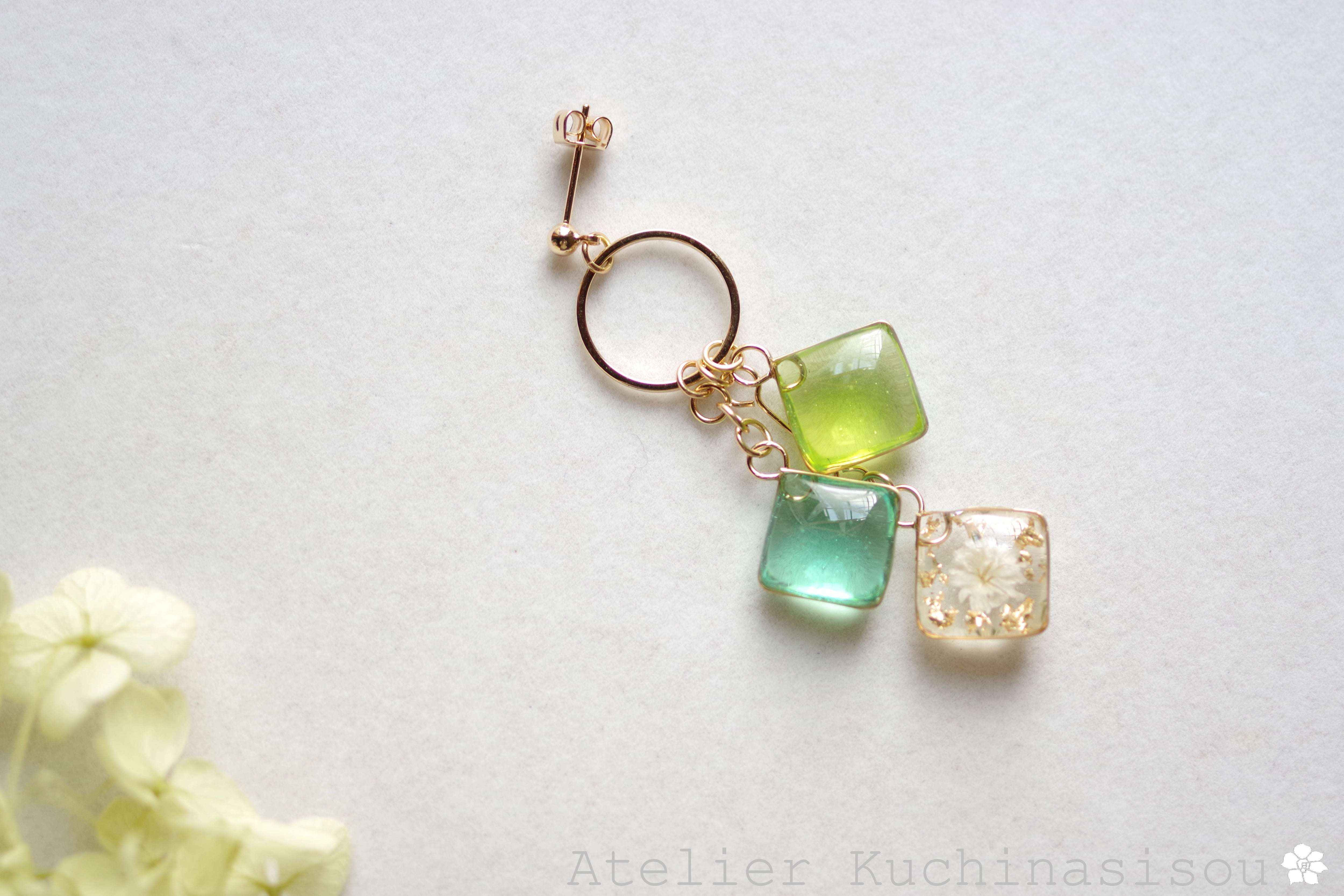 レジンアート スクエアモチーフとリングパーツのピアス〈萌えいづる緑〉