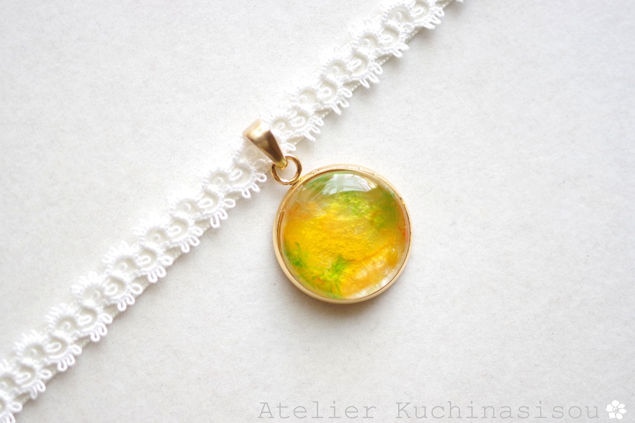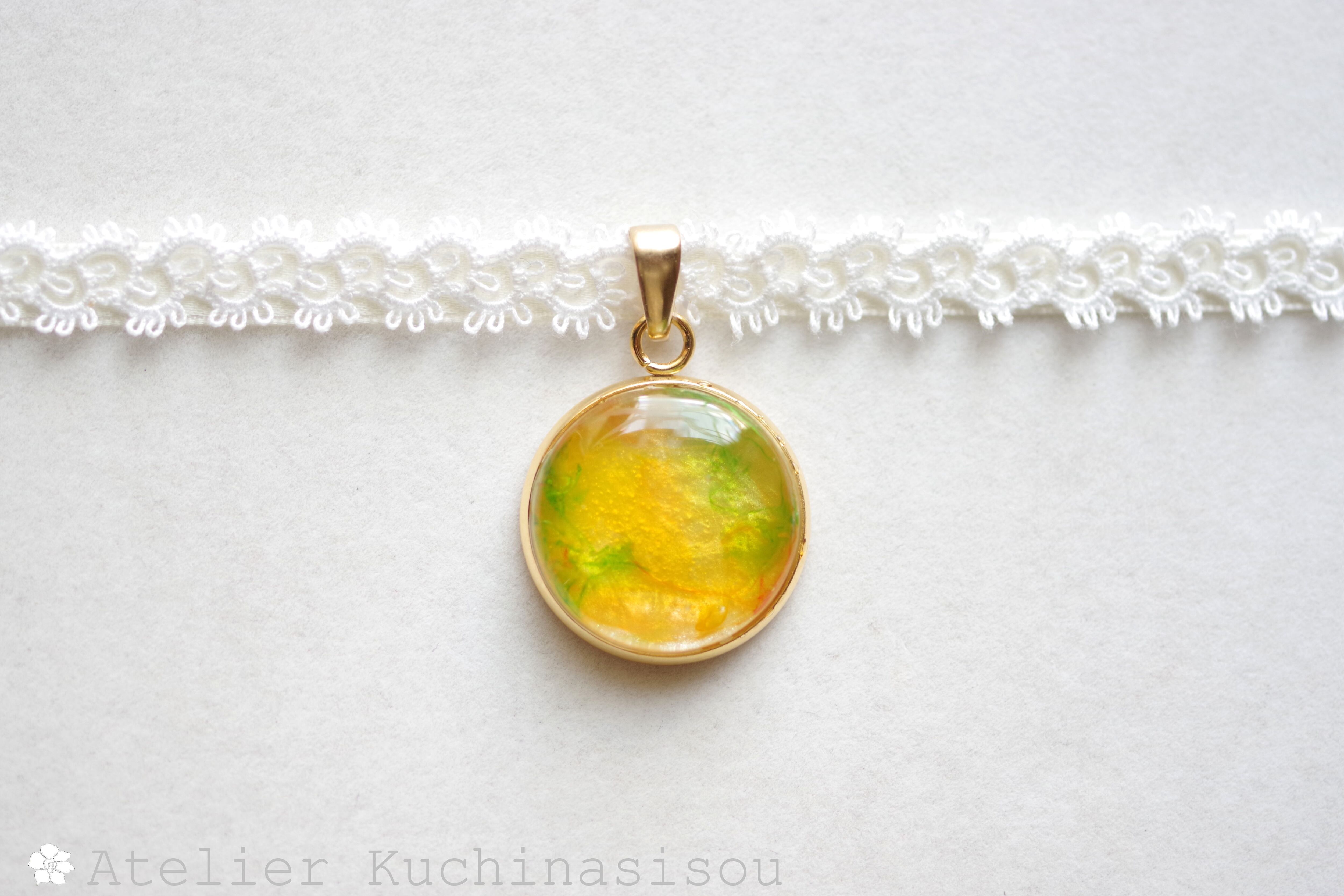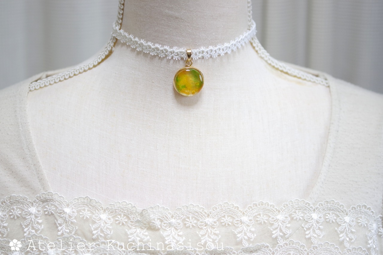 ミモザをイメージしたイエローとグリーンがフレッシュで元気いっぱいなカラーリングのレジンを、サテンリボンにタティングレースで装飾を施したチョーカーに仕上げました。