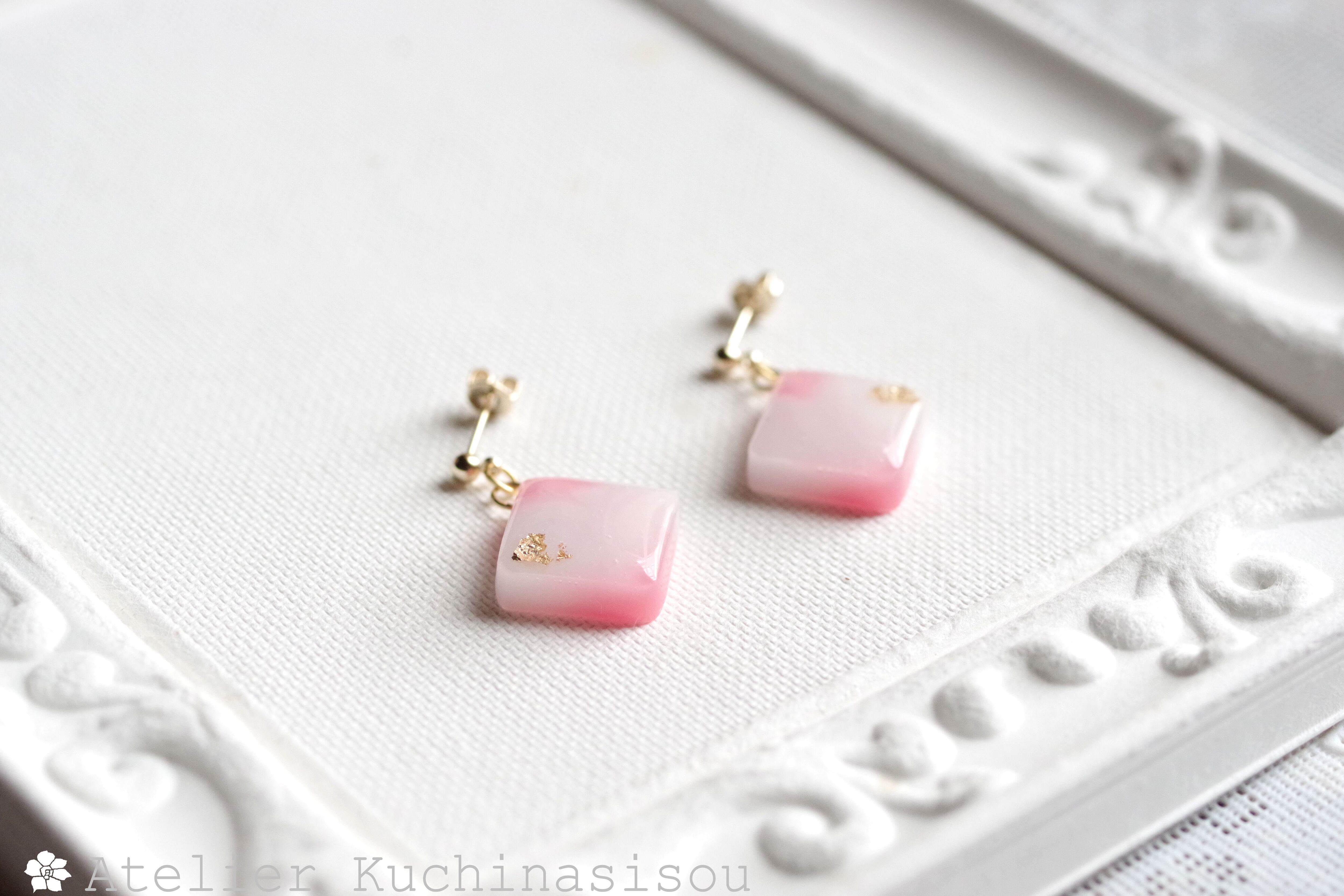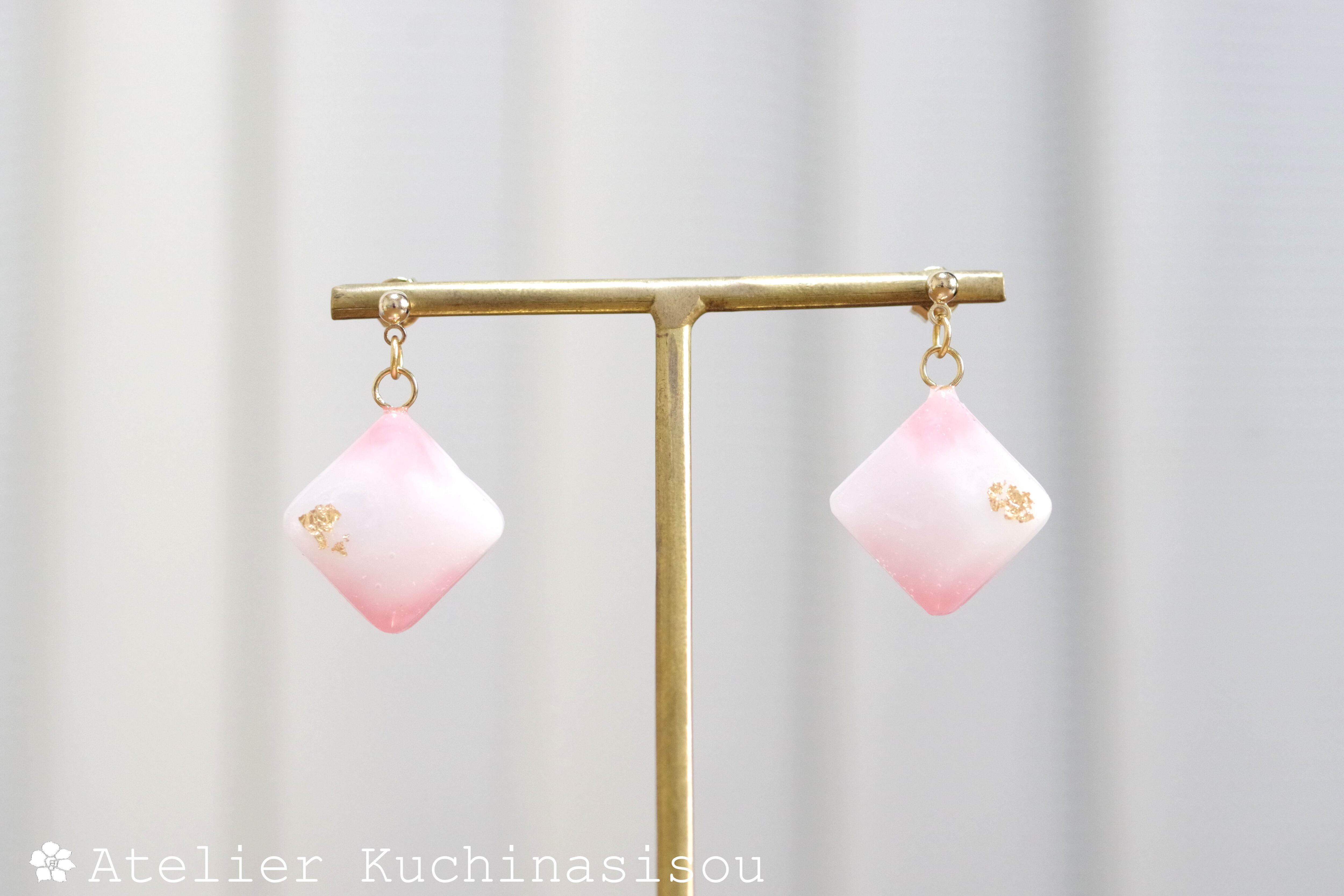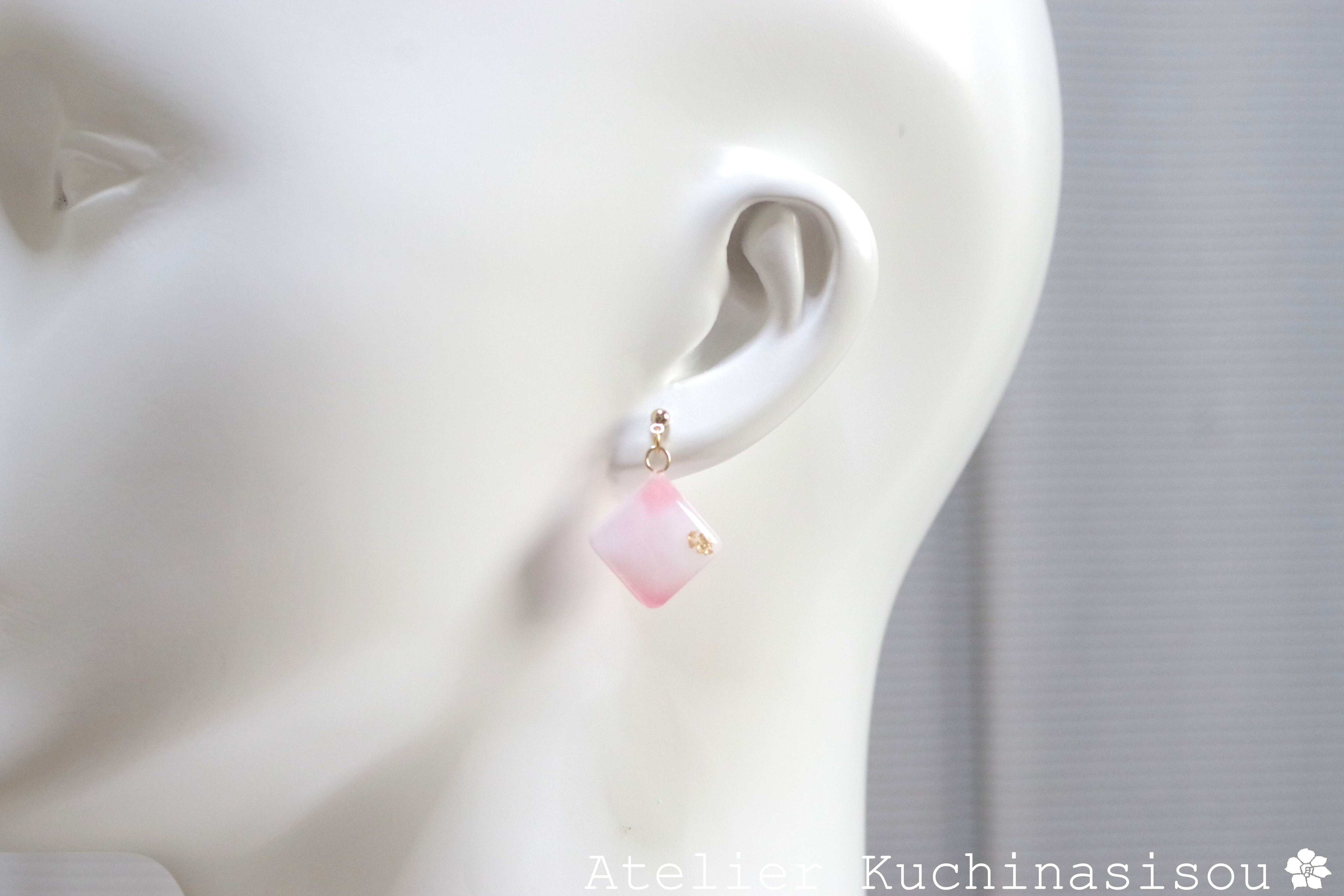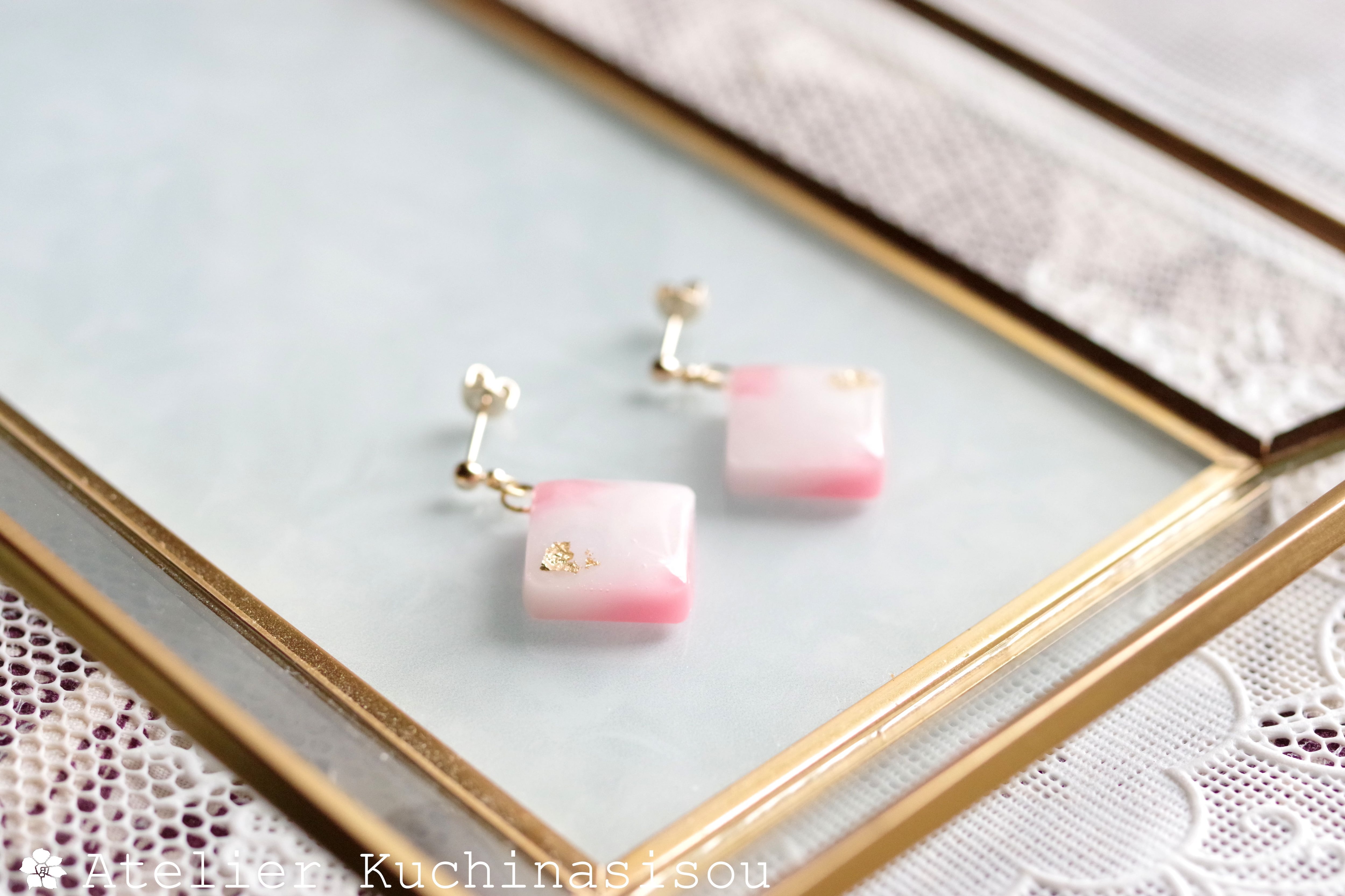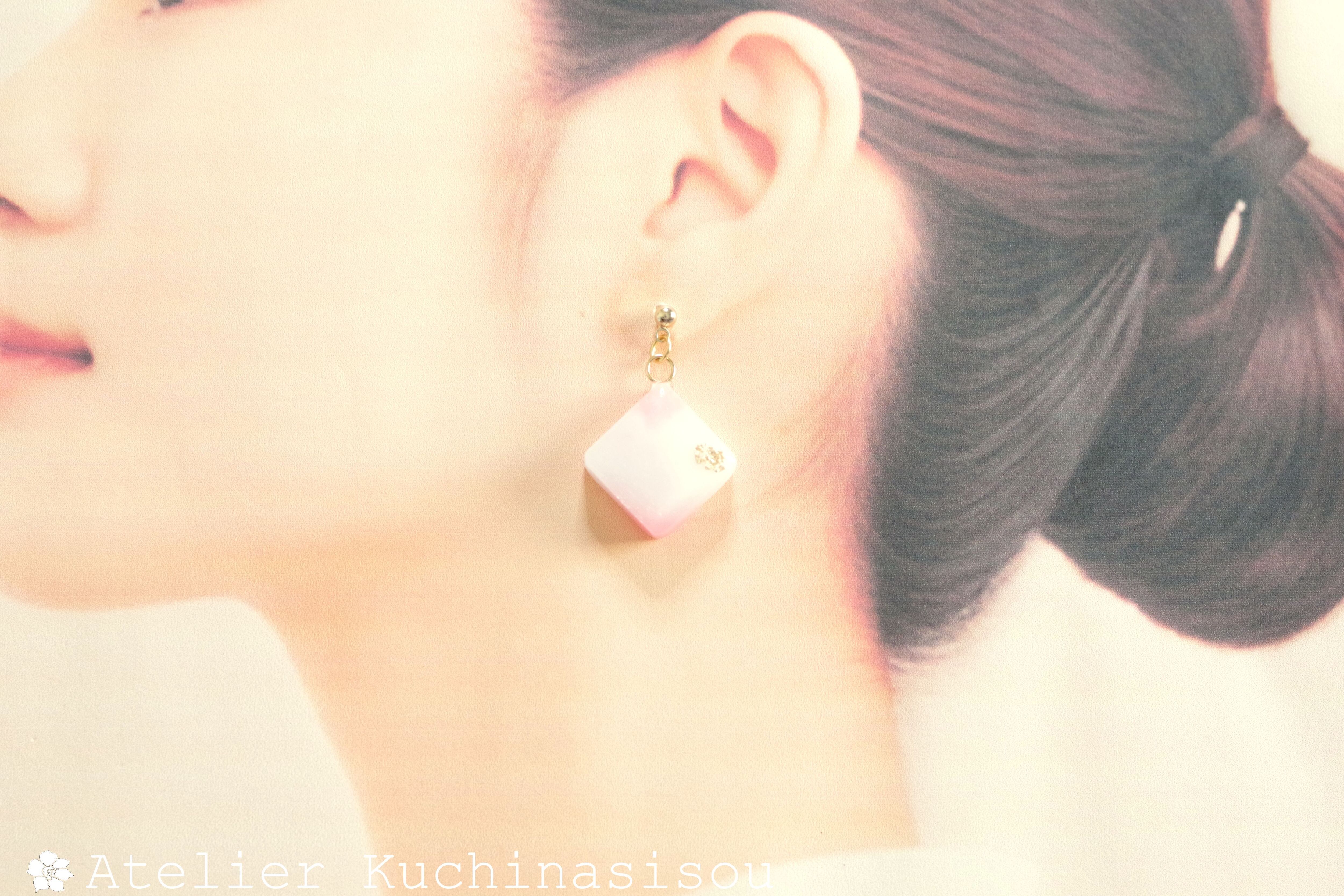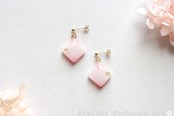 ホワイトとピンクの組み合わせが愛らしい、シャープなフォルムの中にも可憐さをのぞかせるピアス。