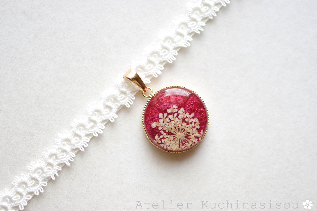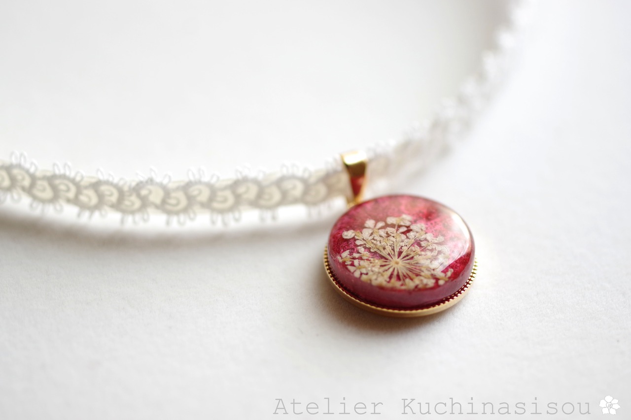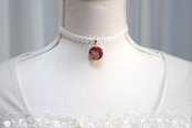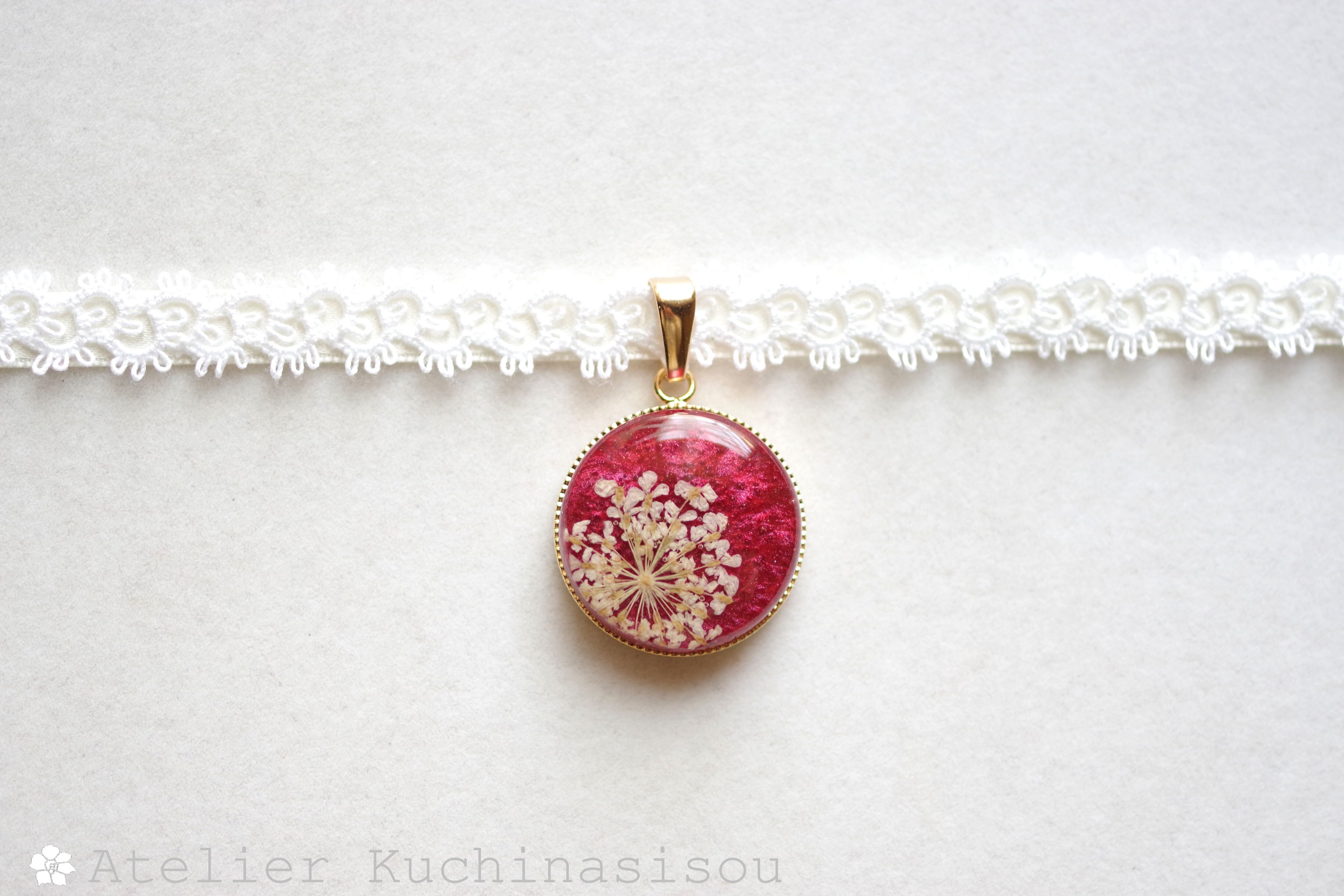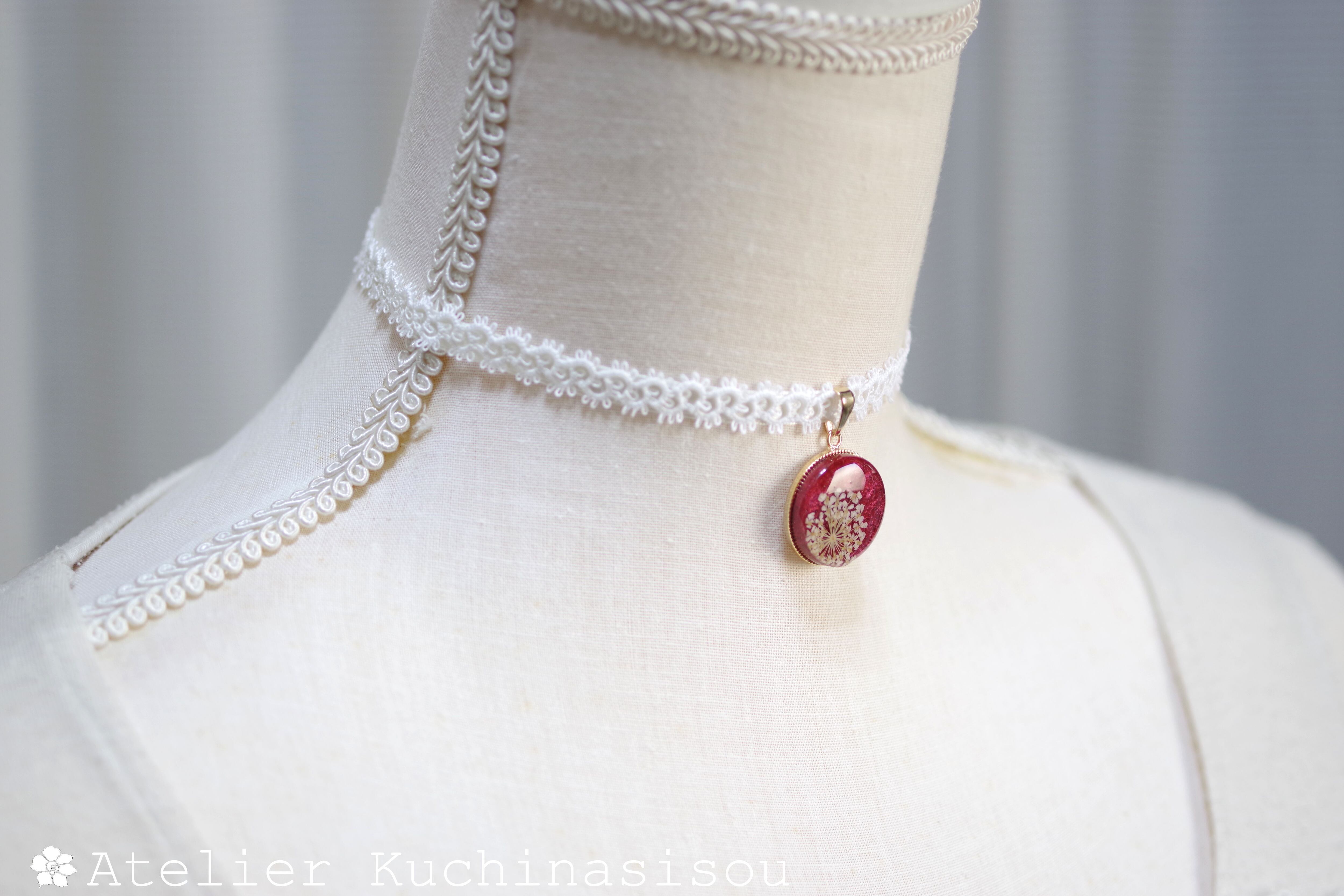 光沢のあるルビーレッドに白いレースフラワーをあしらった、華やかで大人っぽいレジンを、サテンリボンにタティングレースで装飾を施したチョーカーに仕上げました。