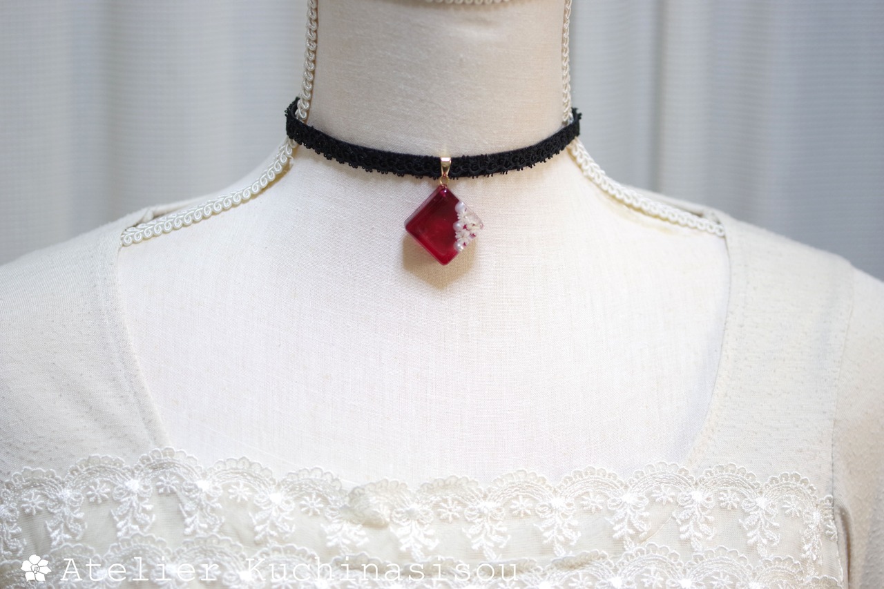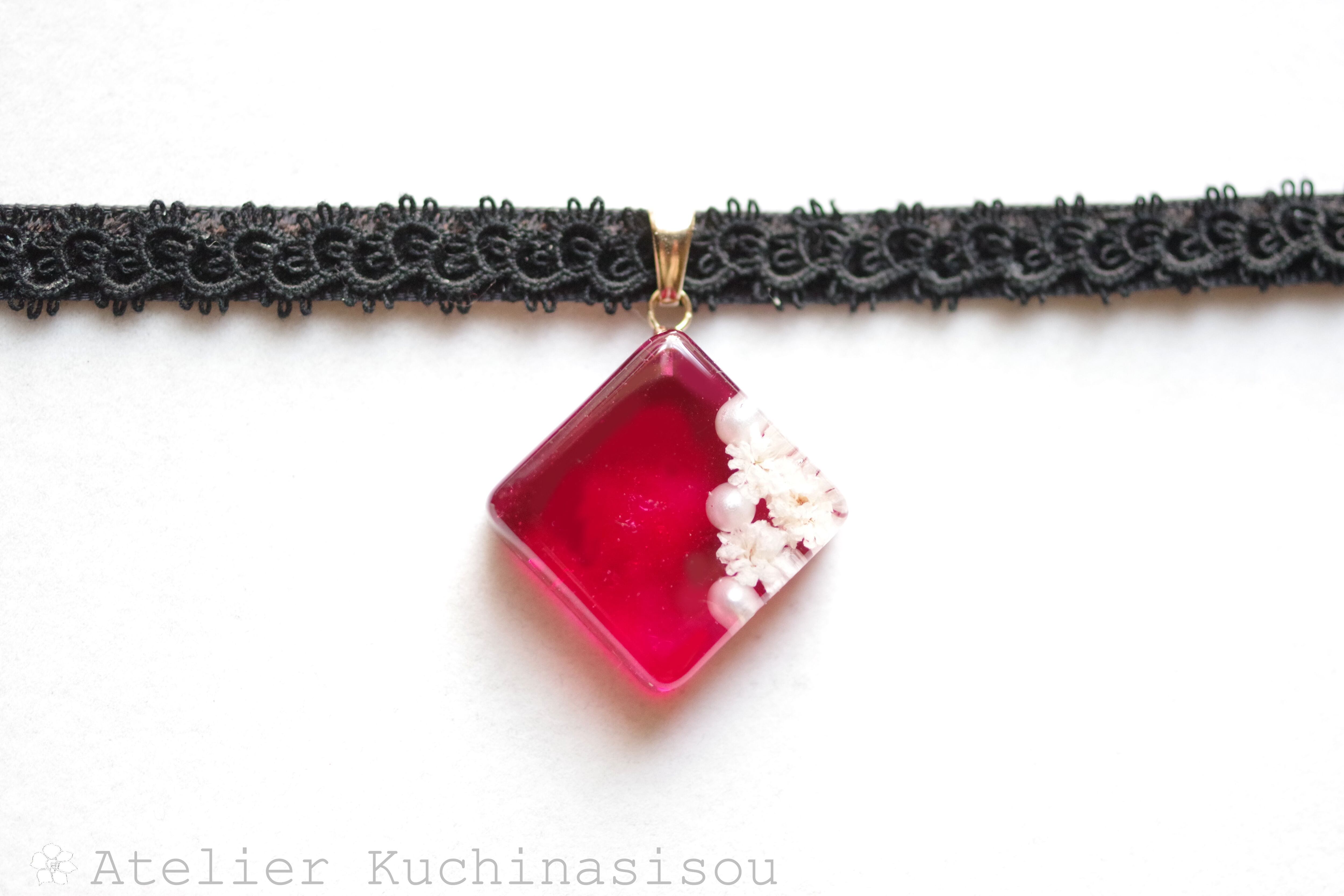 パールとお花をスクエア型に封じ込め、ピンクで着色したレジンを、ベルベットリボンにタティングレースで装飾を施したチョーカーに仕上げました。