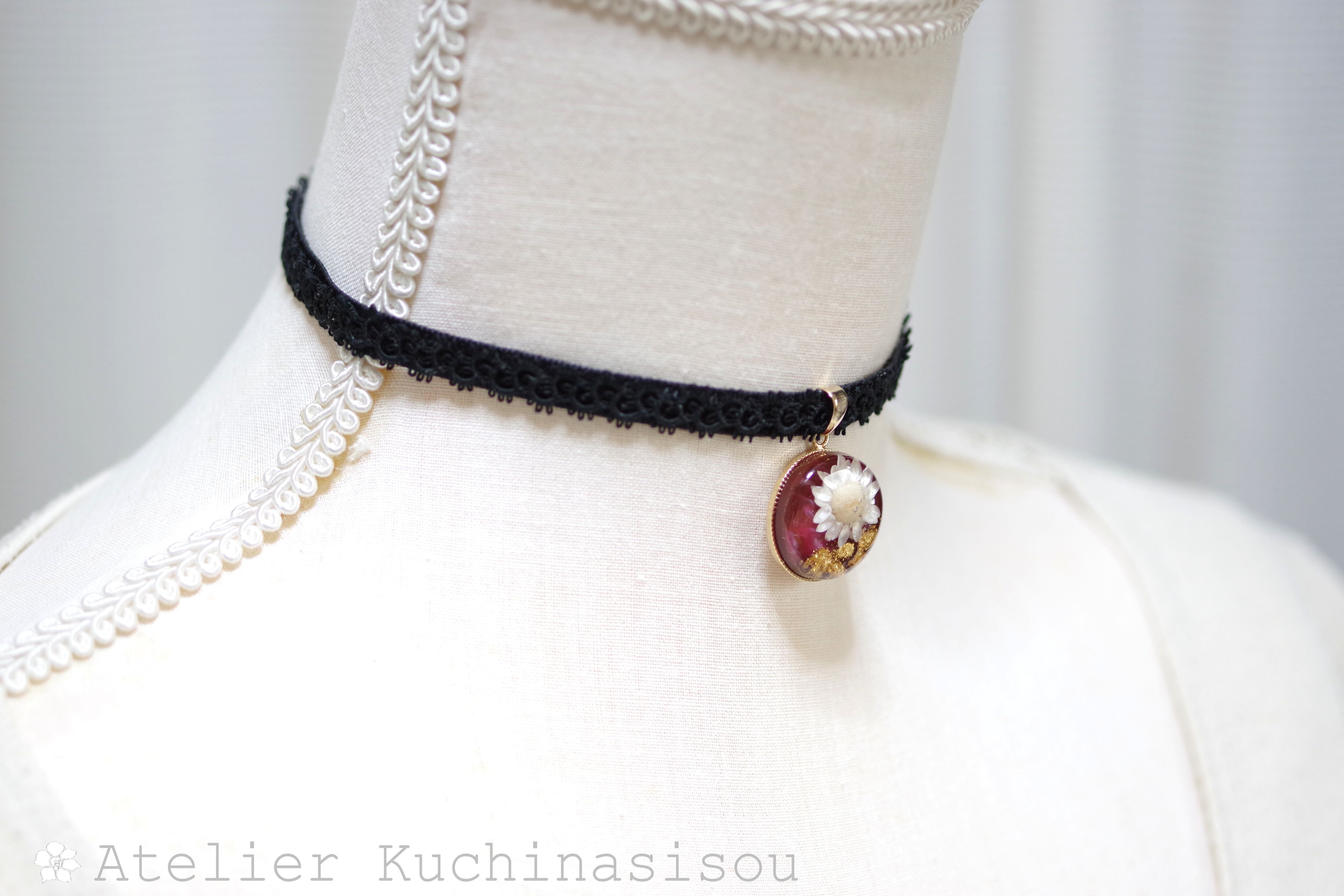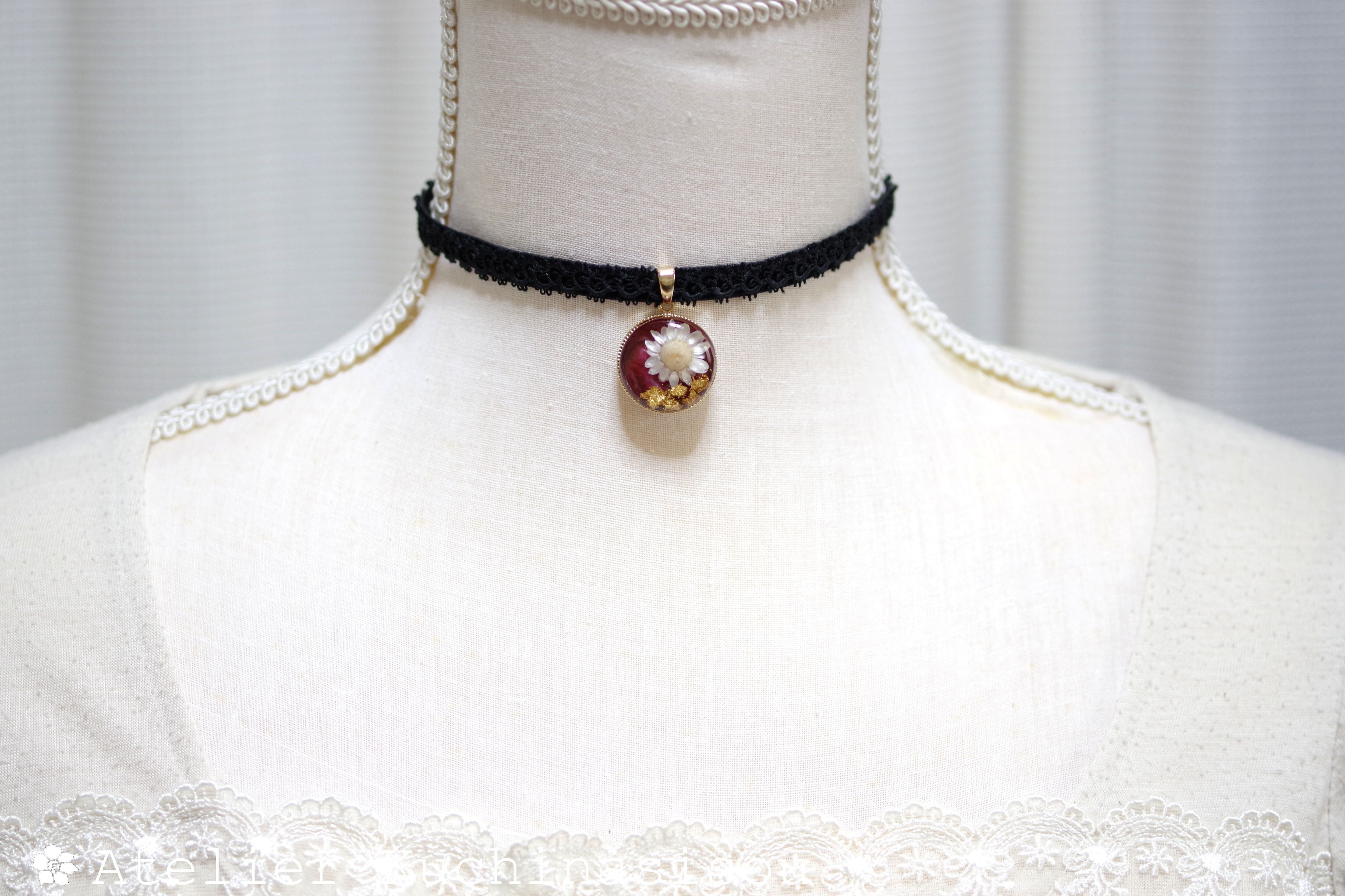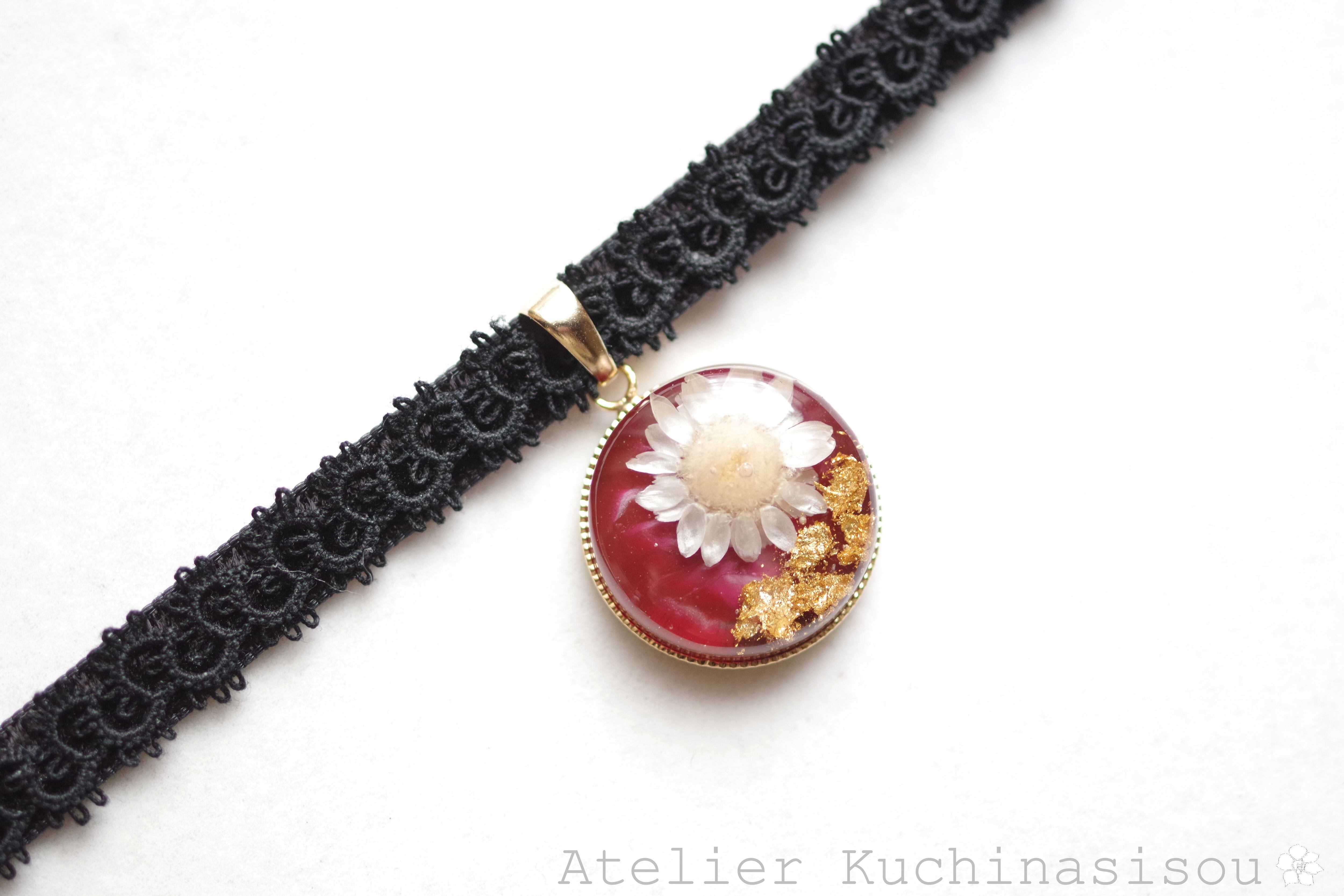 深いボルドーの背景に大胆にお花一輪を咲かせ、金箔を添えた豪奢な印象のレジンを、ベルベットリボンにタティングレースで装飾を施したチョーカーに仕上げました。