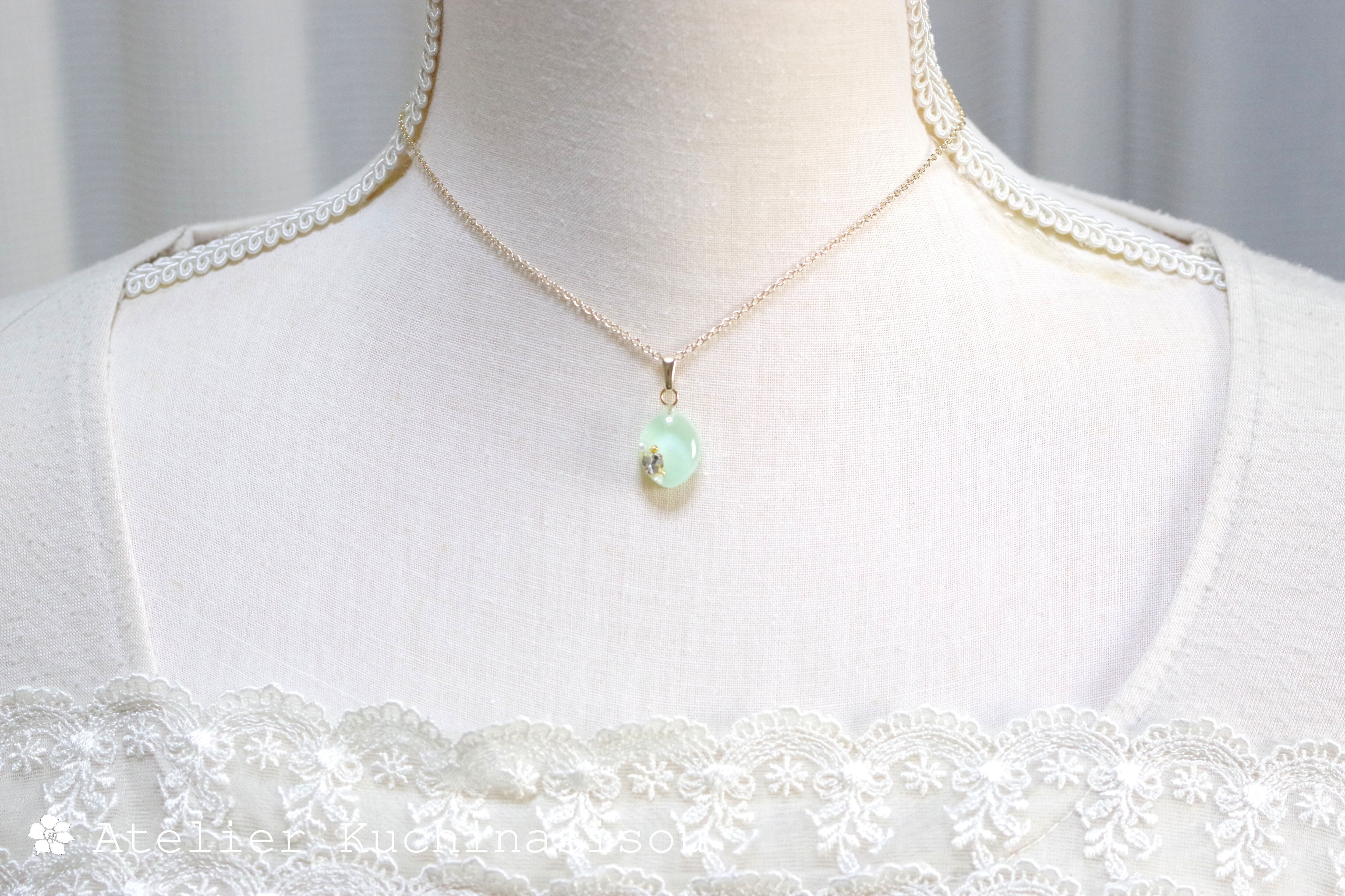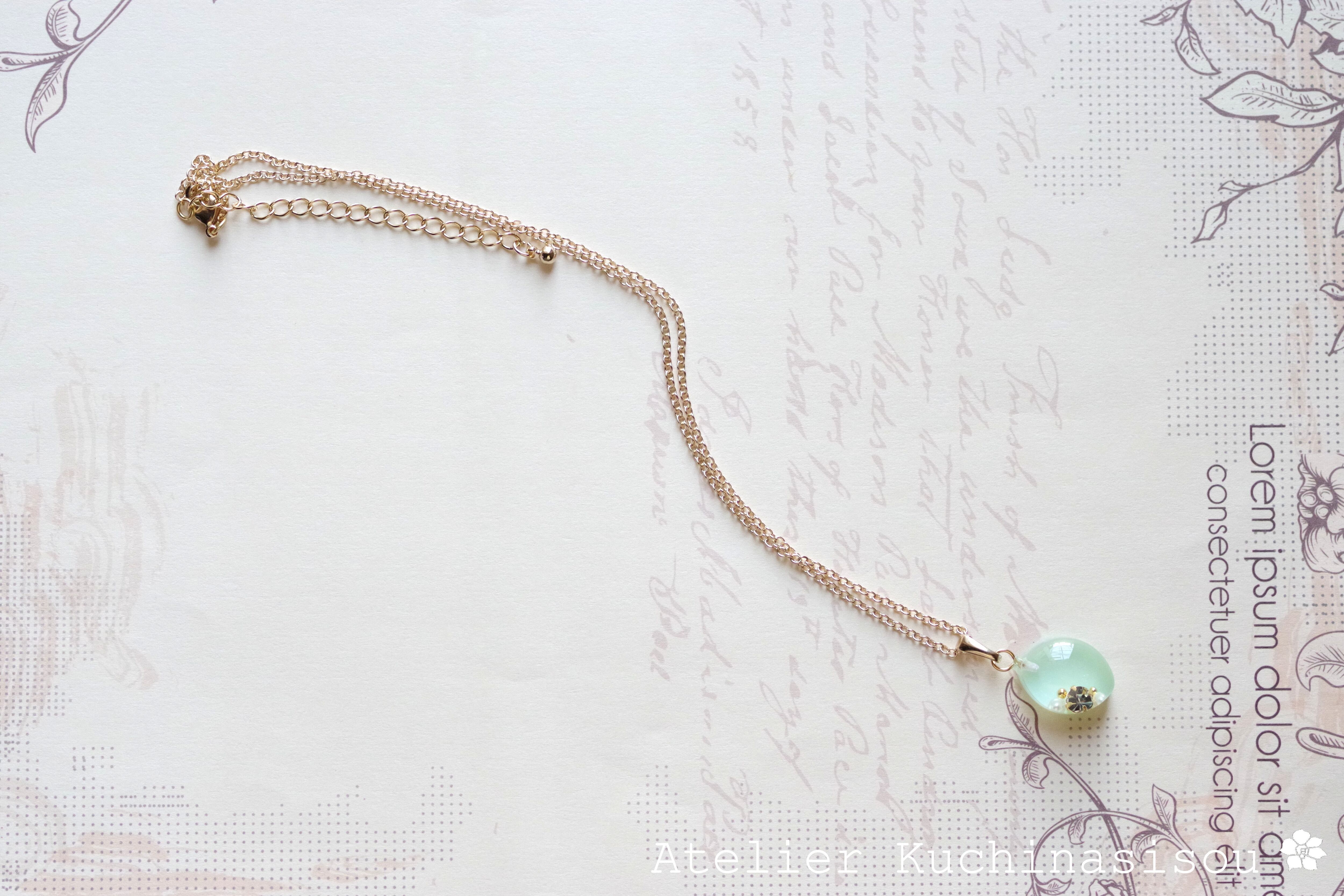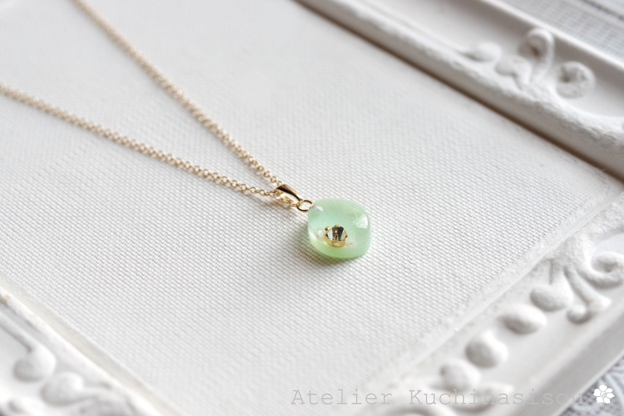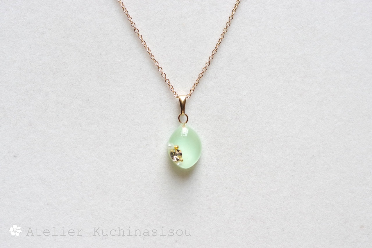 優しいグリーンのマーキス型のレジンにスワロフスキーを一粒とパール、ブリオンをあしらい、愛らしくも上品なペンダントに仕上げました。