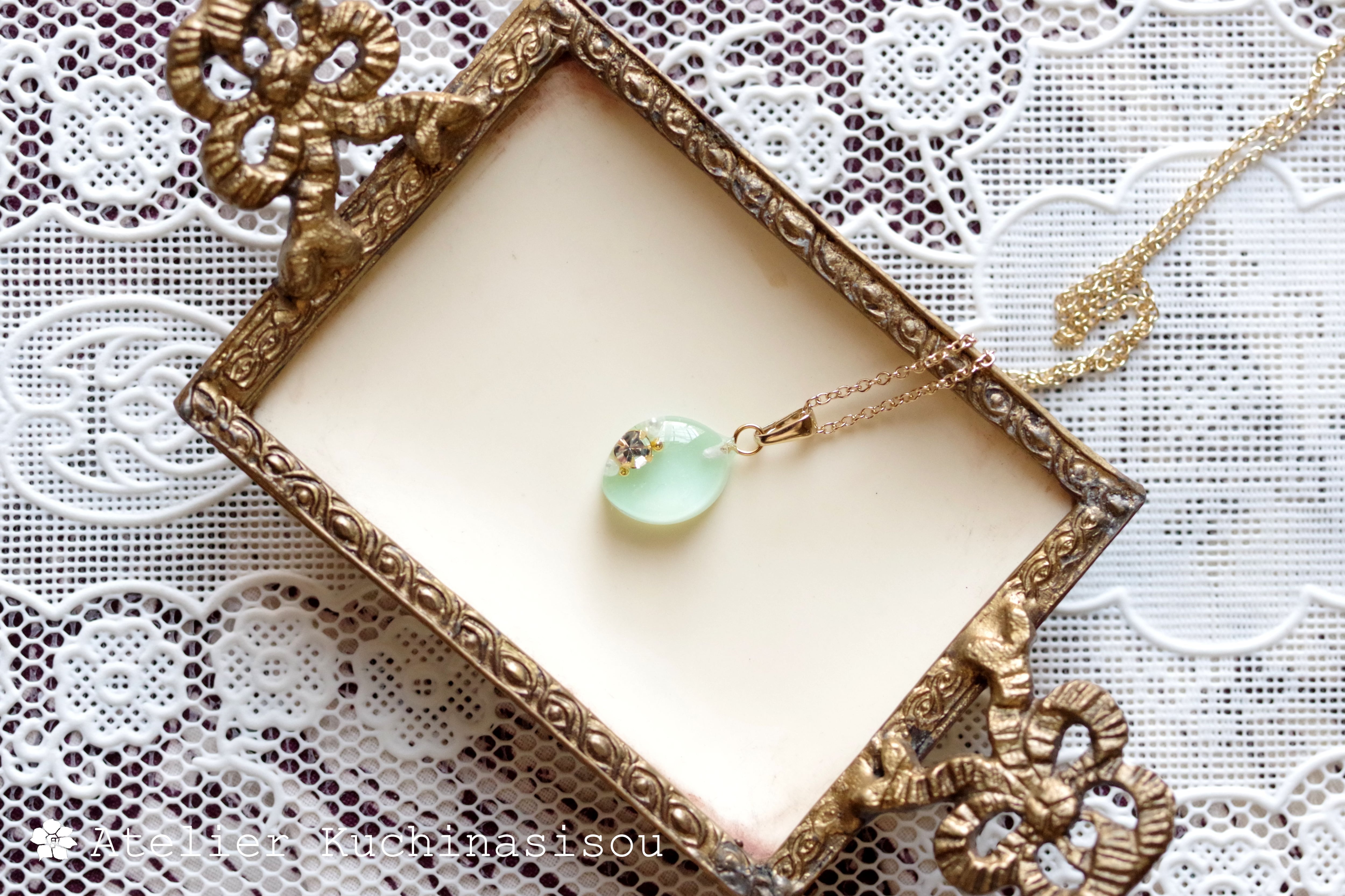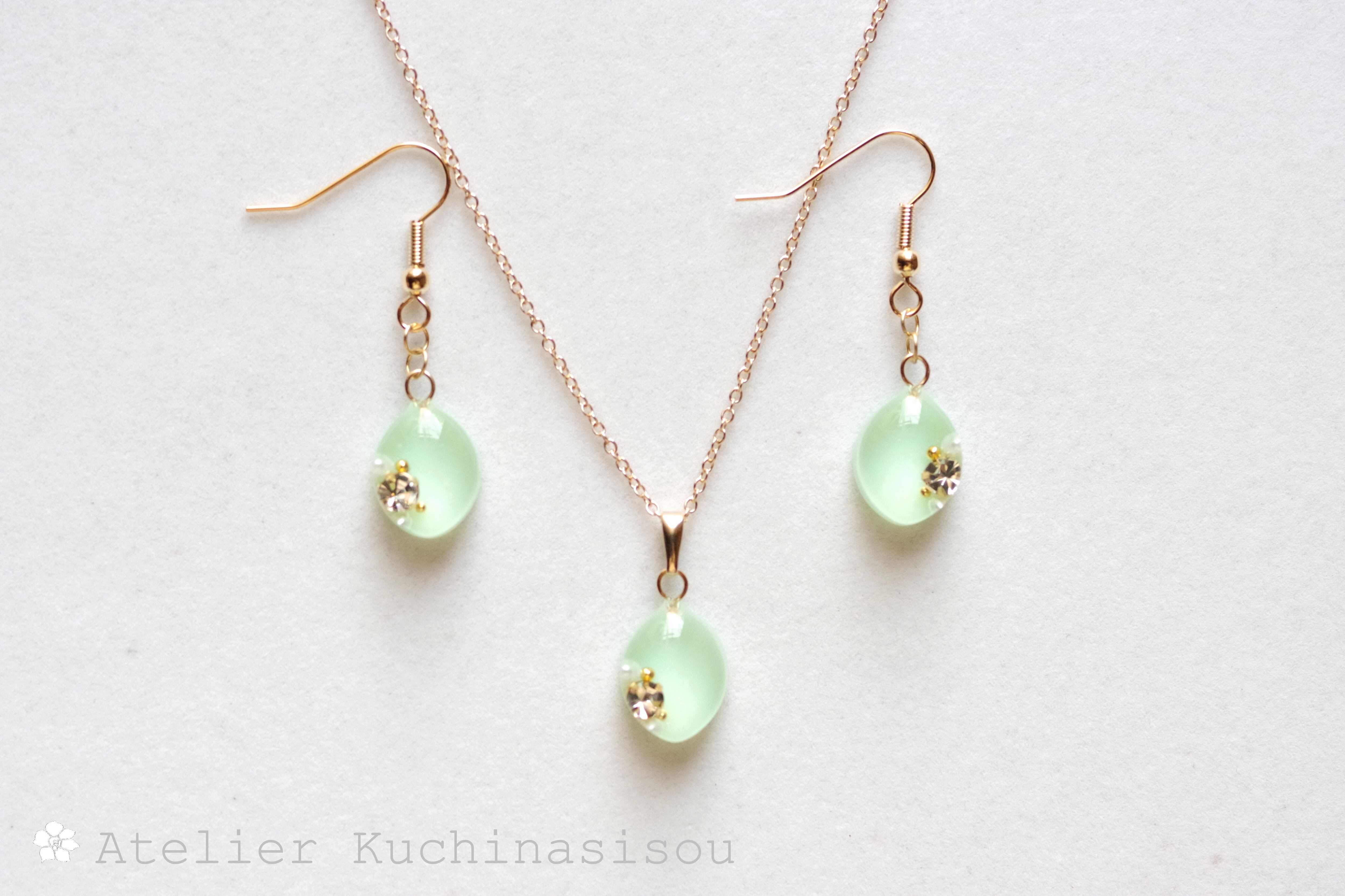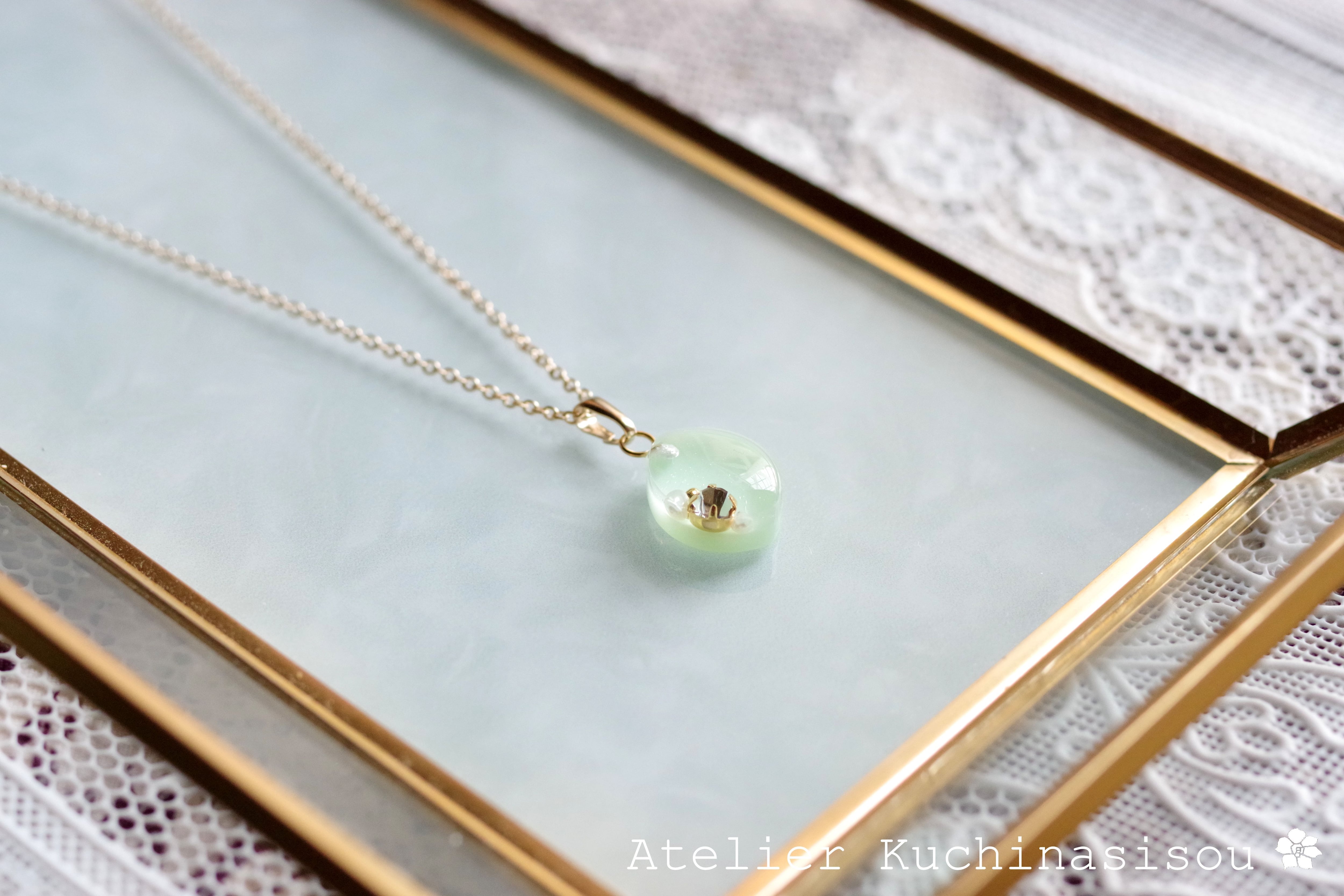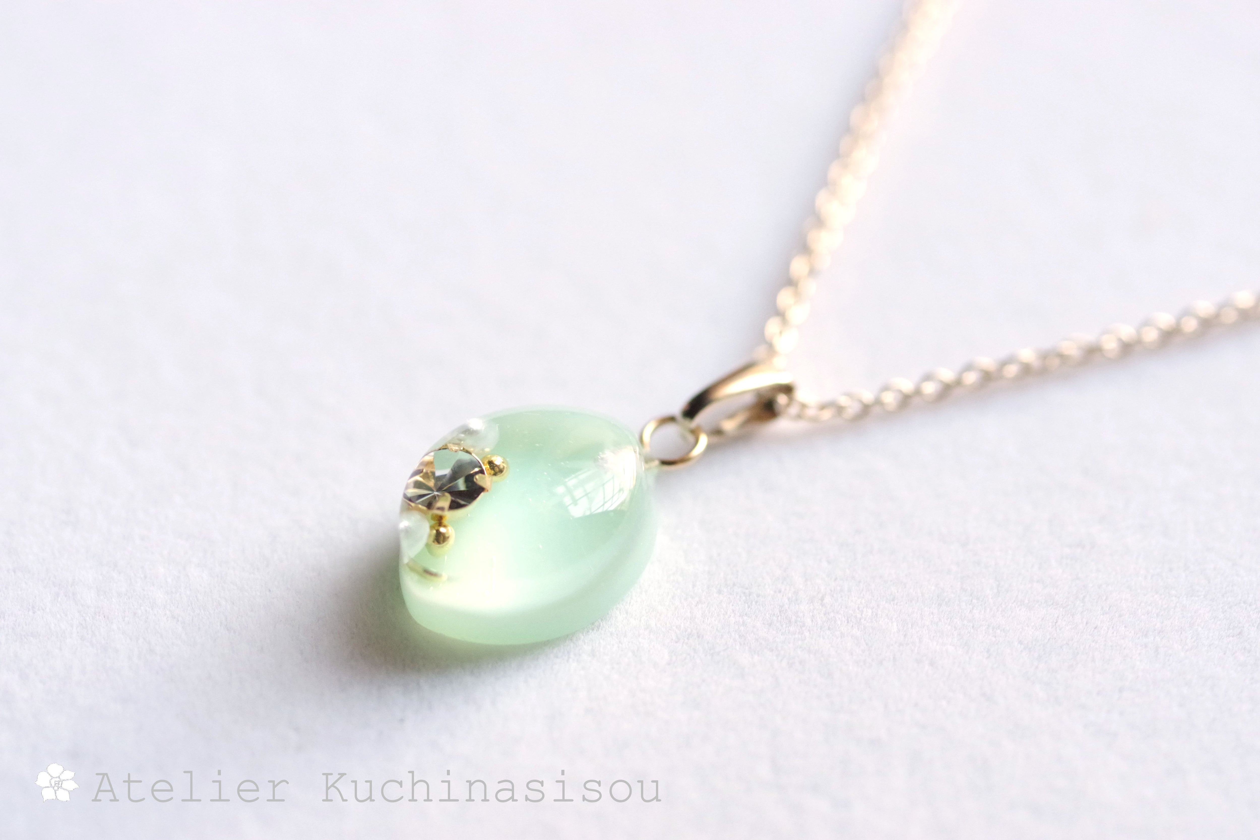 優しいグリーンのマーキス型のレジンにスワロフスキーを一粒とパール、ブリオンをあしらい、愛らしくも上品なペンダントに仕上げました。