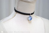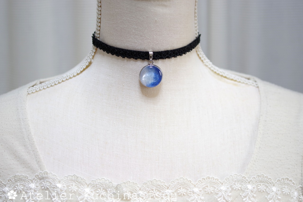 白と青のコントラストが爽やかな印象を与えるレジンを、ベルベットリボンにタティングレースで装飾を施したチョーカーに仕上げました。