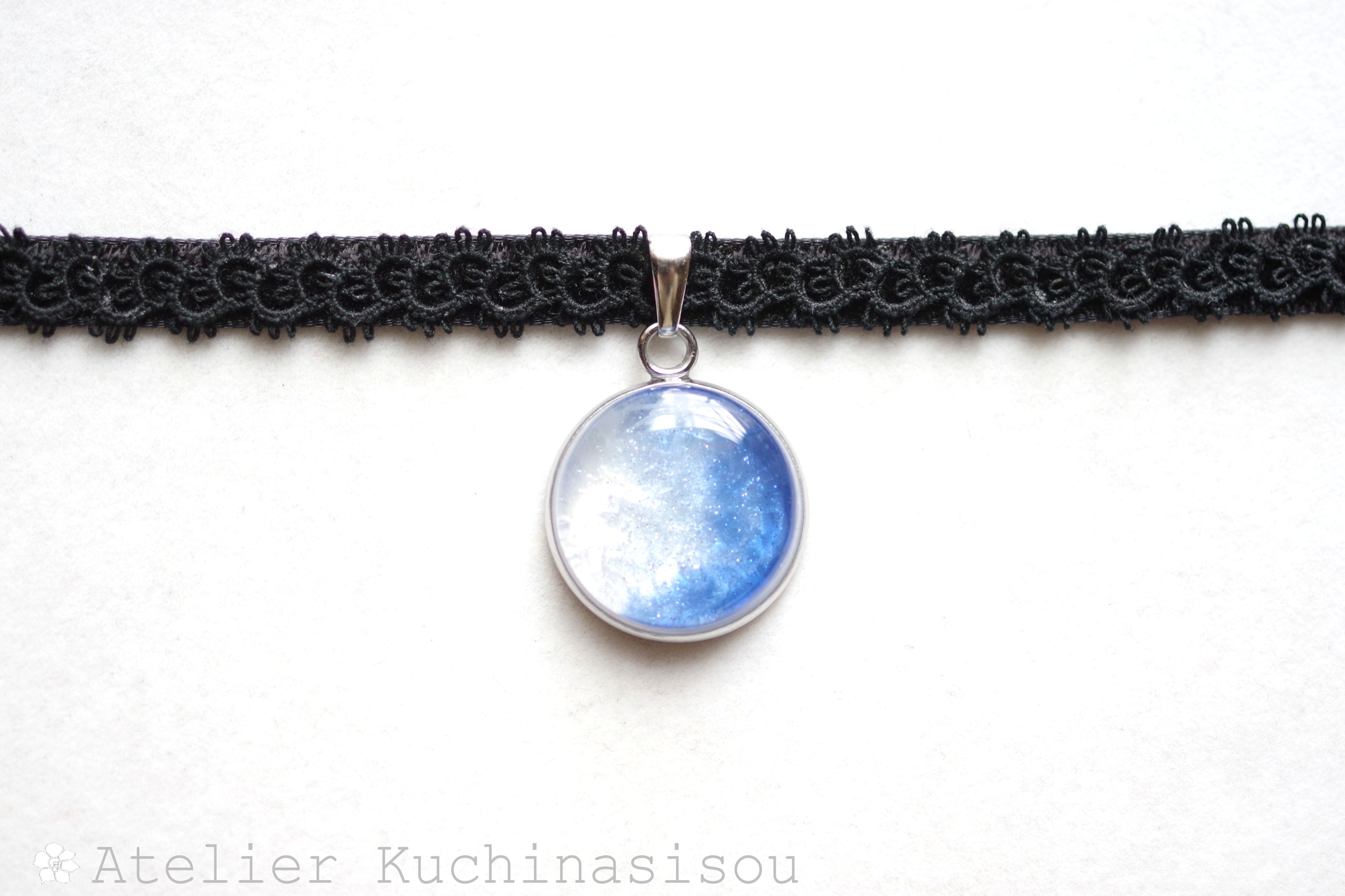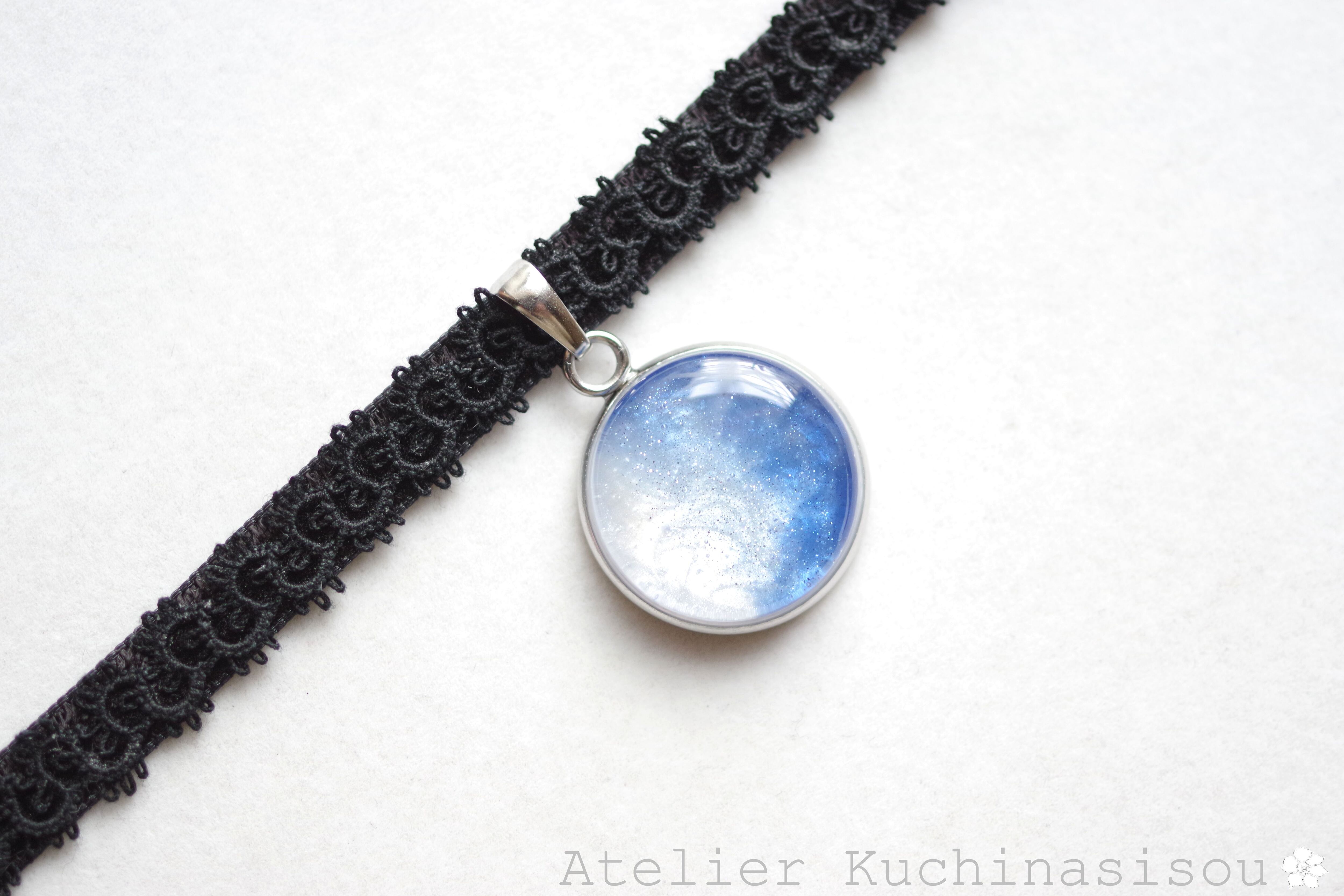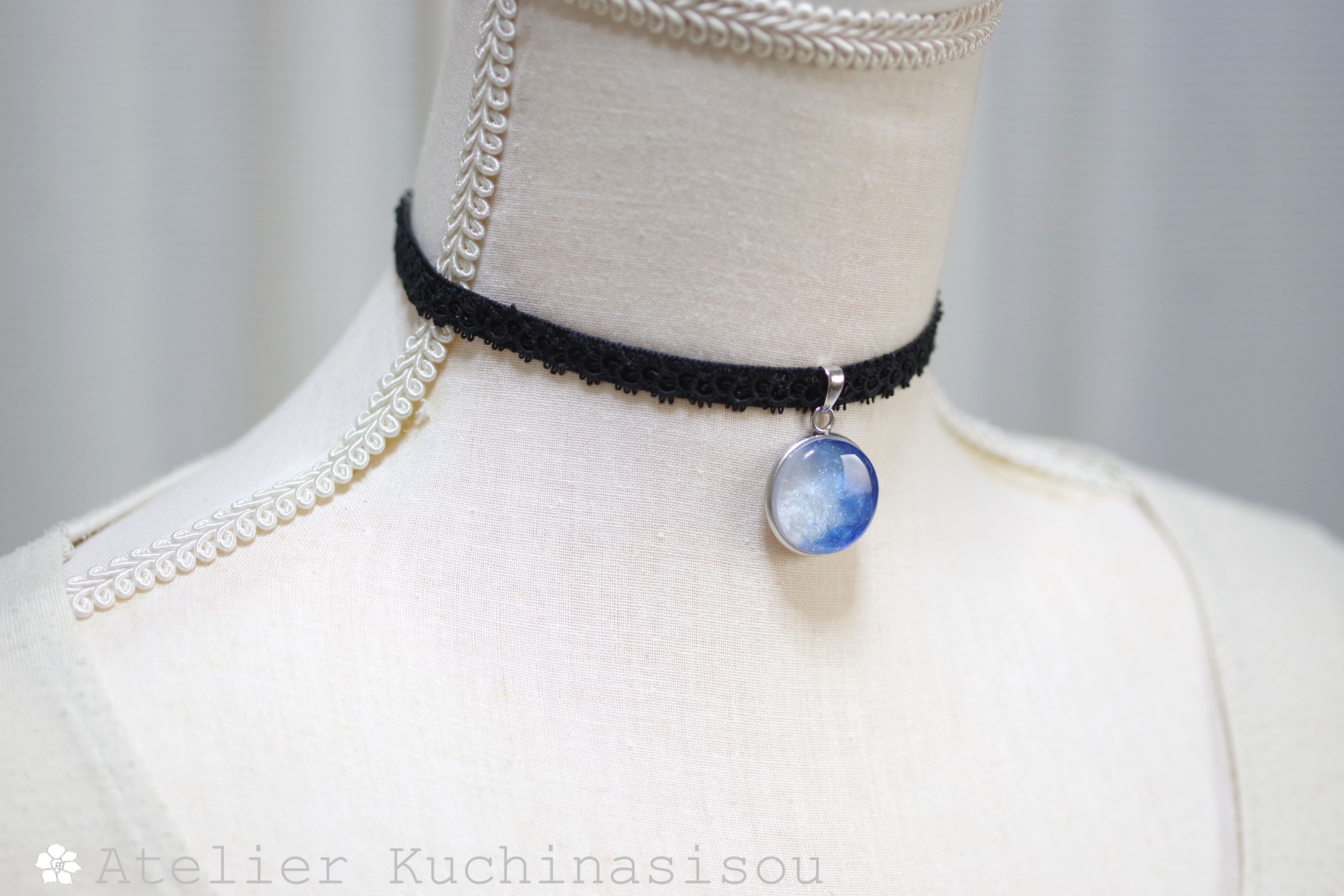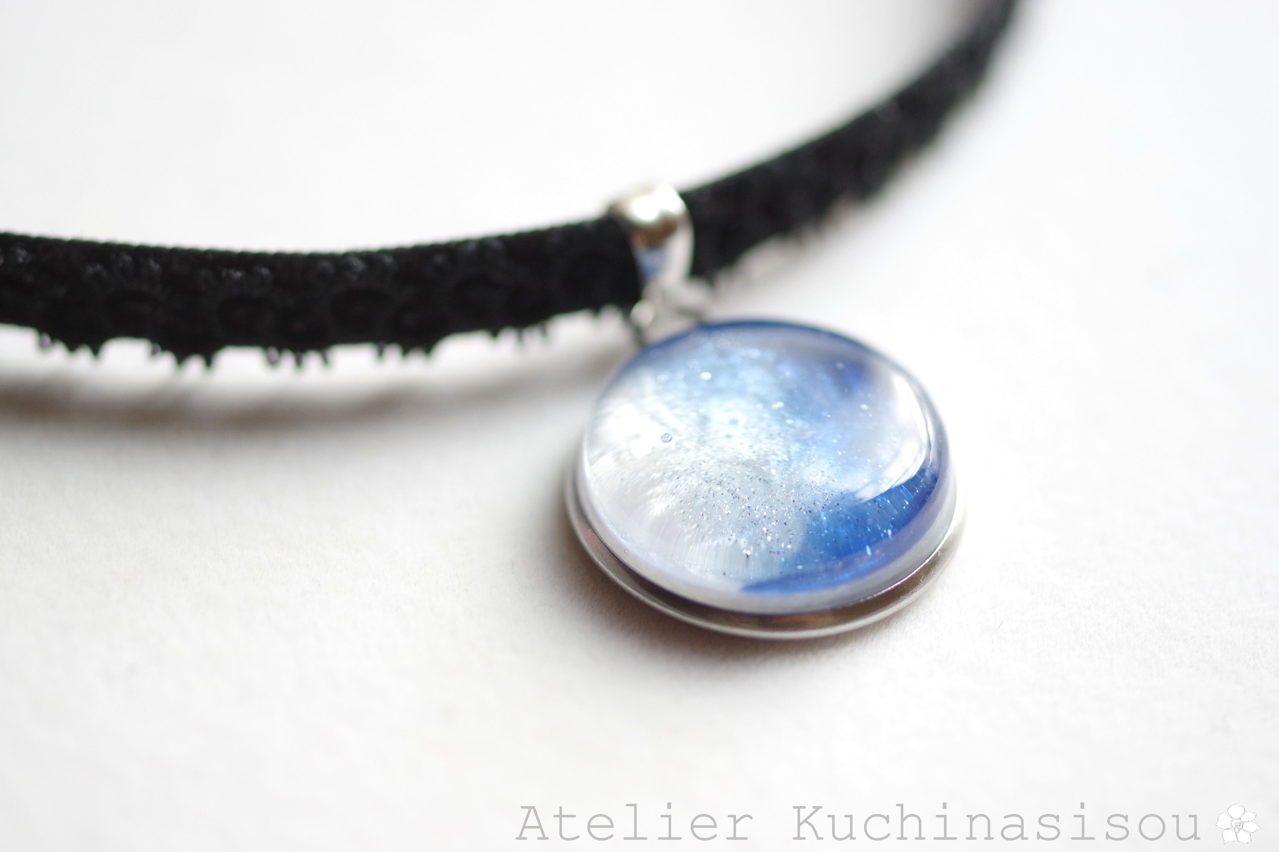 【受注製作】レジンアート ラウンドモチーフとタティングレースとベルベットリボンのチョーカー〈雪解けの水〉