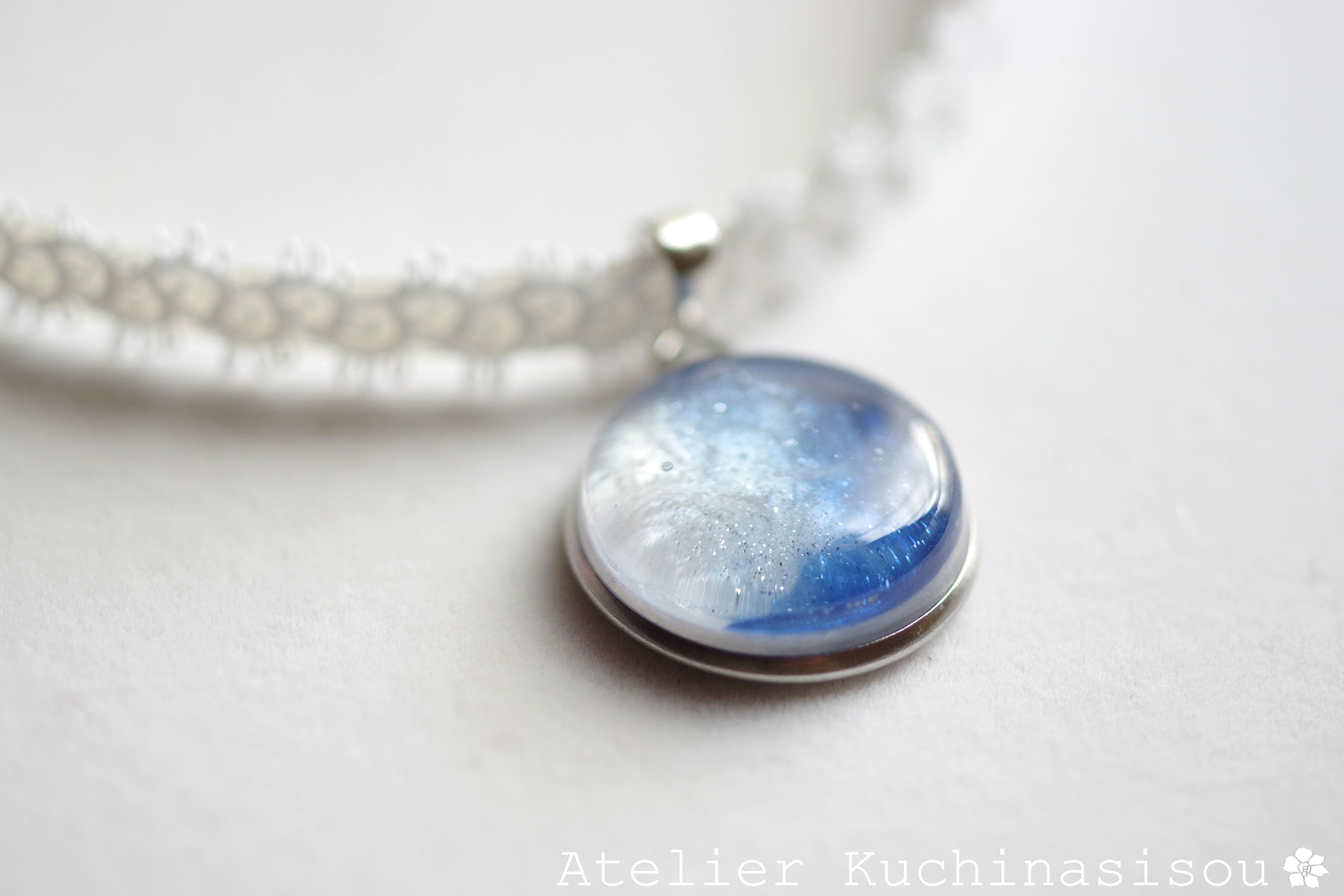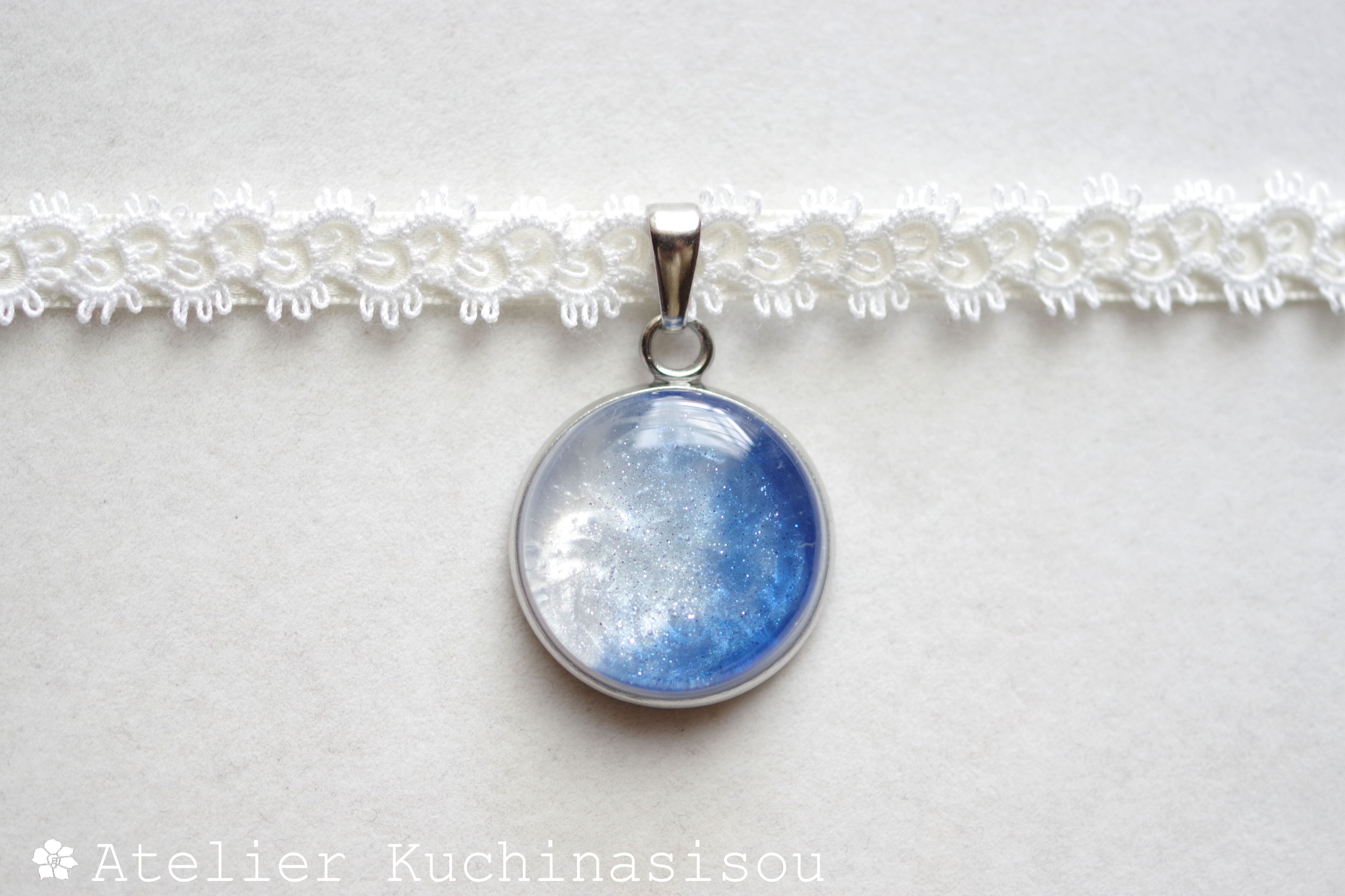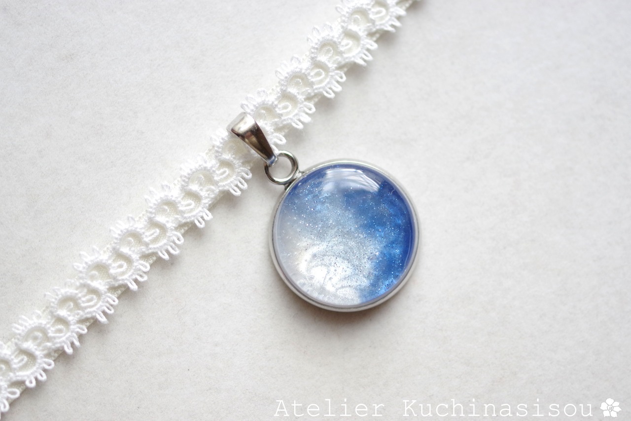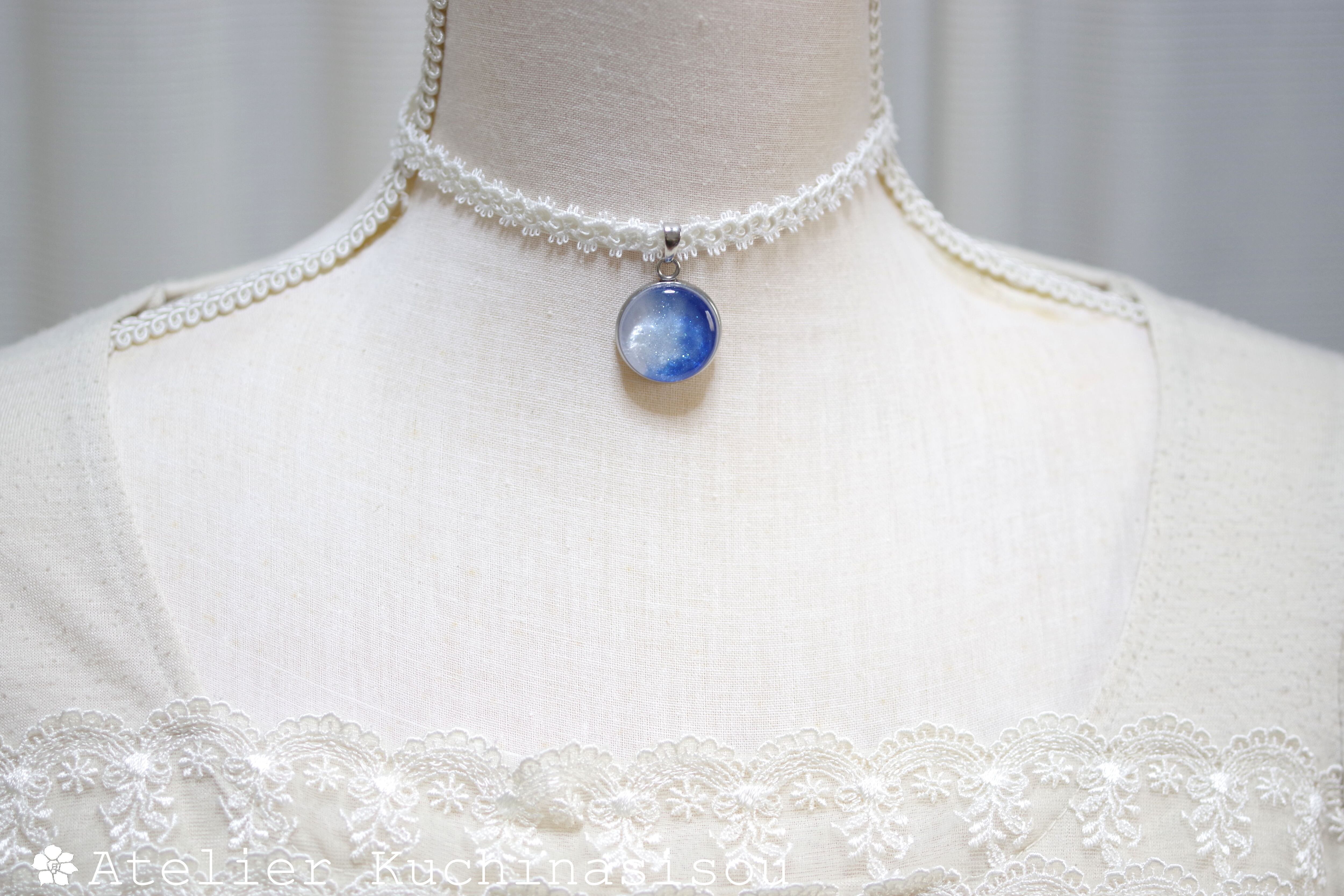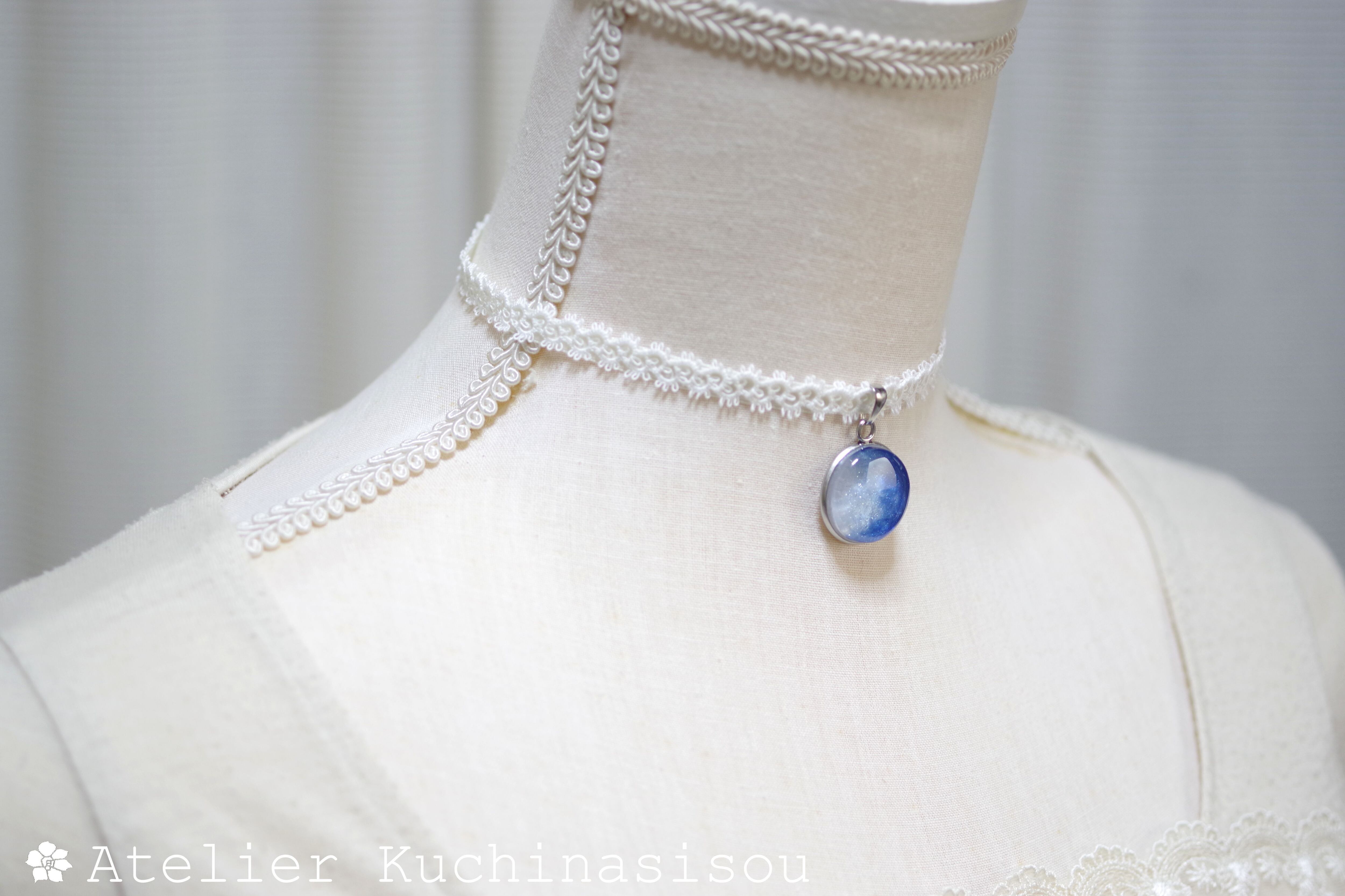 白と青のコントラストが爽やかな印象を与えるレジンを、サテンリボンにタティングレースで装飾を施したチョーカーに仕上げました。