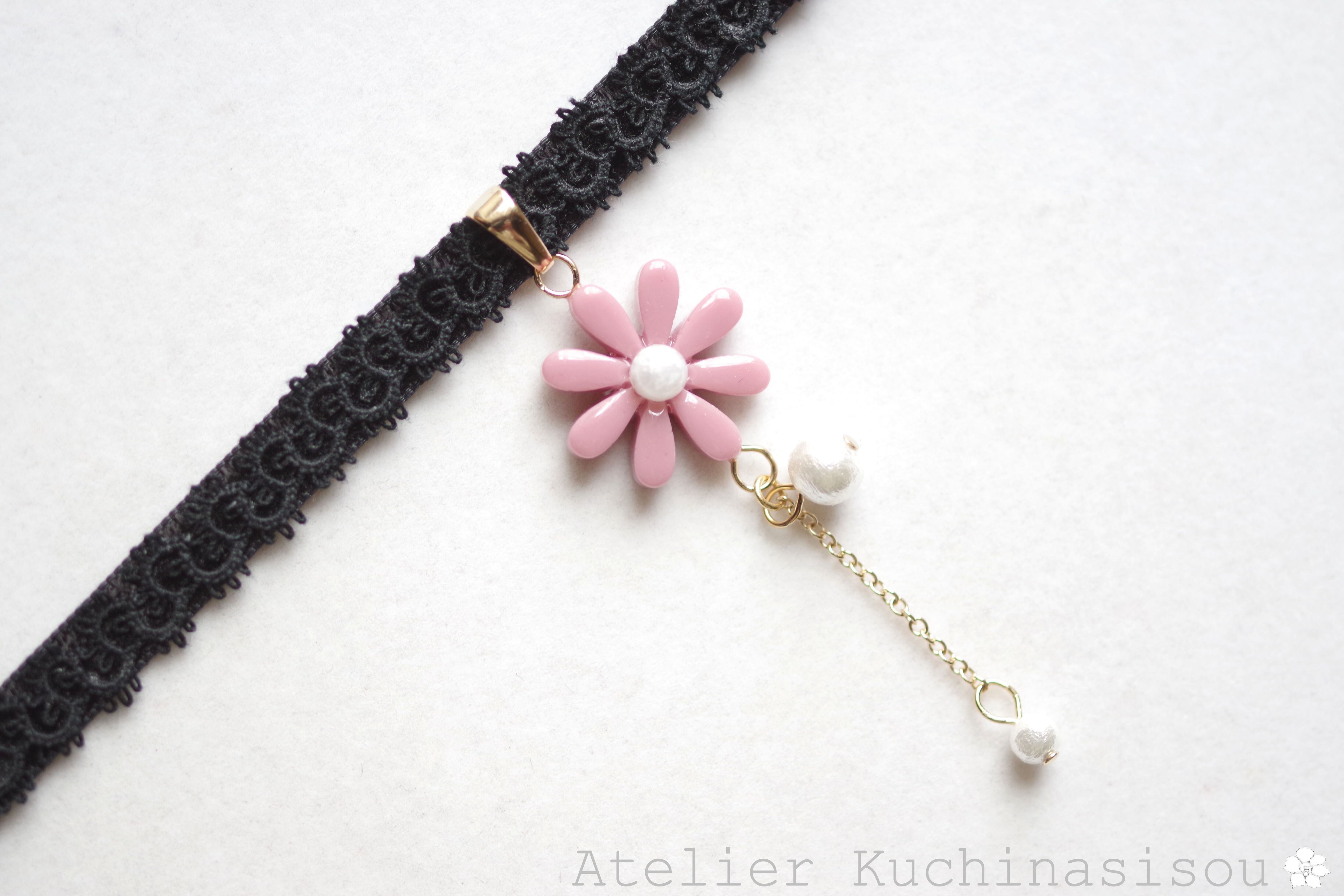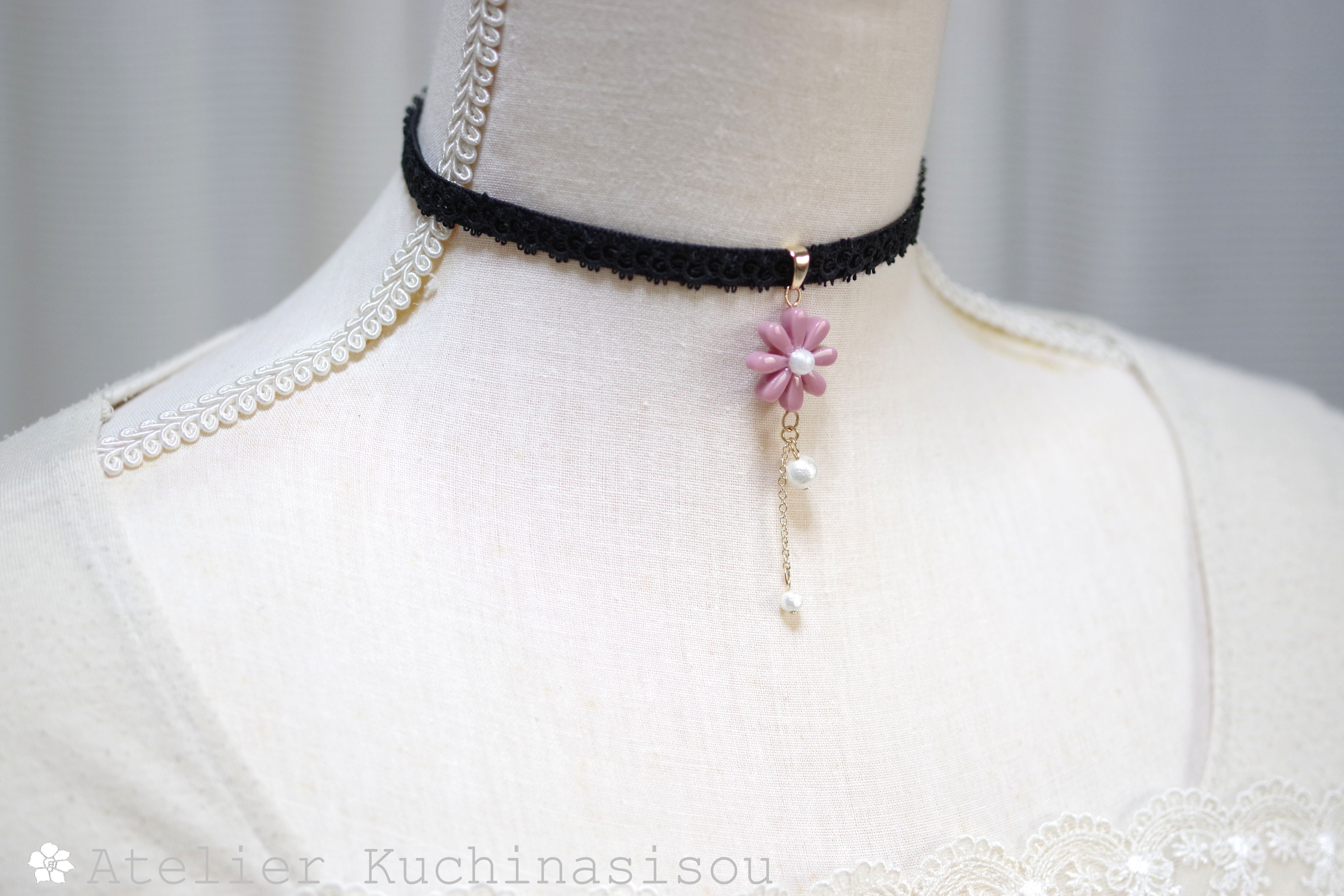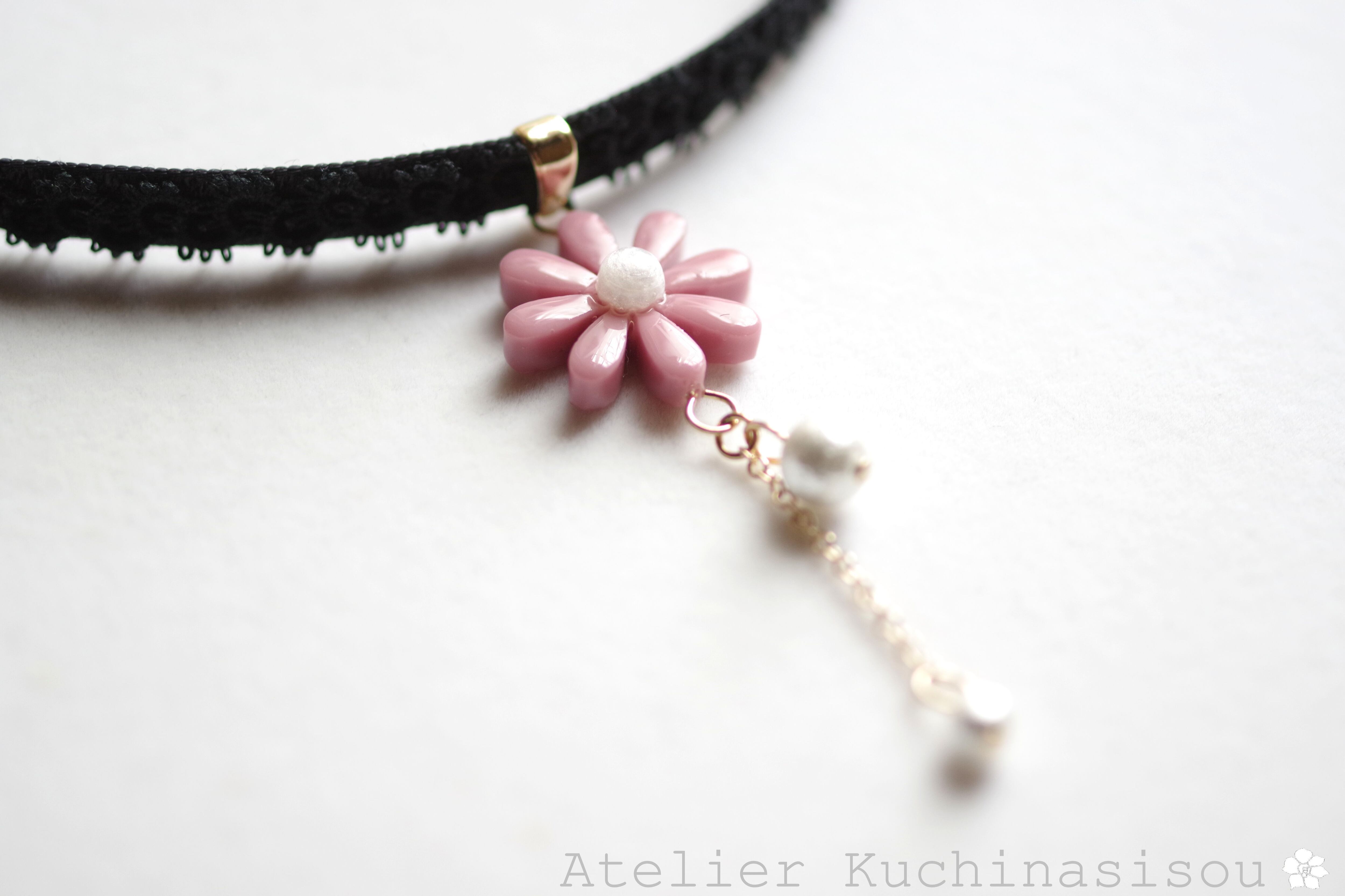 こっくりしたピンクのレジンのお花を、ベルベットリボンにタティングレースで装飾を施したチョーカーに仕上げました。