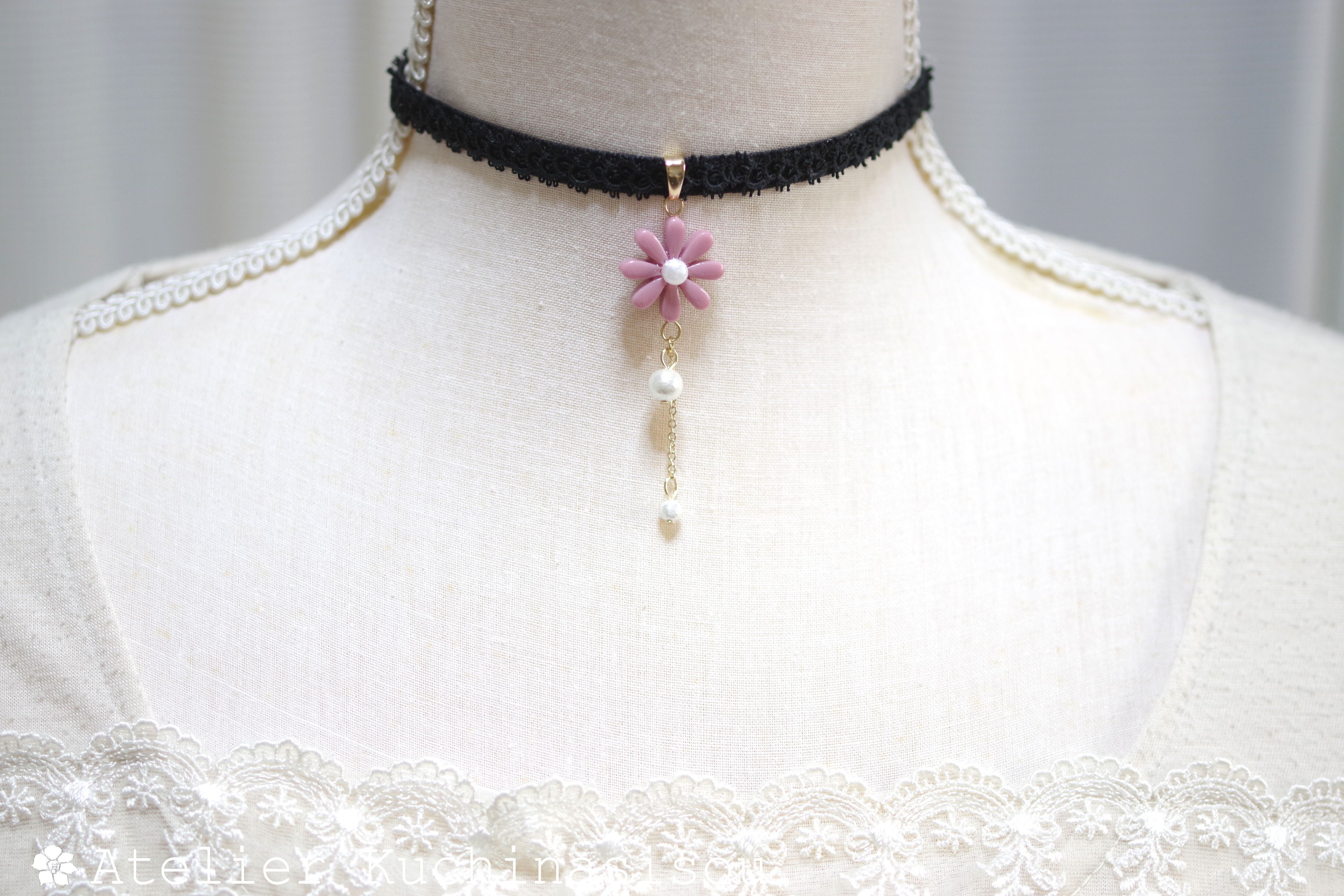 中心の花芯とコットンパールの光沢のある輝きが上品なチョーカー。