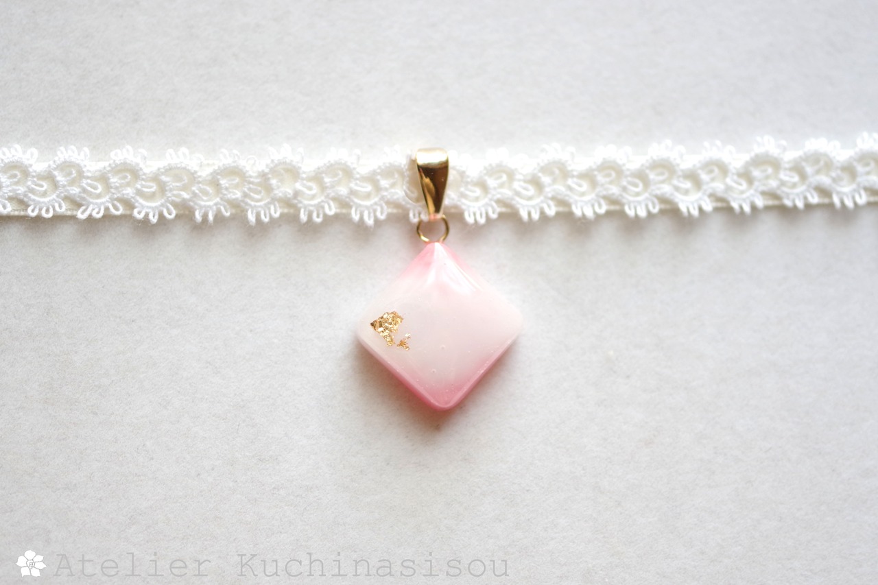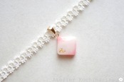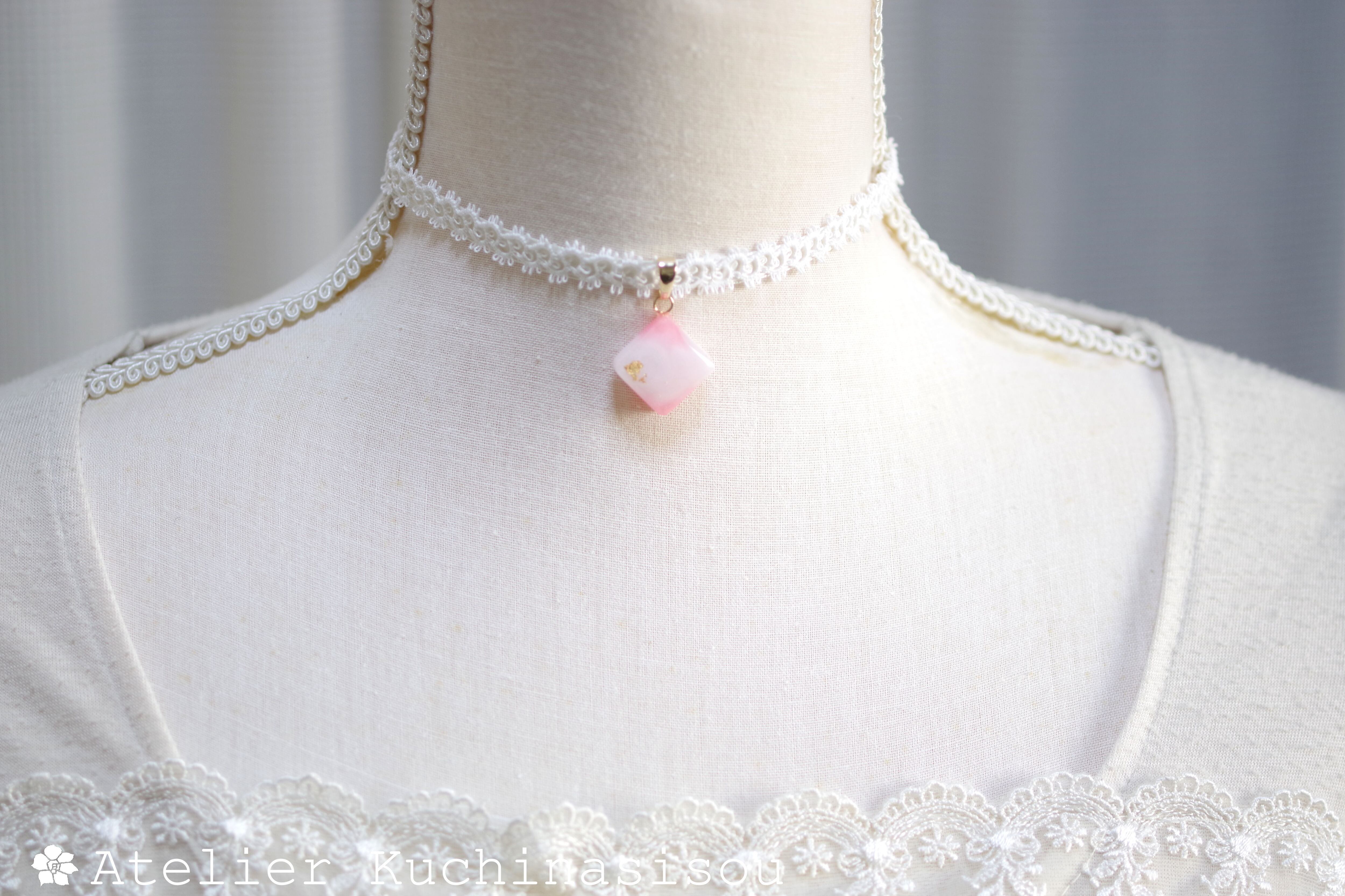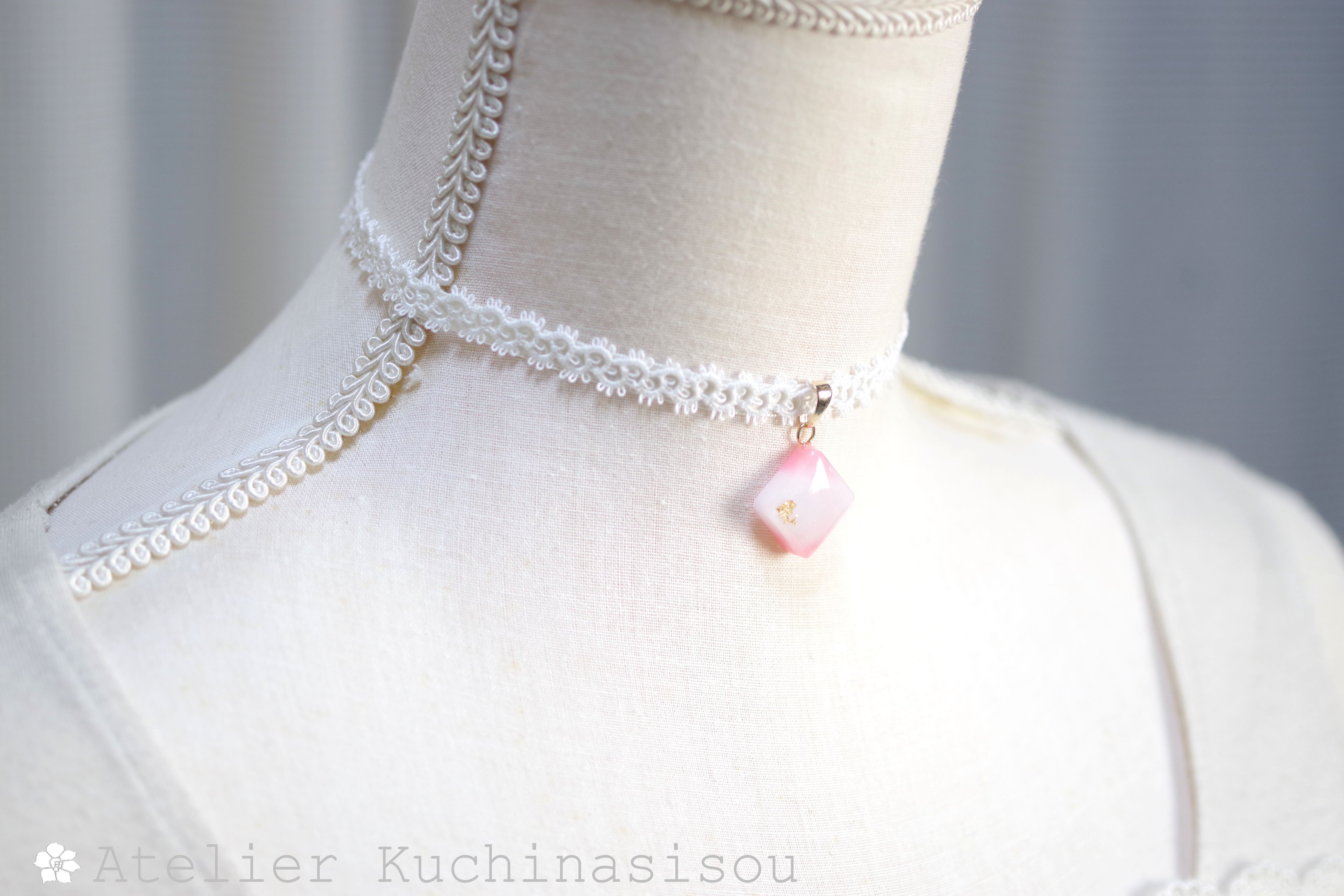 ホワイトとピンクの組み合わせが愛らしい、シャープなフォルムの中にも可憐さをのぞかせるレジンを、サテンリボンにタティングレースで装飾を施したチョーカーに仕上げました。