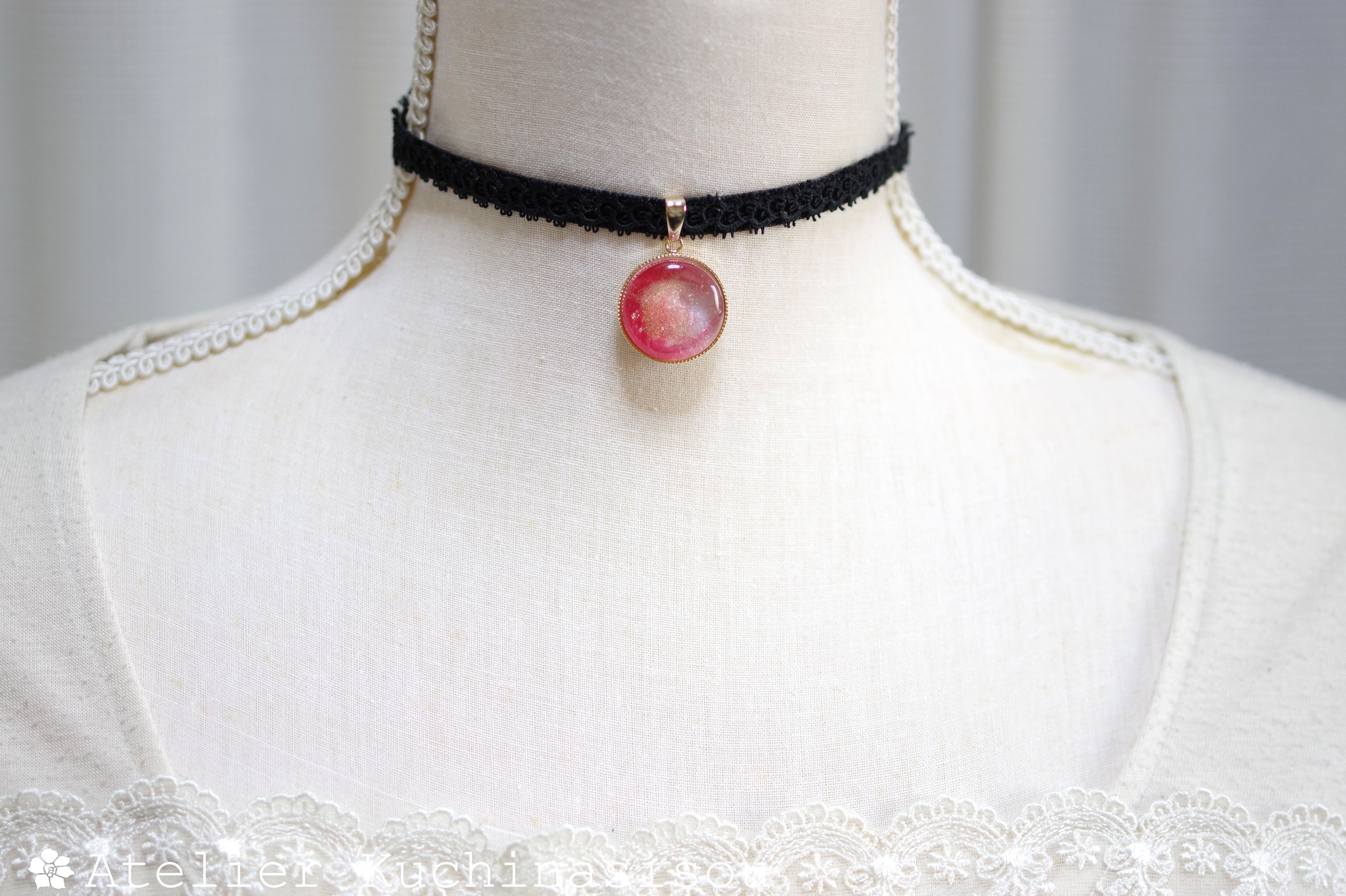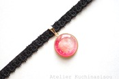 瑞々しい赤とピンク色が林檎を思わせるレジンを、ベルベットリボンにタティングレースで装飾を施したチョーカーに仕上げました。