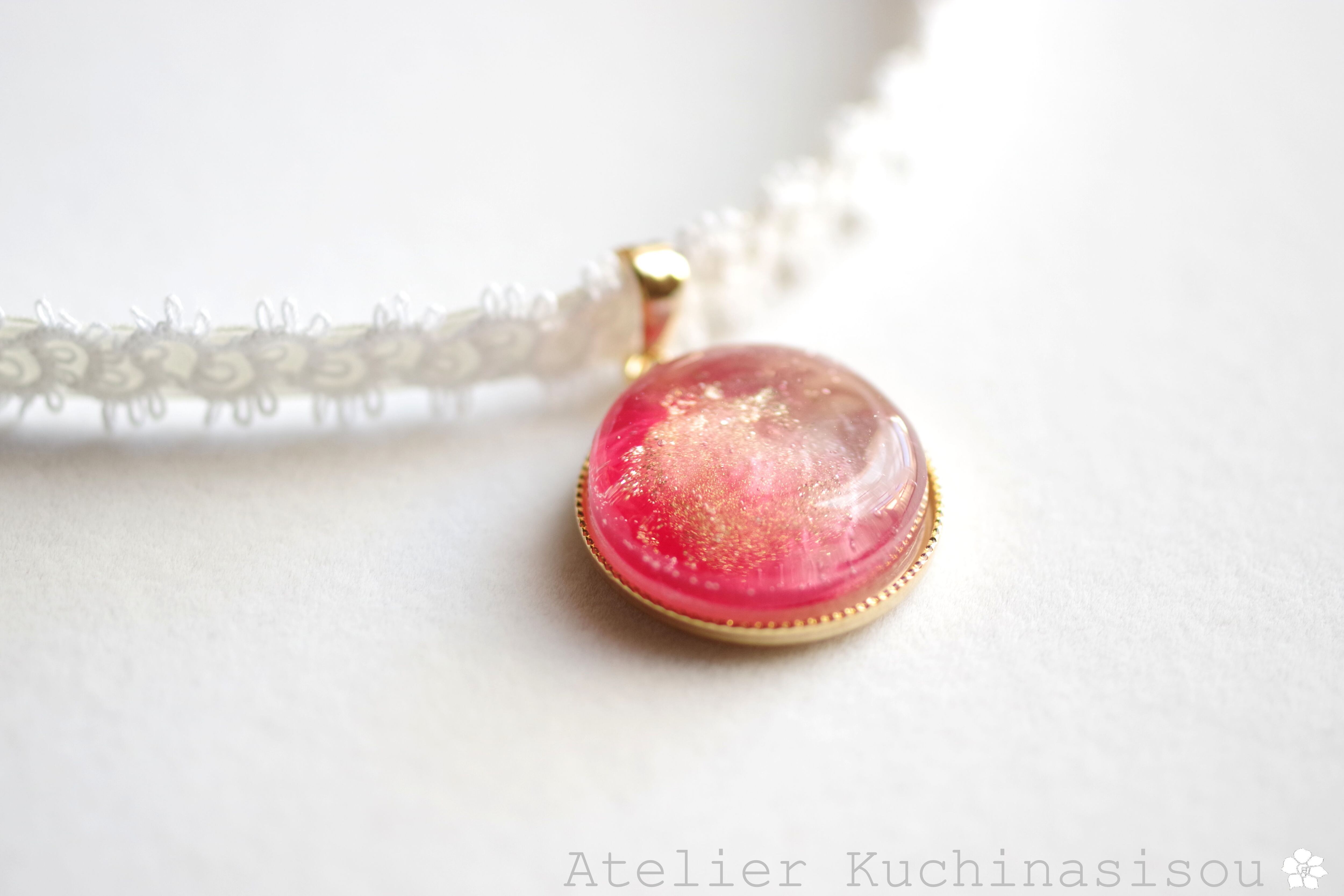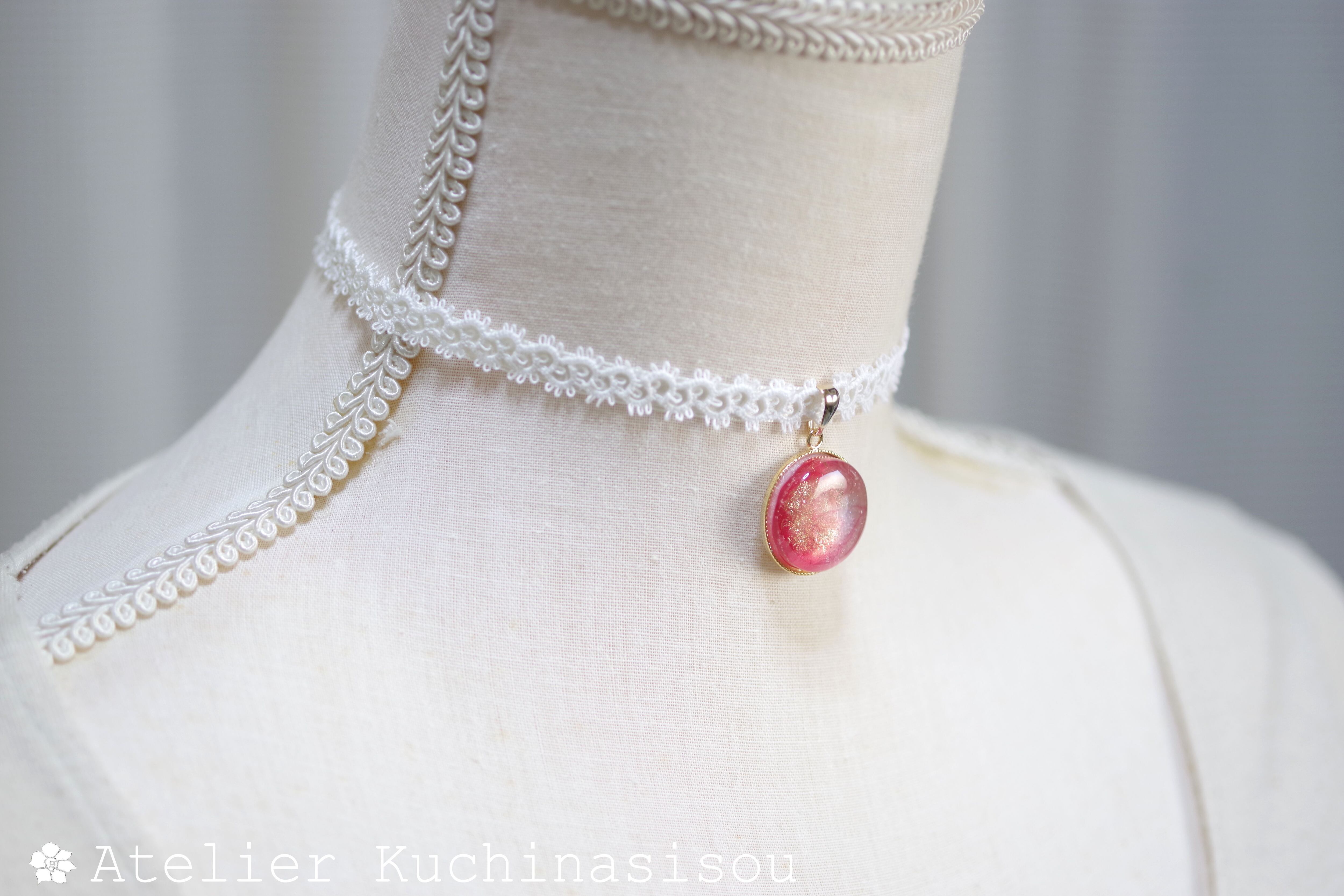 瑞々しい赤とピンク色が林檎を思わせるレジンを、サテンリボンにタティングレースで装飾を施したチョーカーに仕上げました。